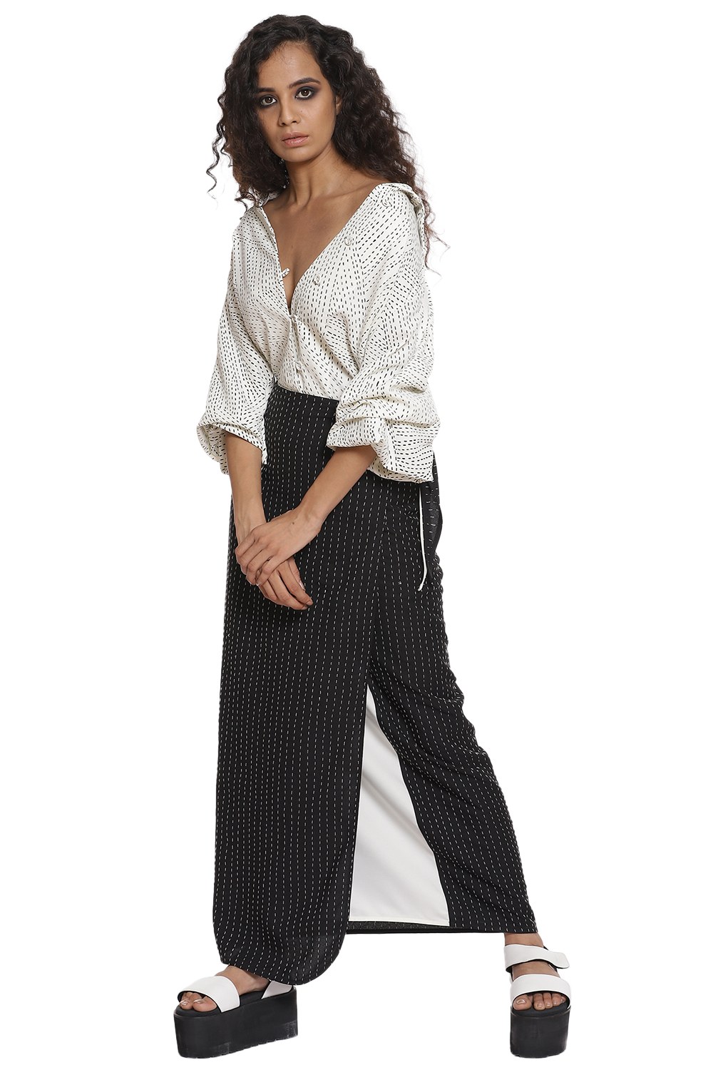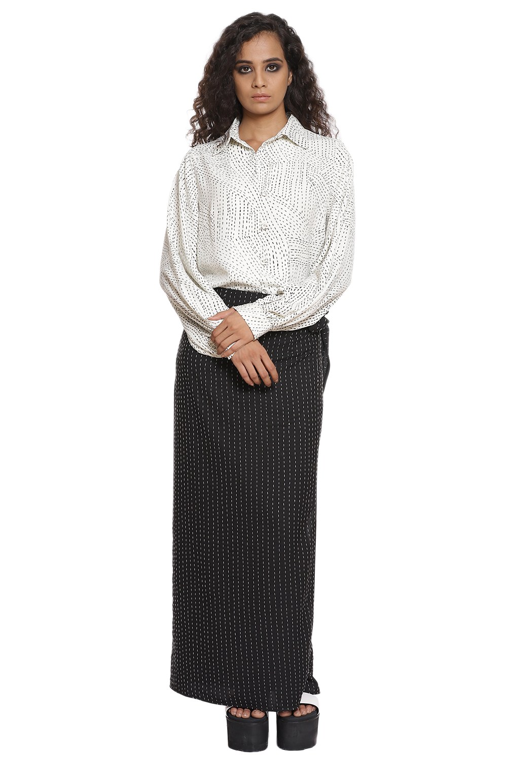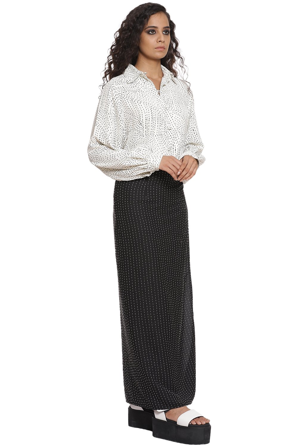 Kantha print blouse with baloon sleeves in ivory and black teamed with hand kantha stich wrap skirt in black and ivory. Crafted from R-ELAN green gold fabric in a crepe structure.