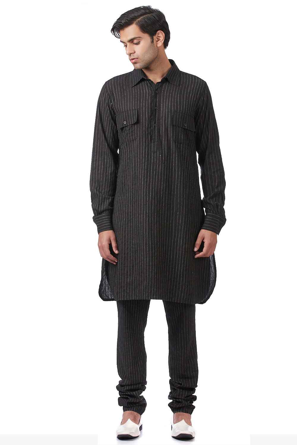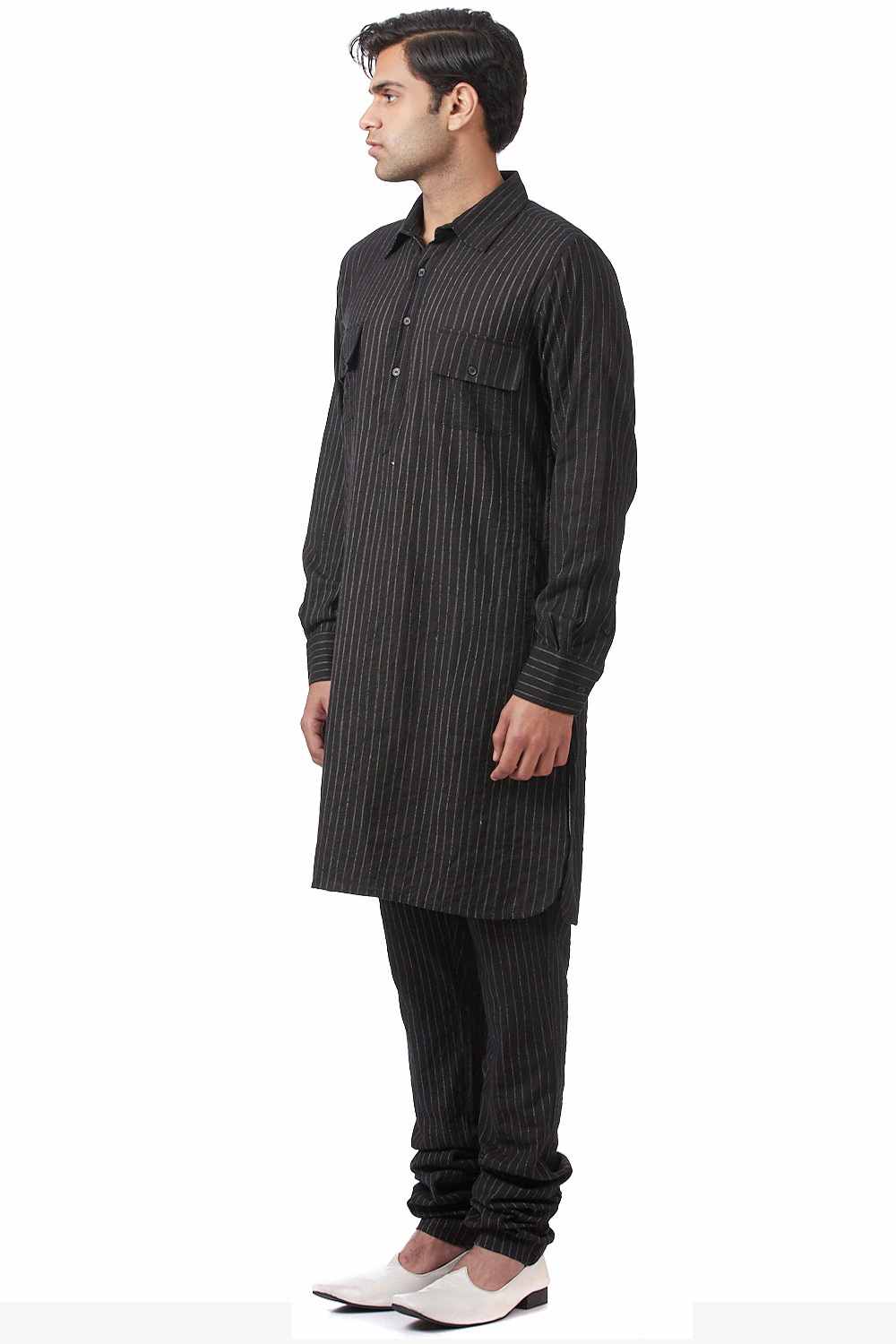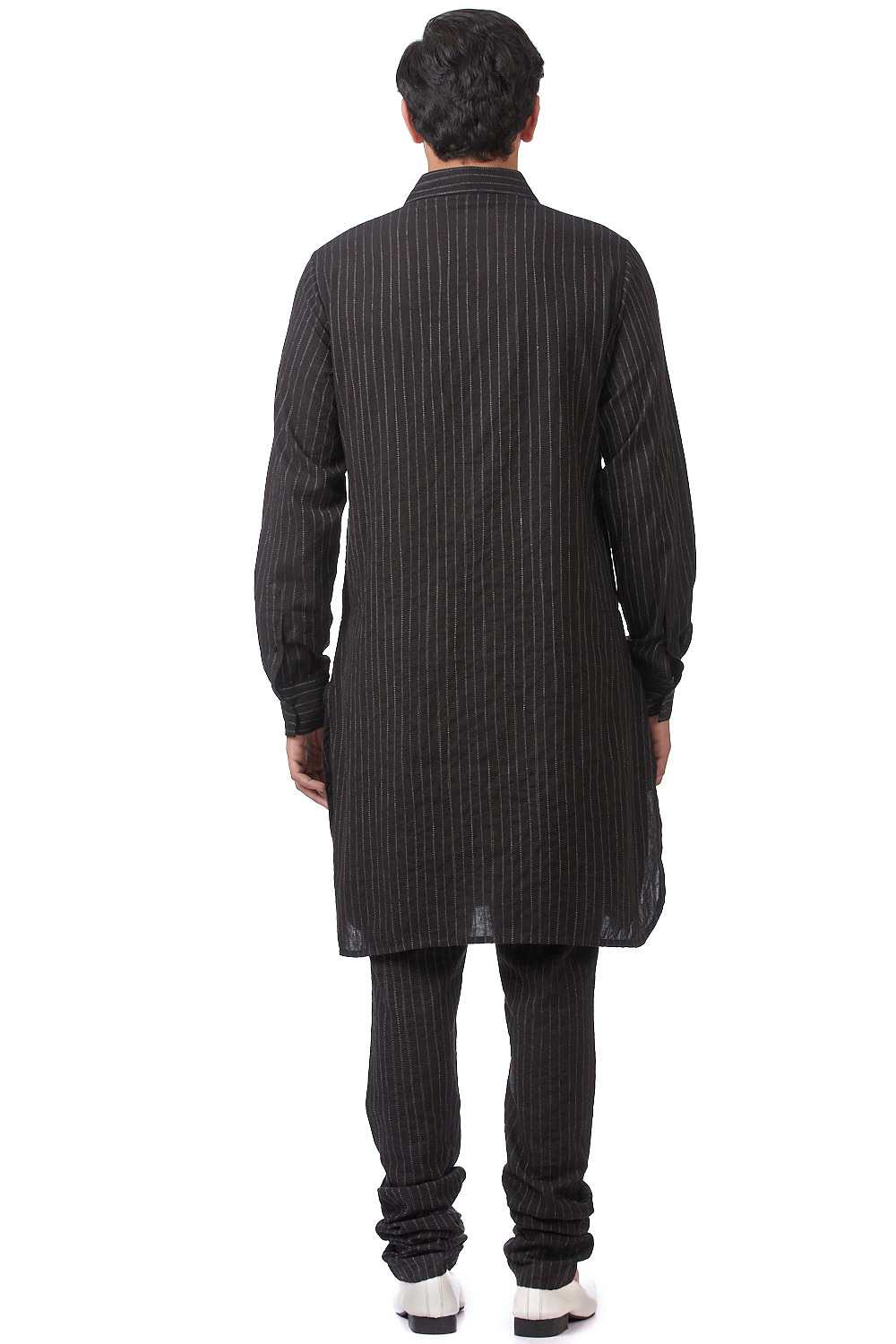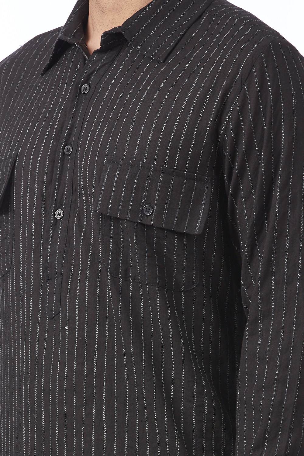 Shirt Kurta. Crafted In Hand Woven Cotton. Features Classic Shirt Collar And Shirt Patch Pockets With Bespoke Scratchy Pinstripes, Offering A Pattern Unique To Each Piece.