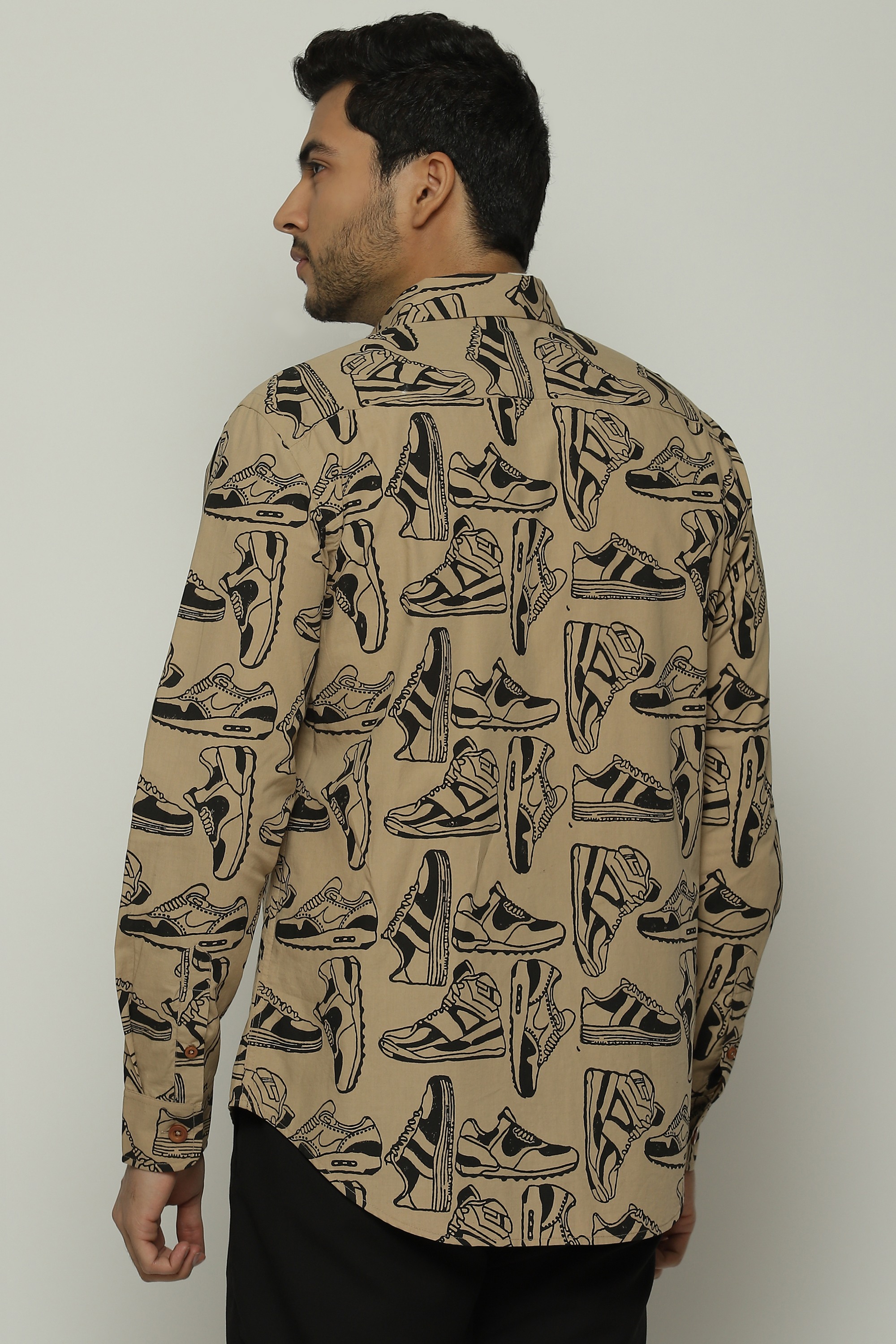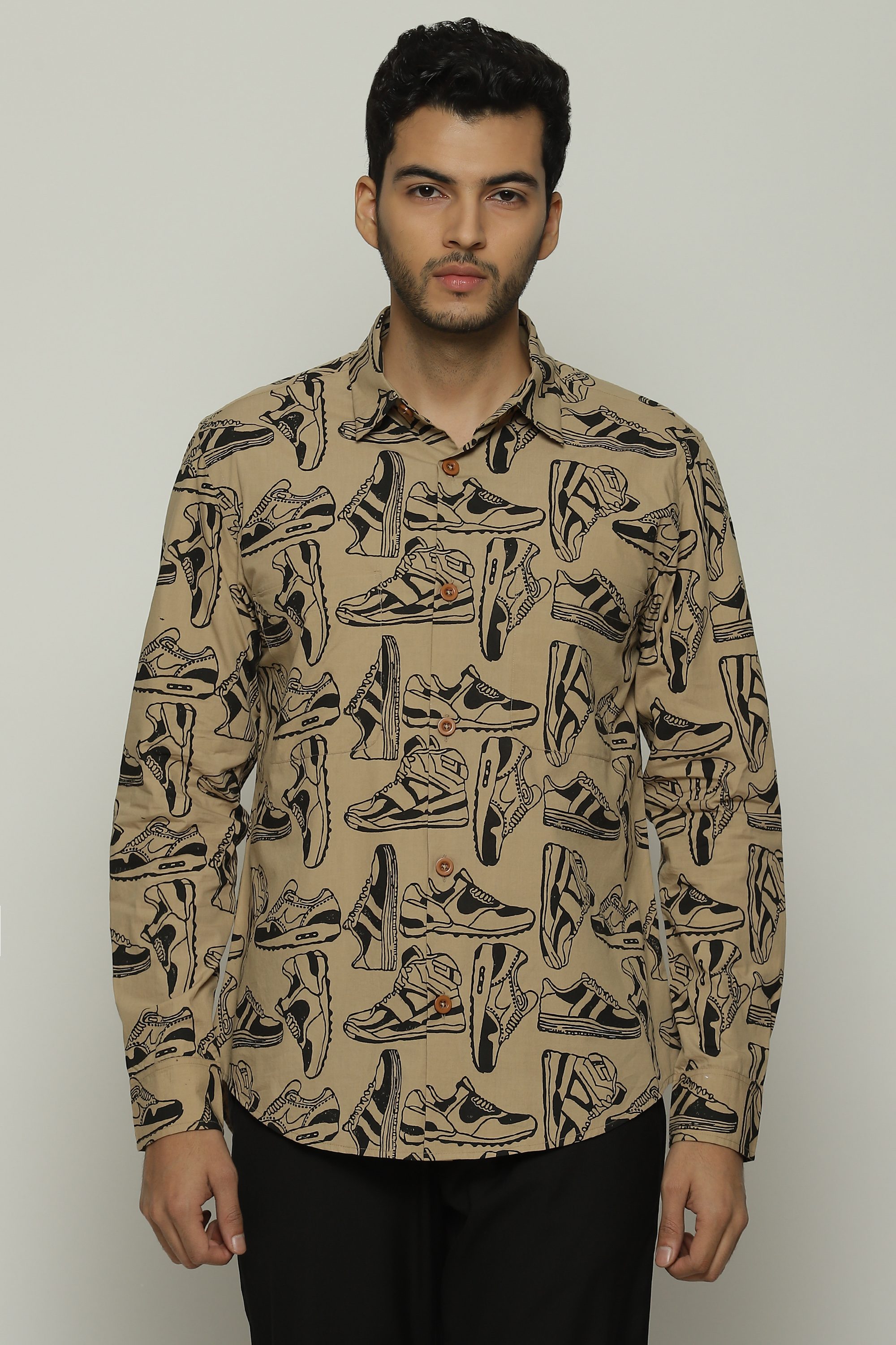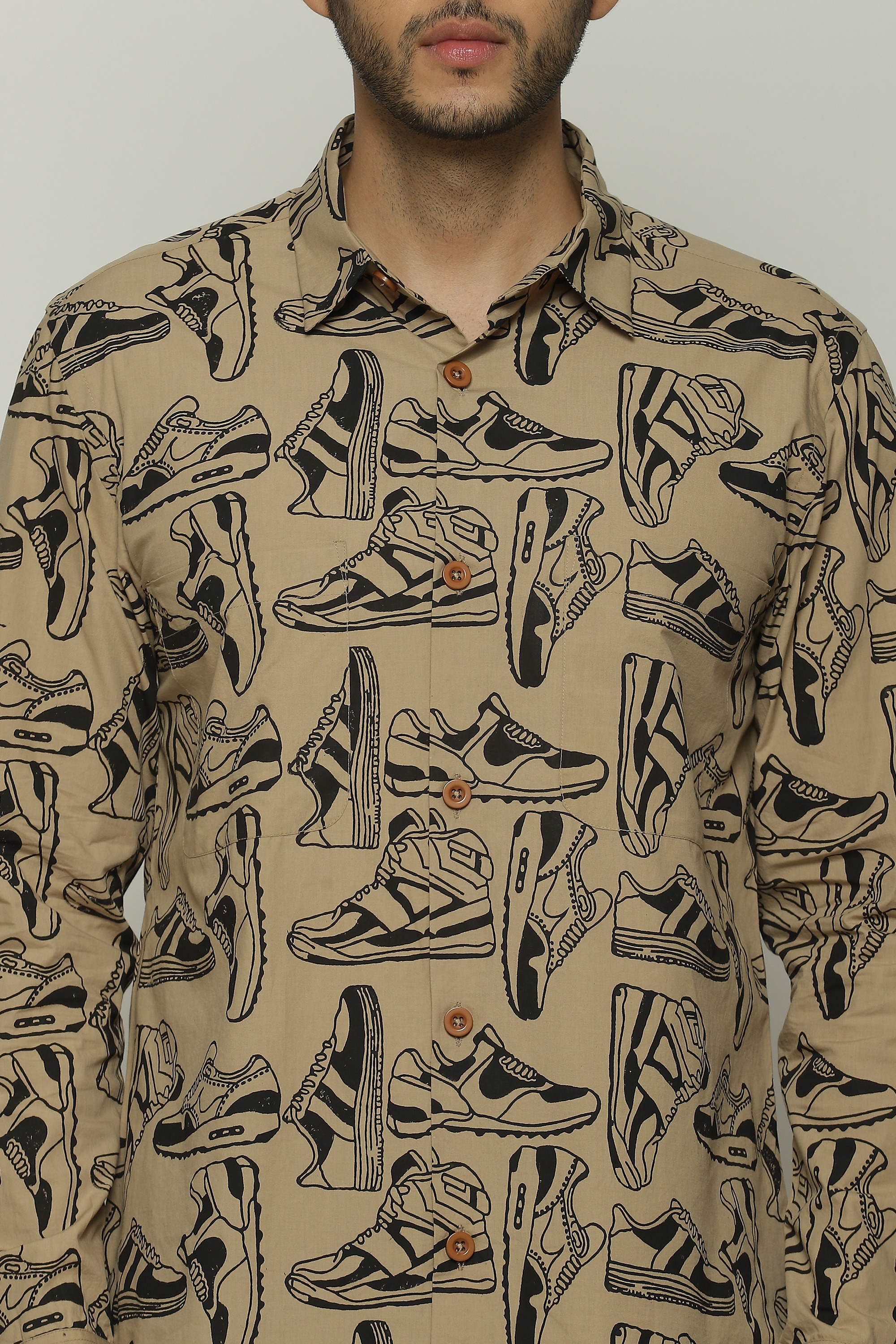 Sneakers of all shapes line this biscuit-brown shirt.
