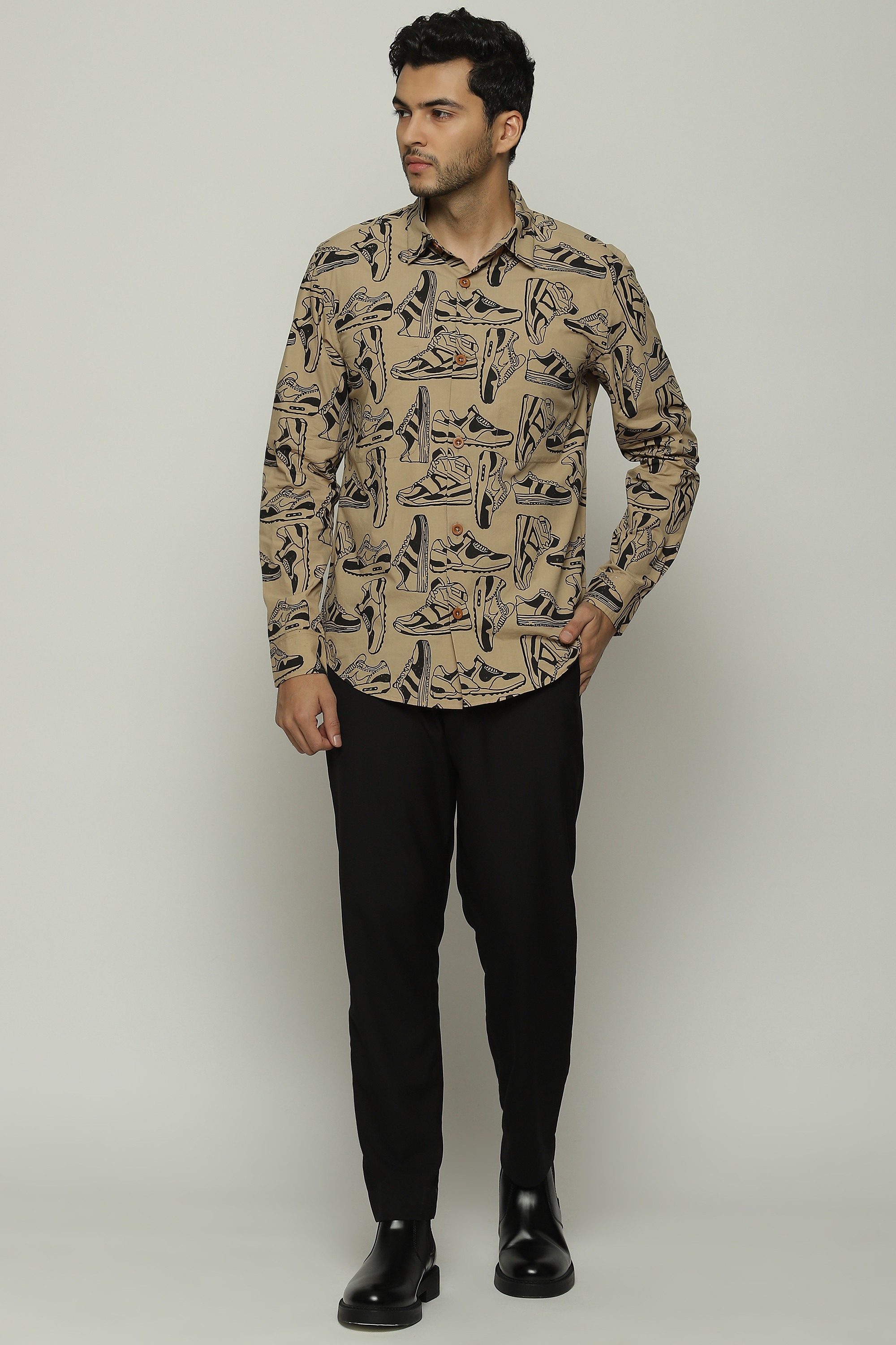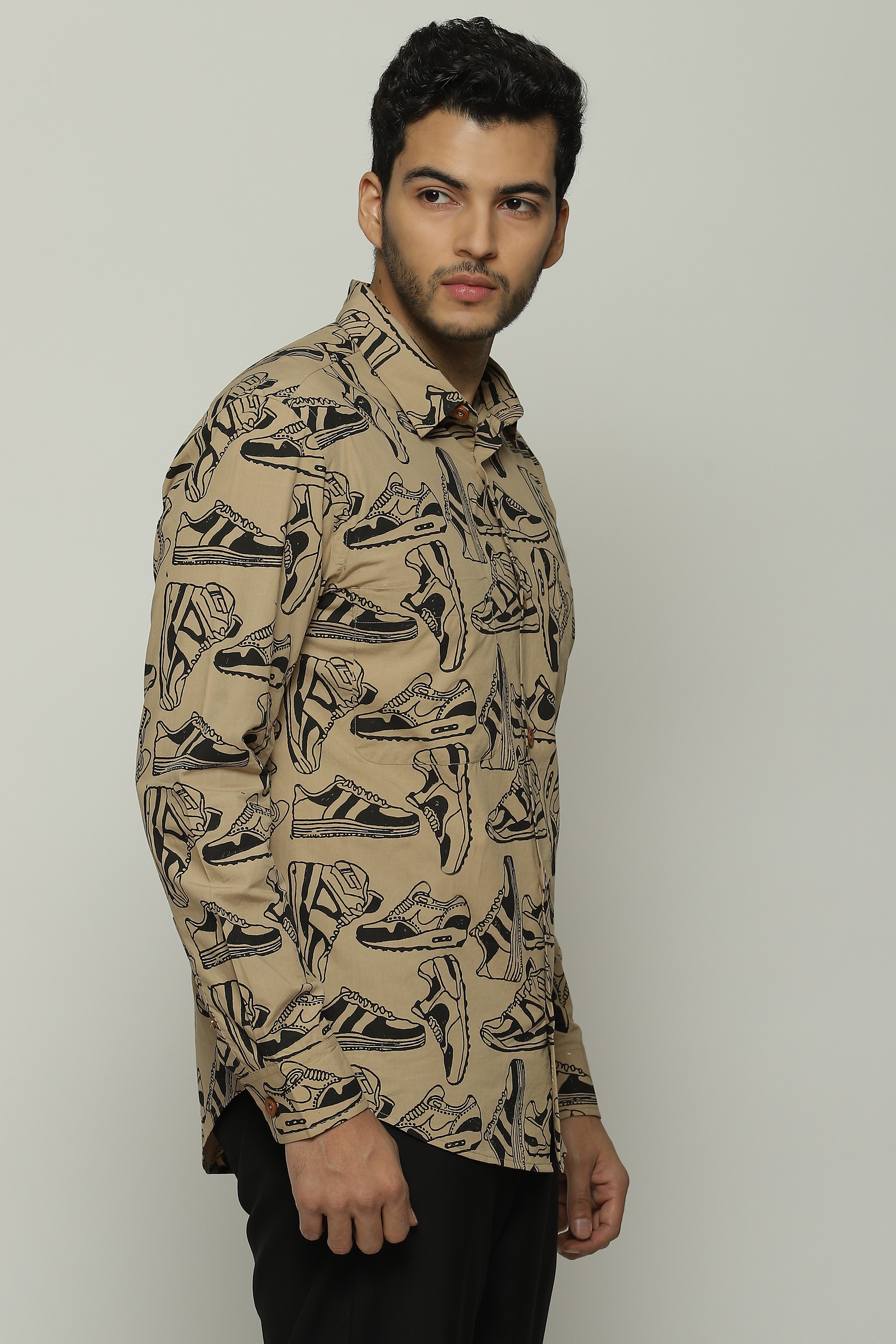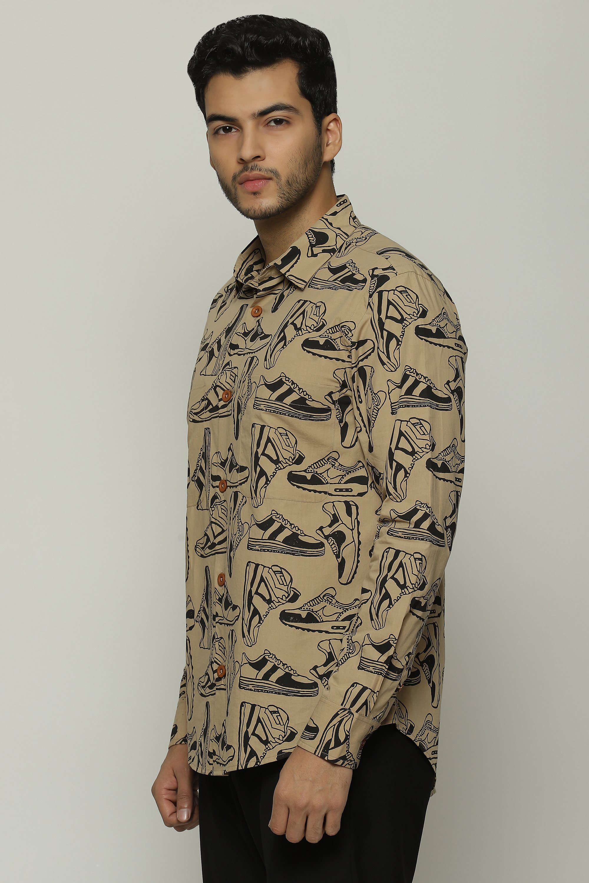 Sneakers of all shapes line this biscuit-brown shirt.