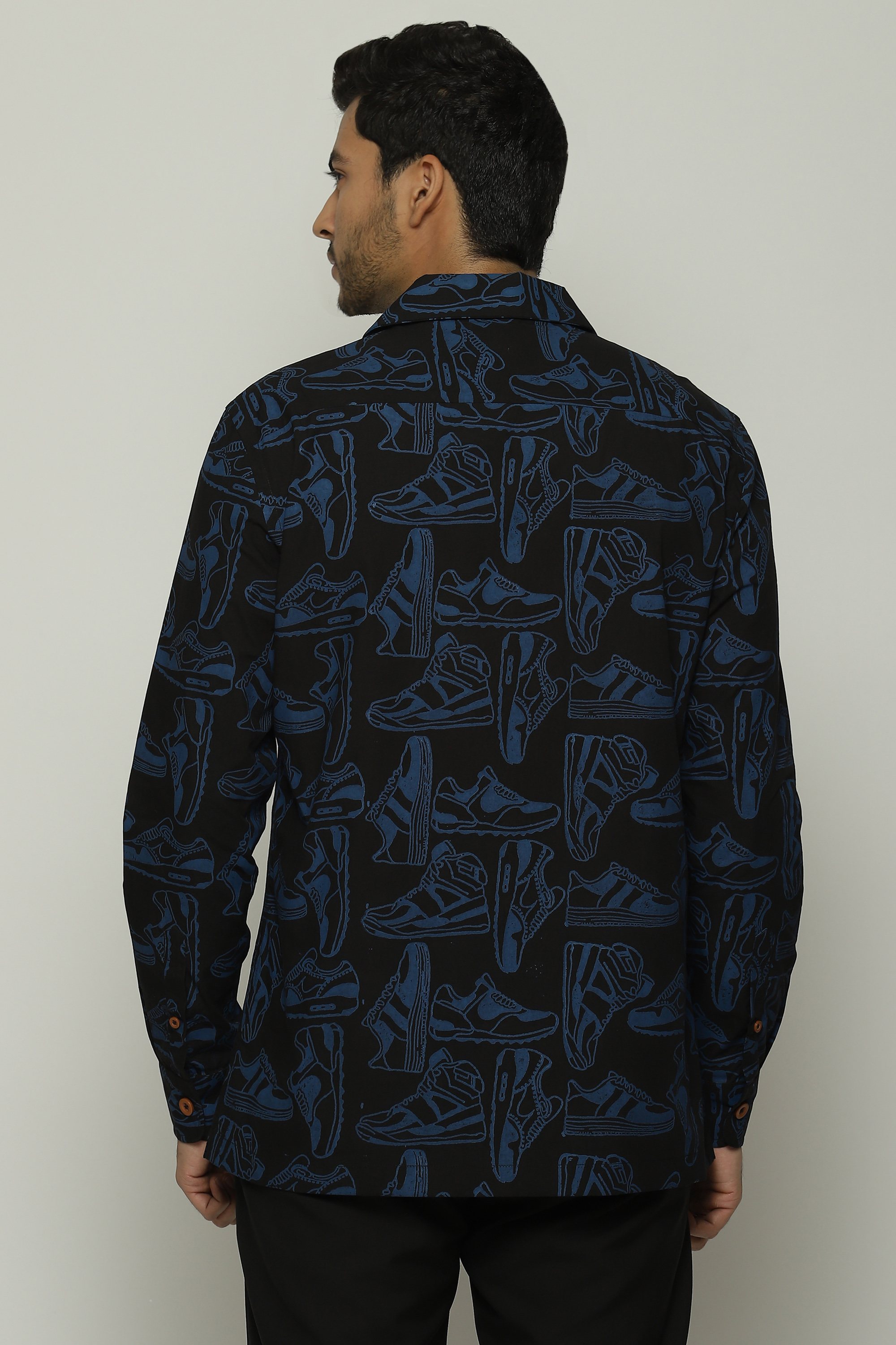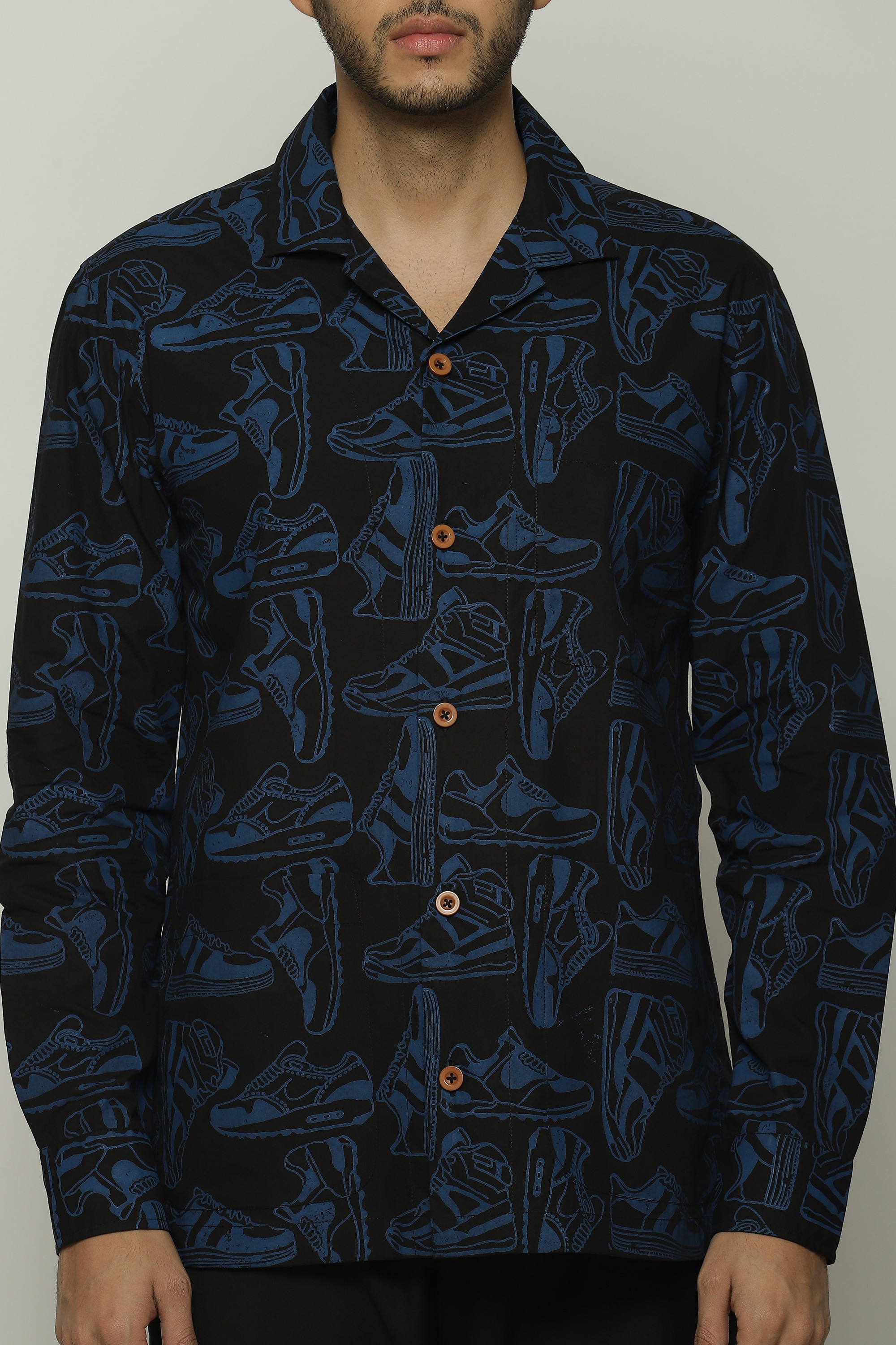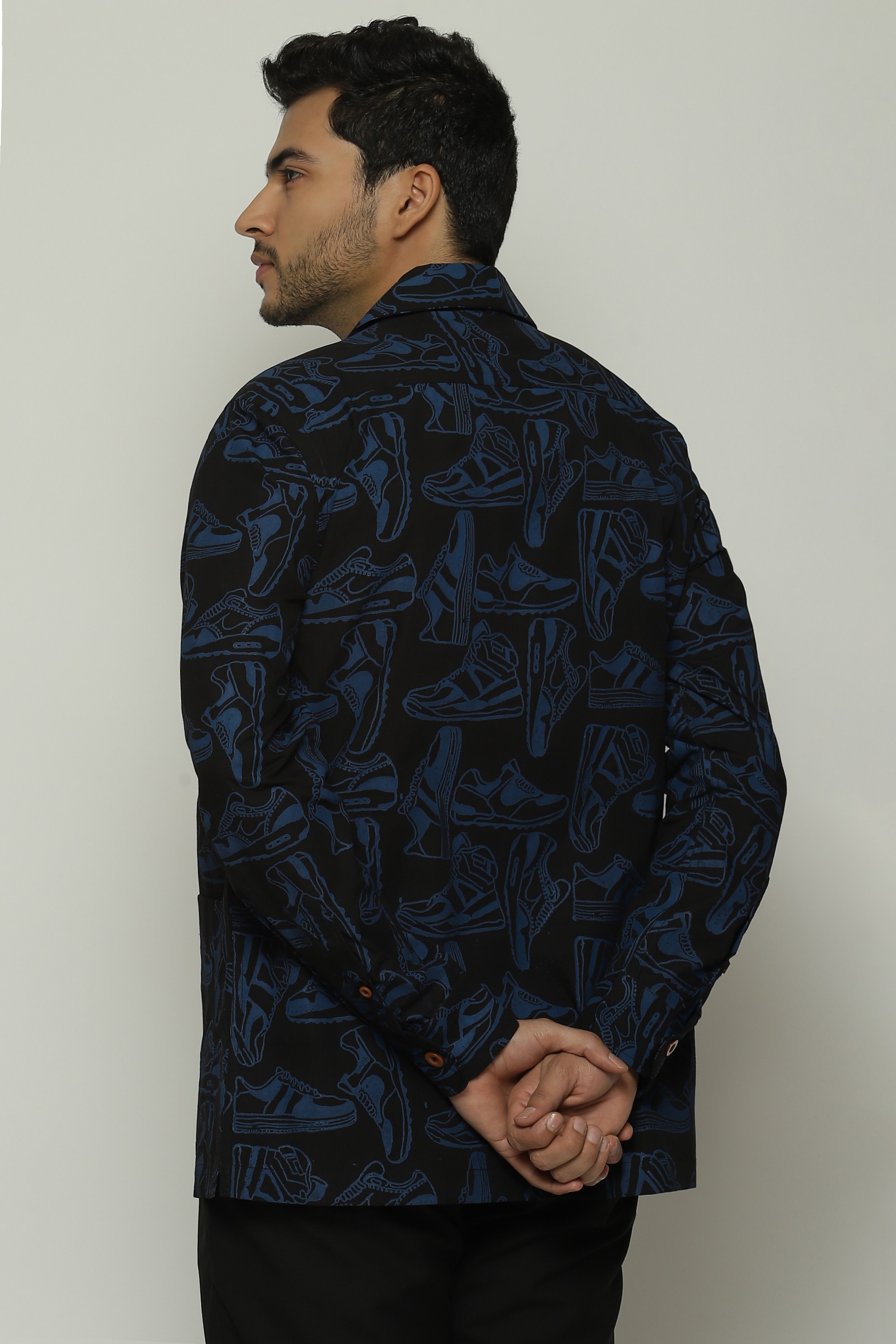 Sneakers of all shapes line this black safari shirt.