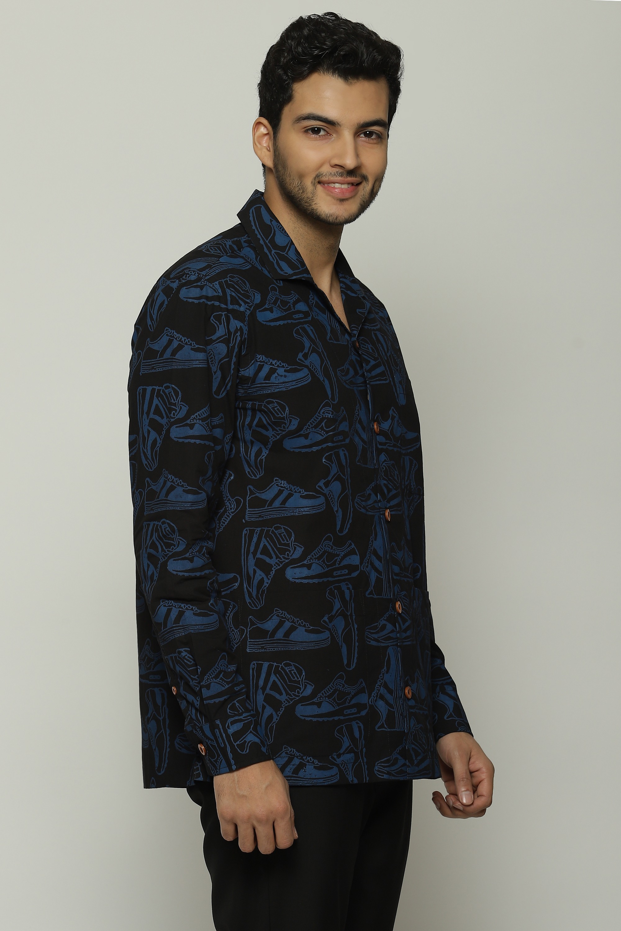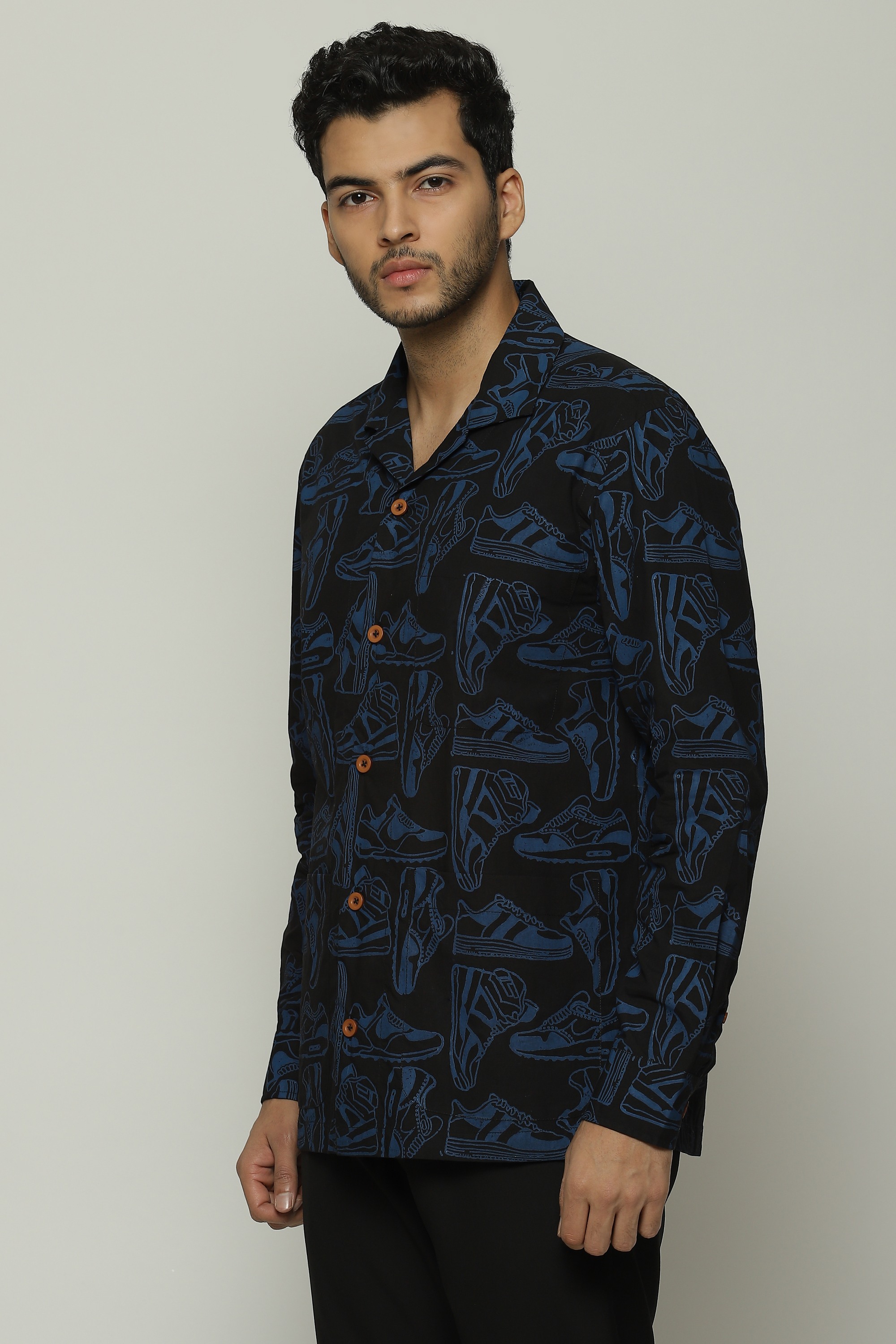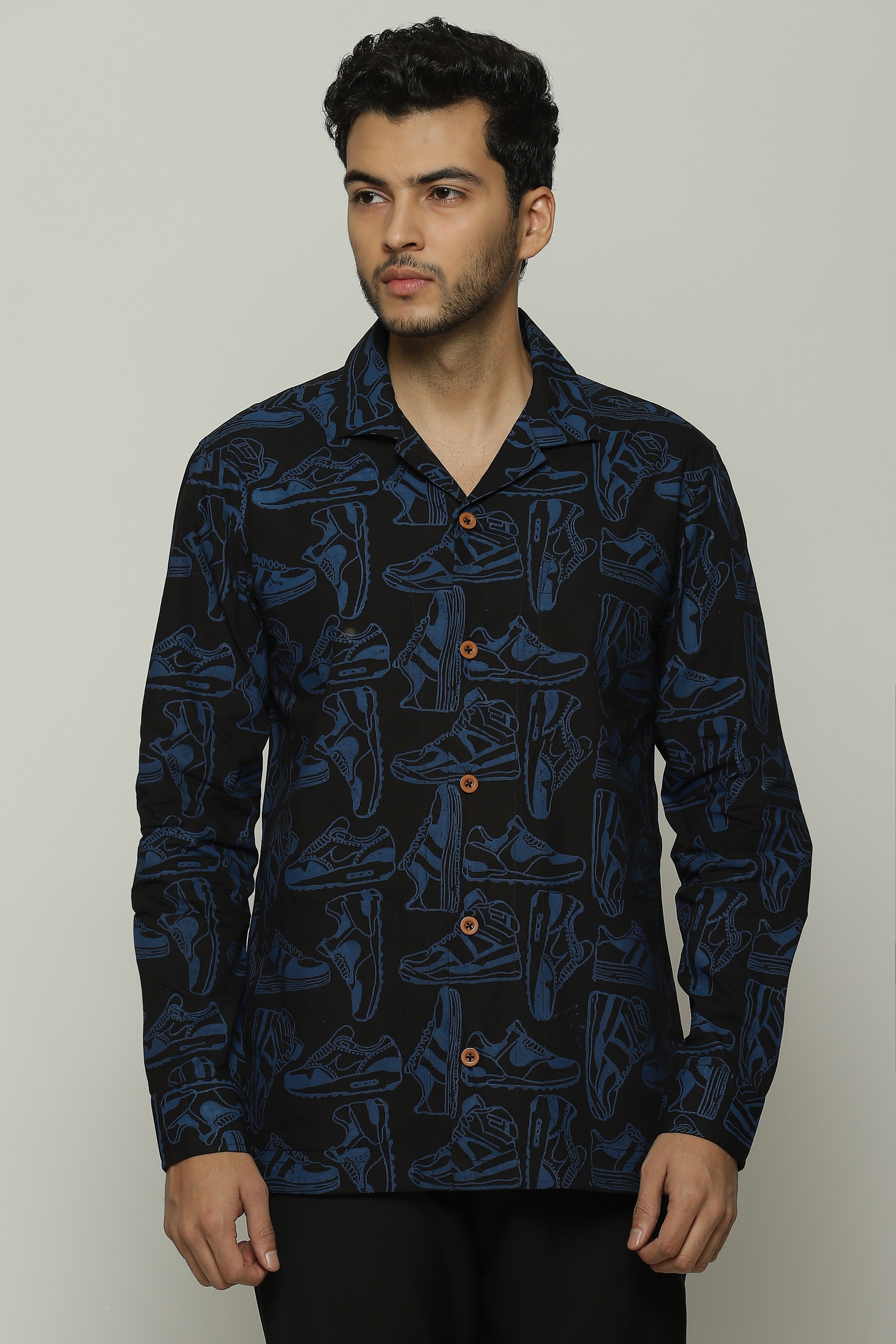 Sneakers of all shapes line this black safari shirt.