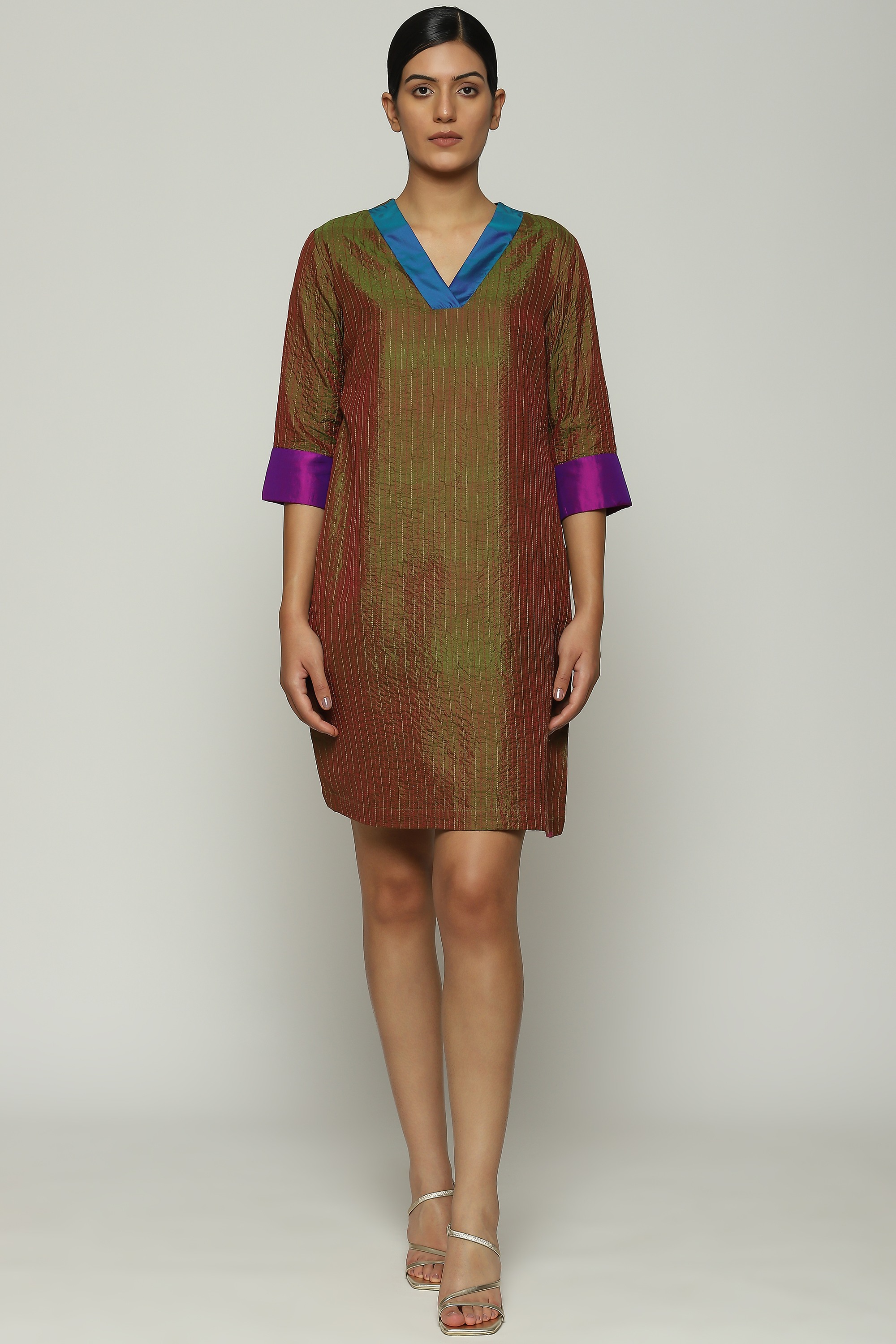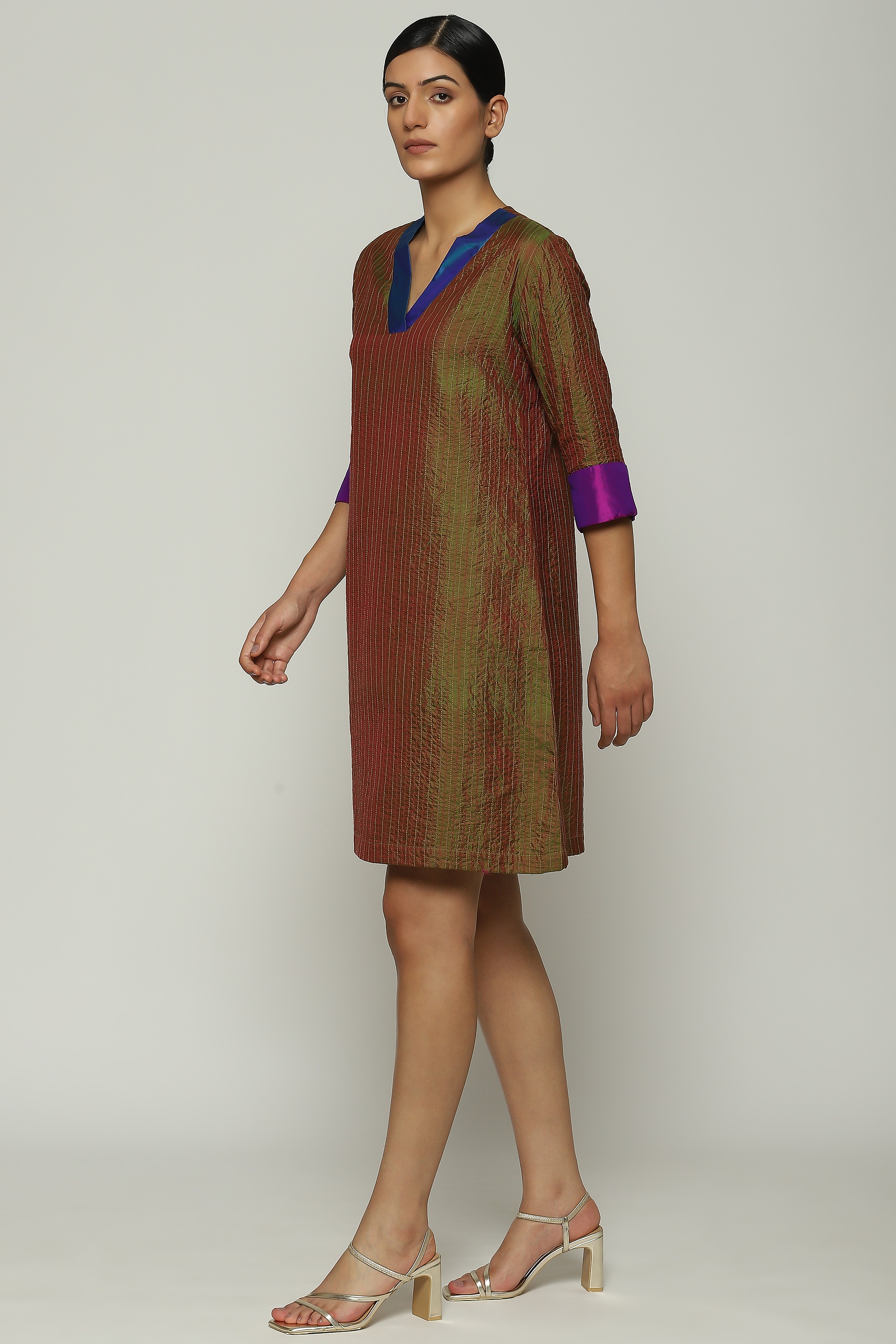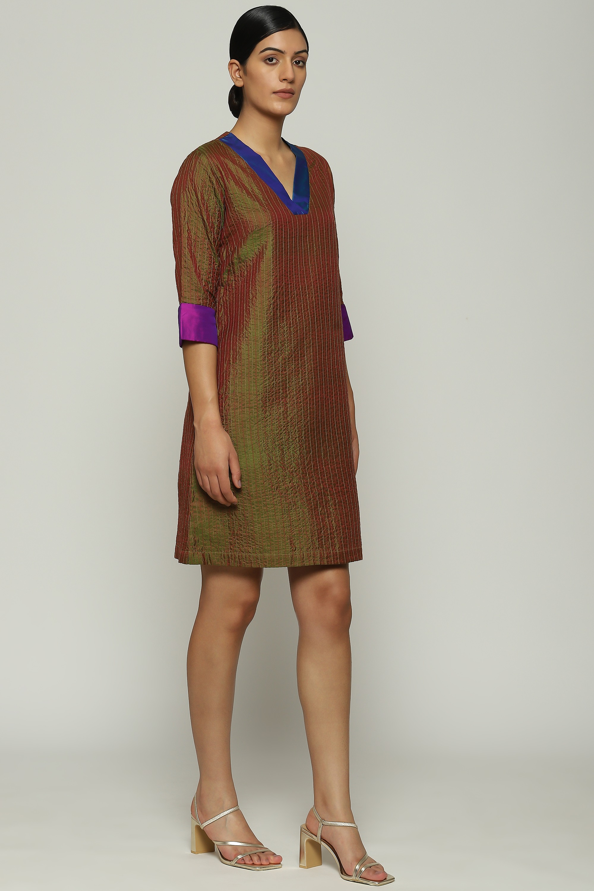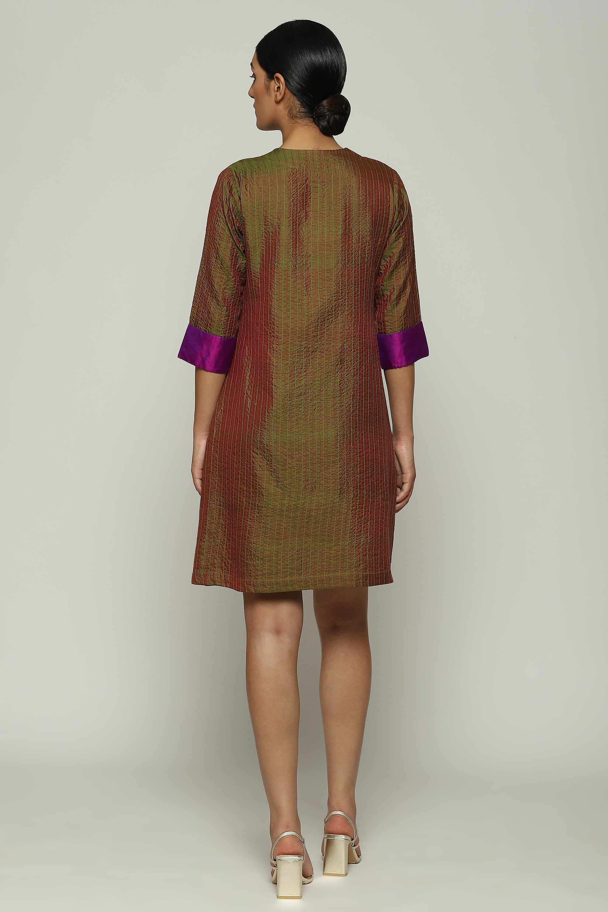 Crafted from a fabric where differently colored warp and weft create a mesmerizing illusion, this dress is embroidered using the Italian Trapunto technique.