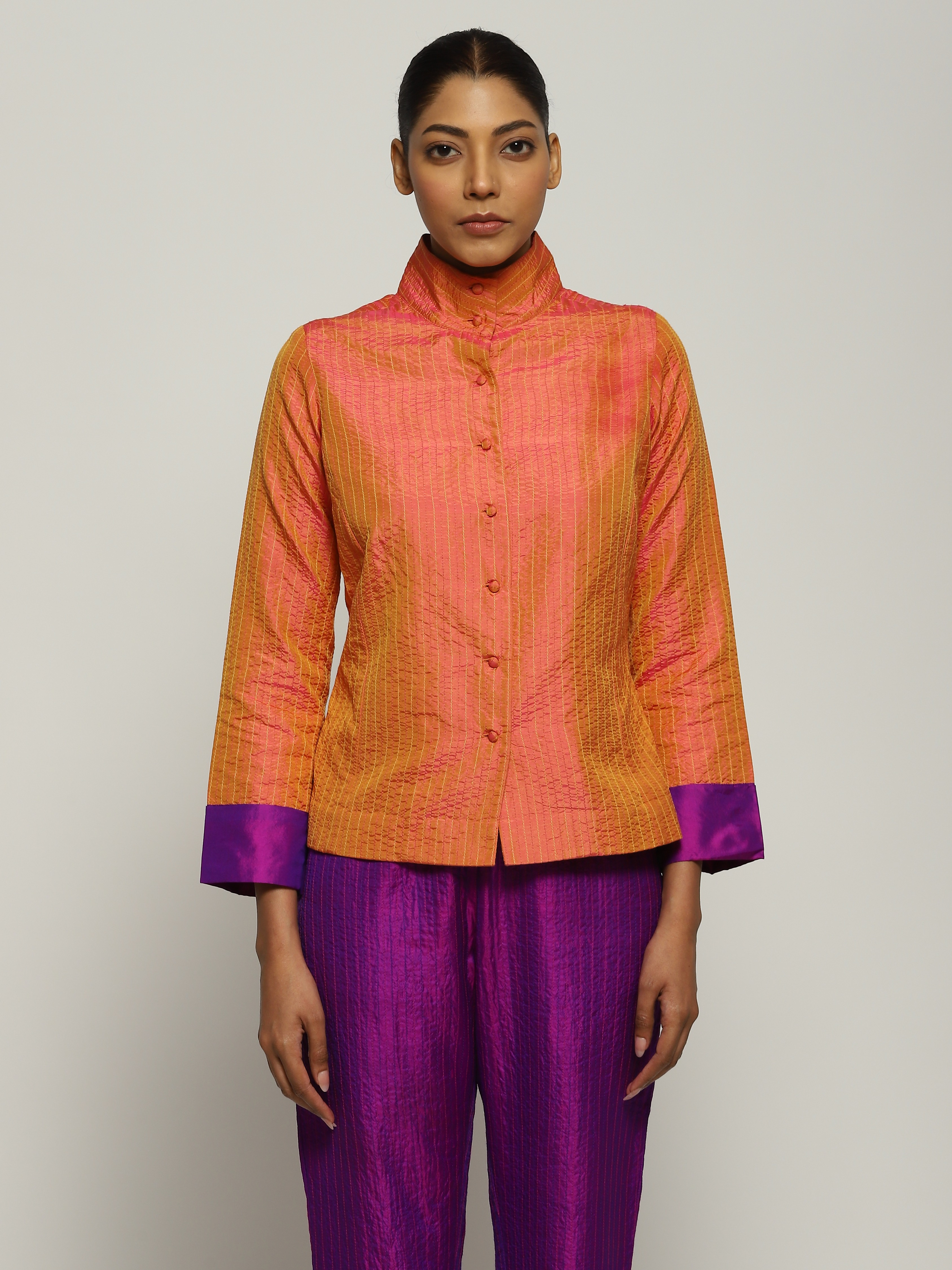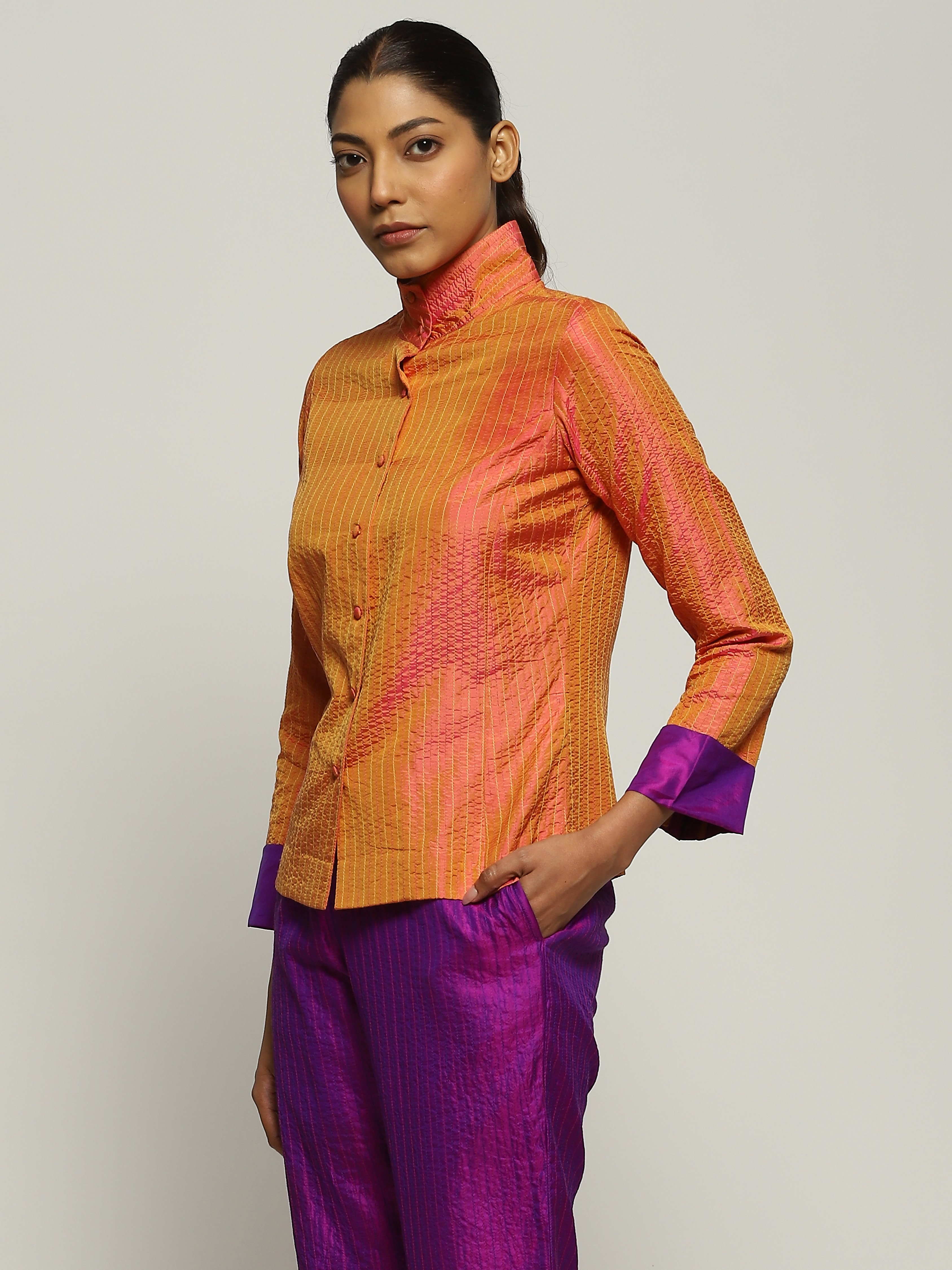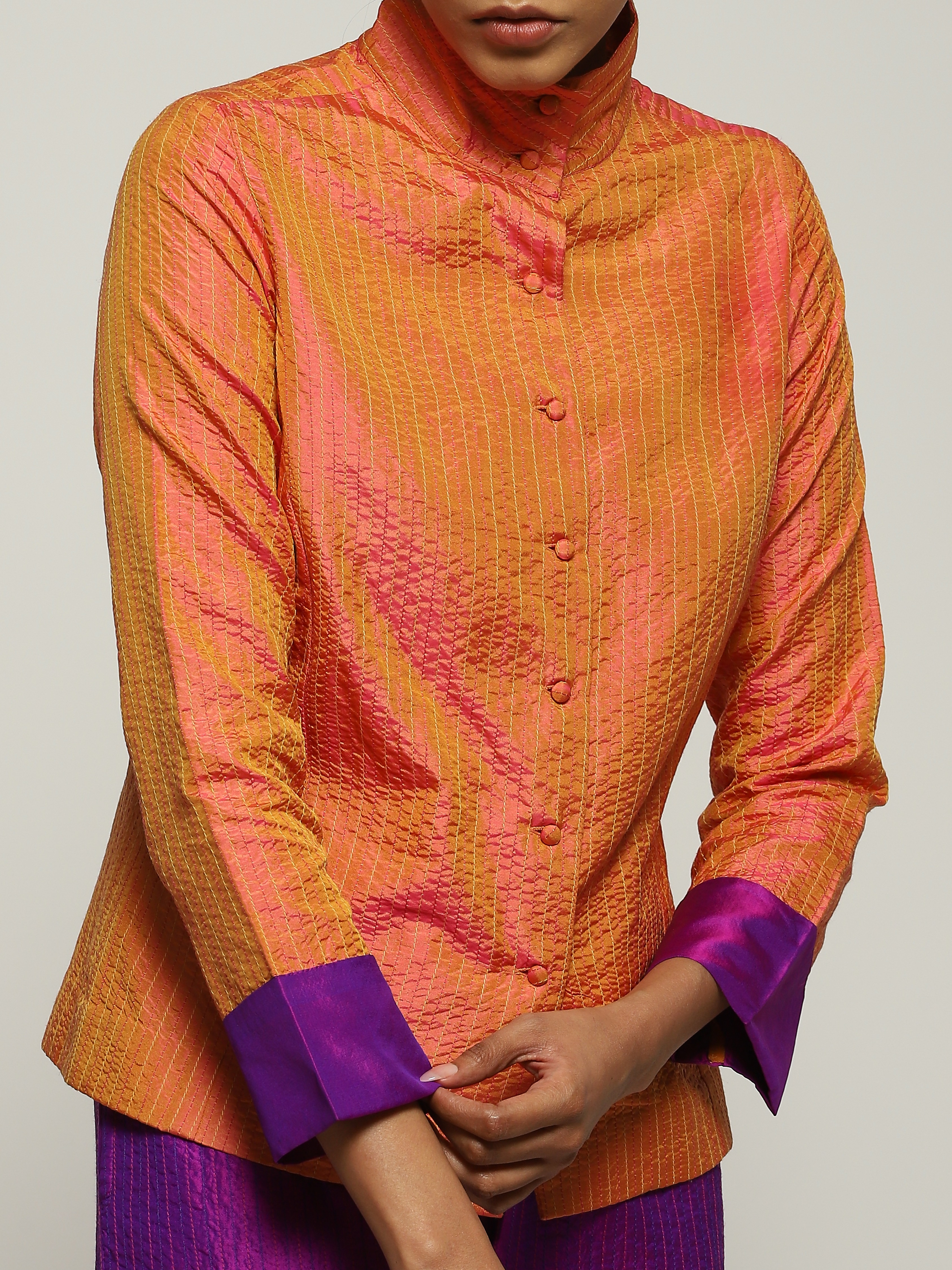 Crafted from a fabric where differently colored warp and weft create a mesmerizing illusion, this shirt is embroidered using the Italian Trapunto technique.