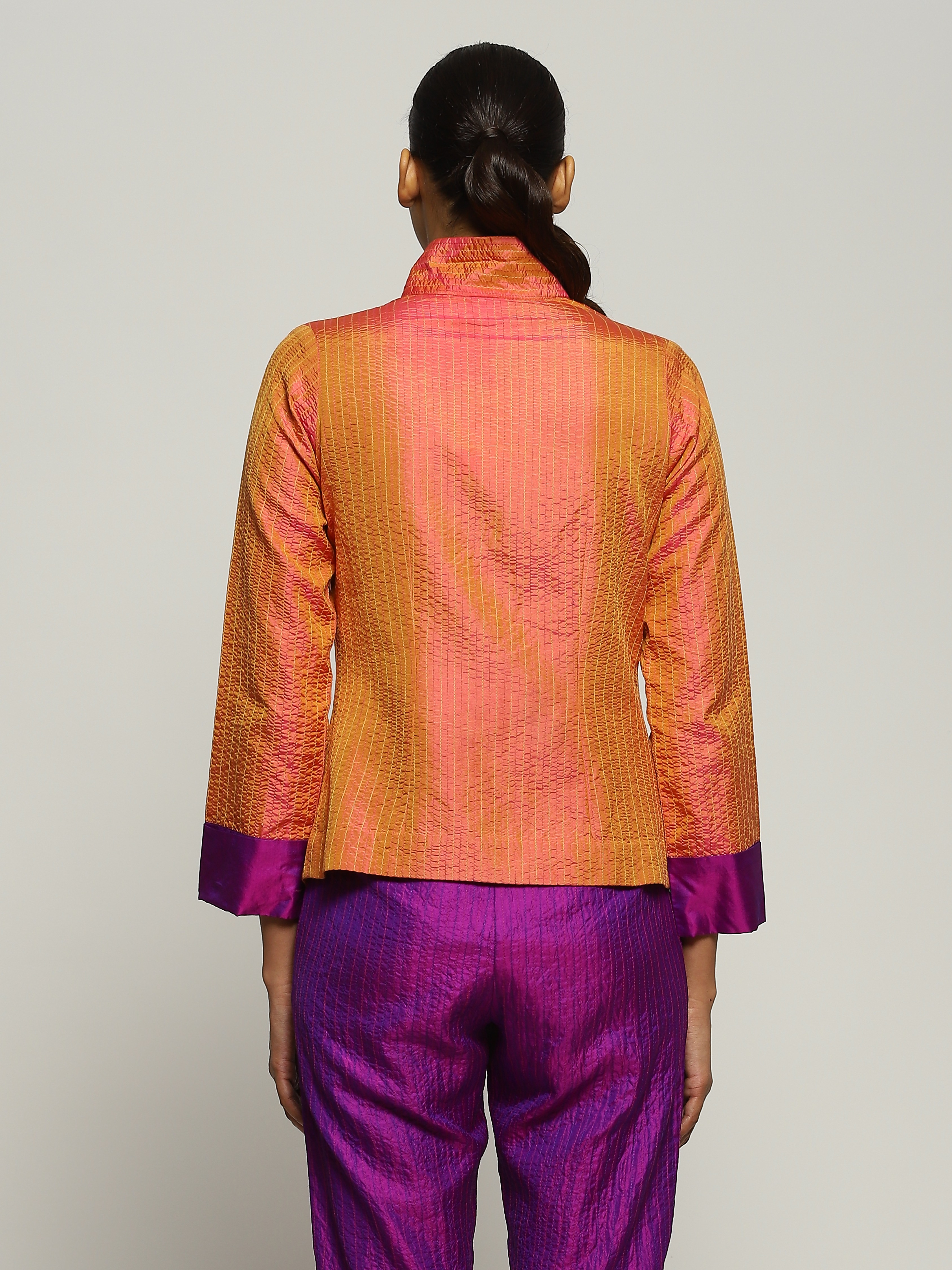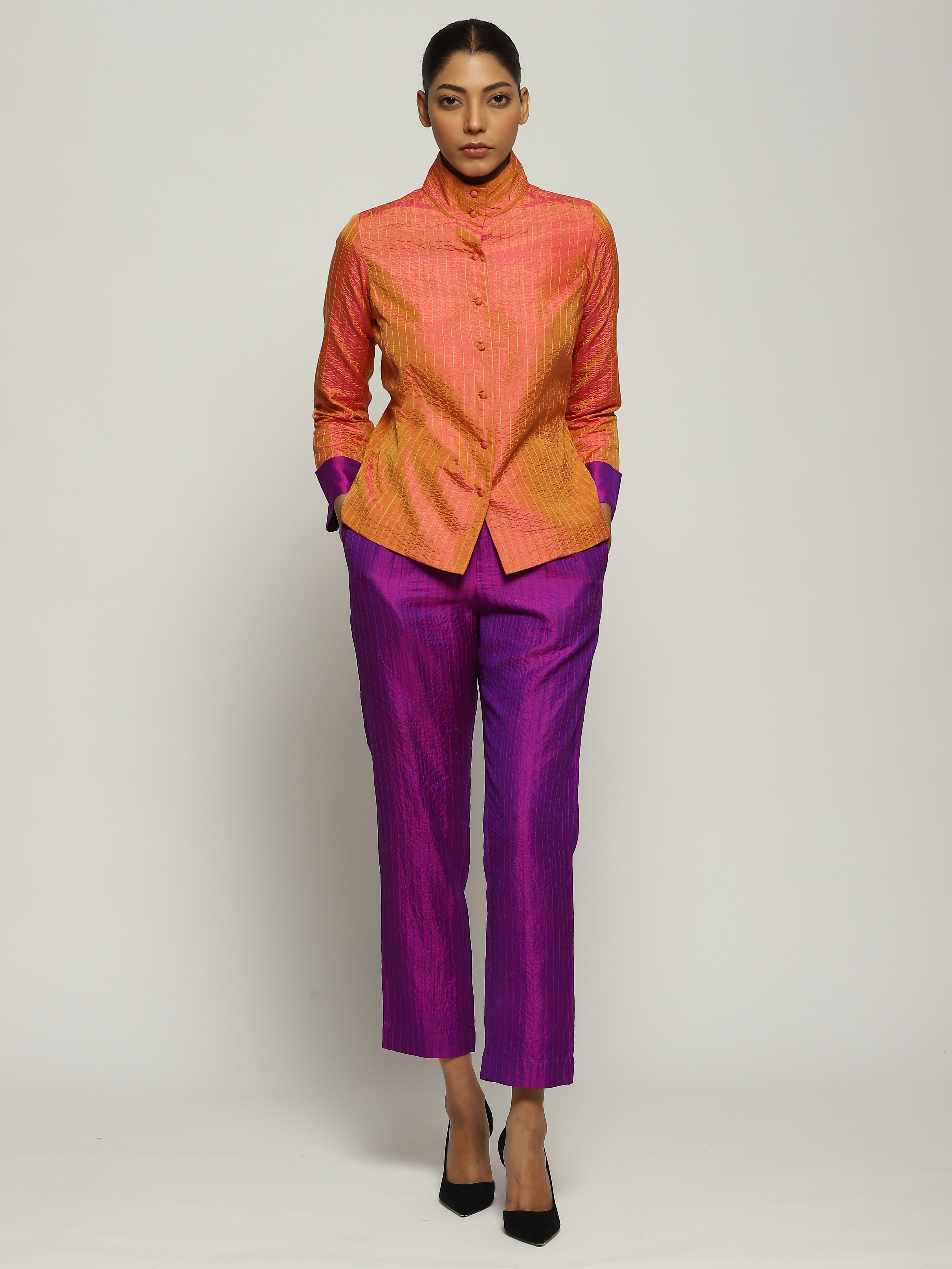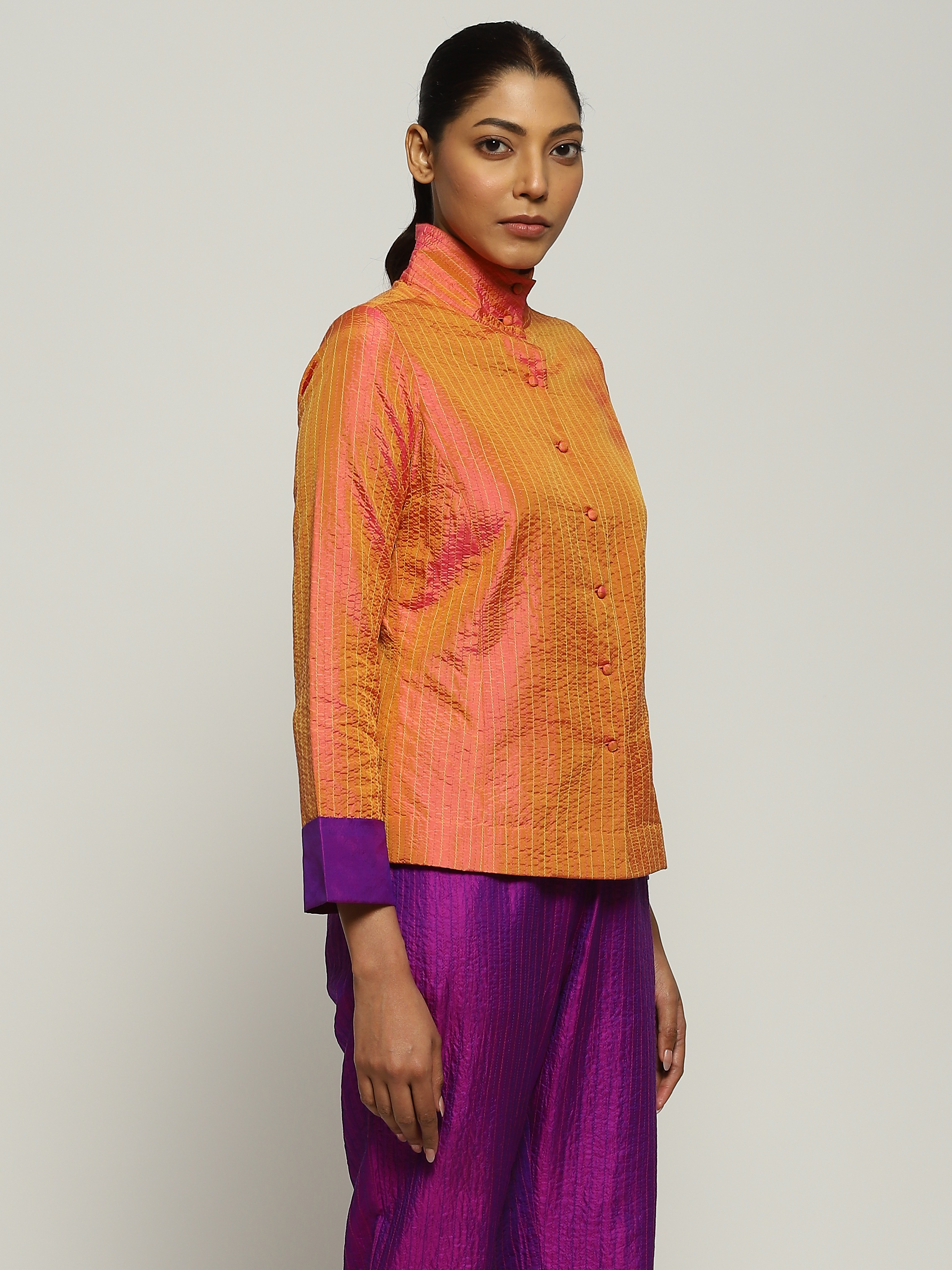 Crafted from a fabric where differently colored warp and weft create a mesmerizing illusion, this shirt is embroidered using the Italian Trapunto technique.