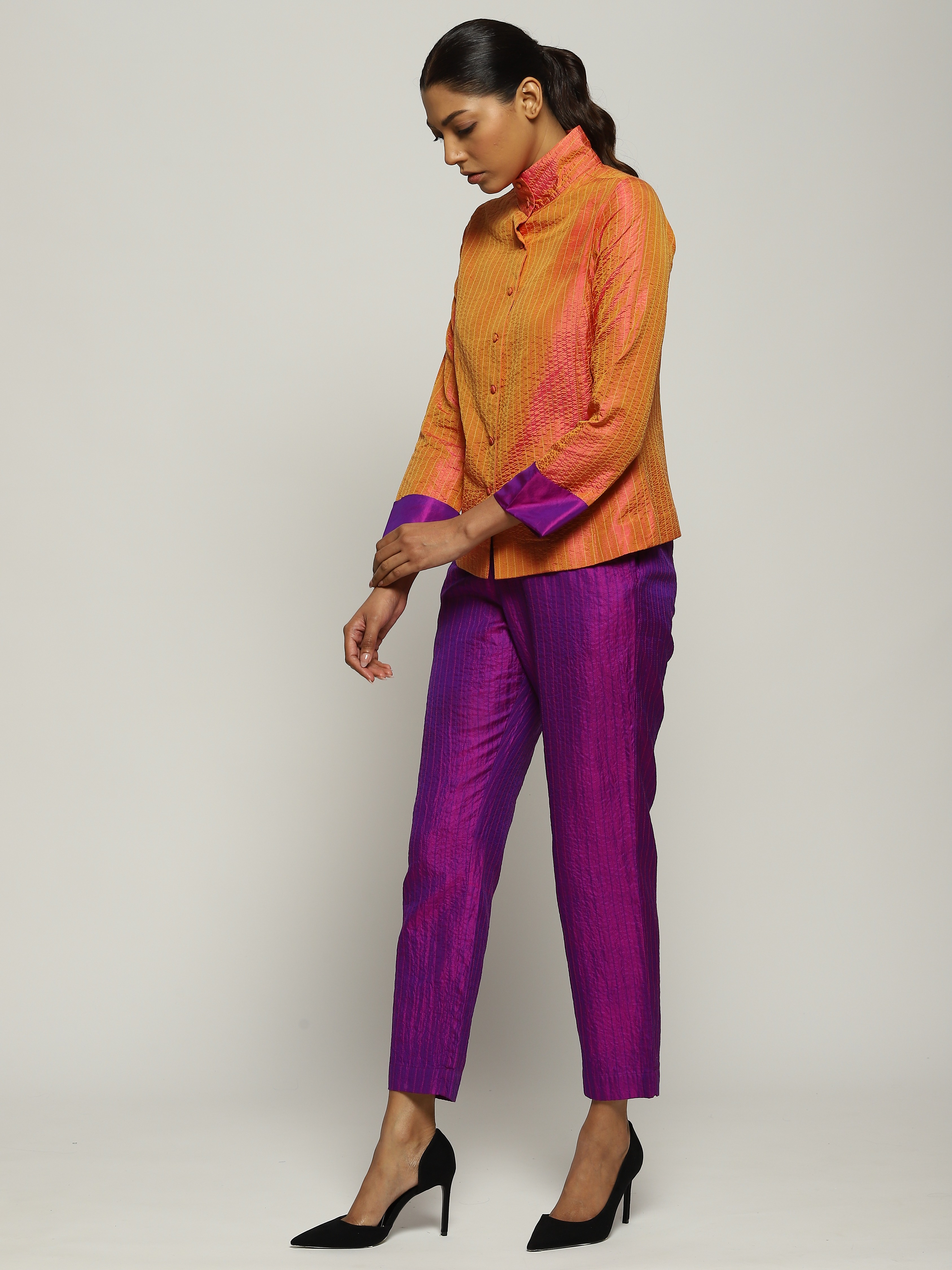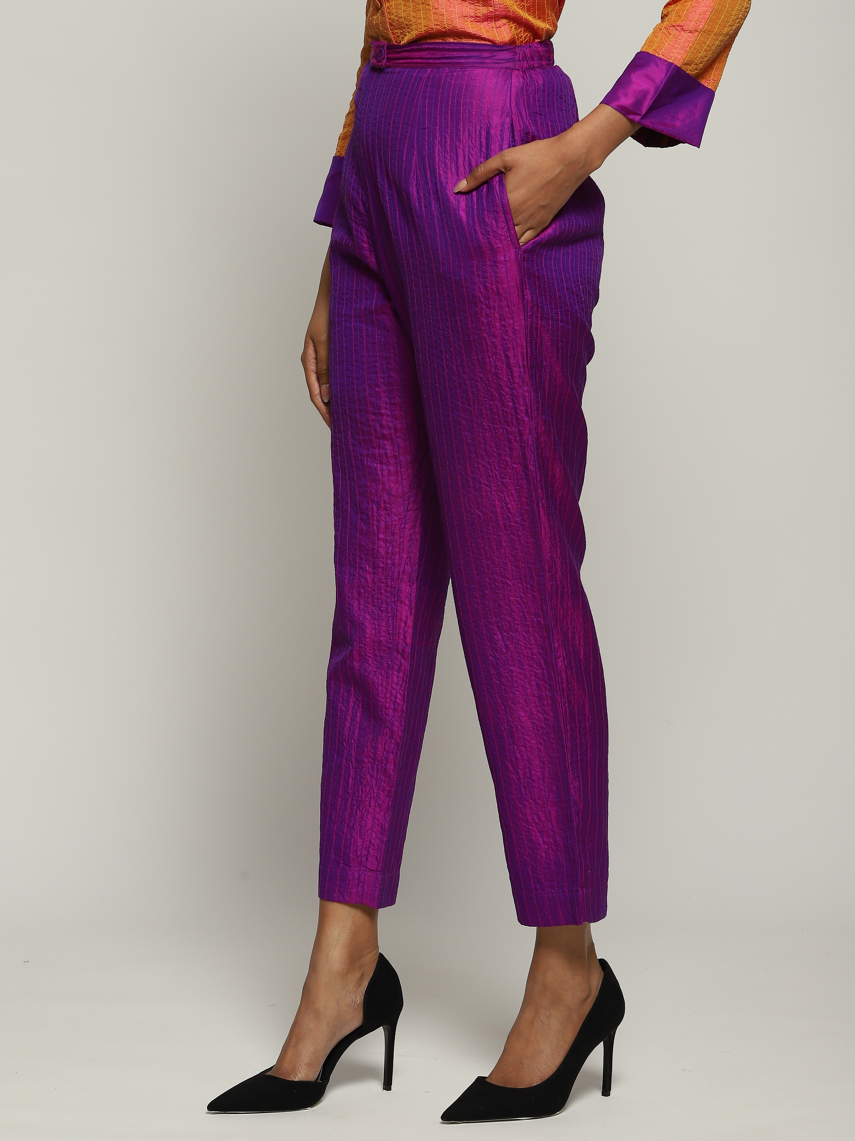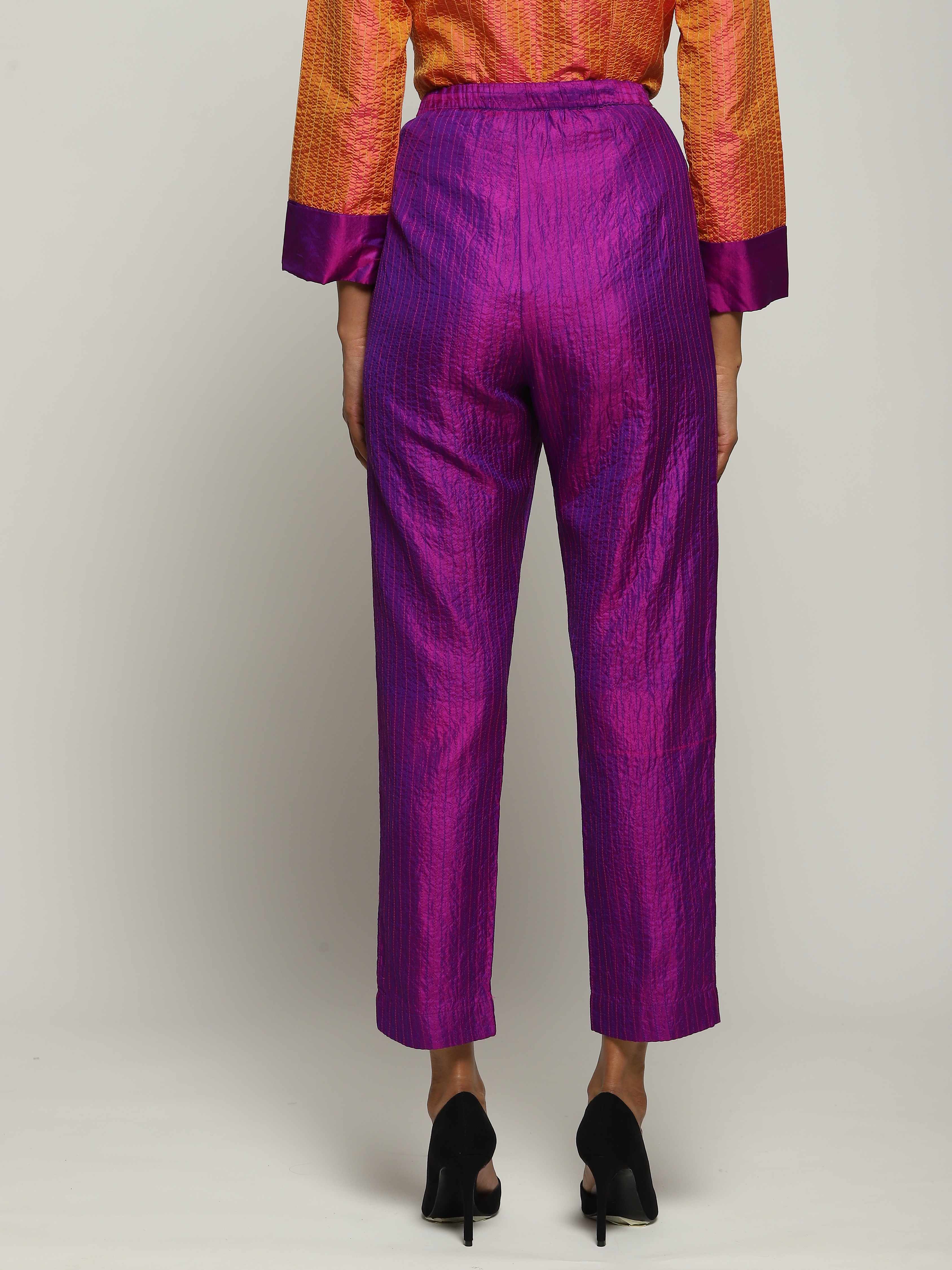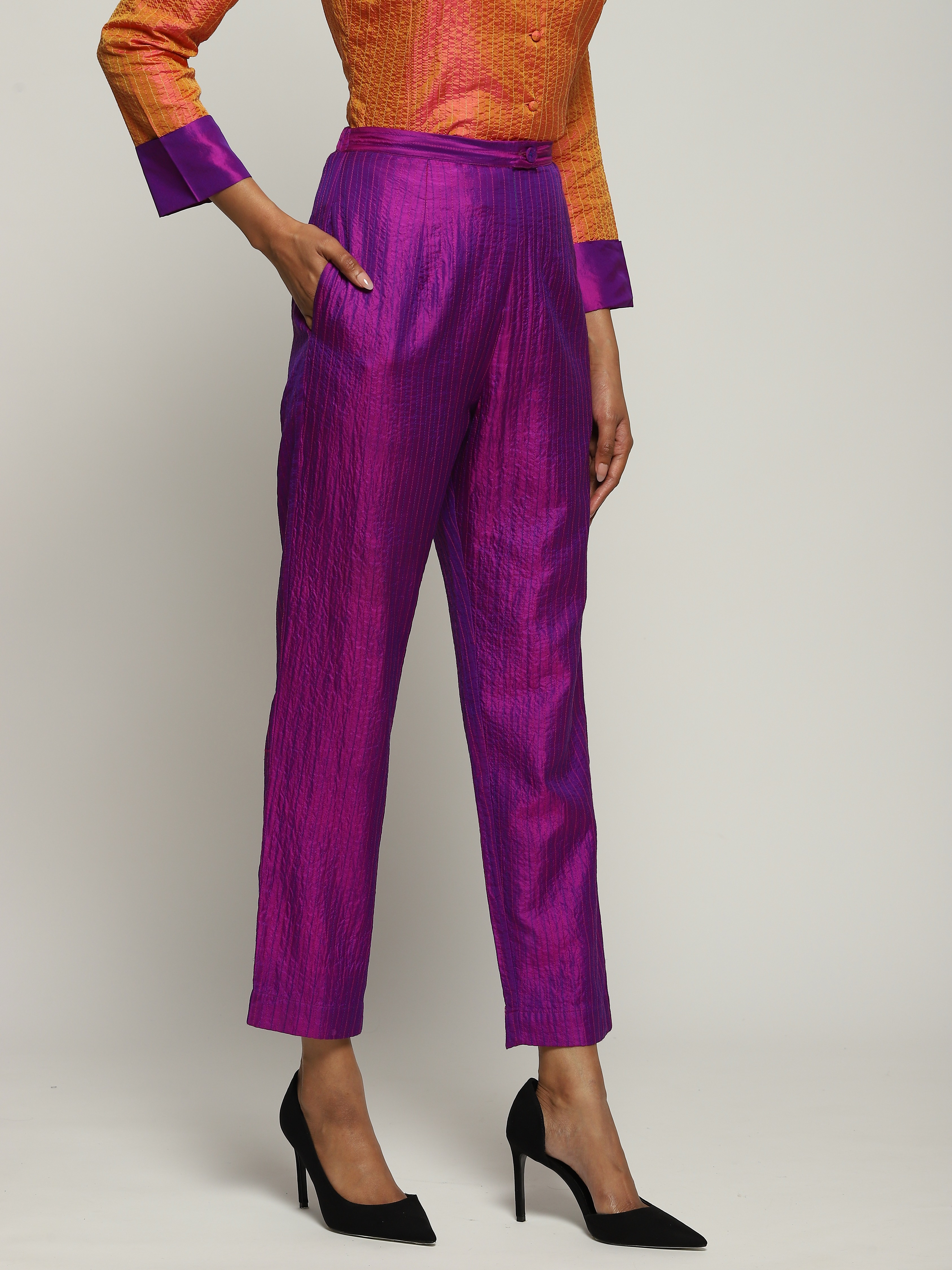 A pair of violet trousers in opalescent shot silk.