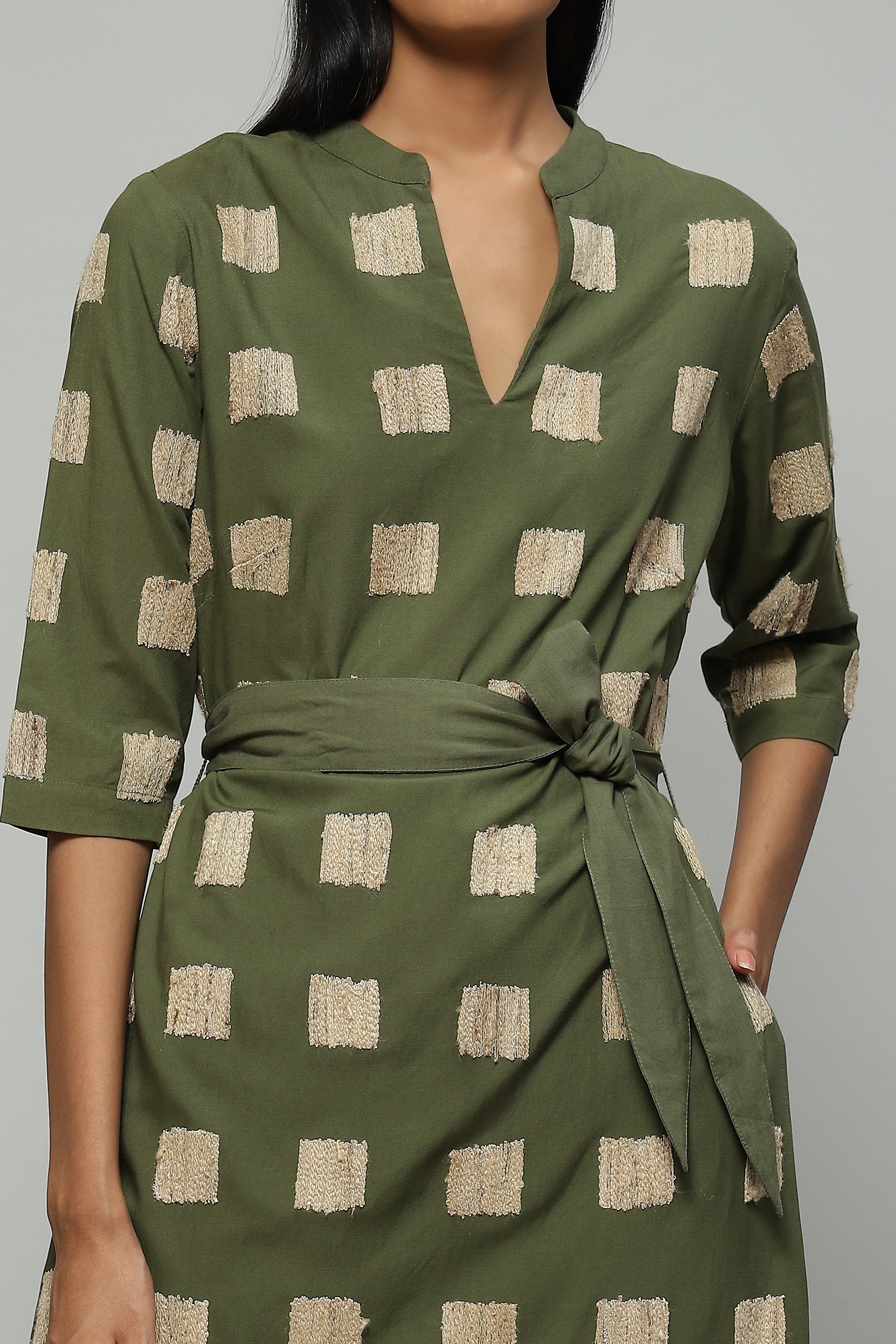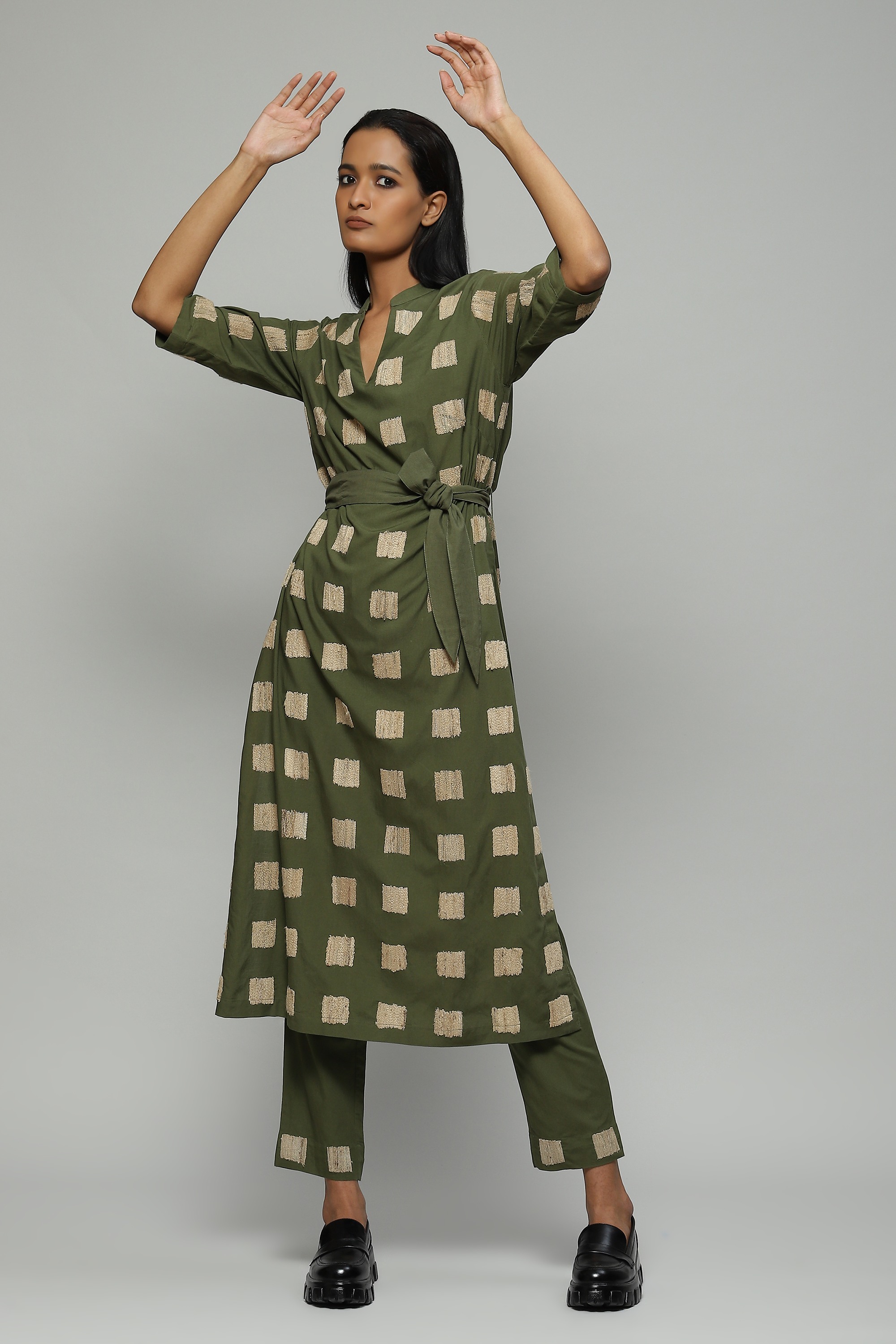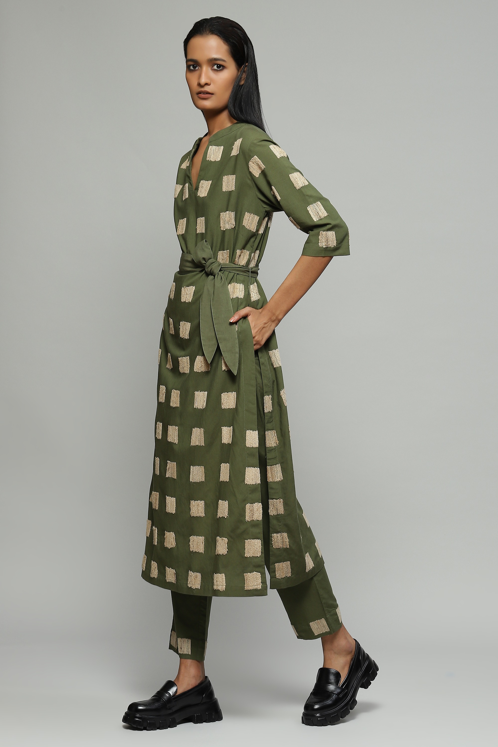 A seagrass-hued kurta crafted in an Ecovero-cotton blend and embroidered with an allover check pattern using actual silk tussar yarn
