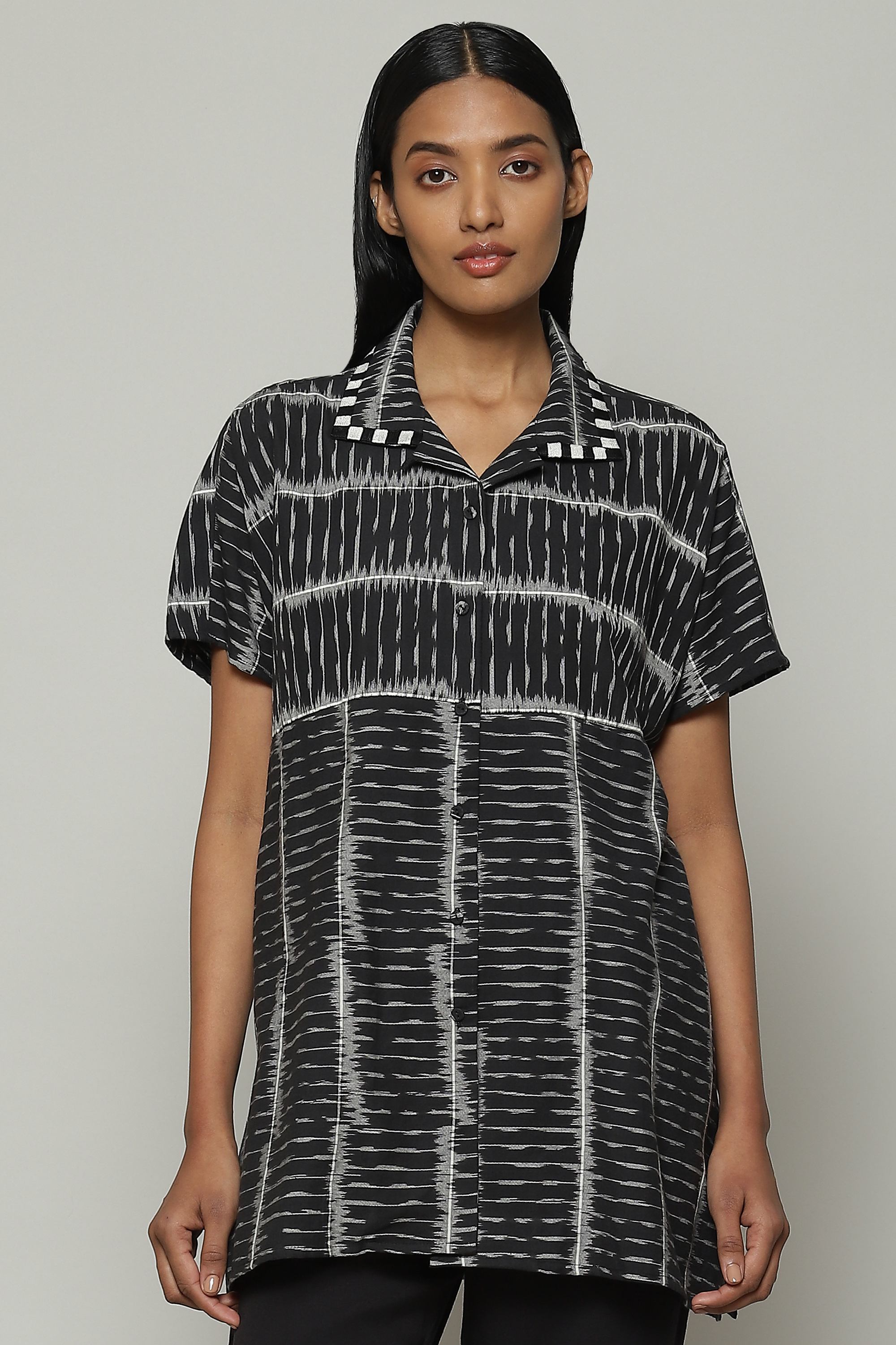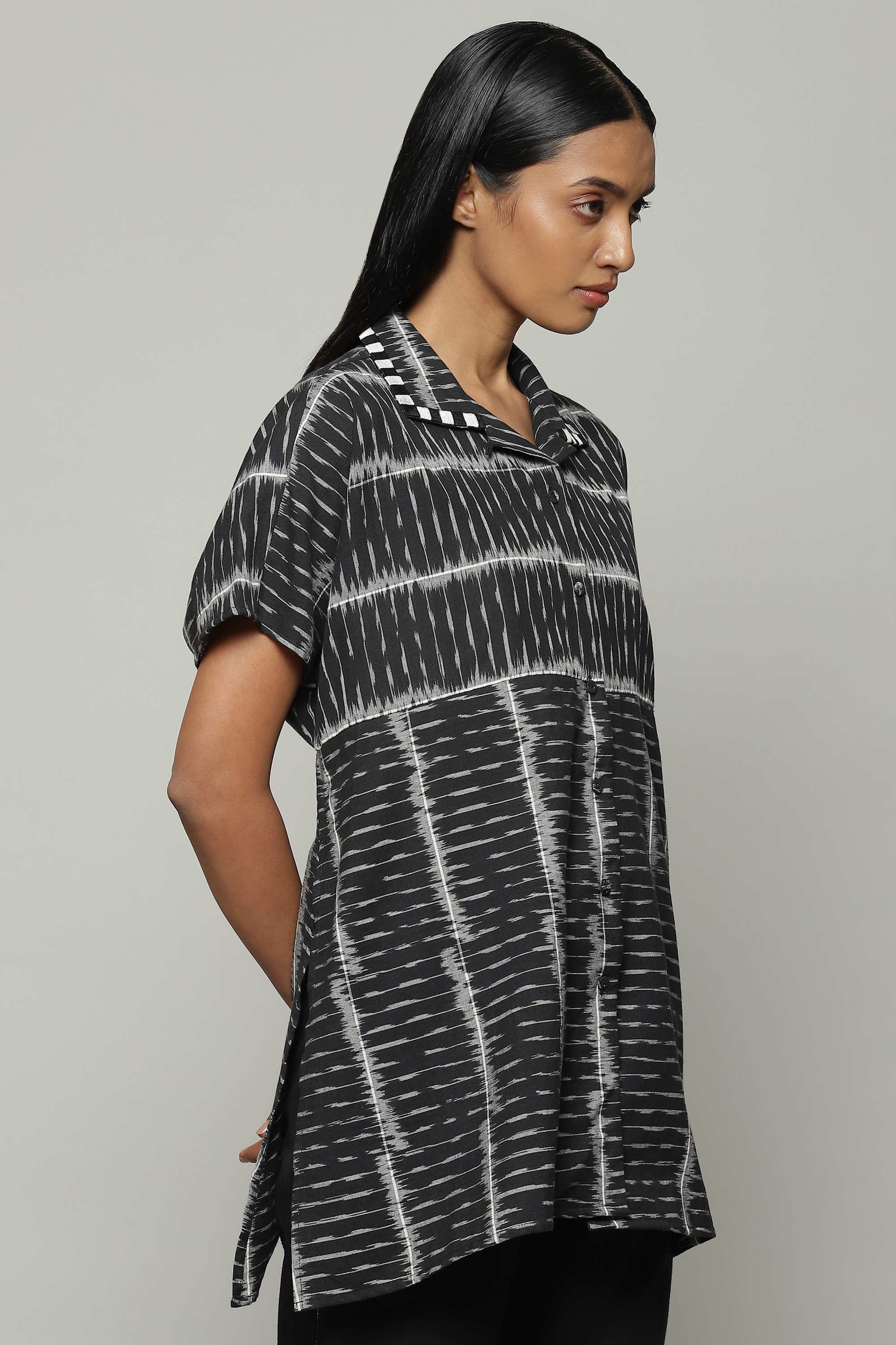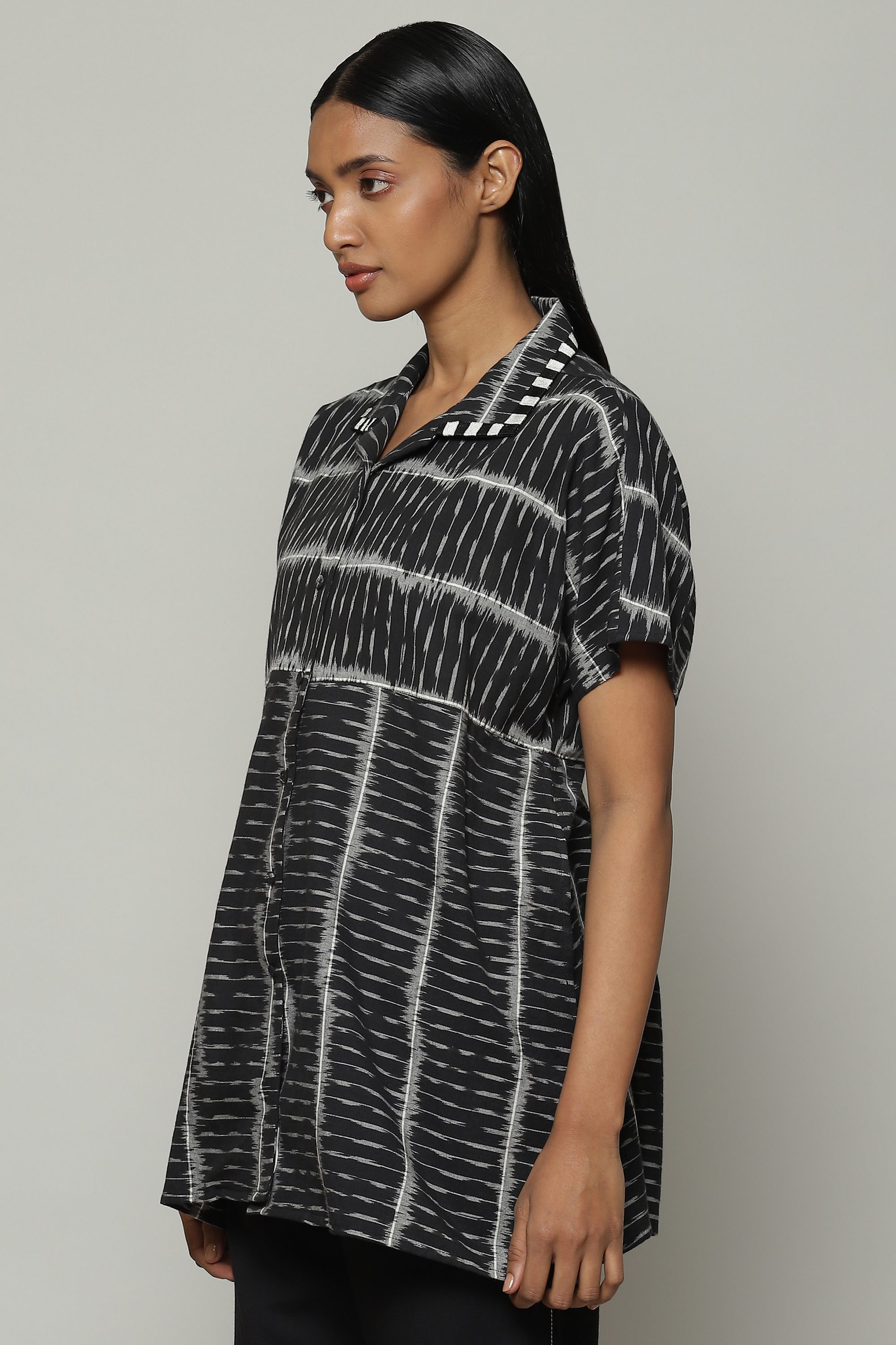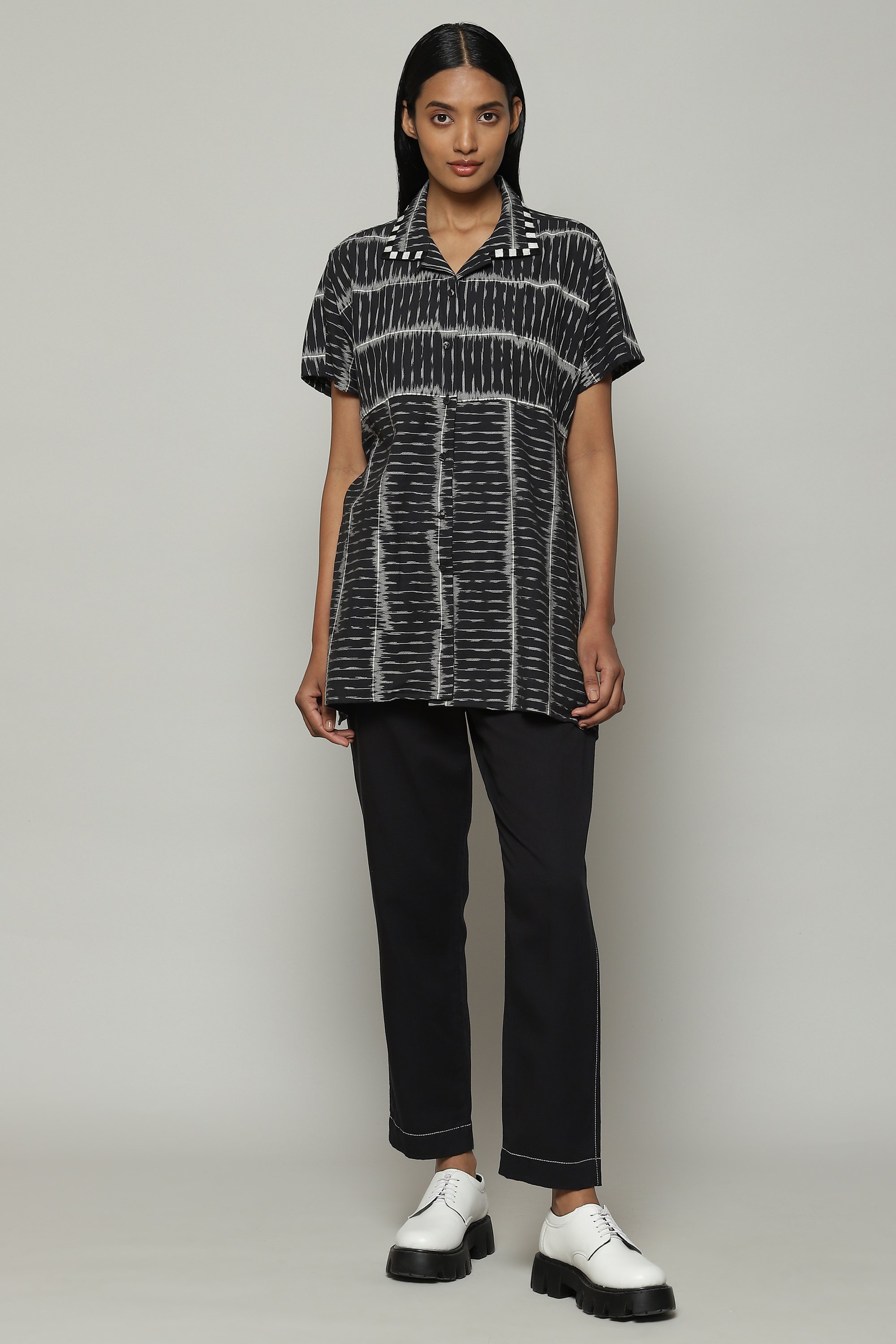 A black shirt, featuring an Ikat weave. Lighweight cotton yarn has been first tie dyed and then woven together to produce its timeless design. Equally happy with flats, sneakers, or heels.