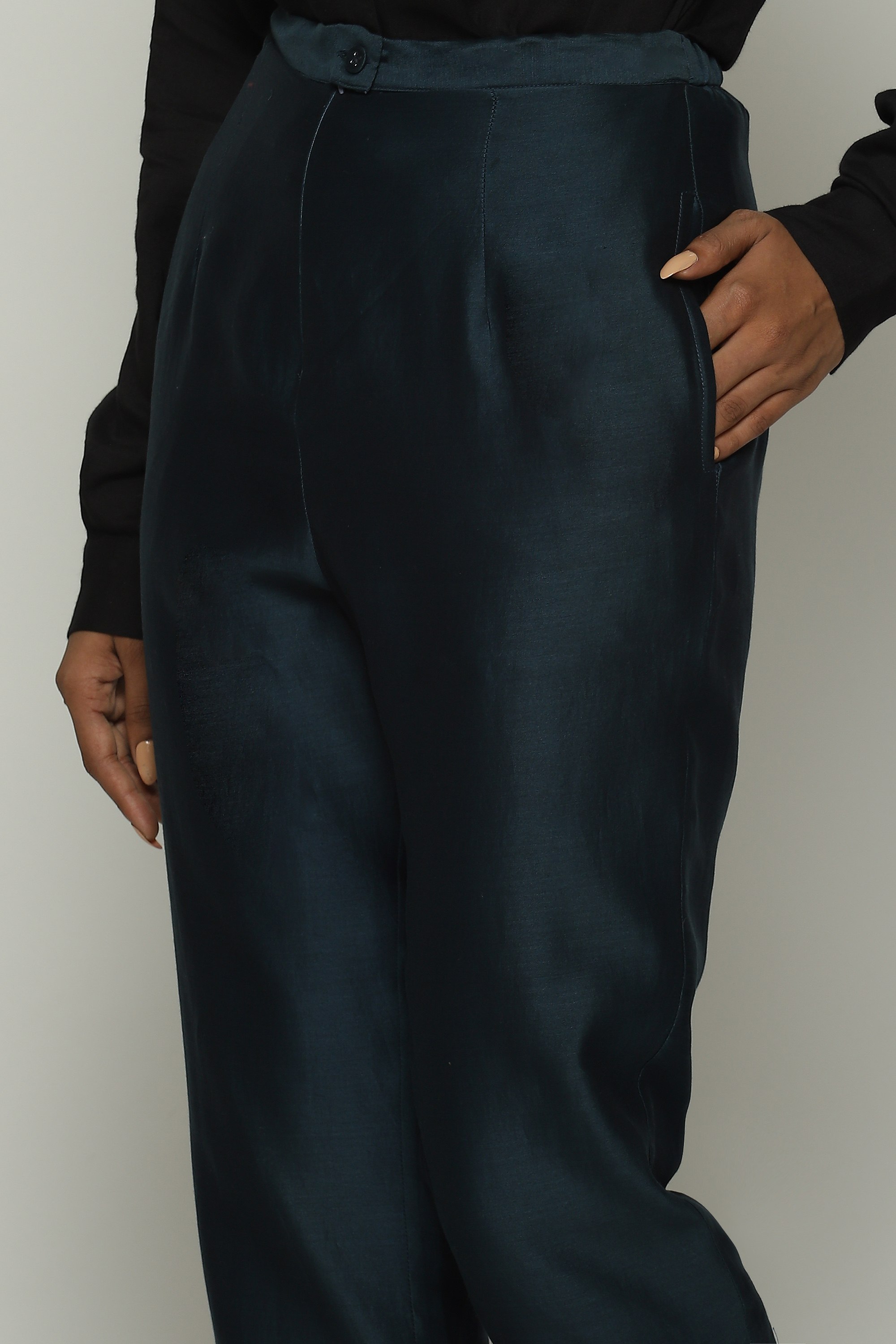 A pair of denim-coloured tapered pants with straight legs. Part of our new range of wardrobe essentials, this easygoing shirt is crafted from Chanderi — a fluid blend of cotton and silk characterized by its sheer, luxurious texture. Designed to be mixed and matched at will, we love this piece best with its co-ord shirt.