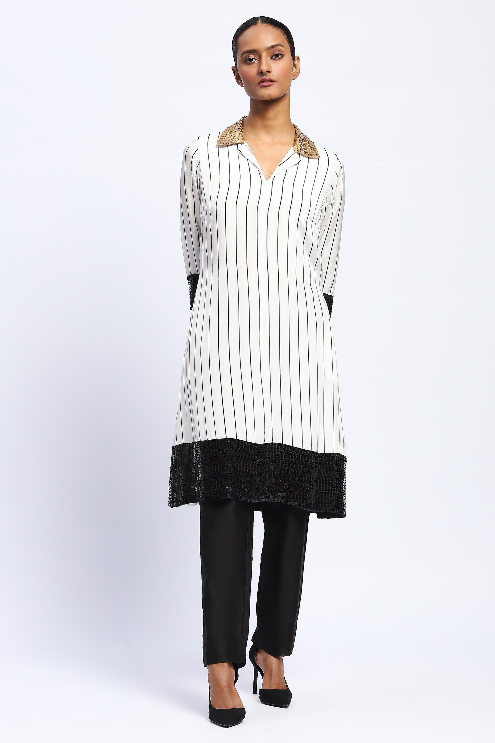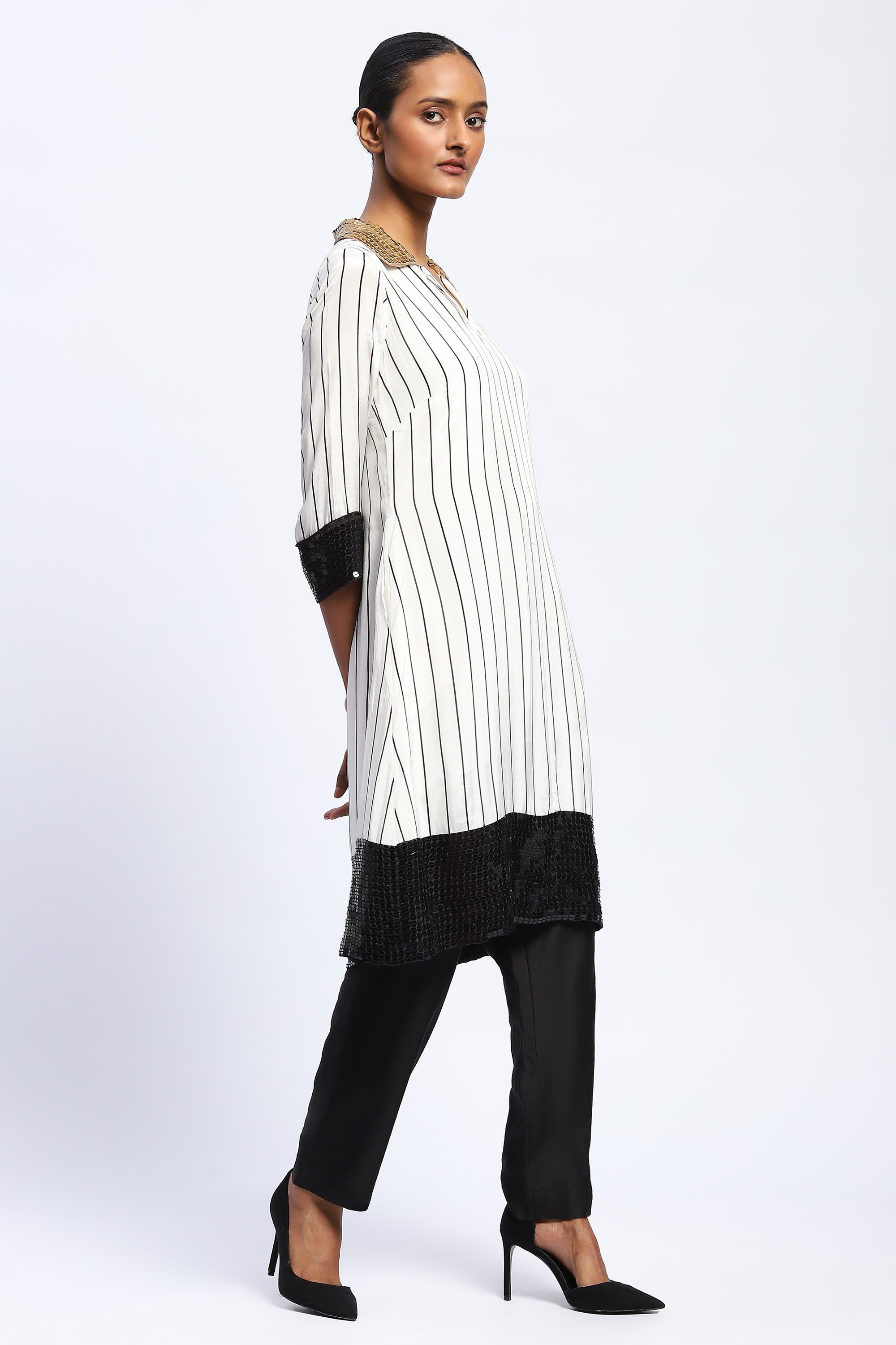 This limited edition piece has been made using a cellulose based crepe fabric, printed with stripes and hand embellished using sequins for subtle glamour.