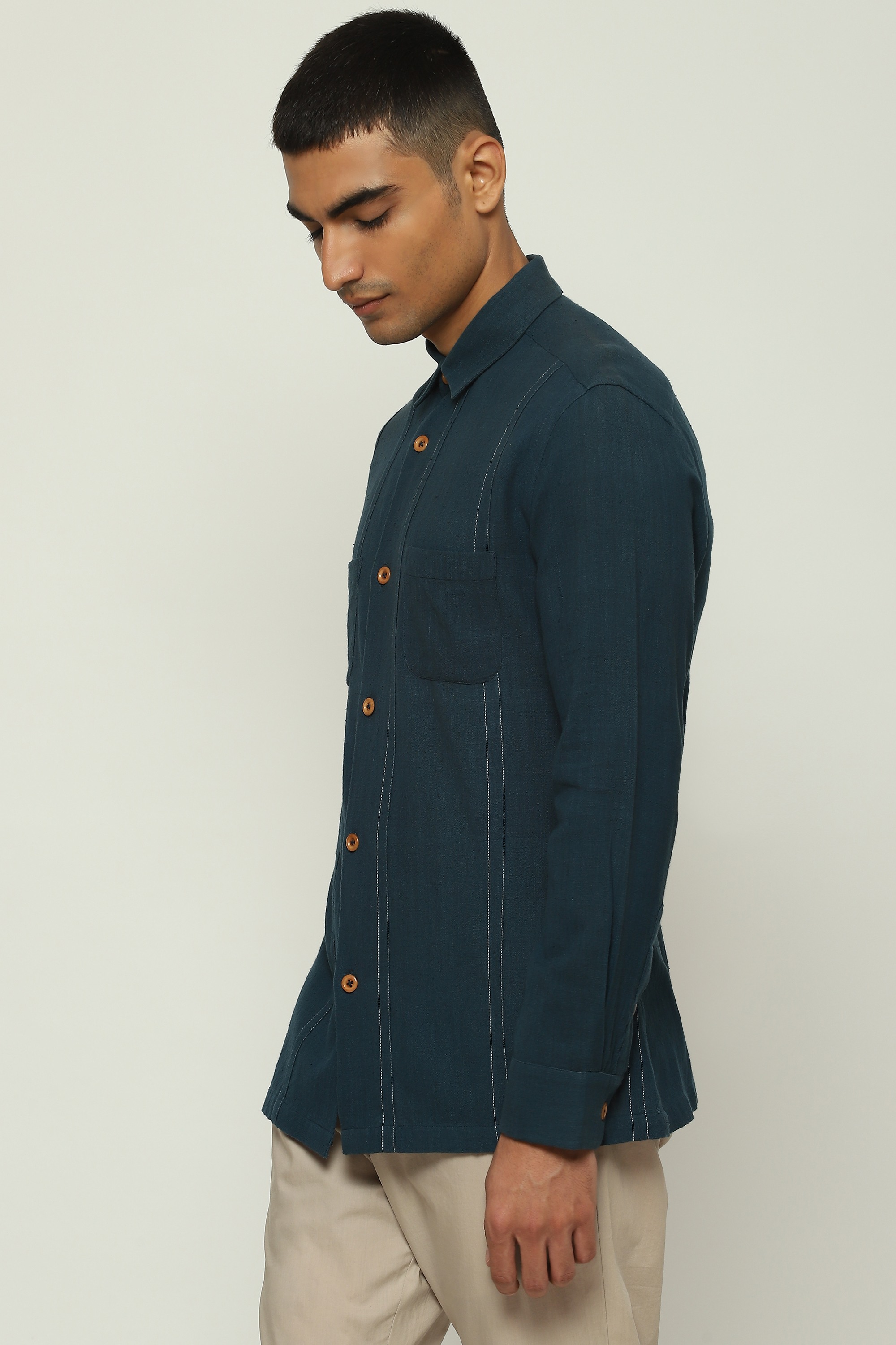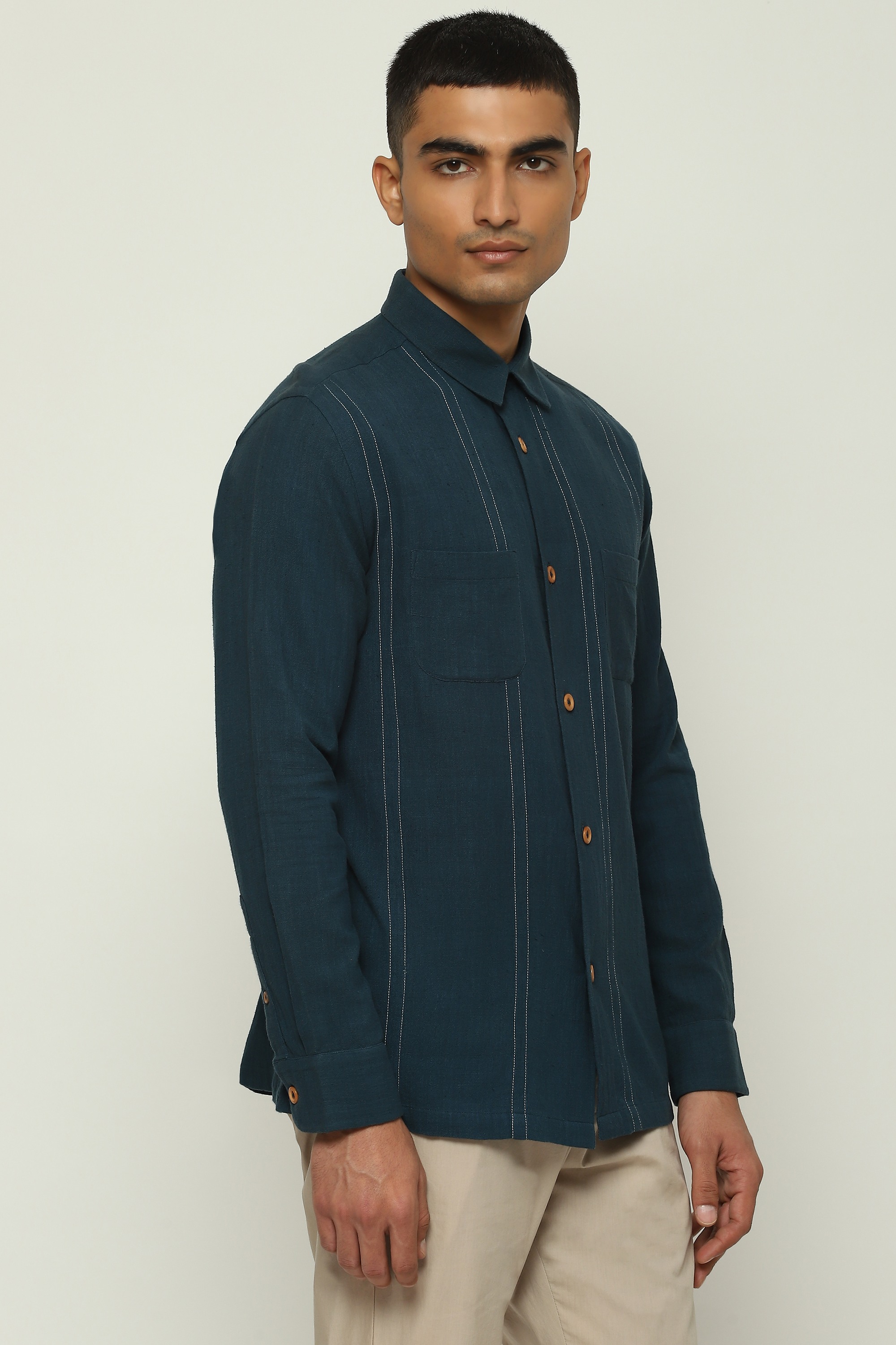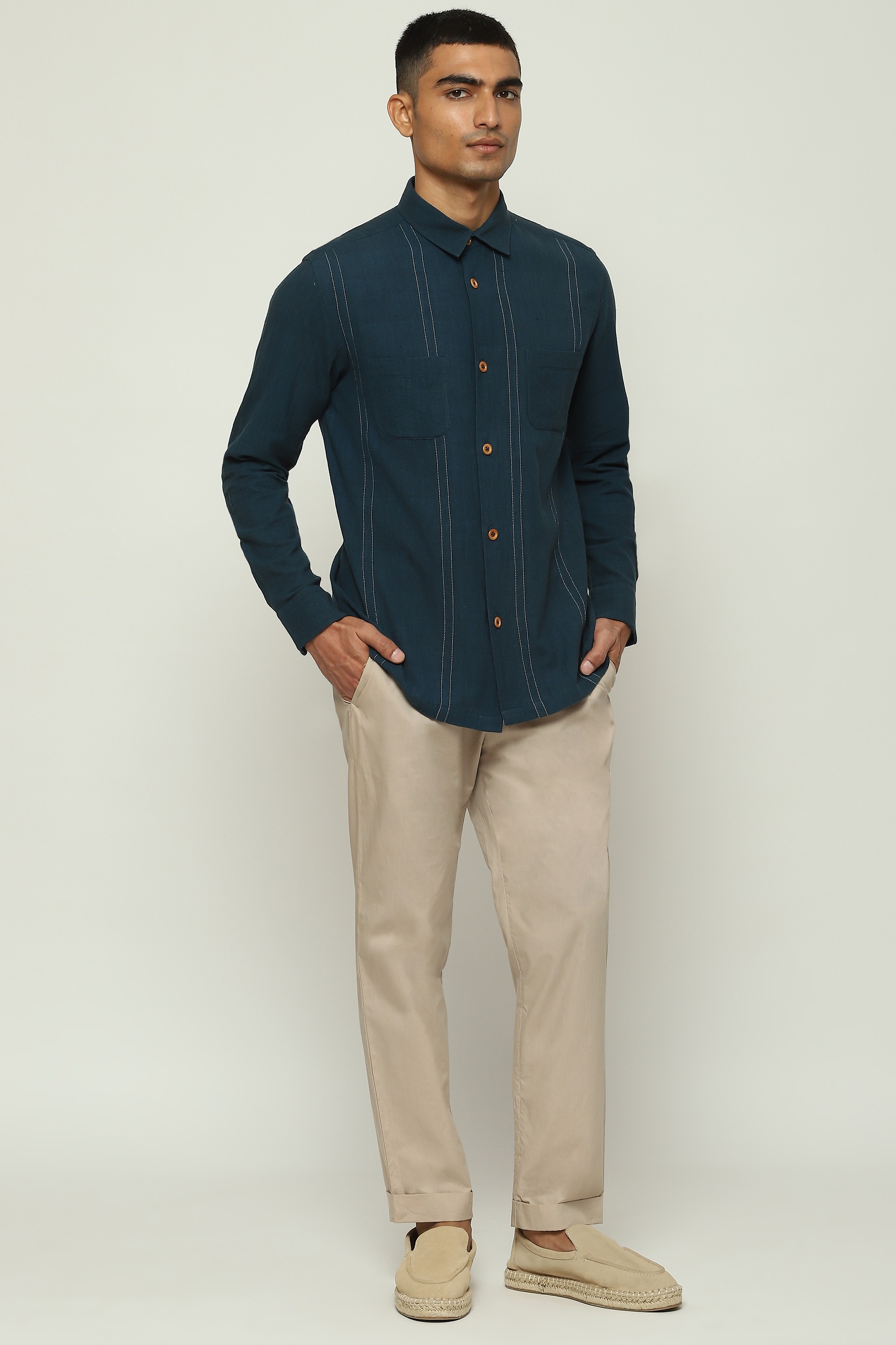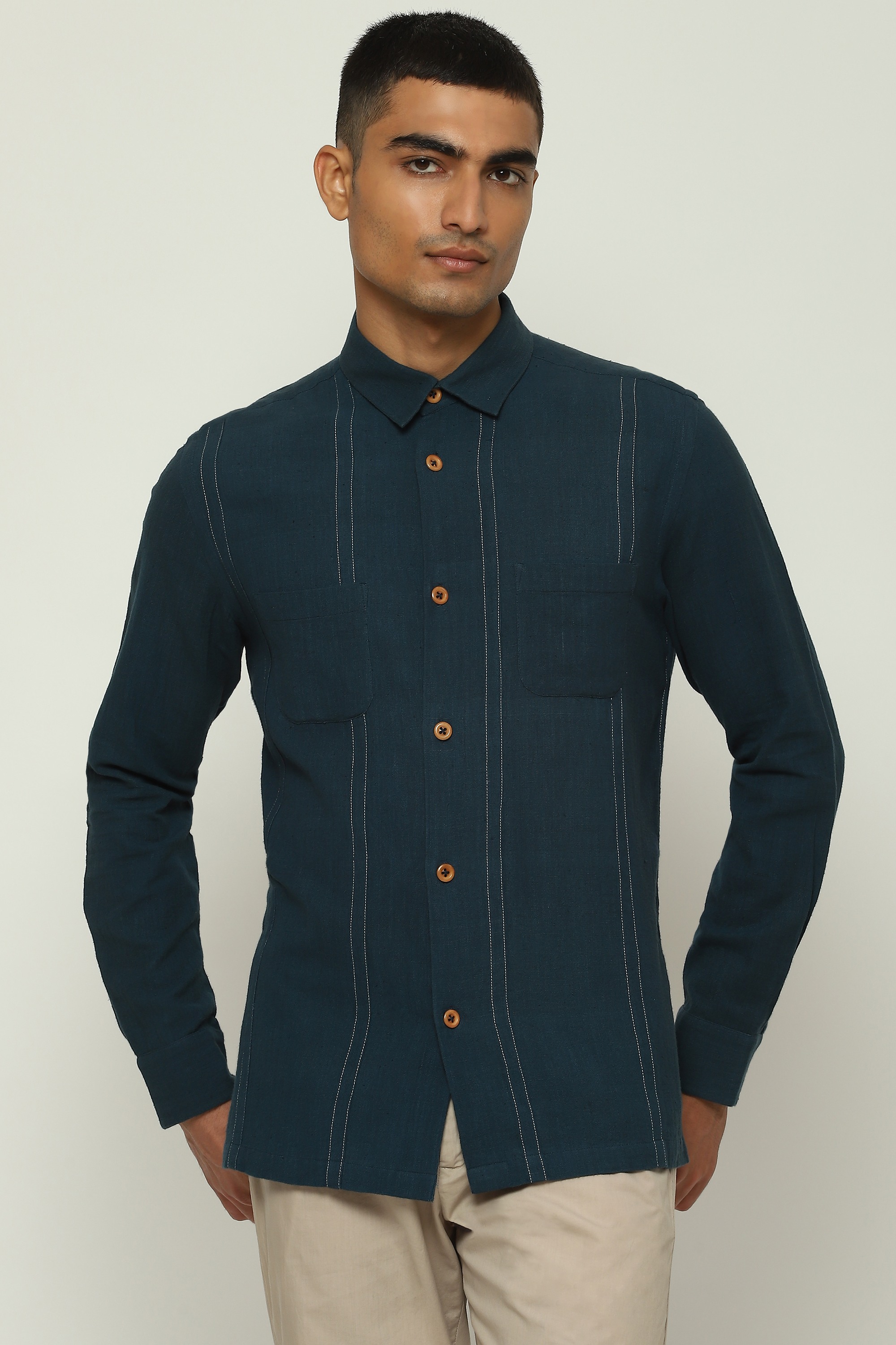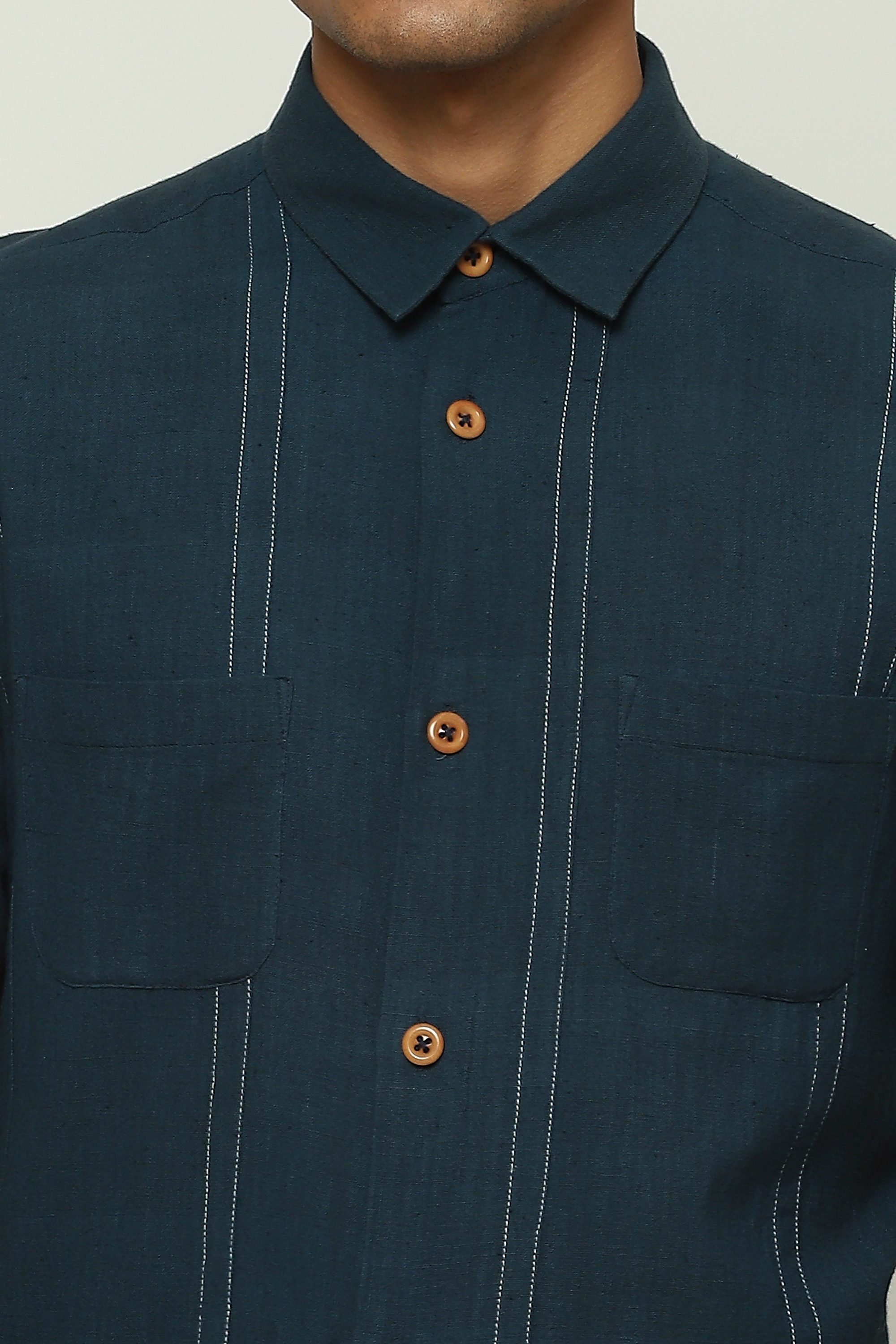 An ivory shirt printed with spaced-out stripes.