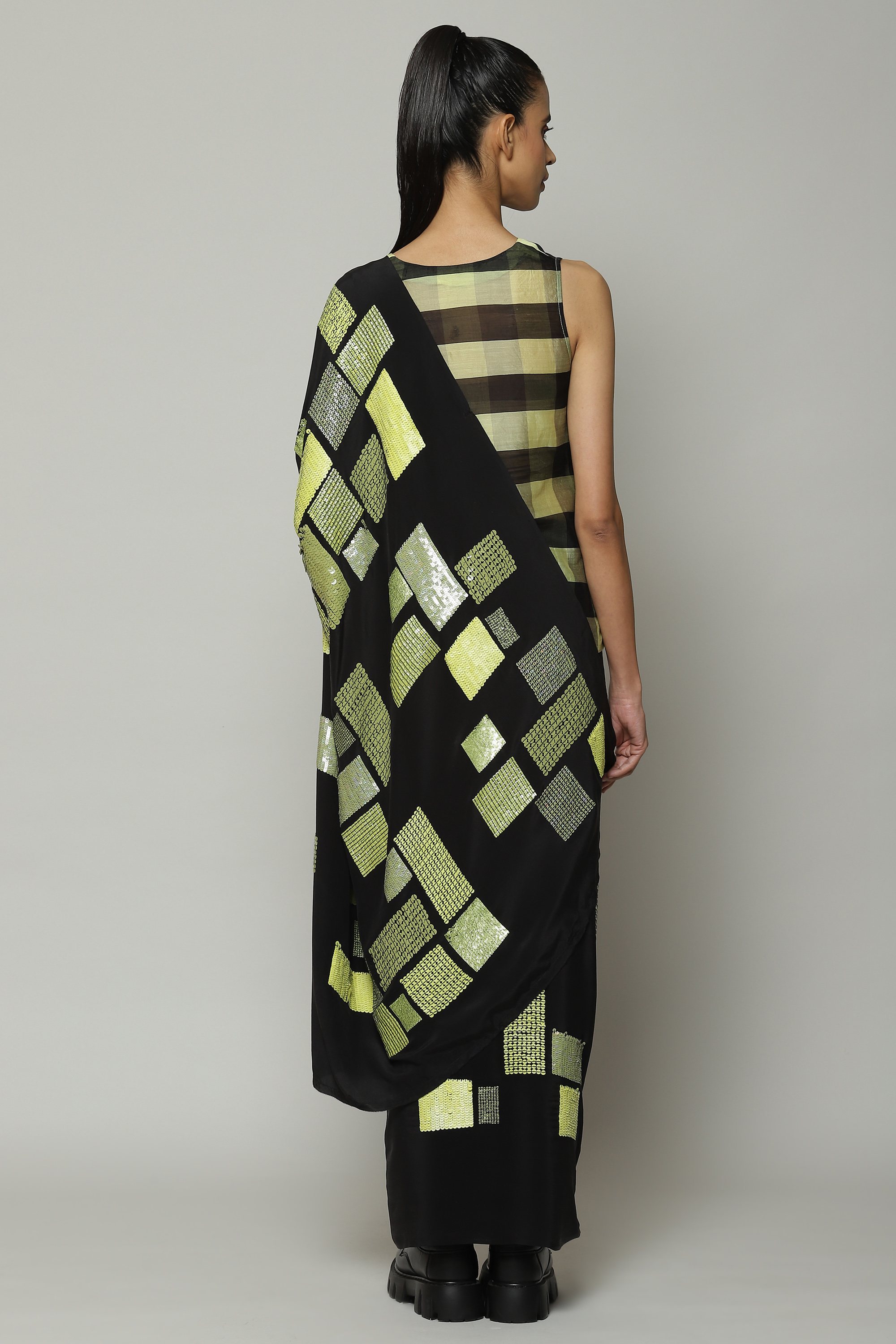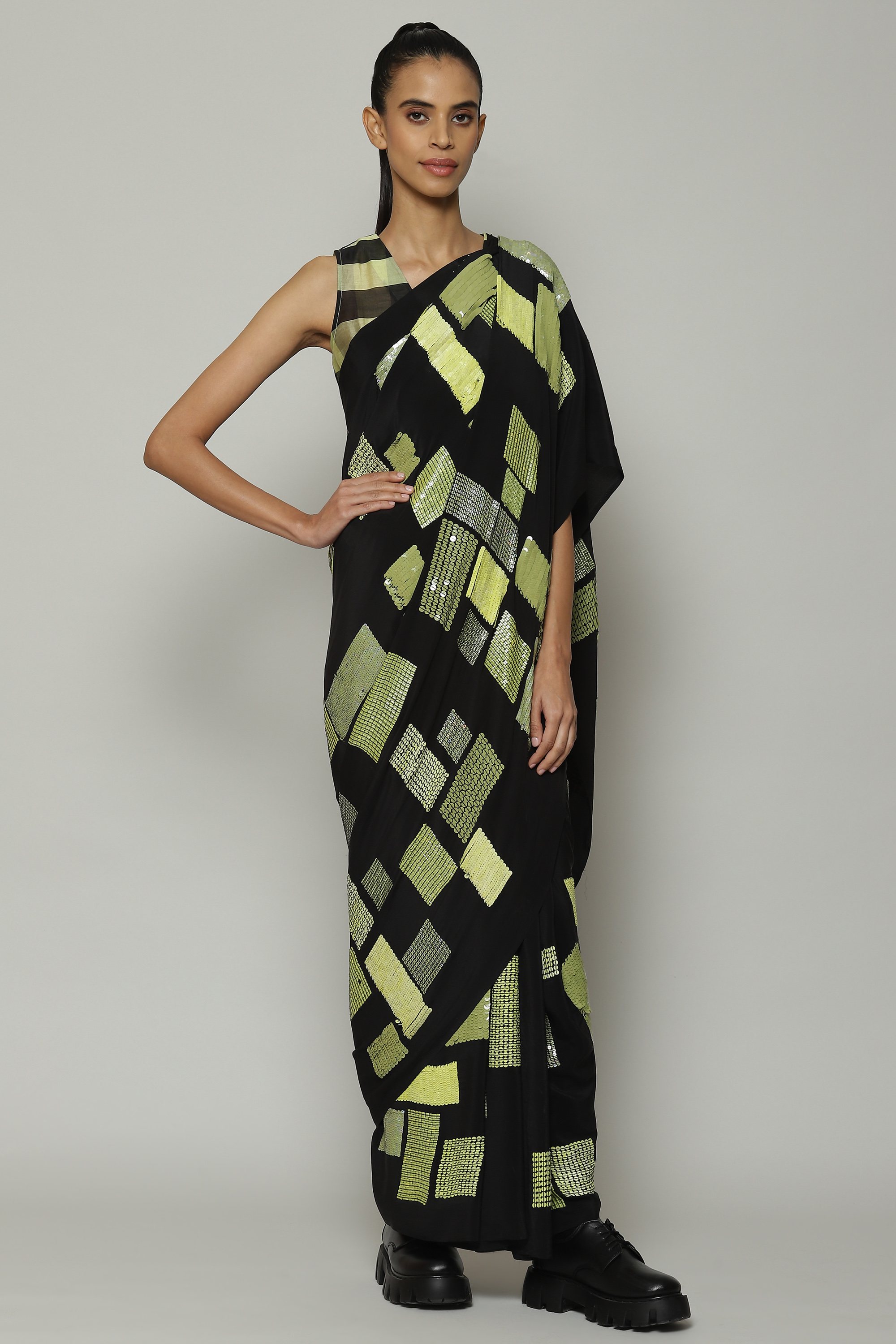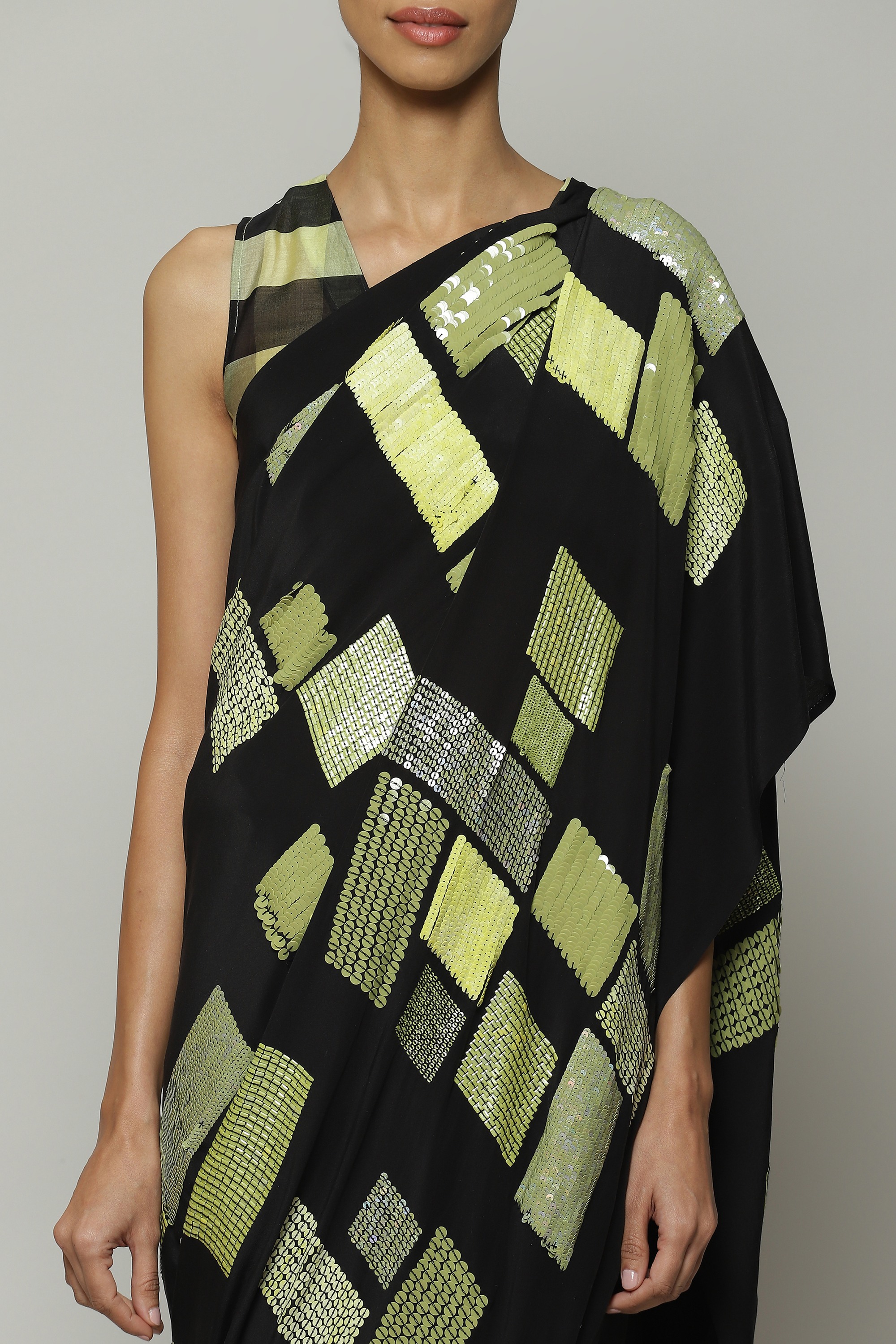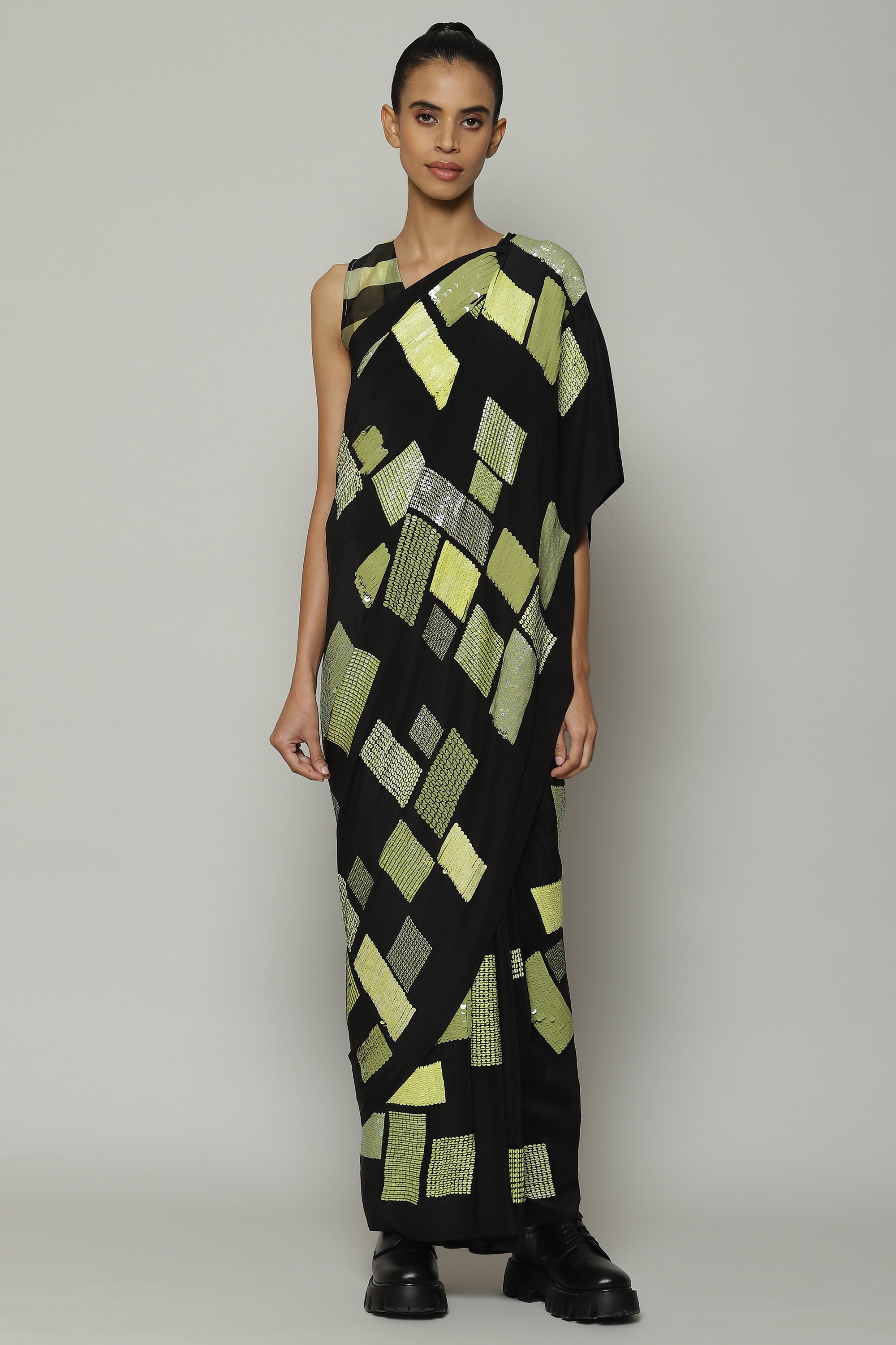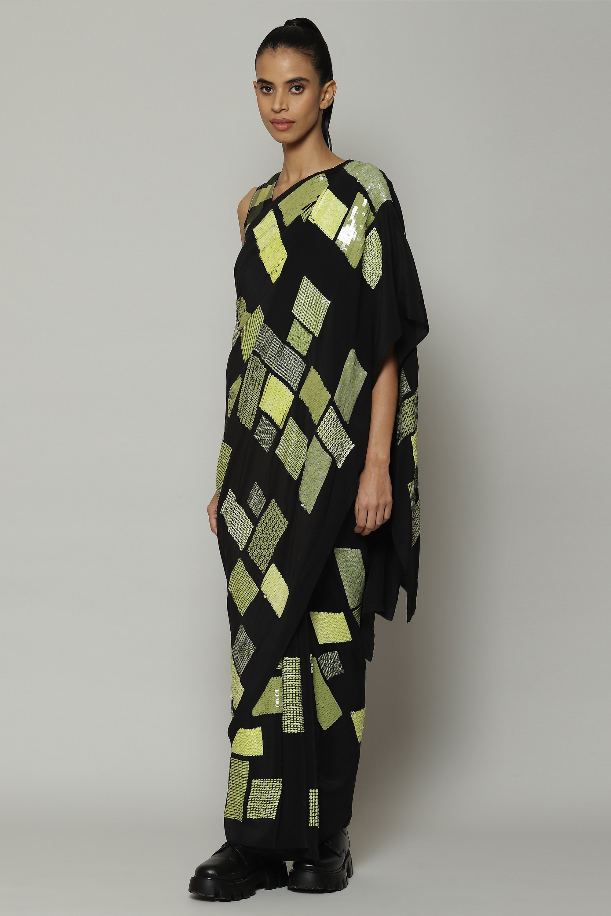A black saree embroidered with a shimmering galaxy of sequins. Crafted in a lightweight silky smooth crepe de chine, the piece drapes like water. Square patterns in lime add an element of structure to the ensemble. The saree stuns on the dance floor.