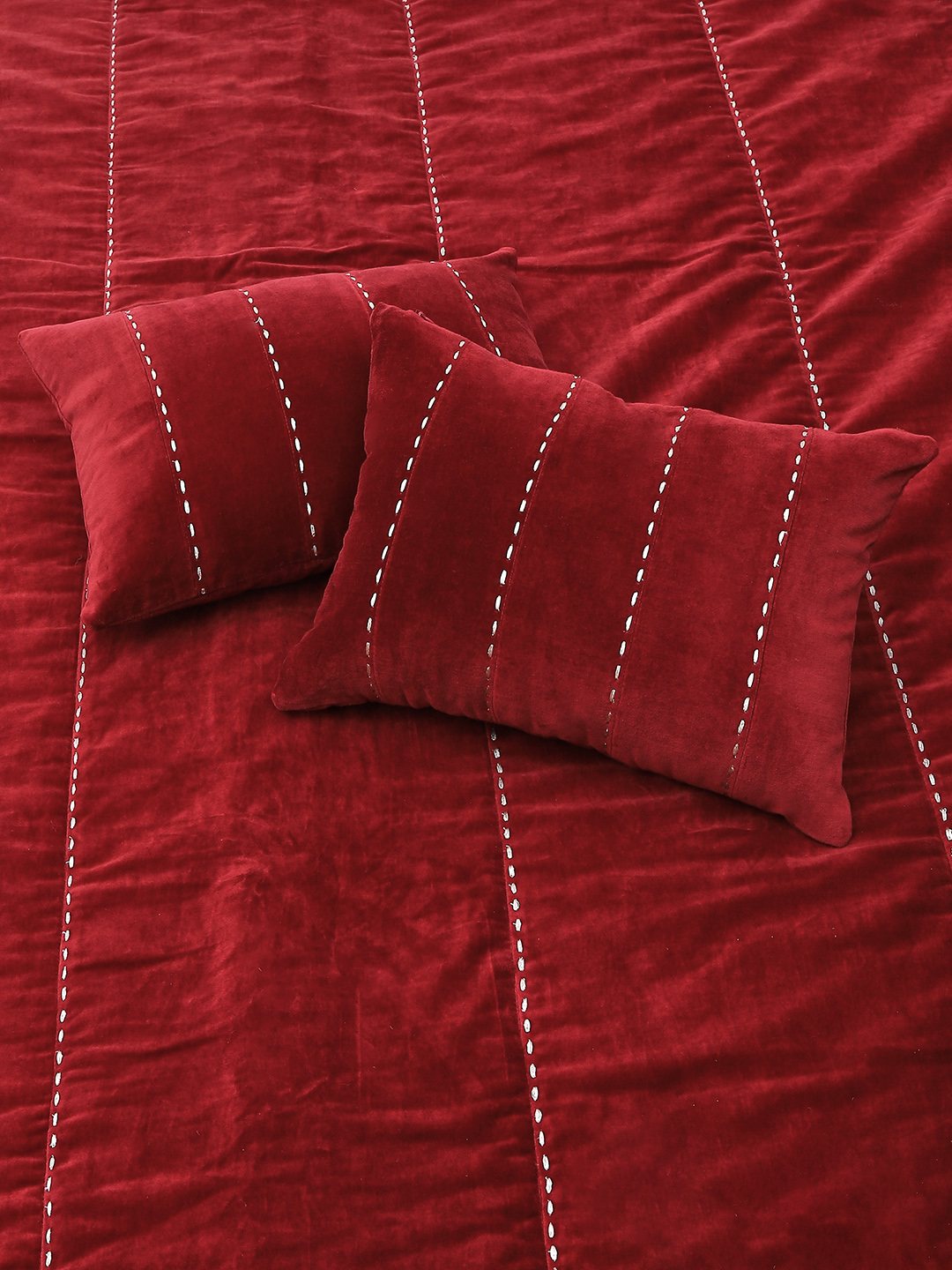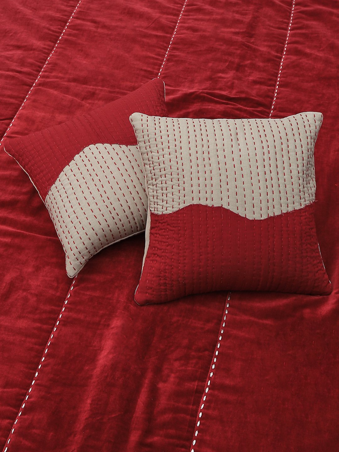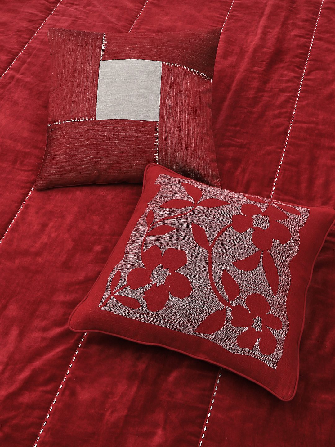 THIS SPECIAL PIECE HAS BEEN MADE USING FINE COTTON VELVET WHICH HAS BEEN EMBROIDERED USING A STAB STITCH. A POLYESTER WADDING ADDS ANOTHER LAYER FOR WARMTH. A PRINTED REVERSE BACK ADDS A SPECIAL TOUCH AS WELL AS MAKES THE QUILT REVERSIBLE.