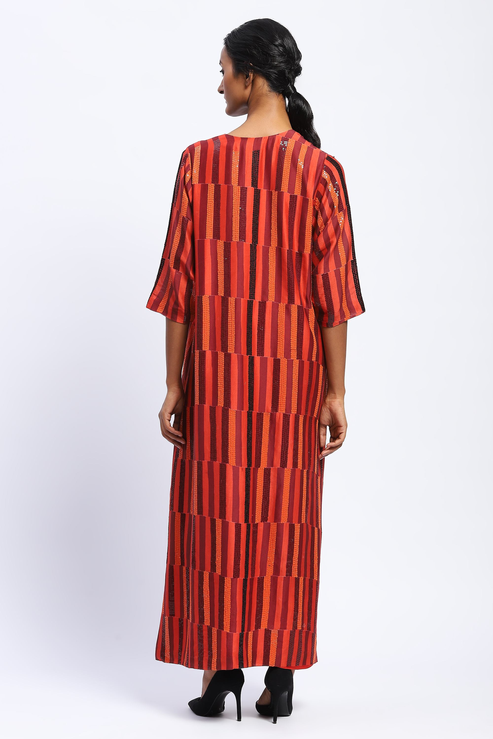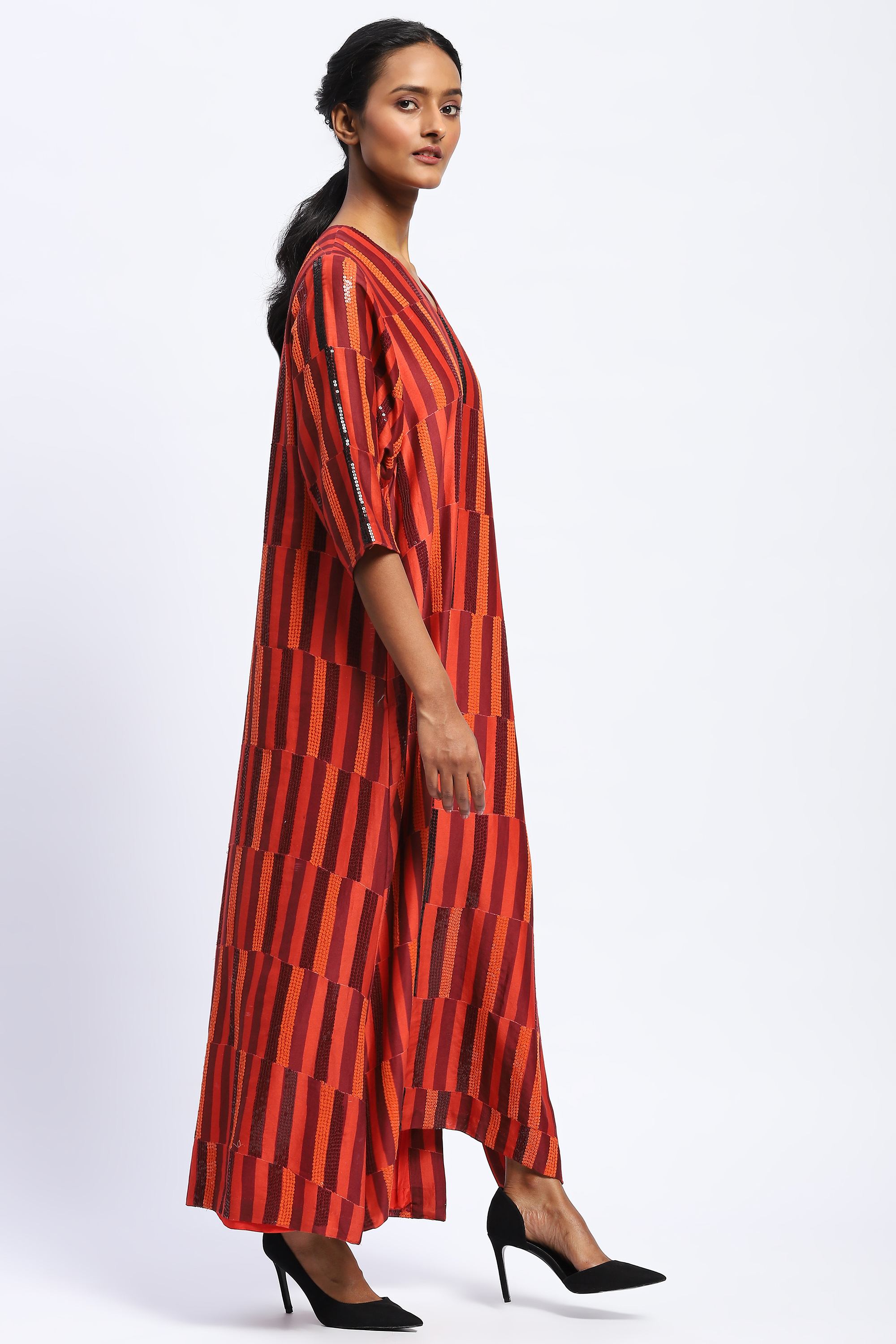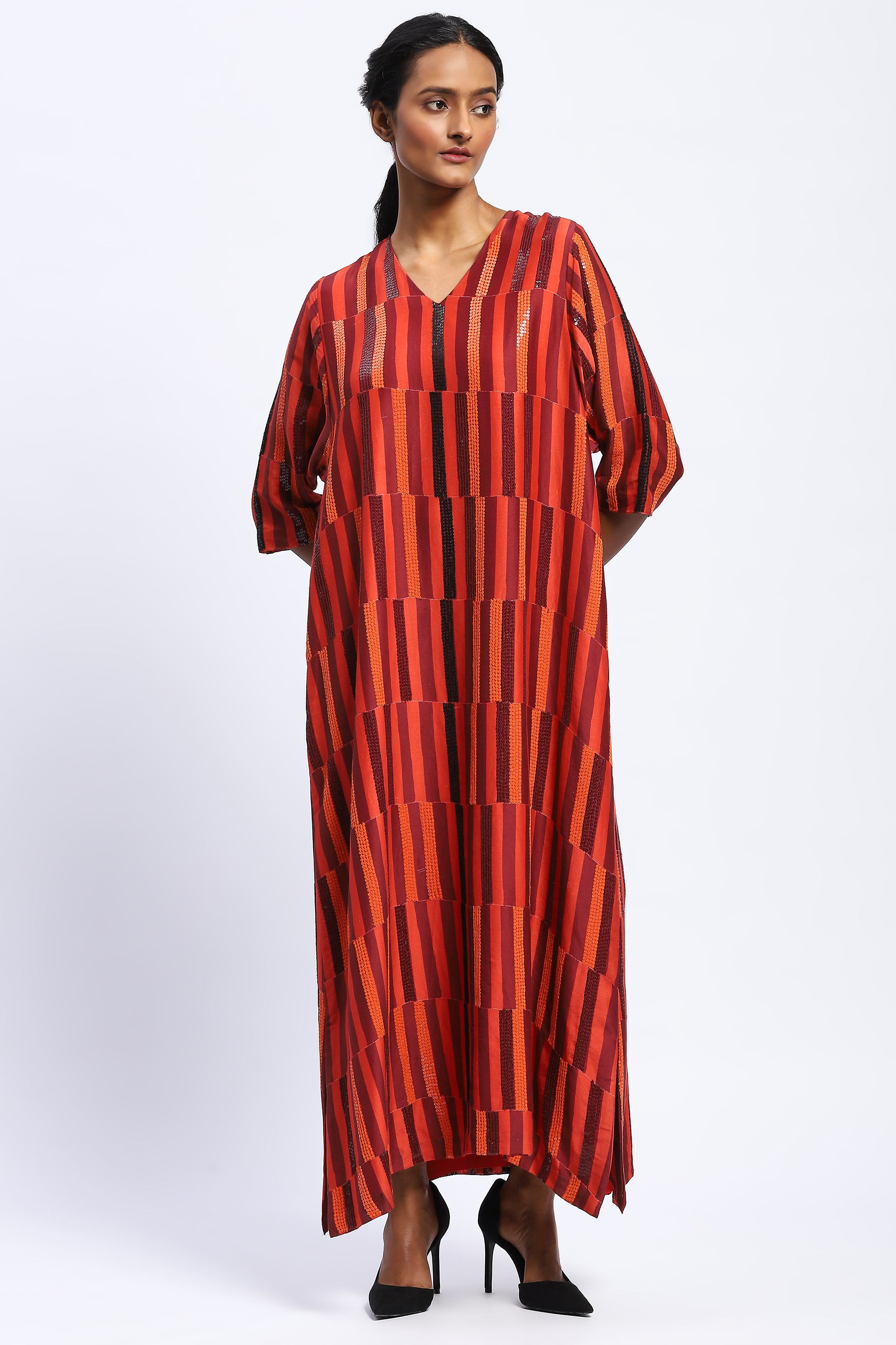 Best paired with a diverse array of perspectives, this kaftan is crafted in chanderi. Its digitally printed broken grids are embellished with golden sequins.