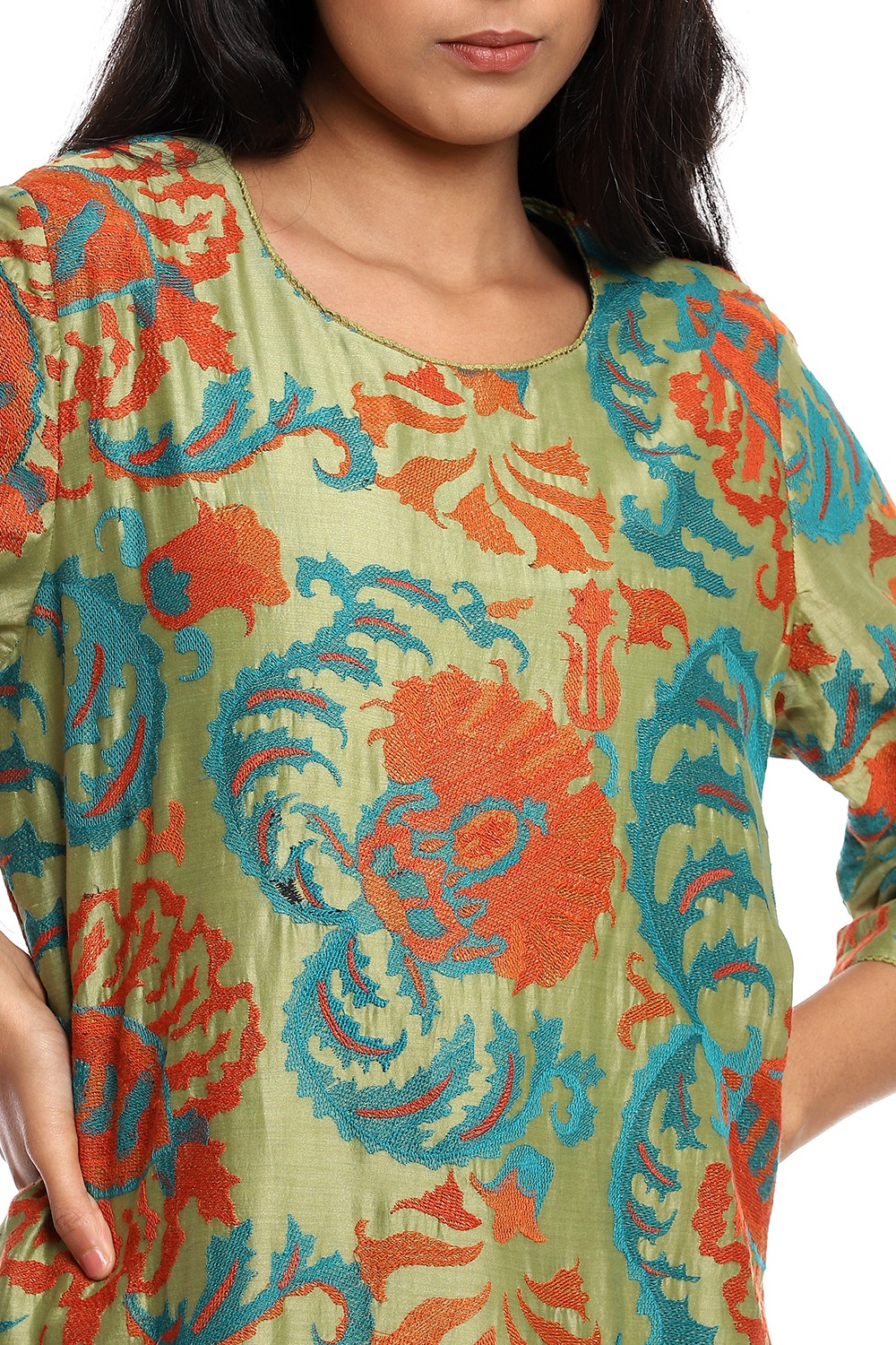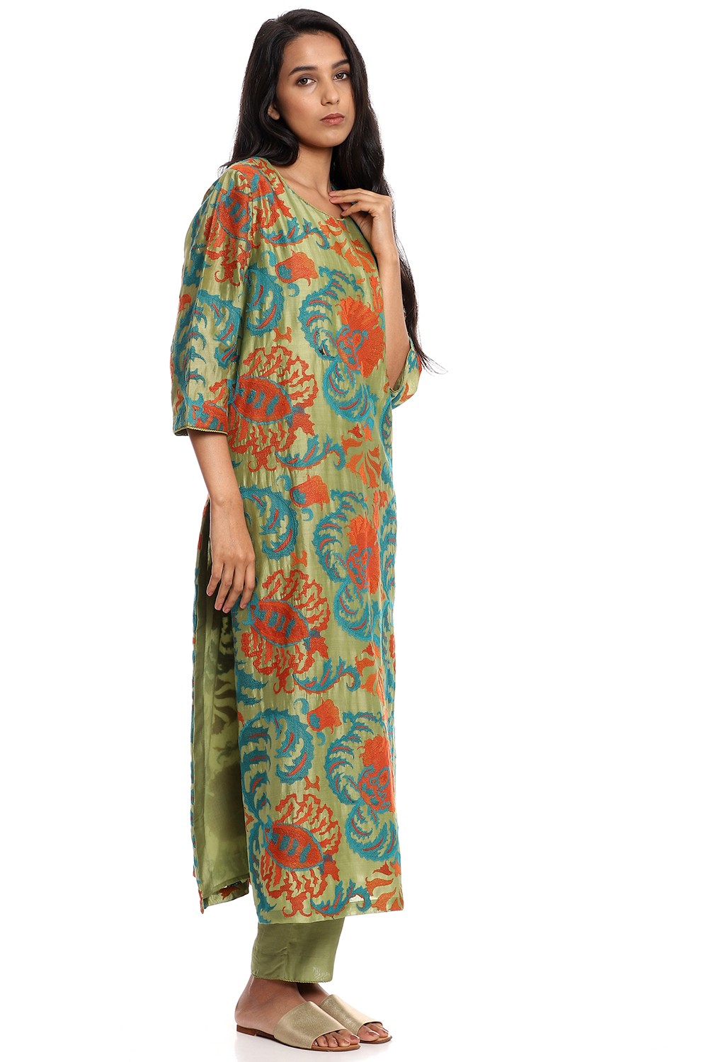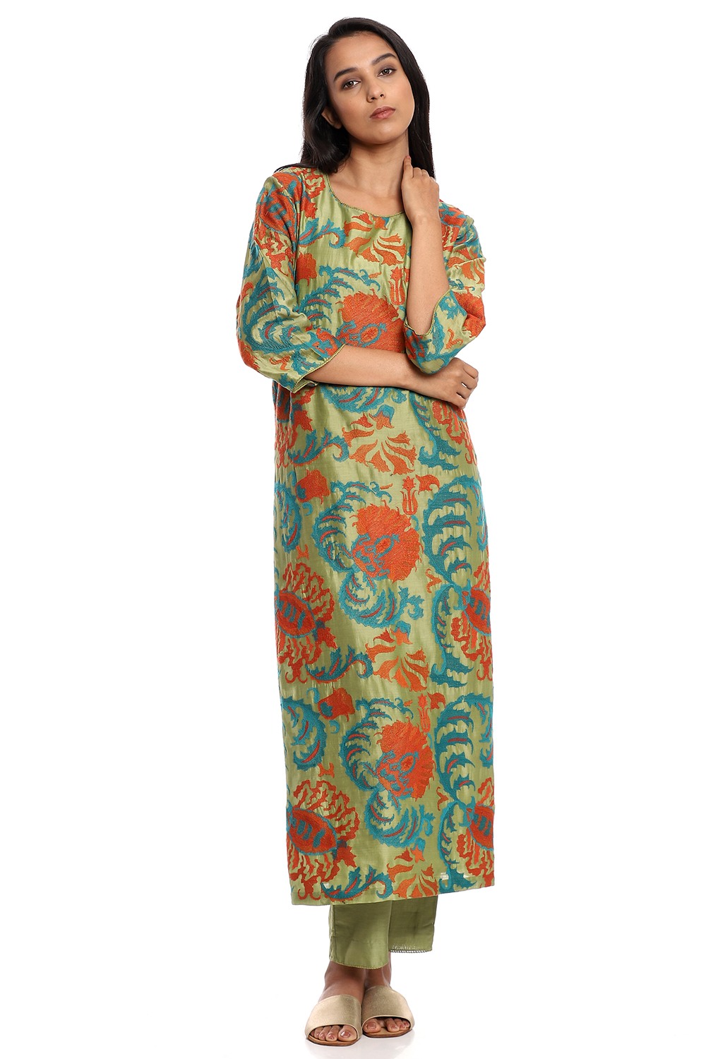 Forever favourite suzani embroidered kurta coordinate set, crafted from silk-cotton texture, in a slim silhouette. Team yours with straight cropped pants cut from the same fabric.
