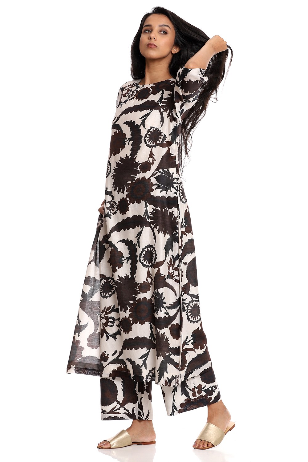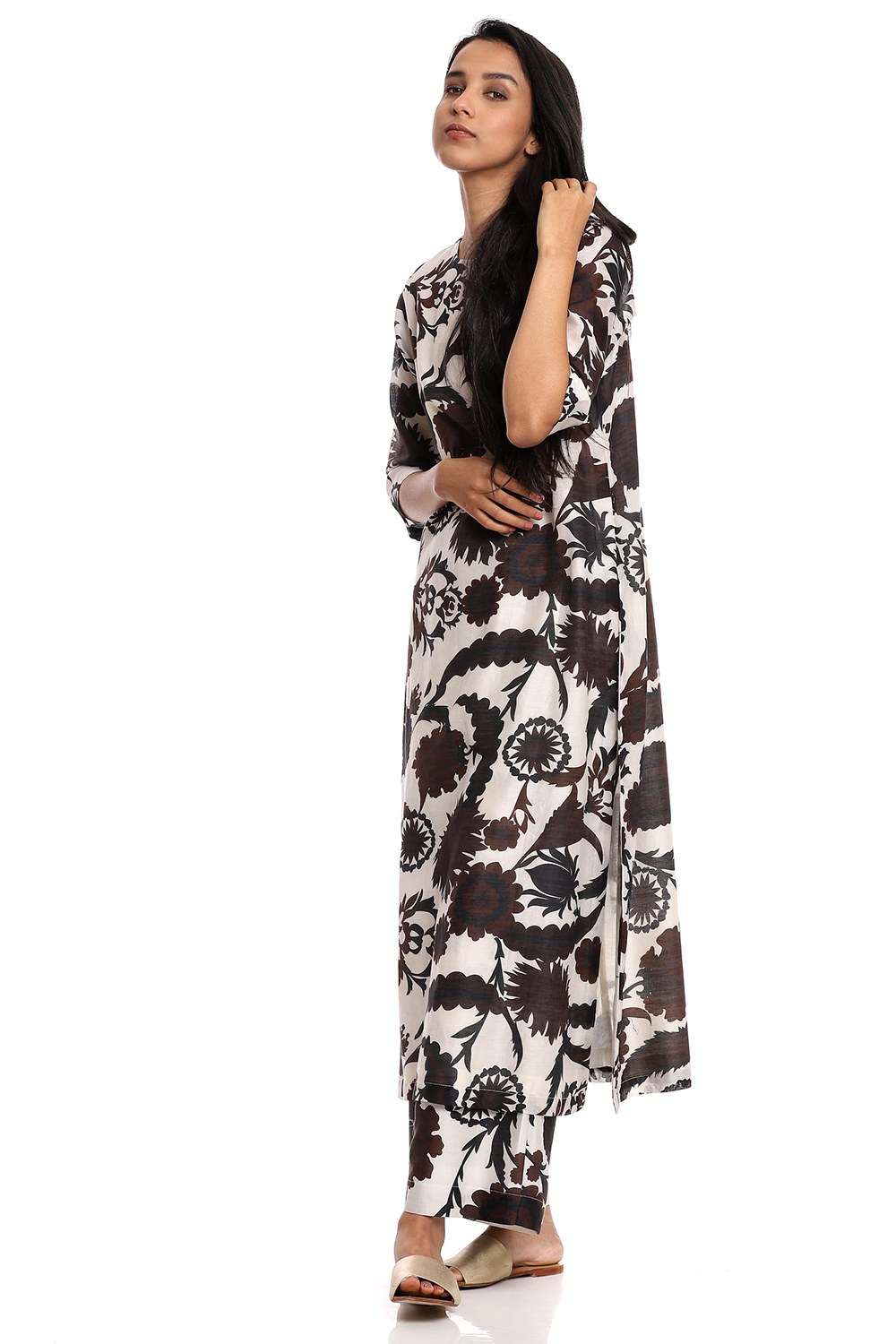 Effortless and elegant in the favourite style, crafted from silk-cotton fabric, suzani printed coordinate set in black and coffee on an ivory ground. An easy and relaxed silhouette.