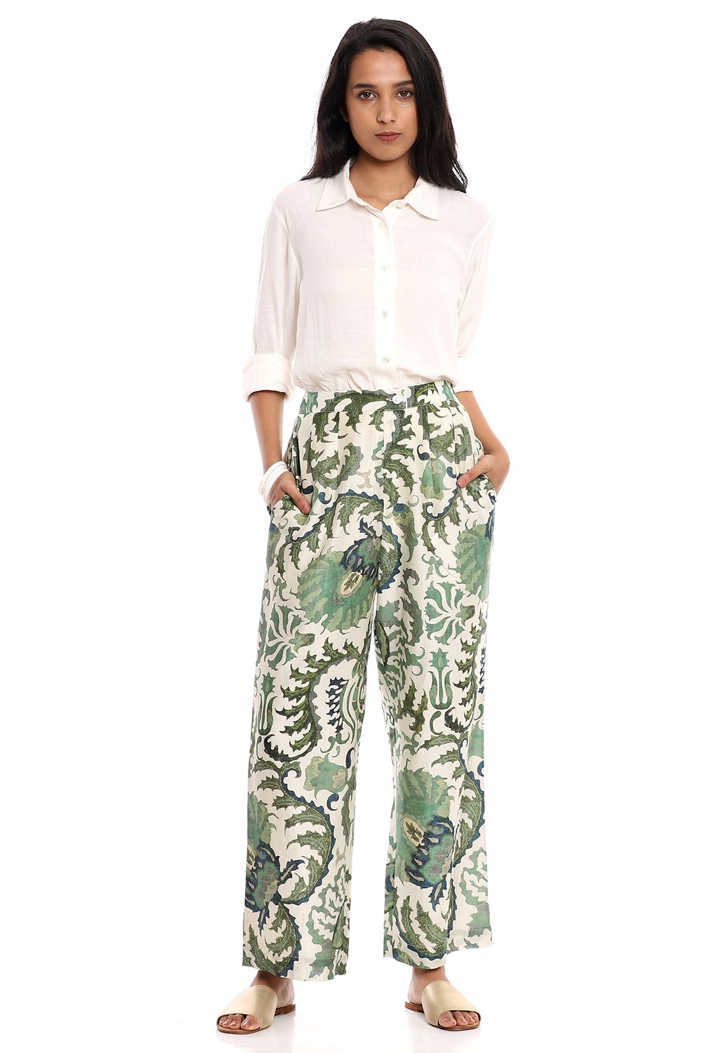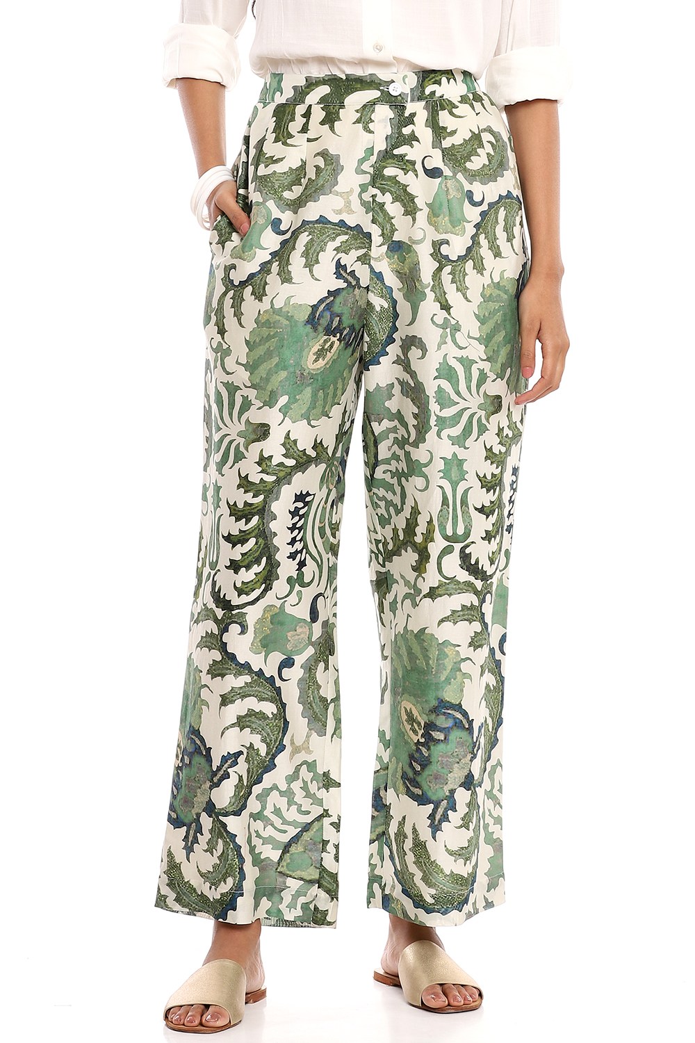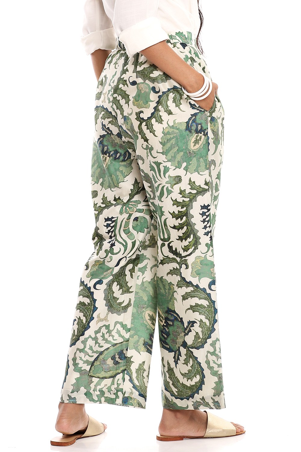 Effortless and elegant suzani print wide leg pants, crafted in silk-cotton texture, in tones of greens on an ivory ground.