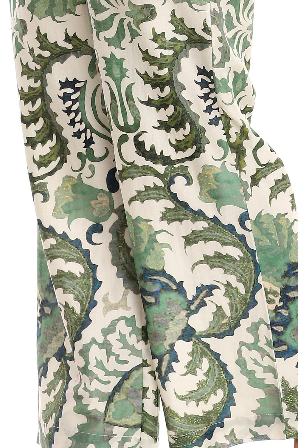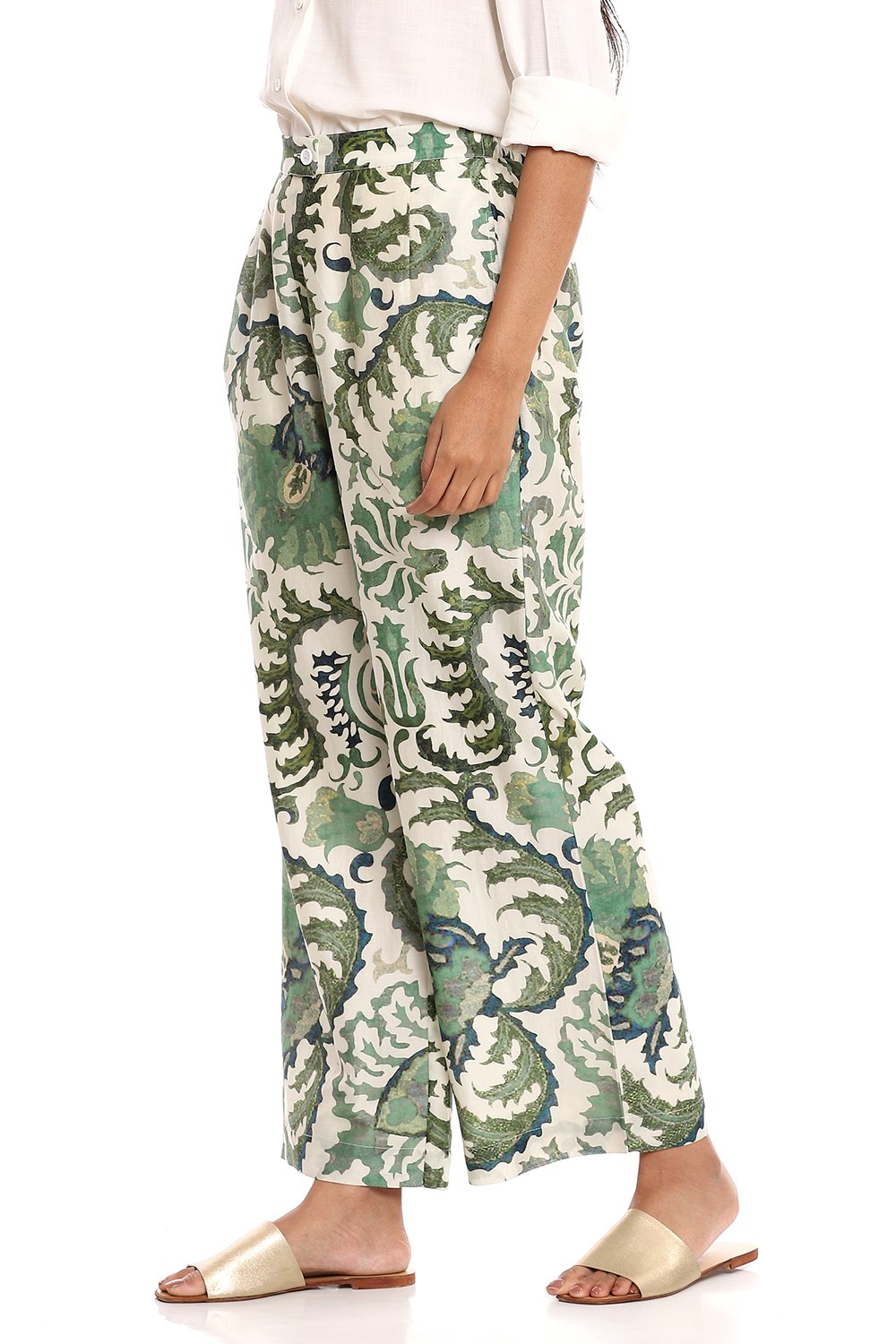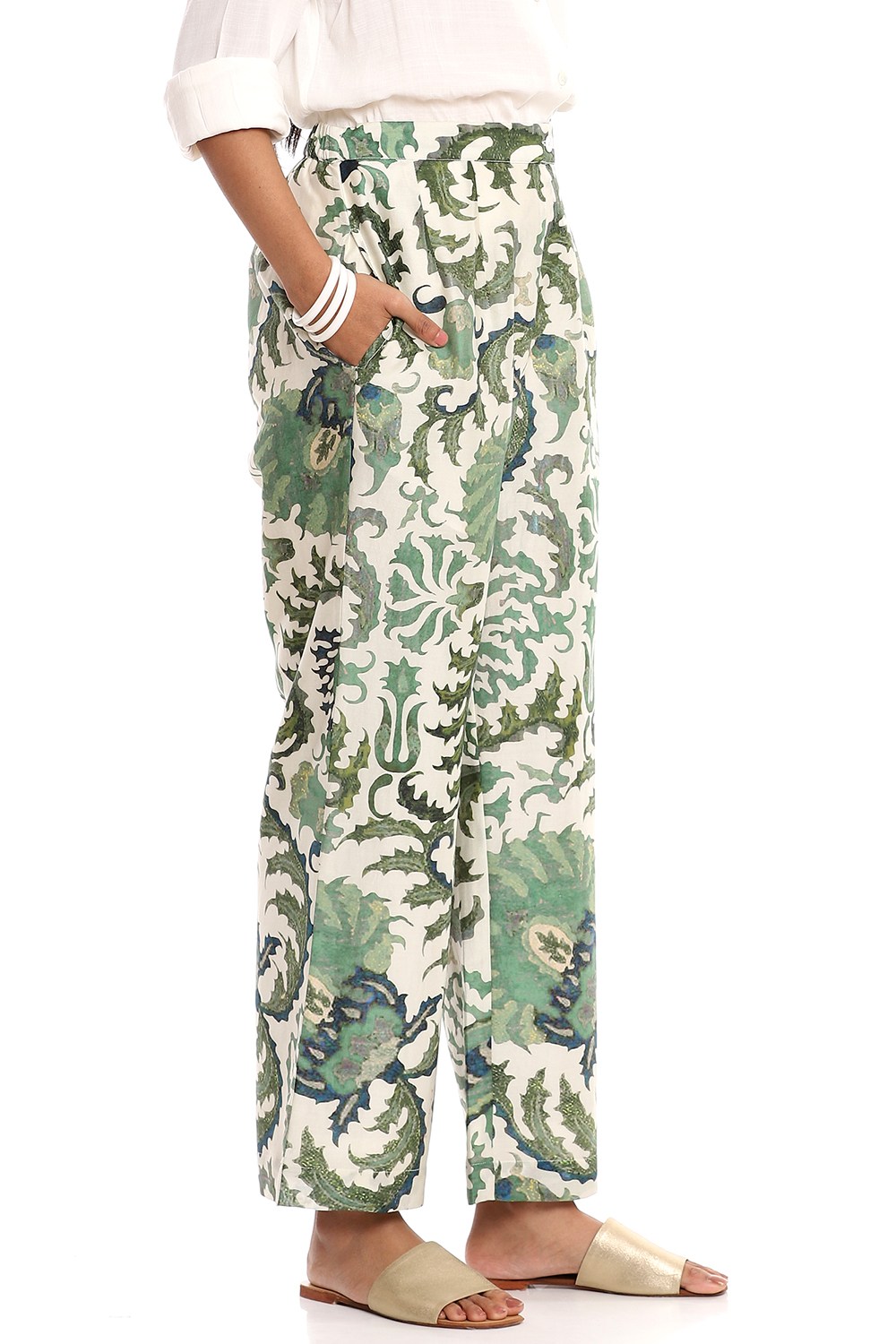 Effortless and elegant suzani print wide leg pants, crafted in silk-cotton texture, in tones of greens on an ivory ground.