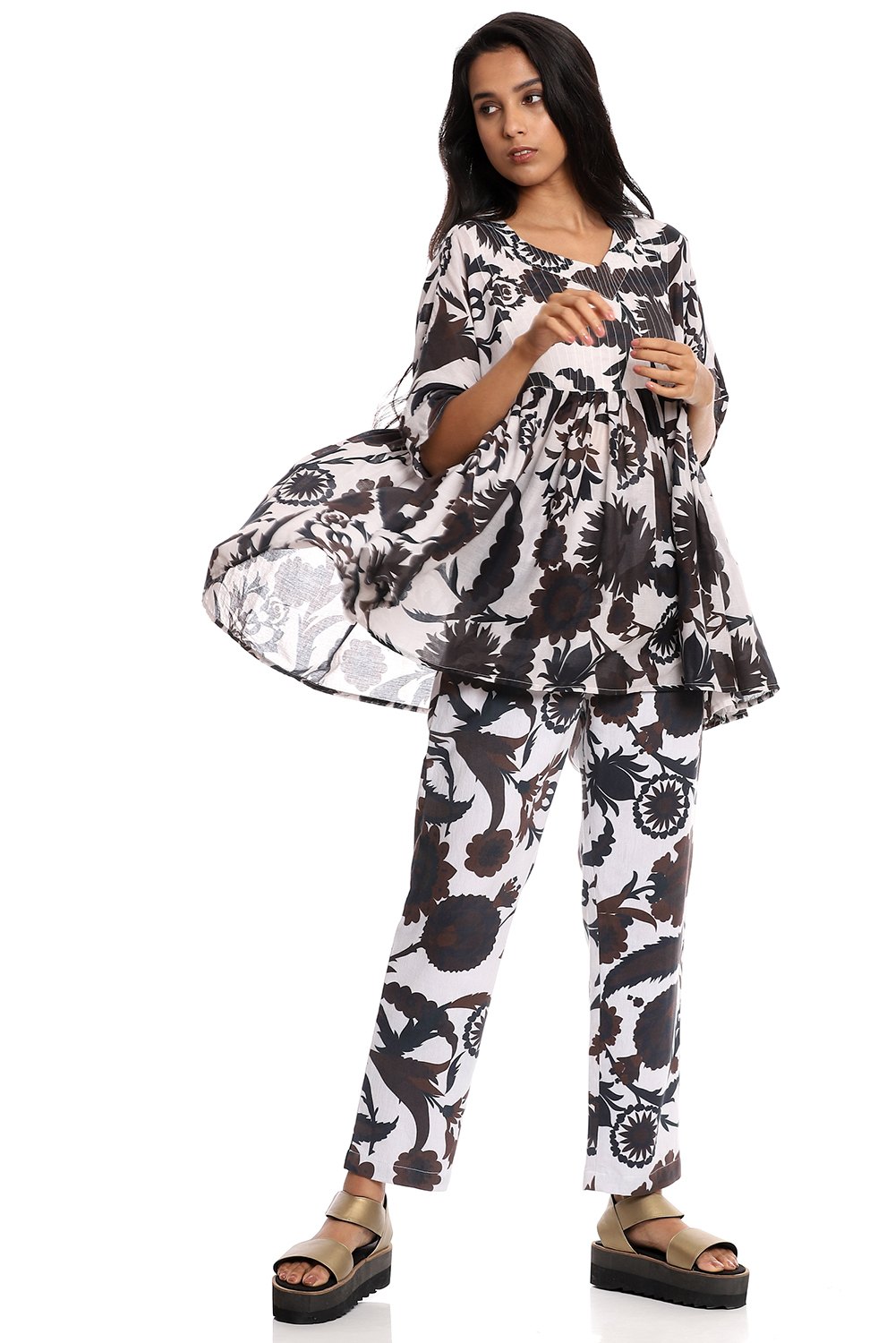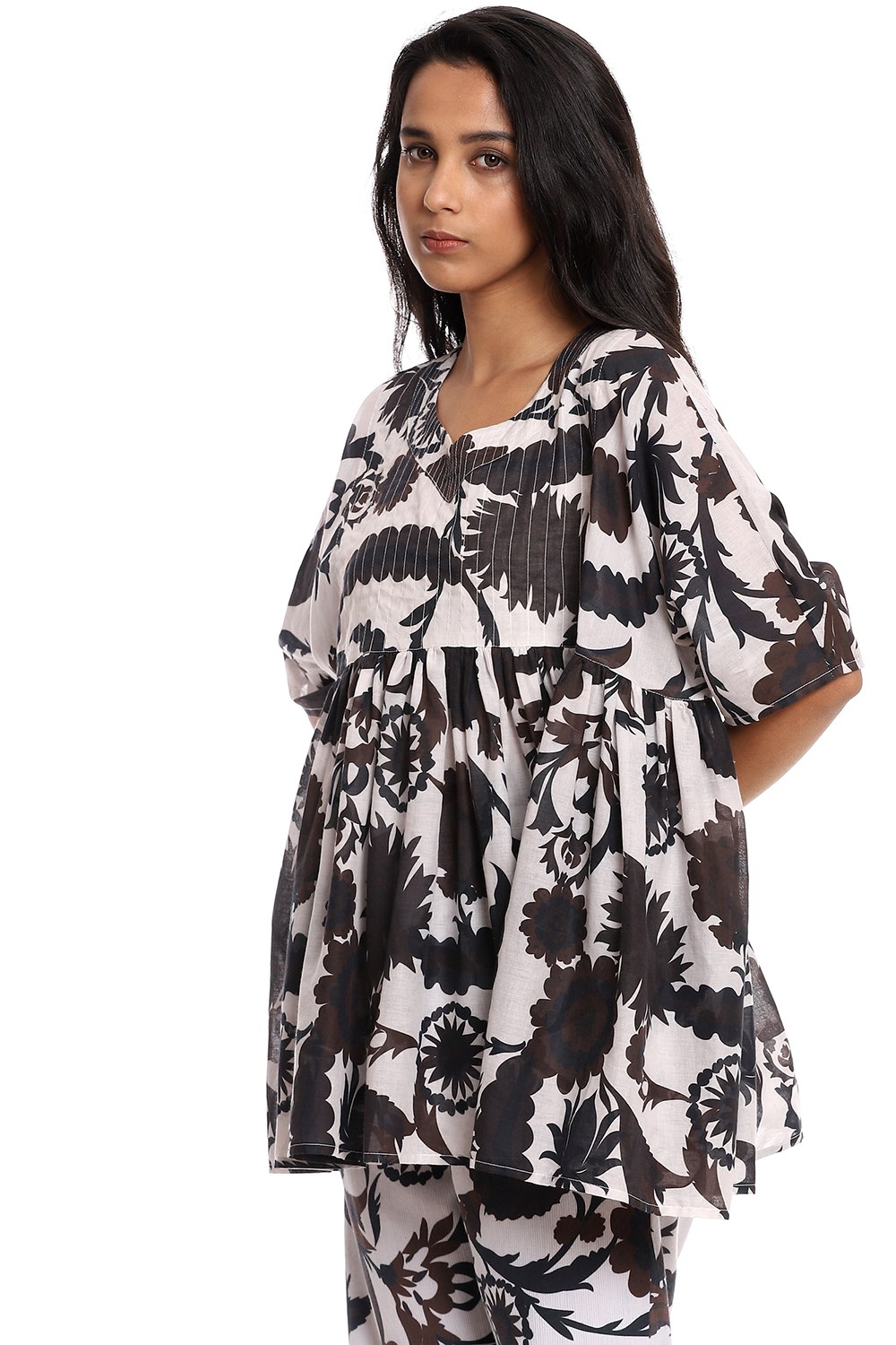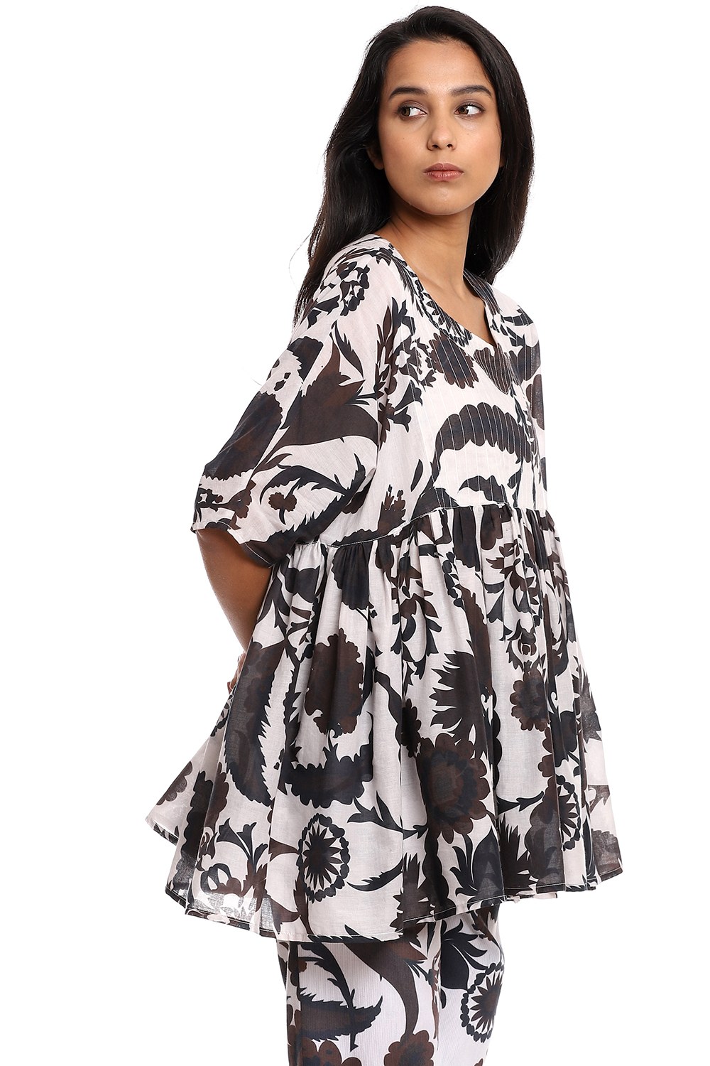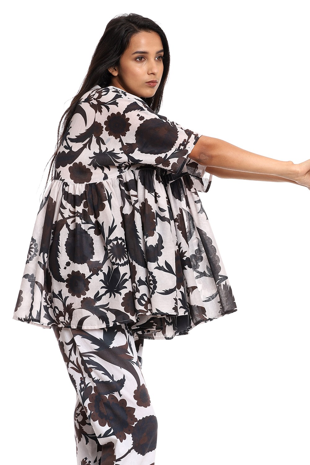 Fall in love with the forever favourite suzani printed kedia top, crafted from cotton voile, in coffee and black on an ivory ground.