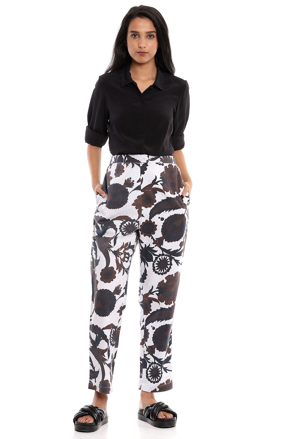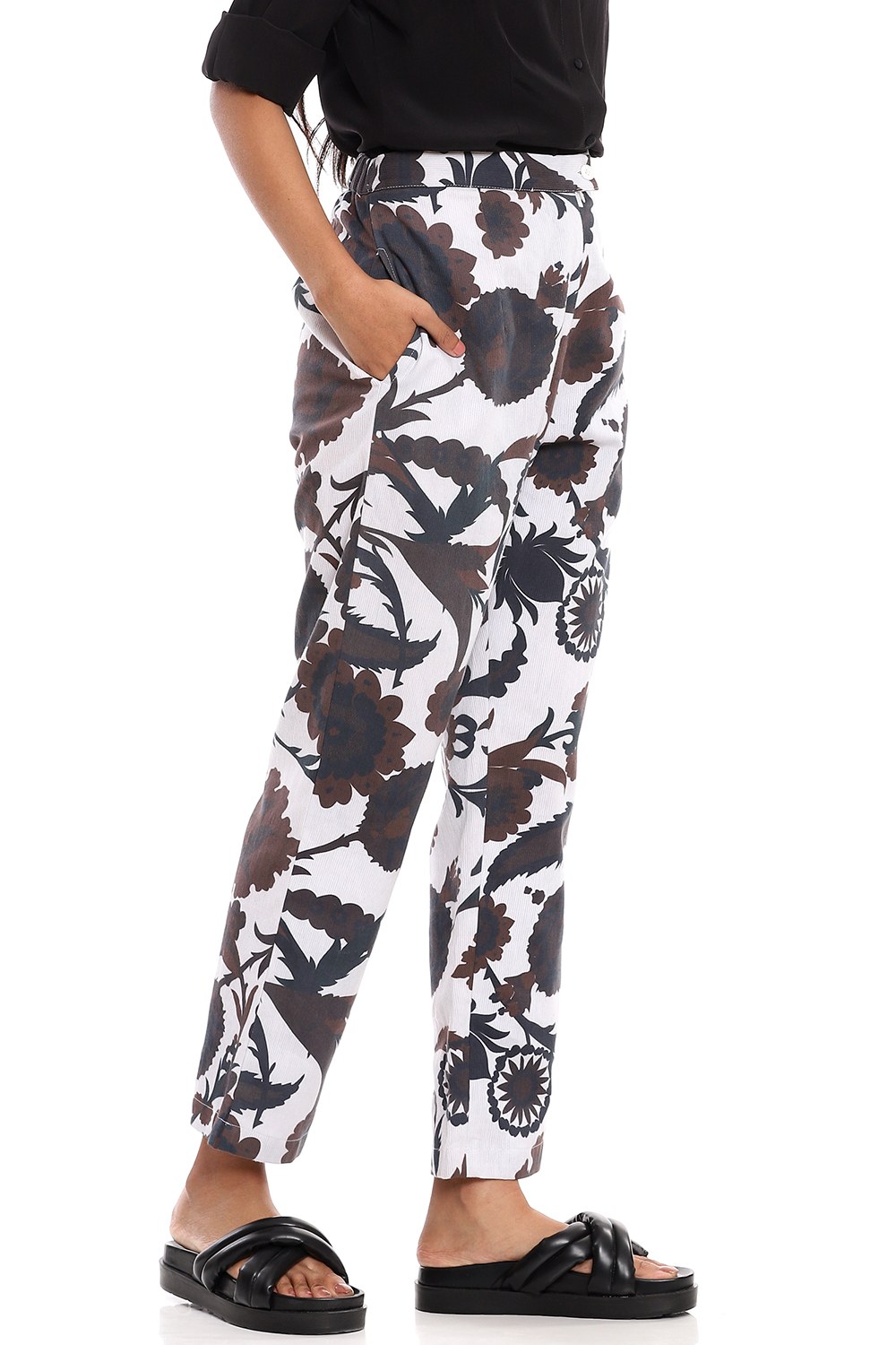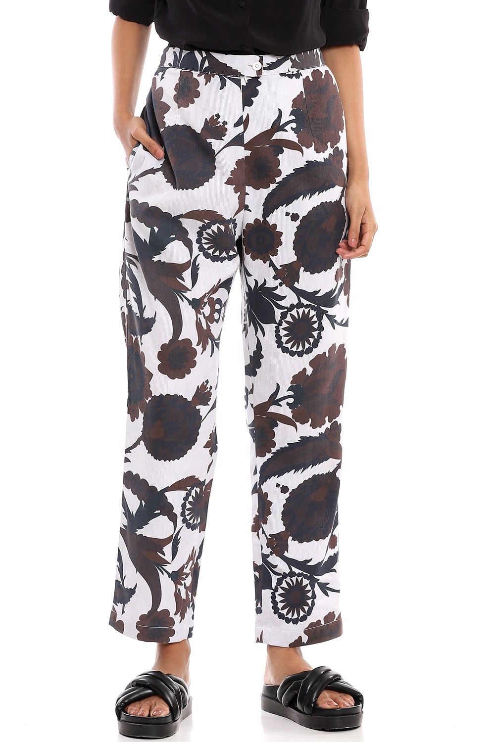 Forever favourite floral suzani print pants, crafted from cotton voile, in black and coffee on an ivory ground. Cut from bedford cord cotton fabric in a relaxed fit.