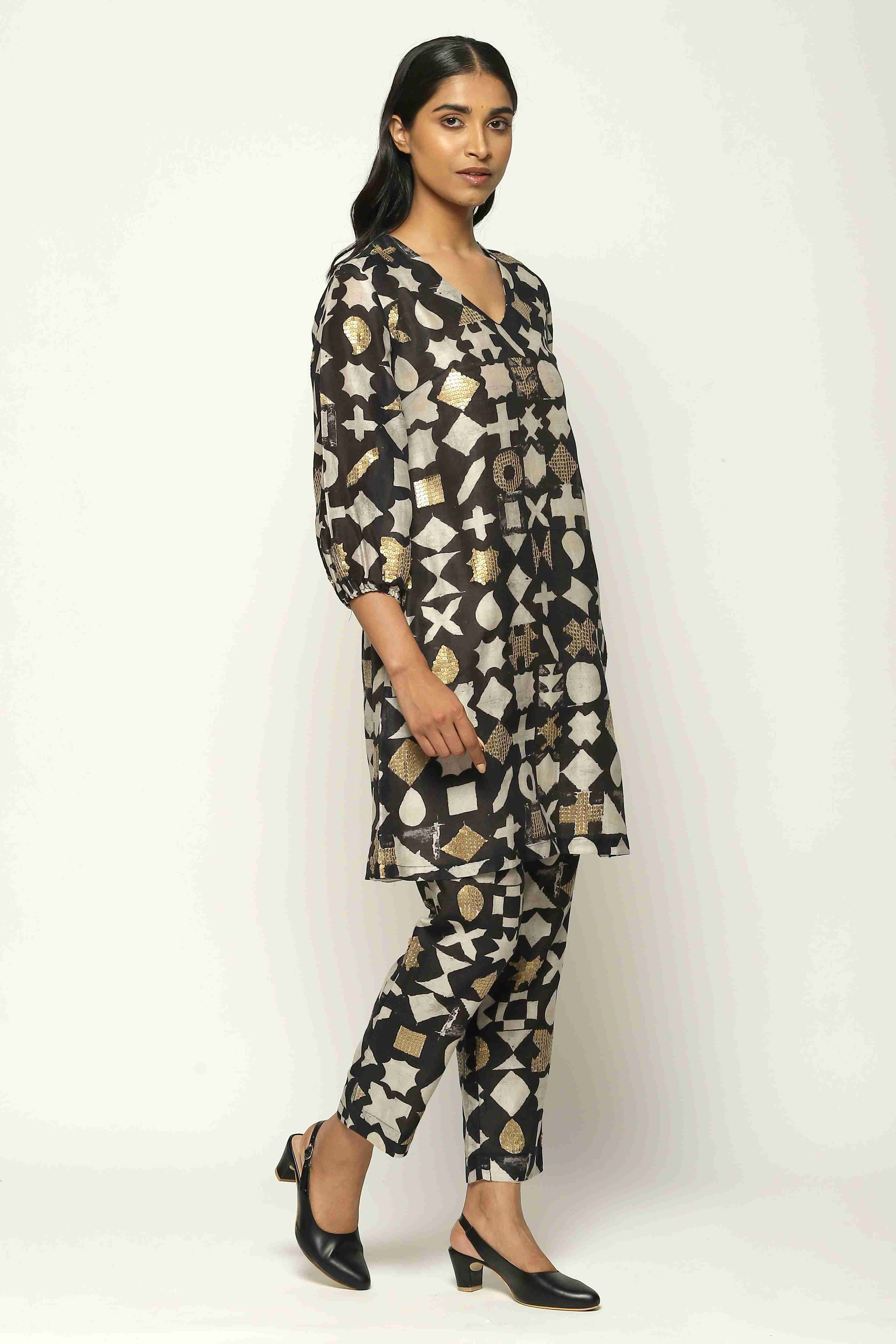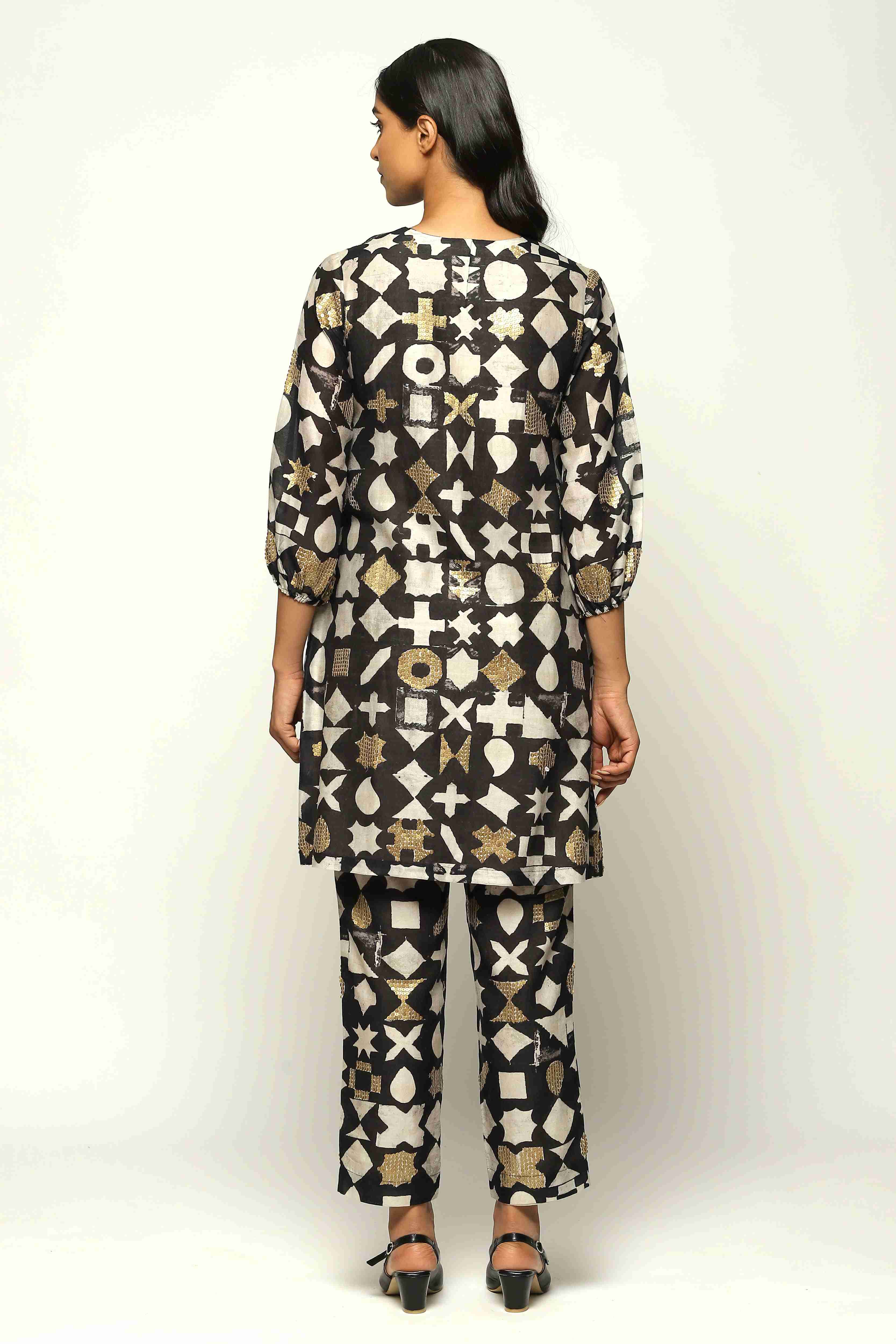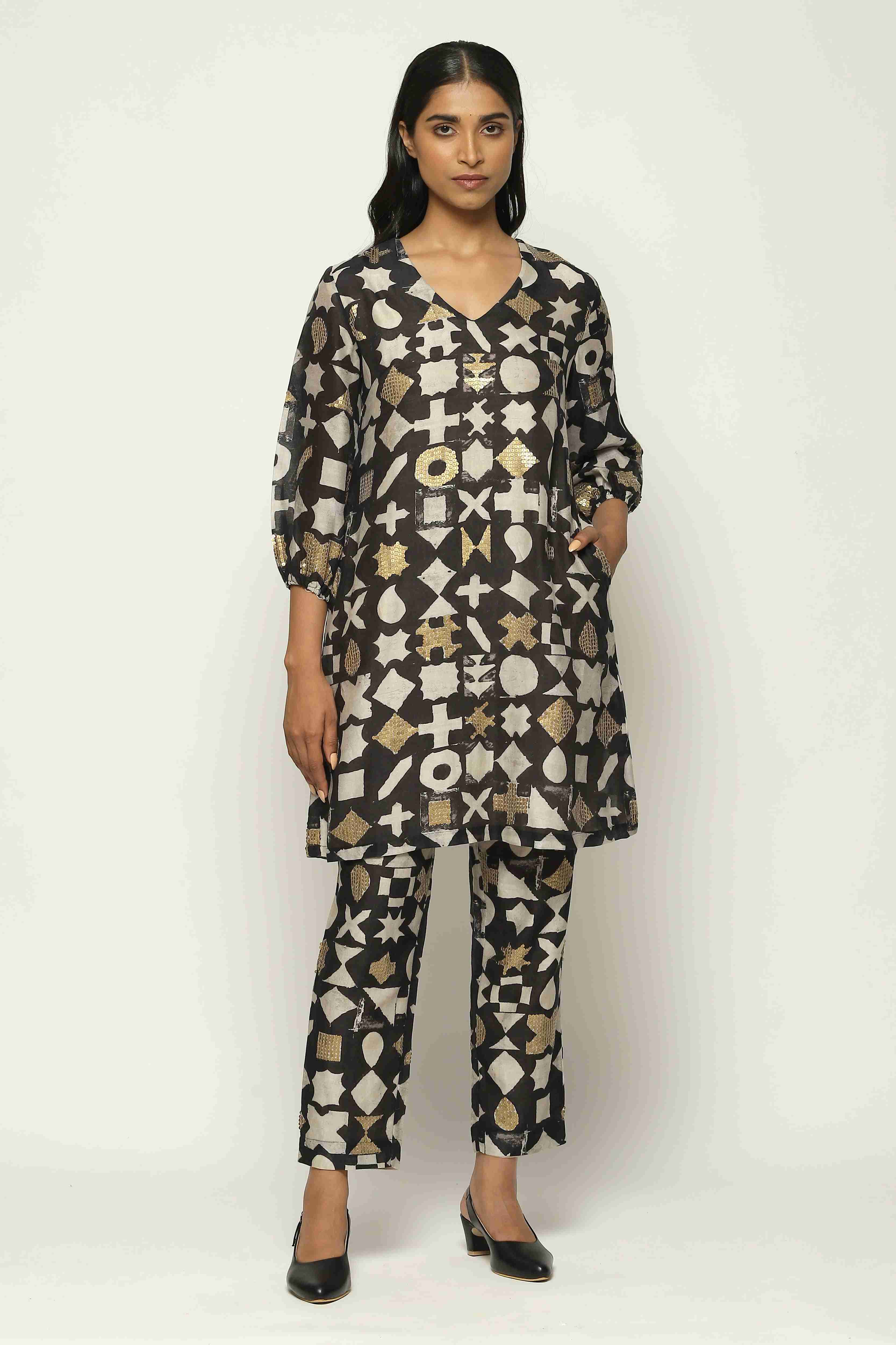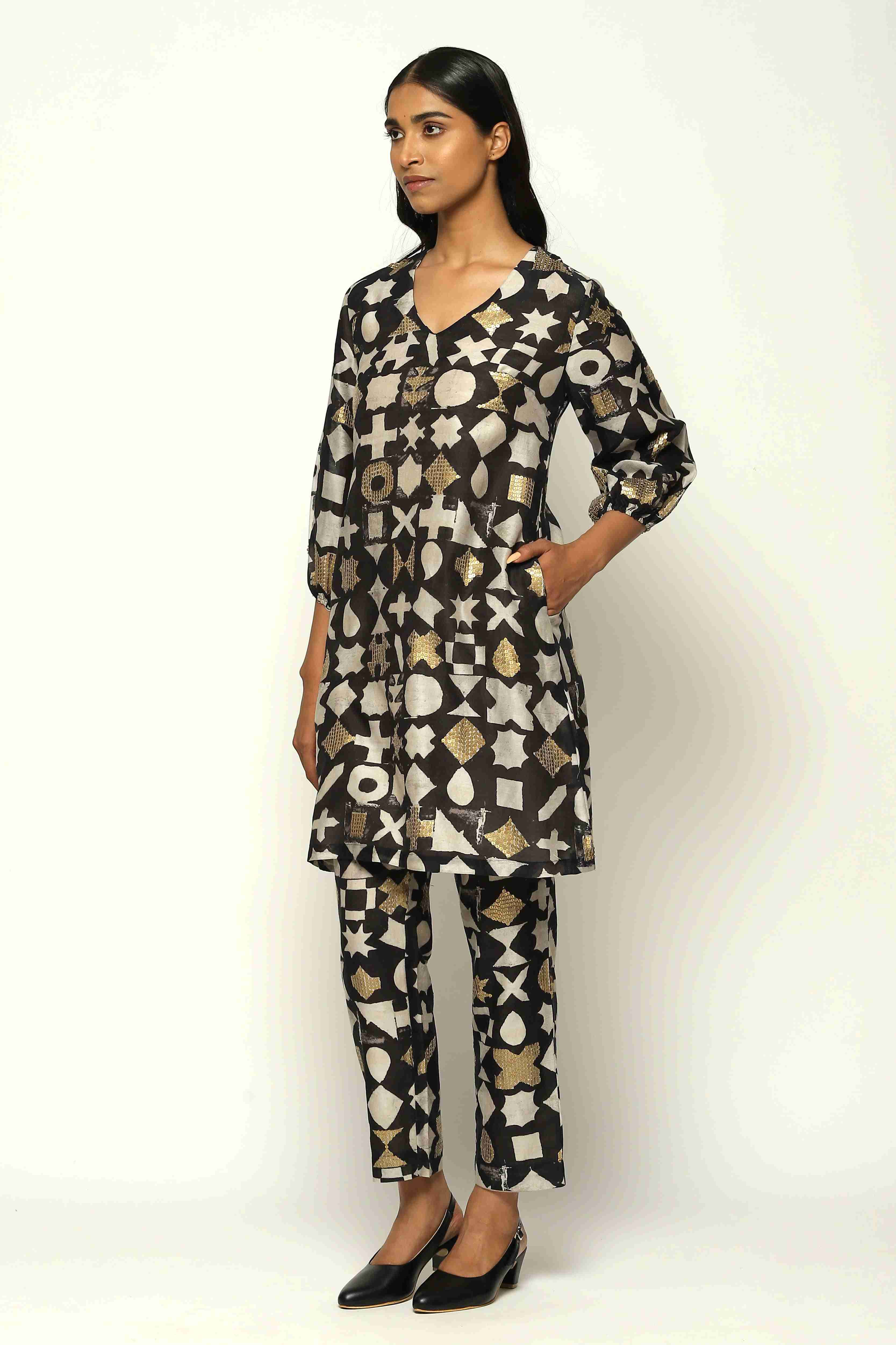 Ivory symbols and gold sequins glitter on this black dress.