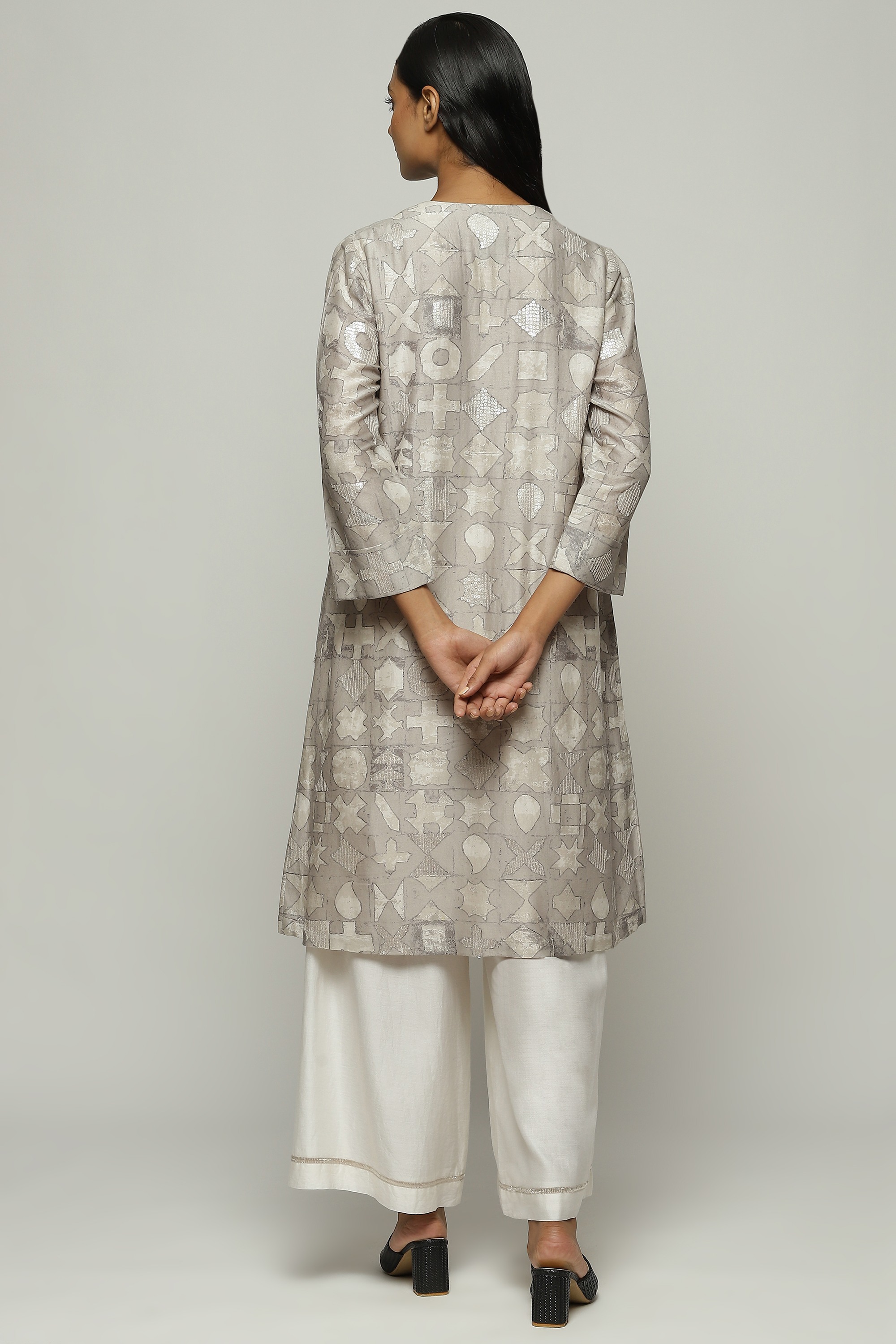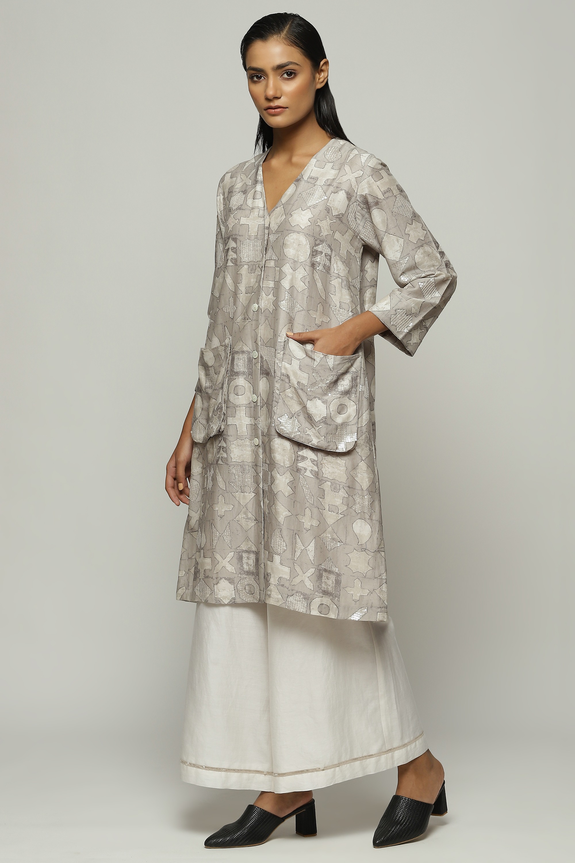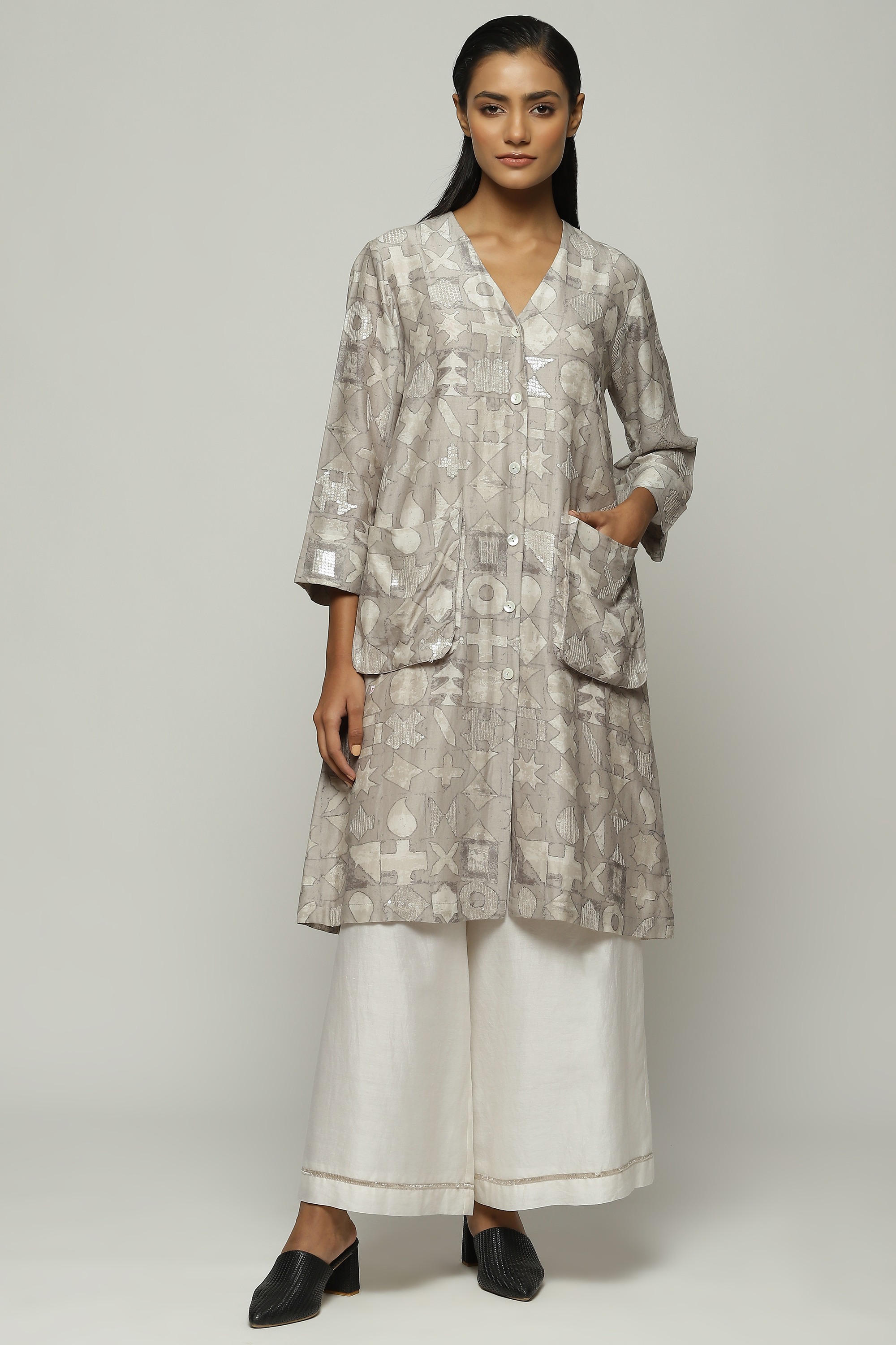 Smoky white symbols shimmer on this ivory jacket. Crafted in a lightweight Chanderi, this piece has been digitally printed and embroidered using the ancient hand adda technique. An easy way to glam up any ensemble.