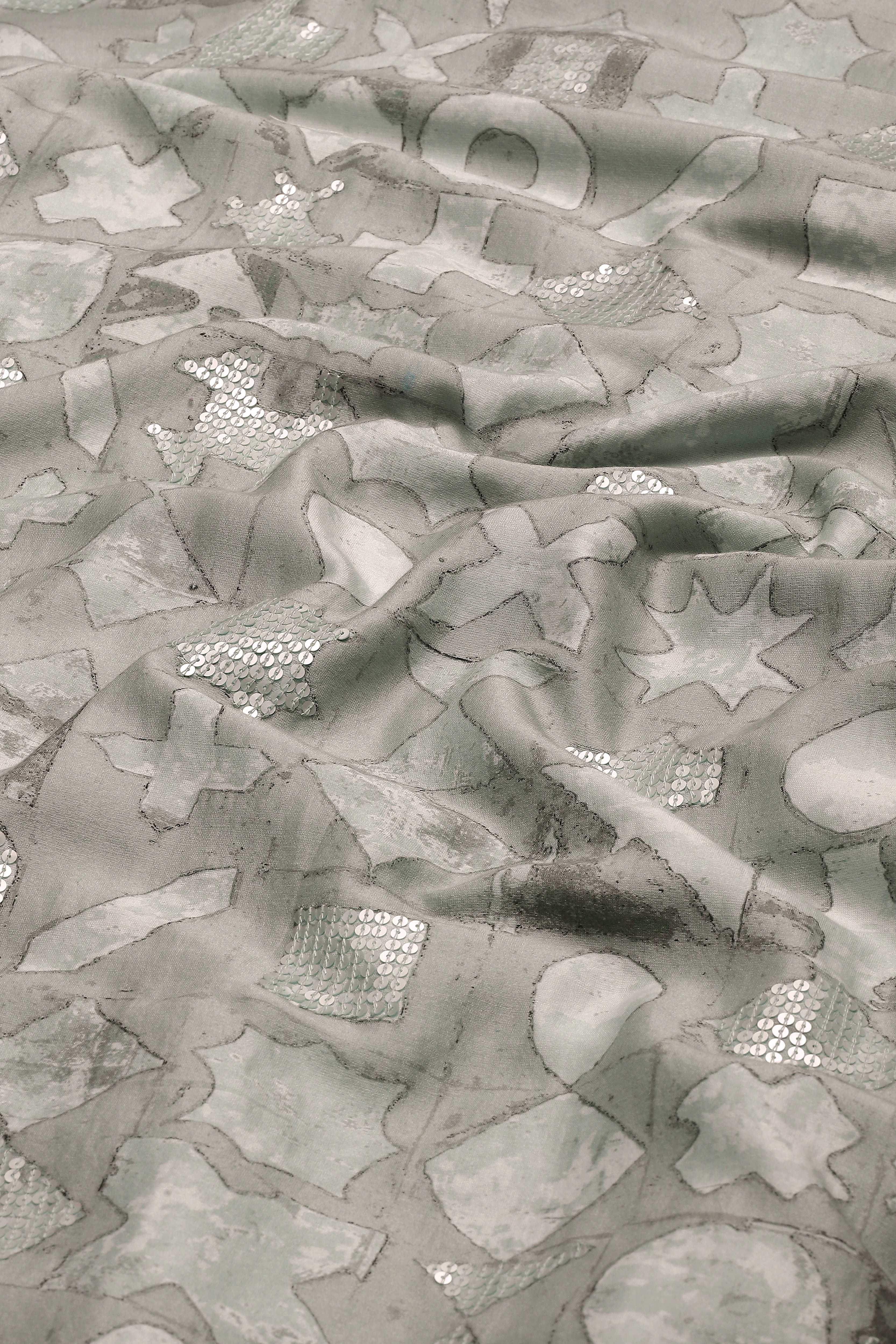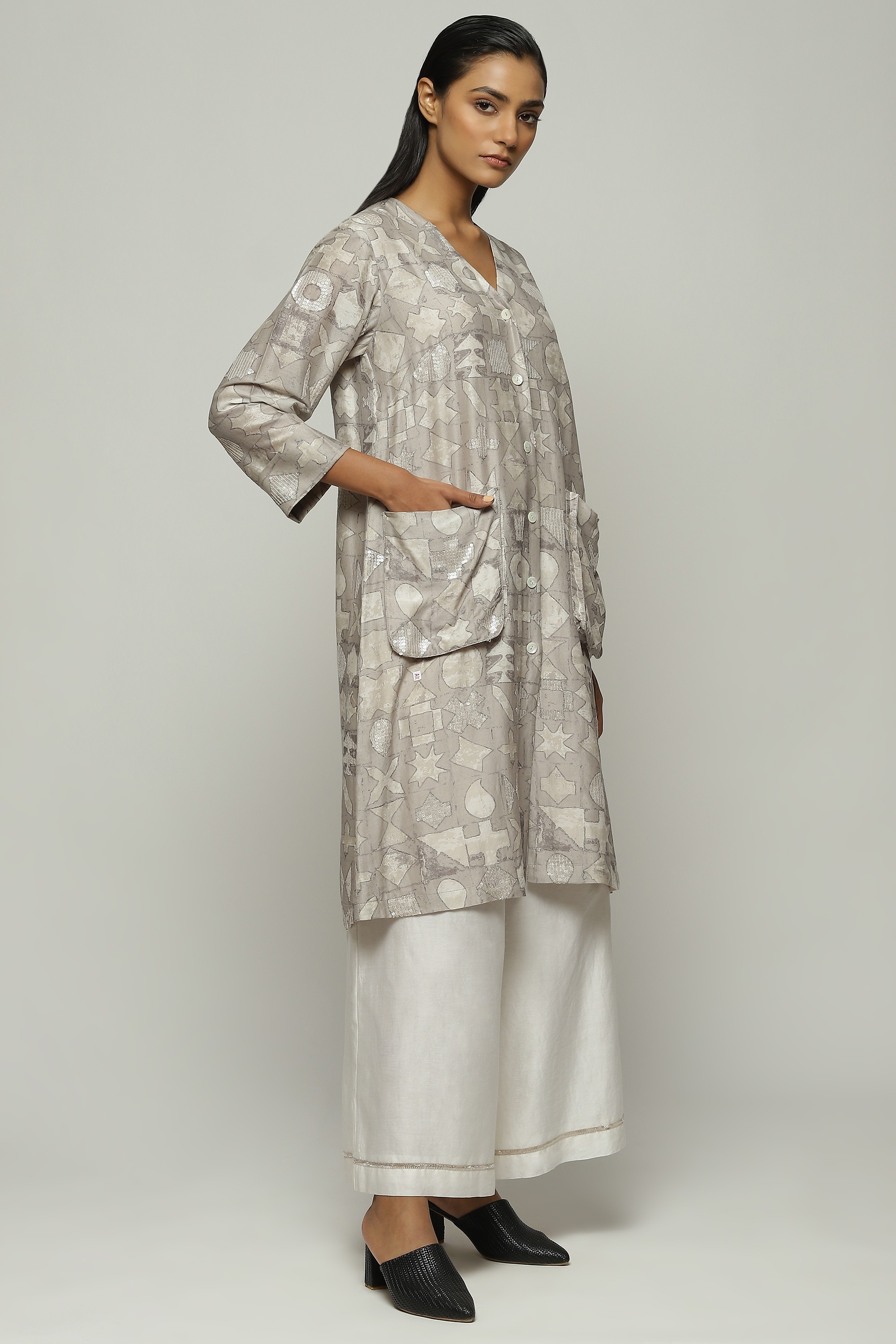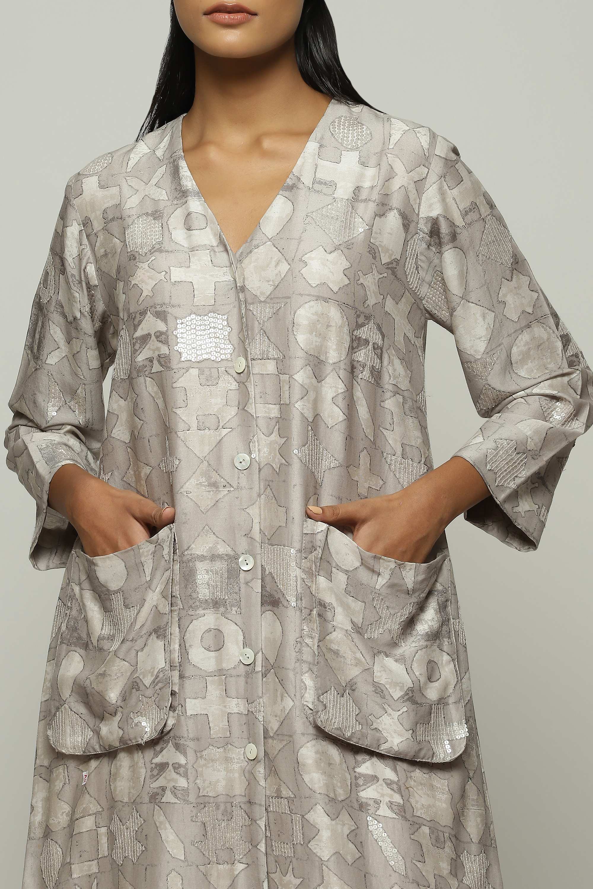 Smoky white symbols shimmer on this ivory jacket. Crafted in a lightweight Chanderi, this piece has been digitally printed and embroidered using the ancient hand adda technique. An easy way to glam up any ensemble.