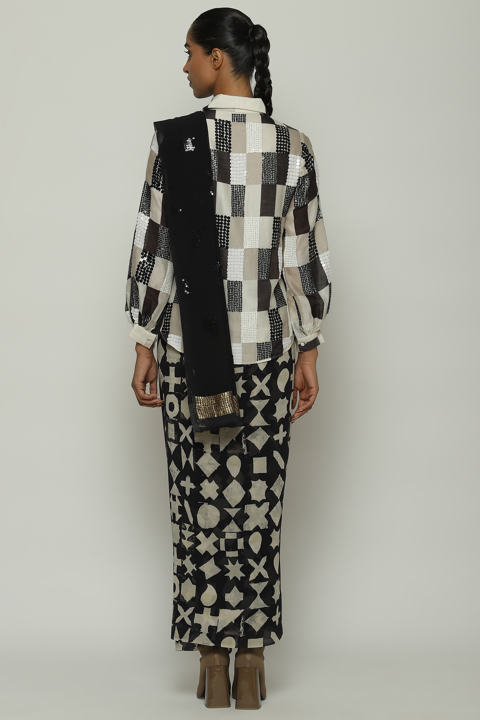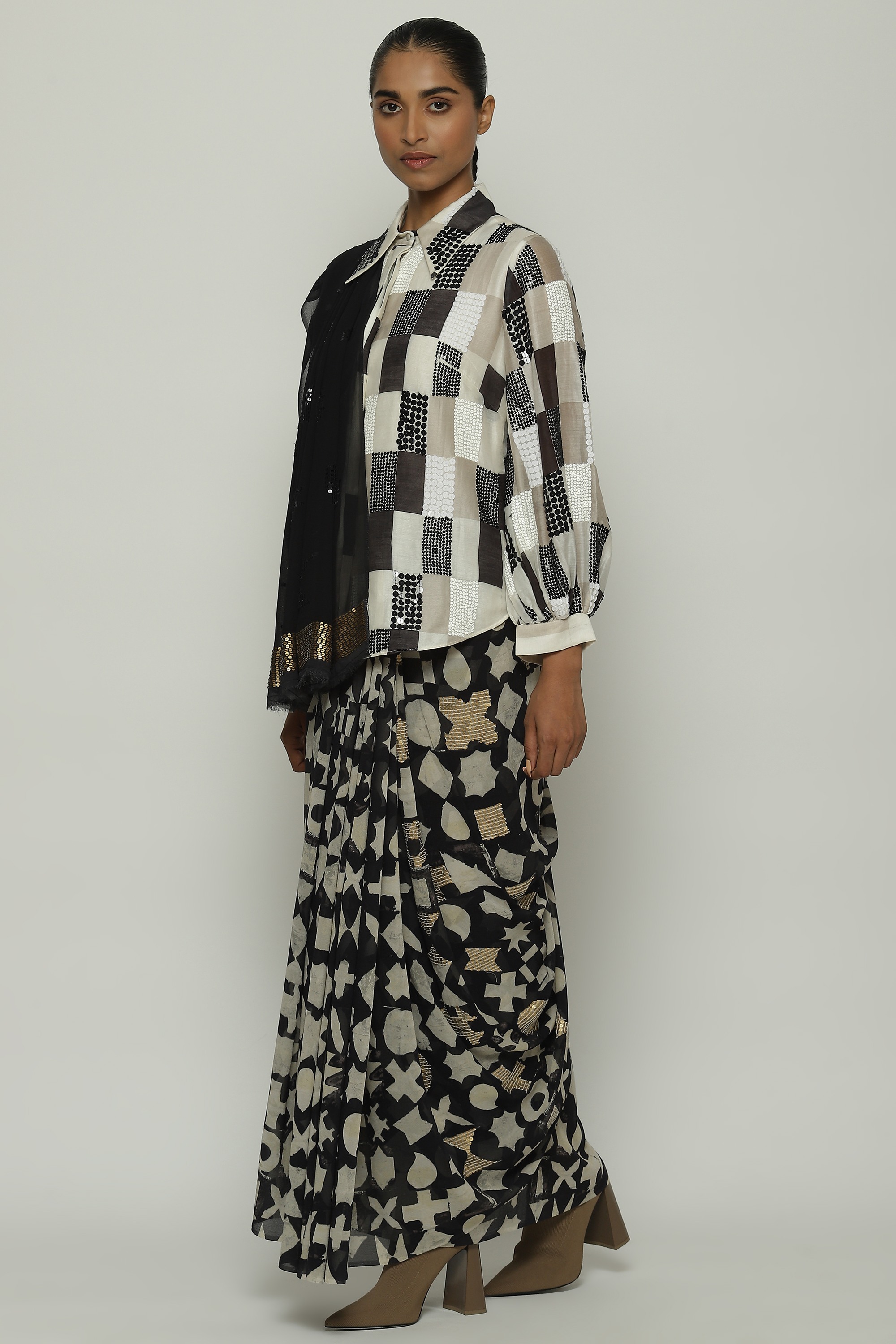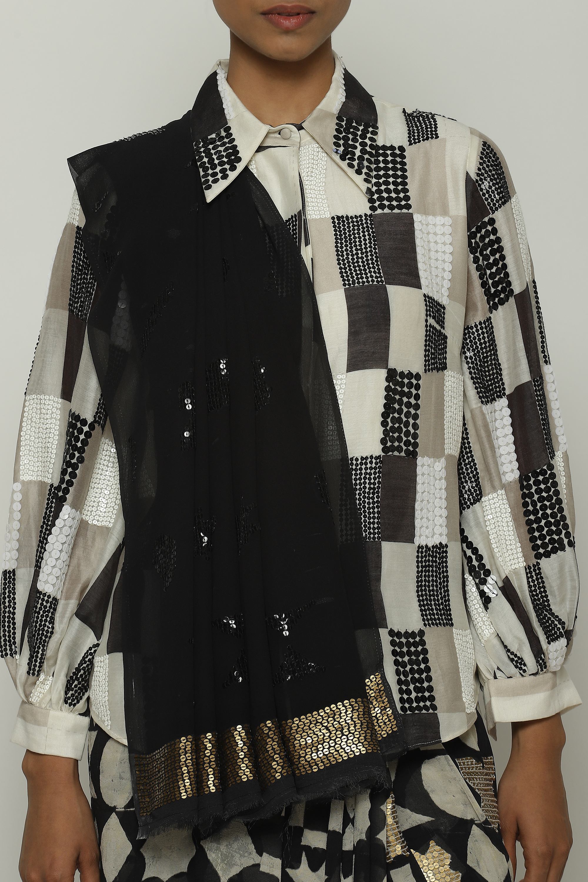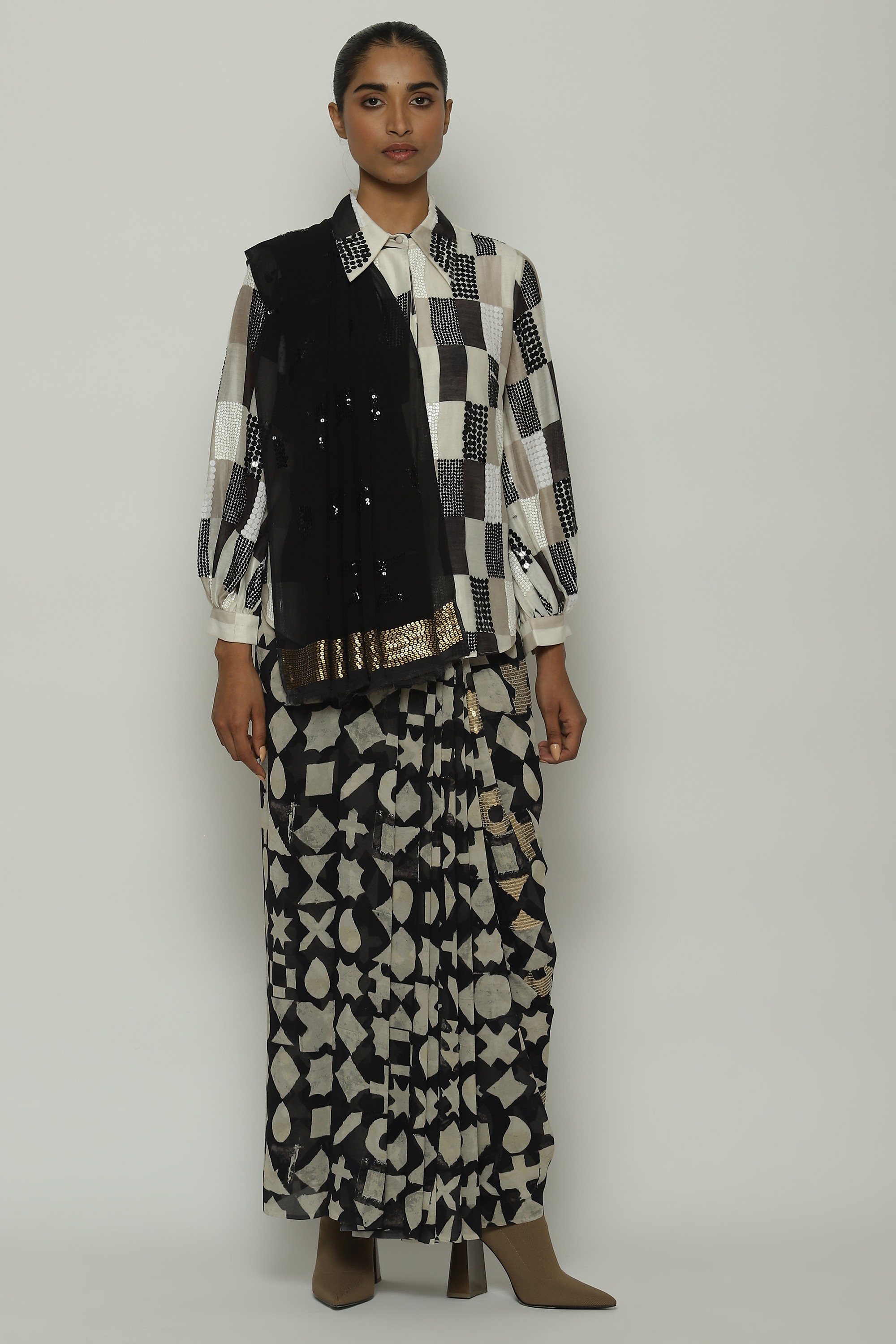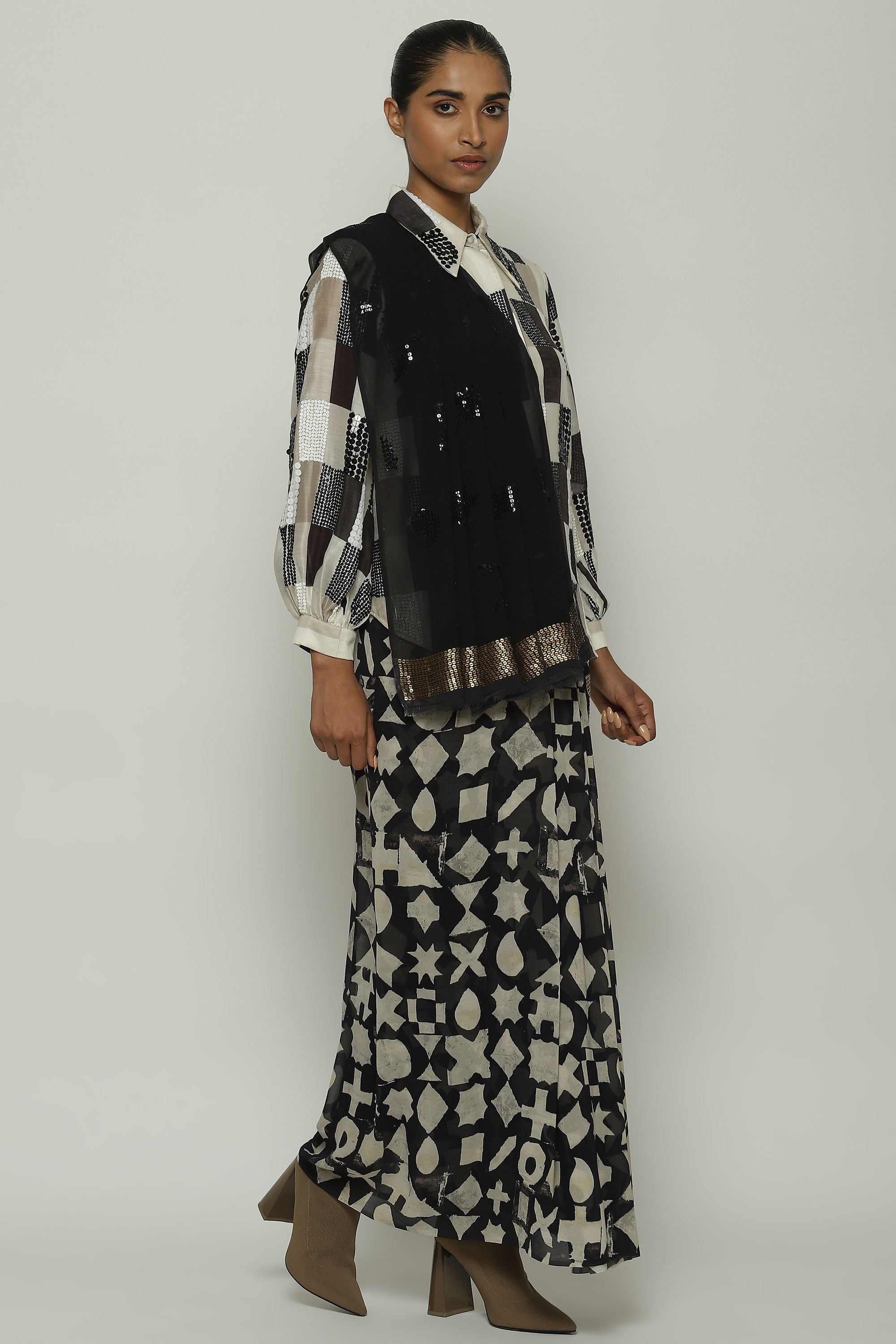 Crafted from semi-sheer Georgette silk, this piece features the ancient art of hand adda embroidery.