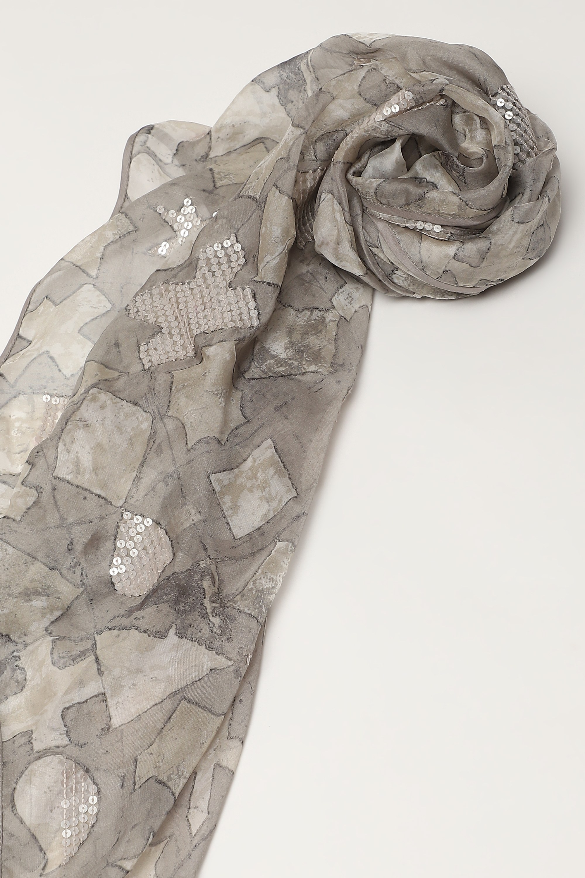Crafted from lightweight organza, this piece is digitally printed and hand adda embroidered with smoke sequins.