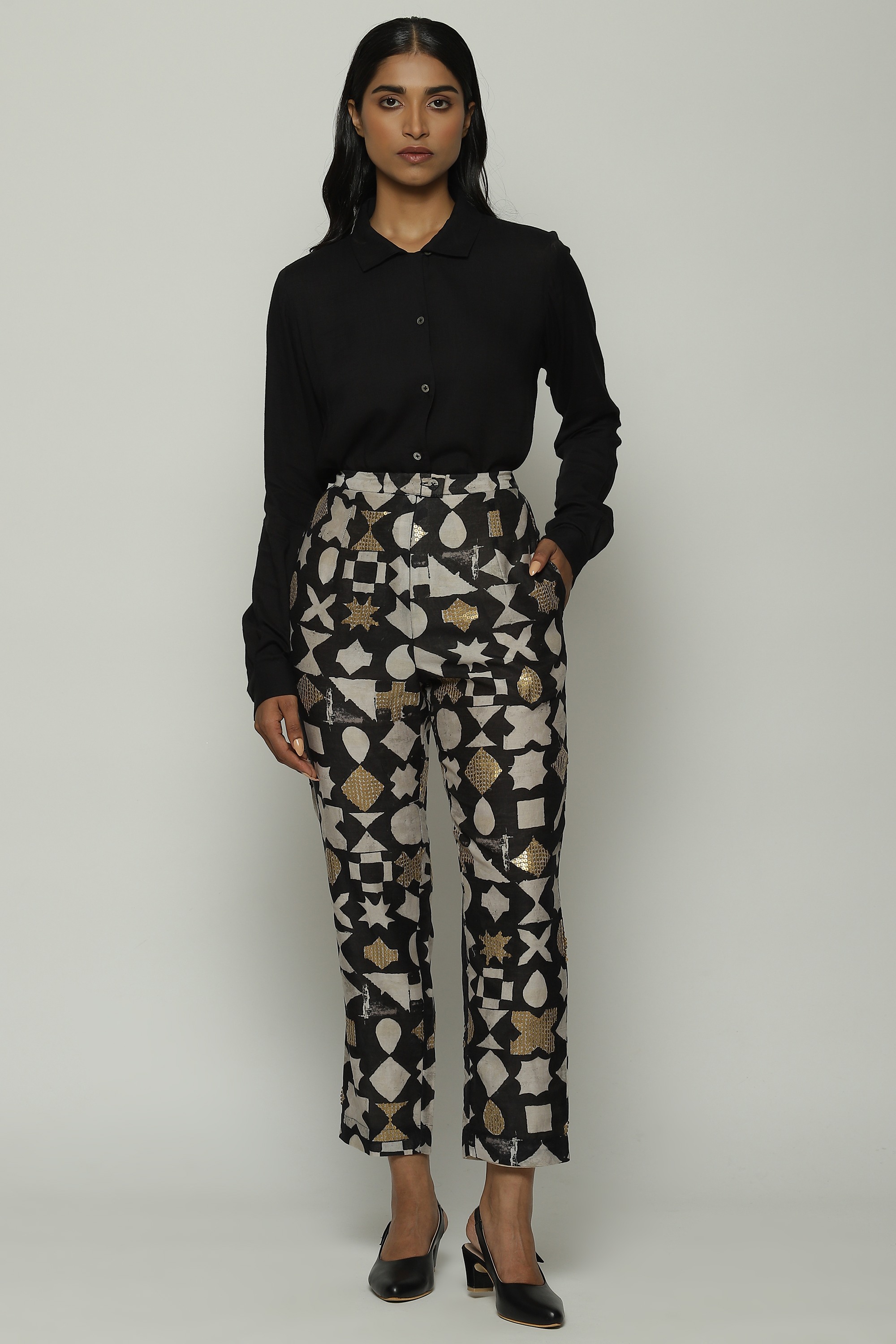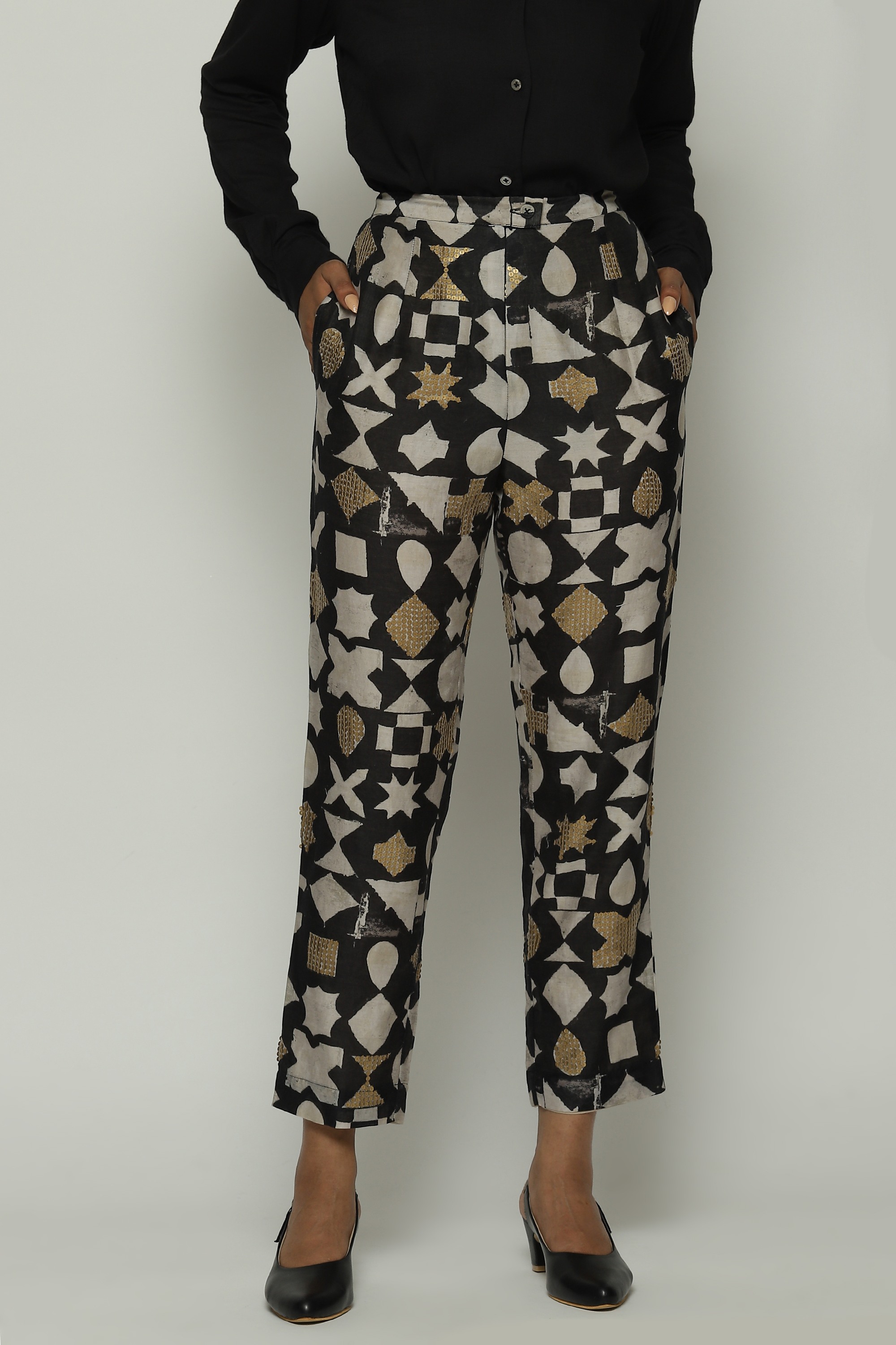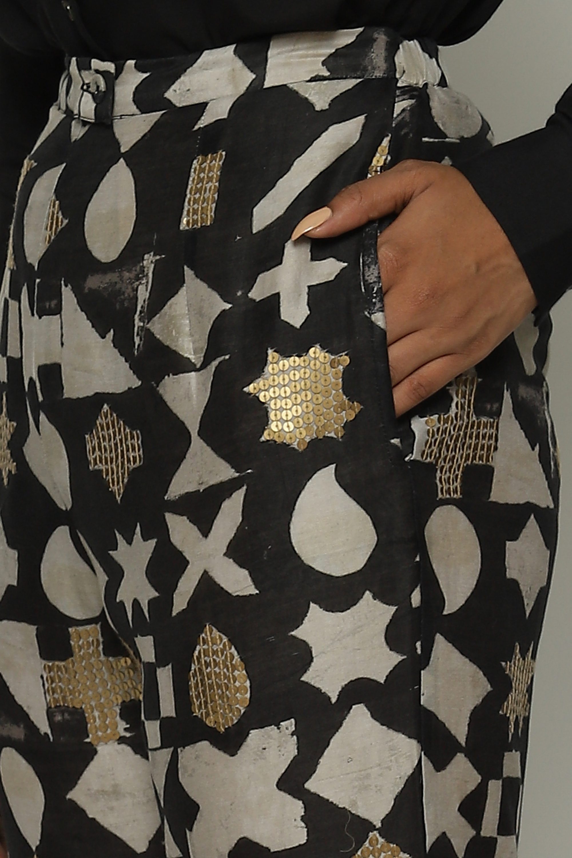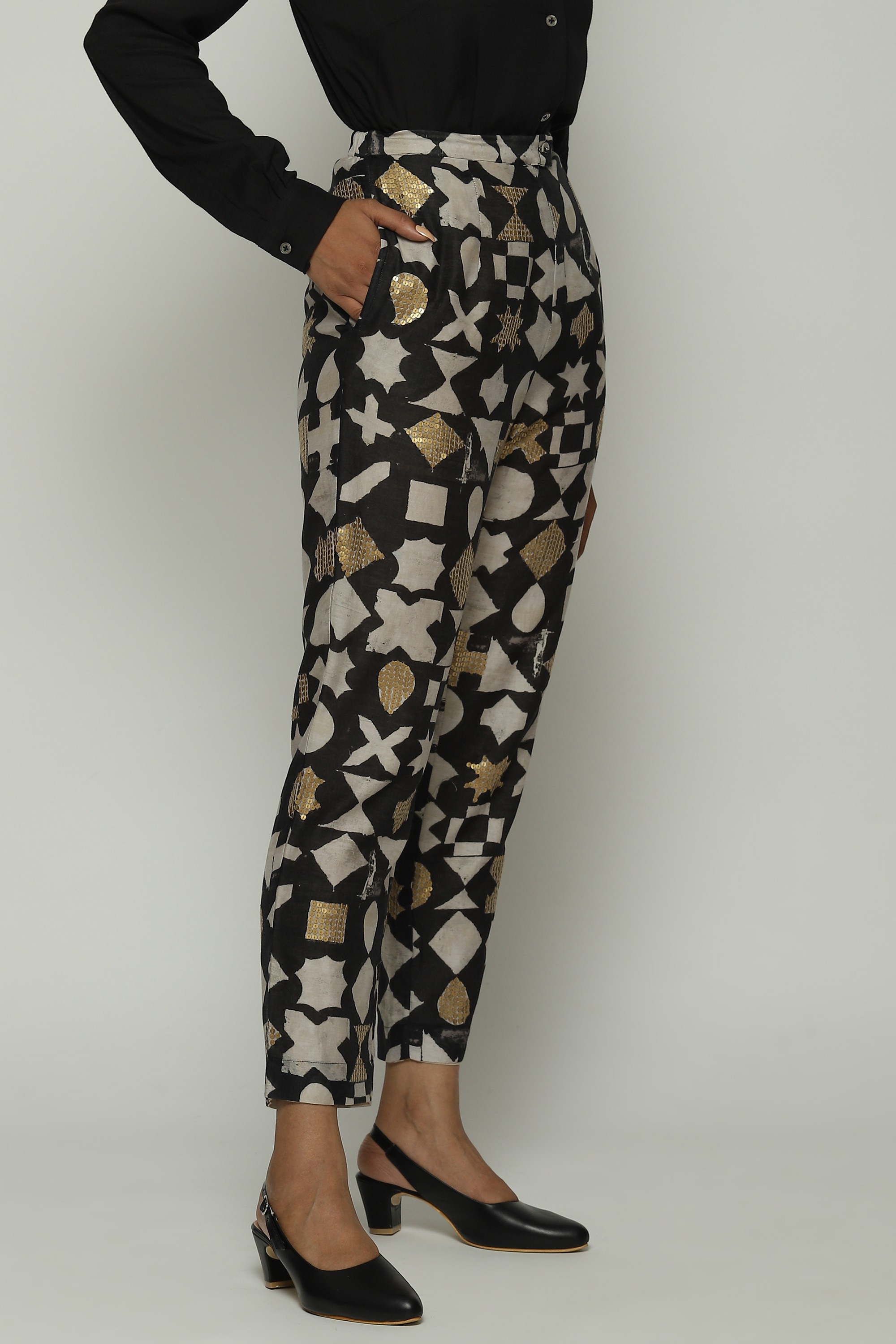 Ivory symbols and gold sequins glitter on this pair of tapered black pants.