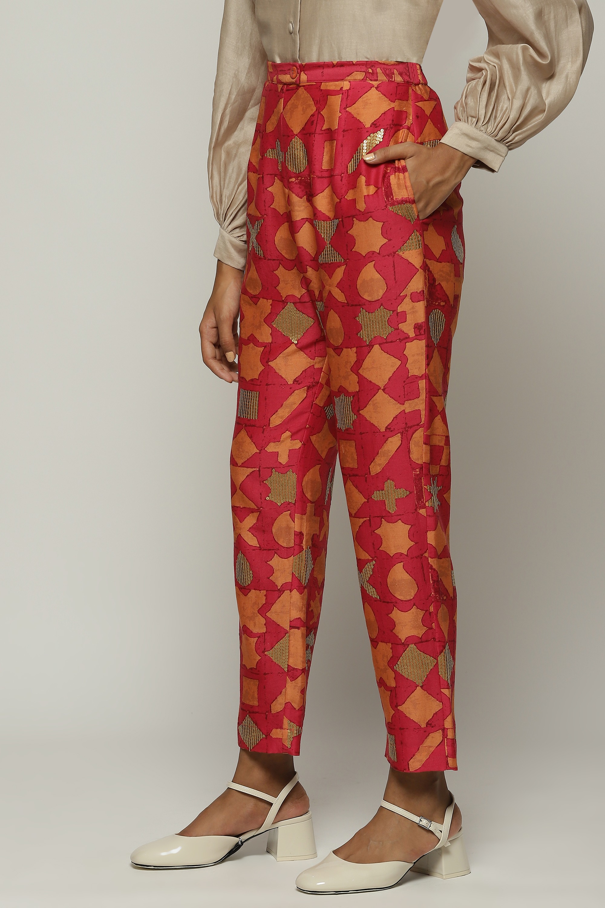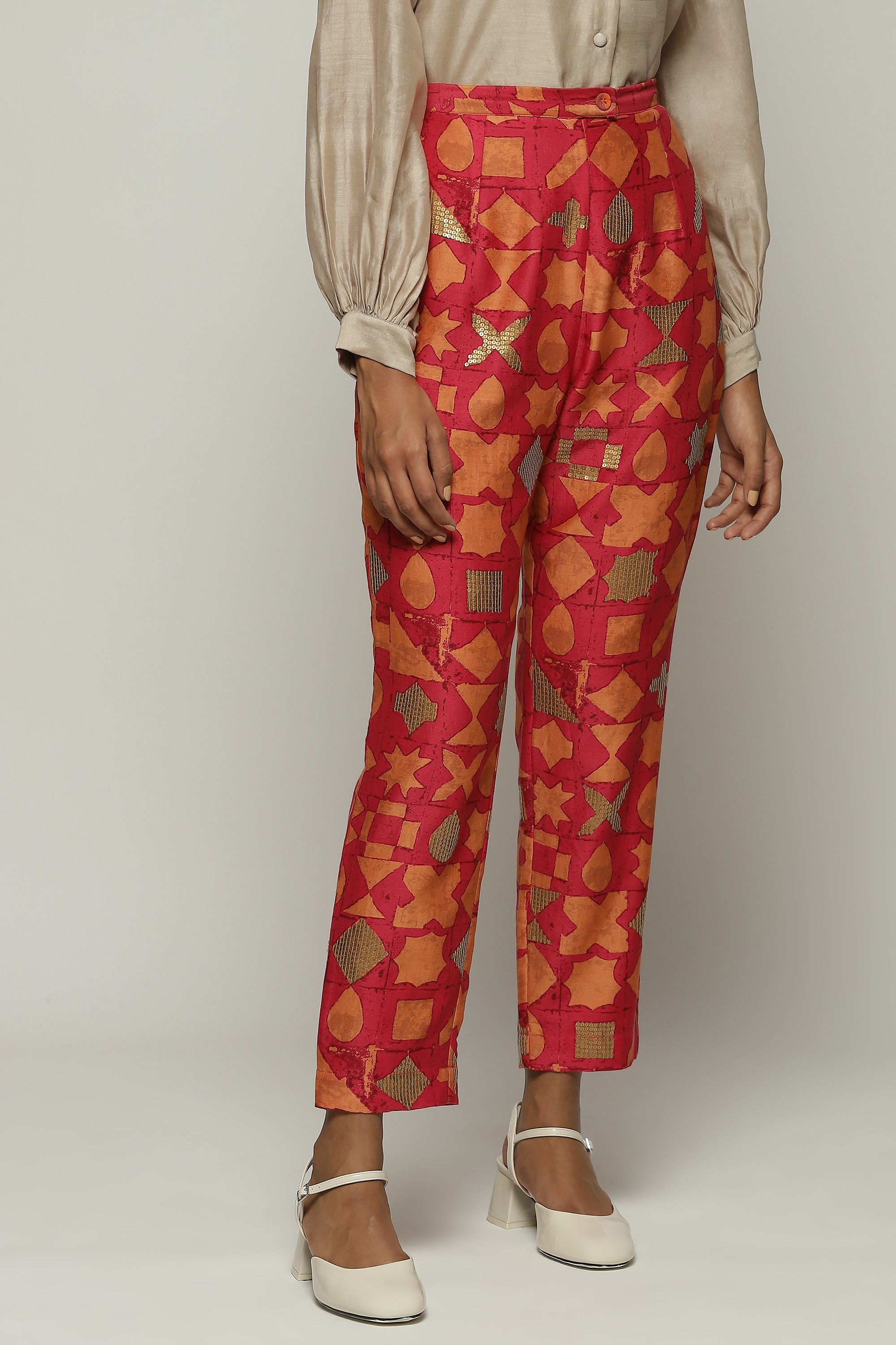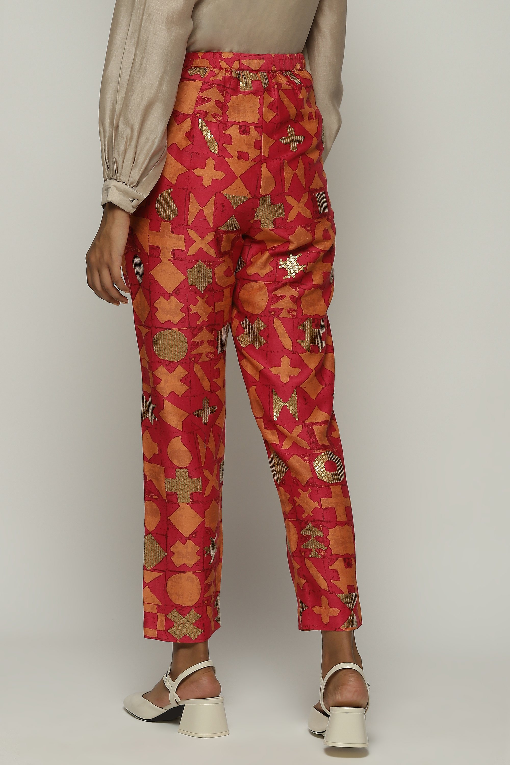 A pair of fuschia trousers printed with symbols in shades of tangerine.