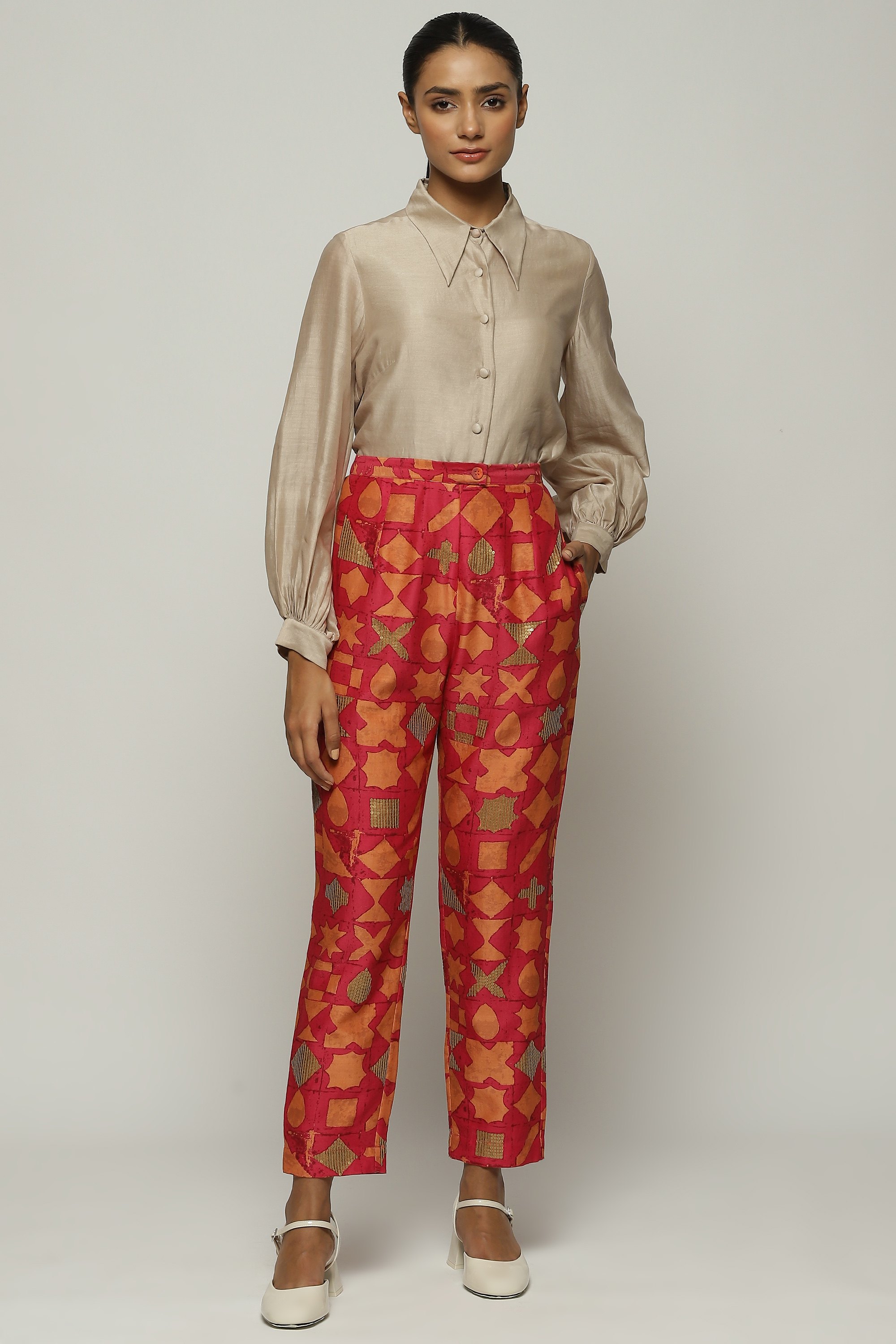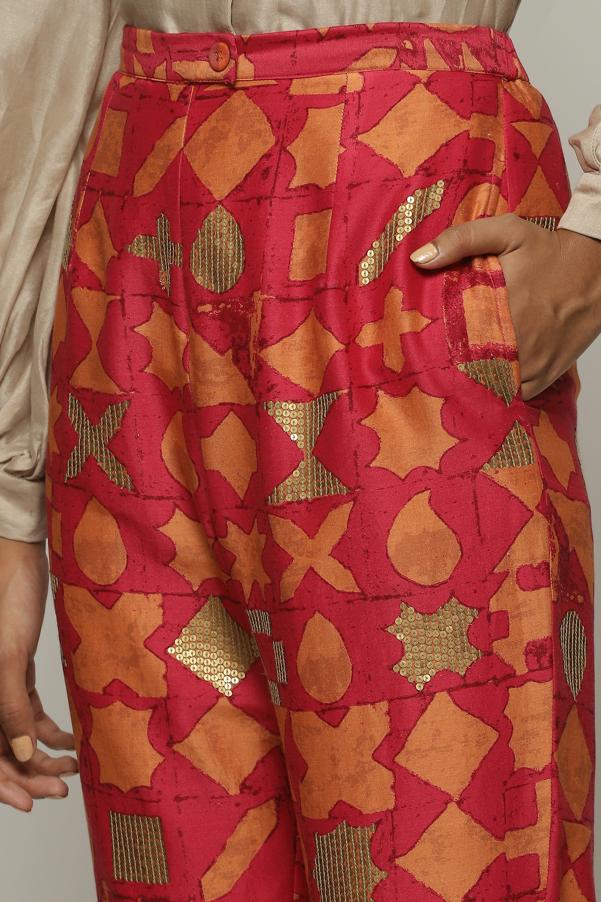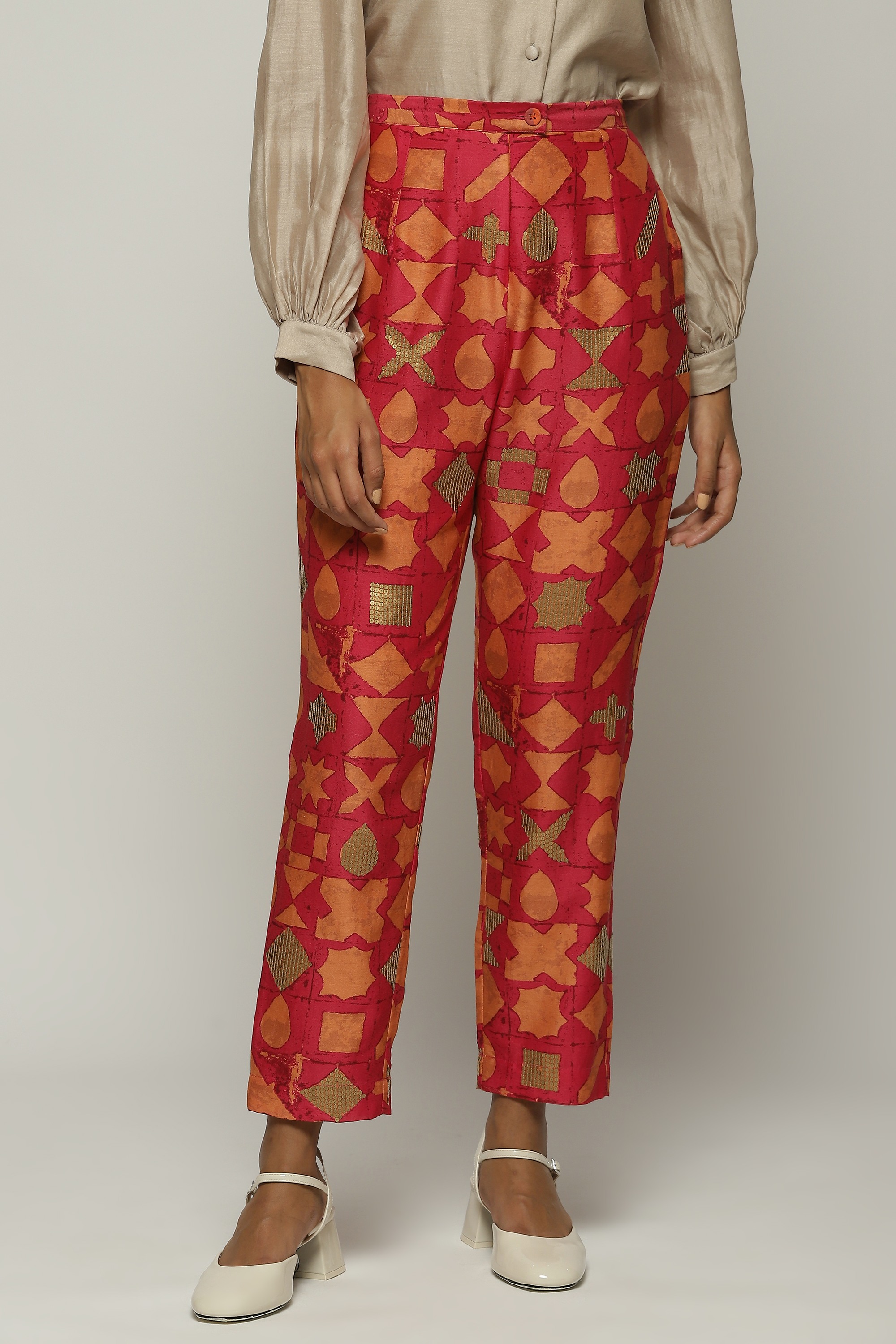 A pair of fuschia trousers printed with symbols in shades of tangerine.