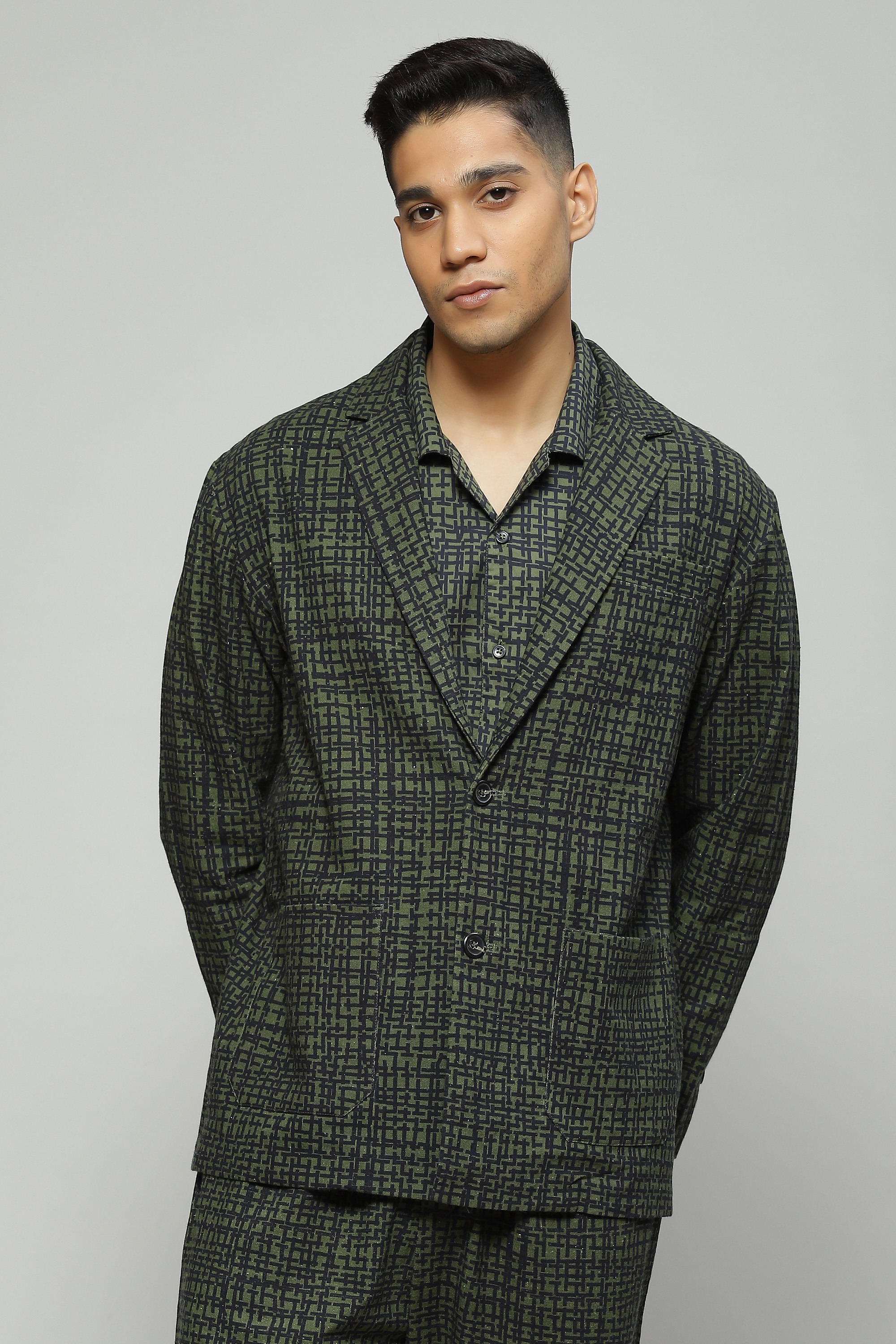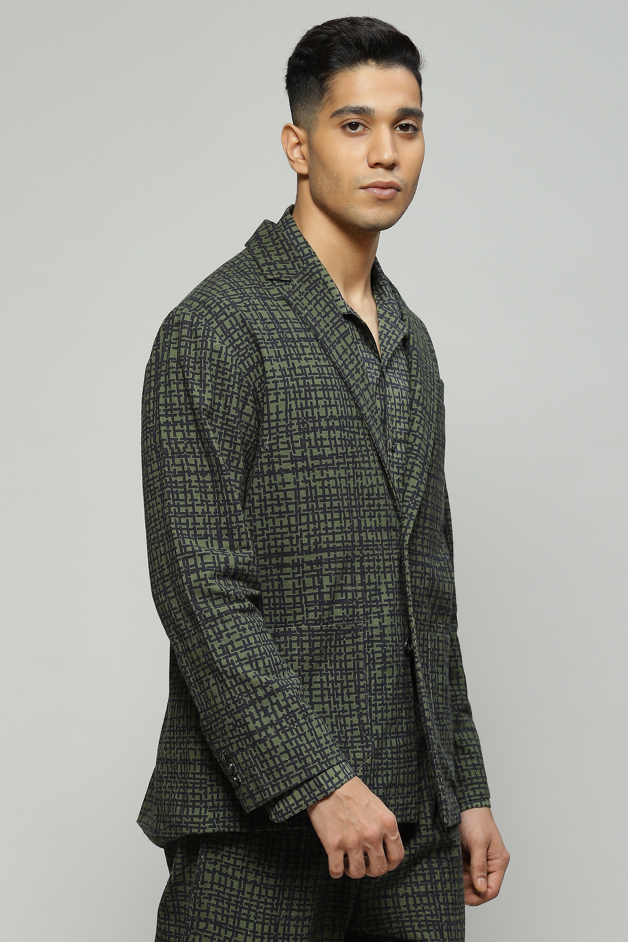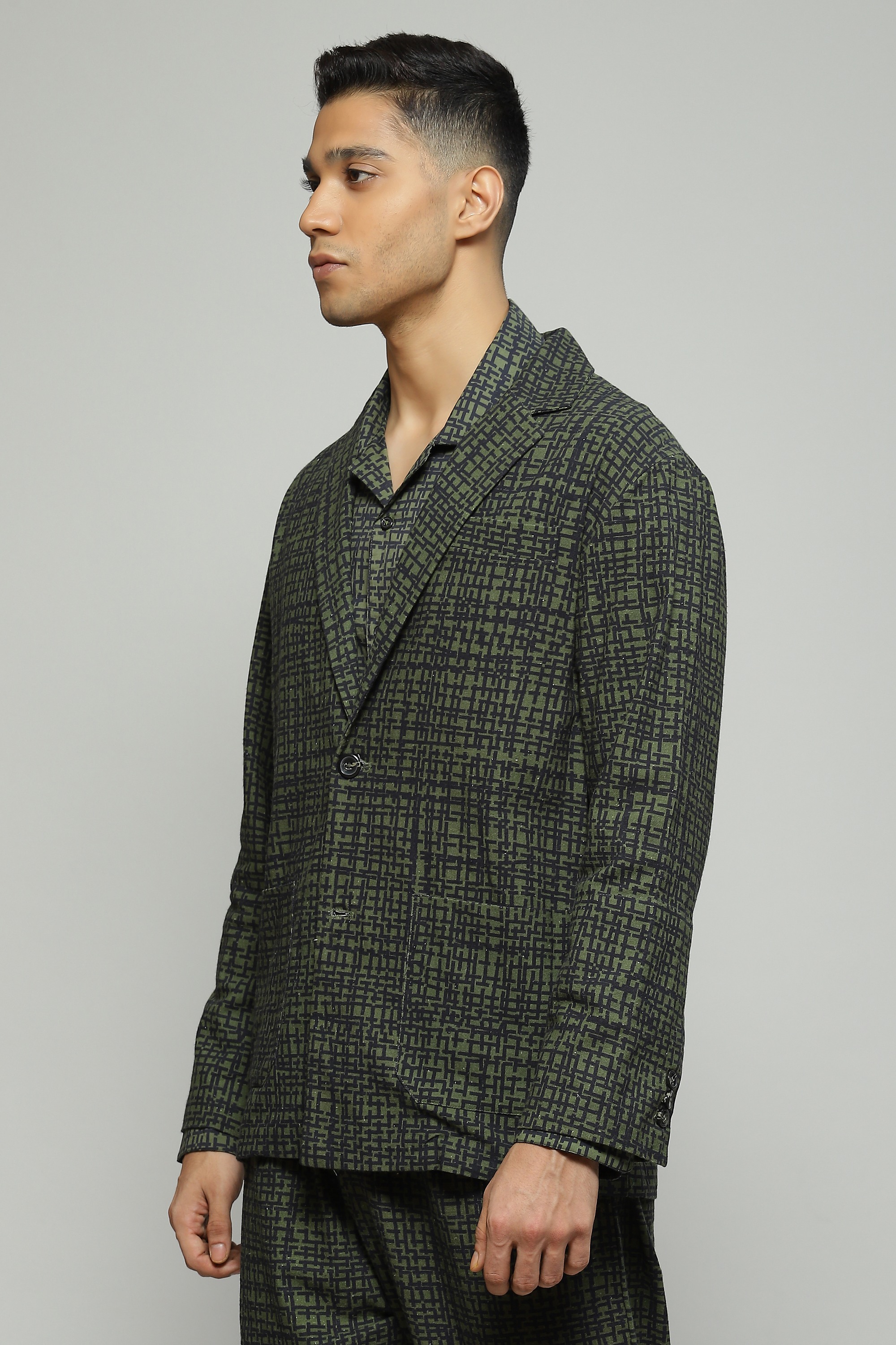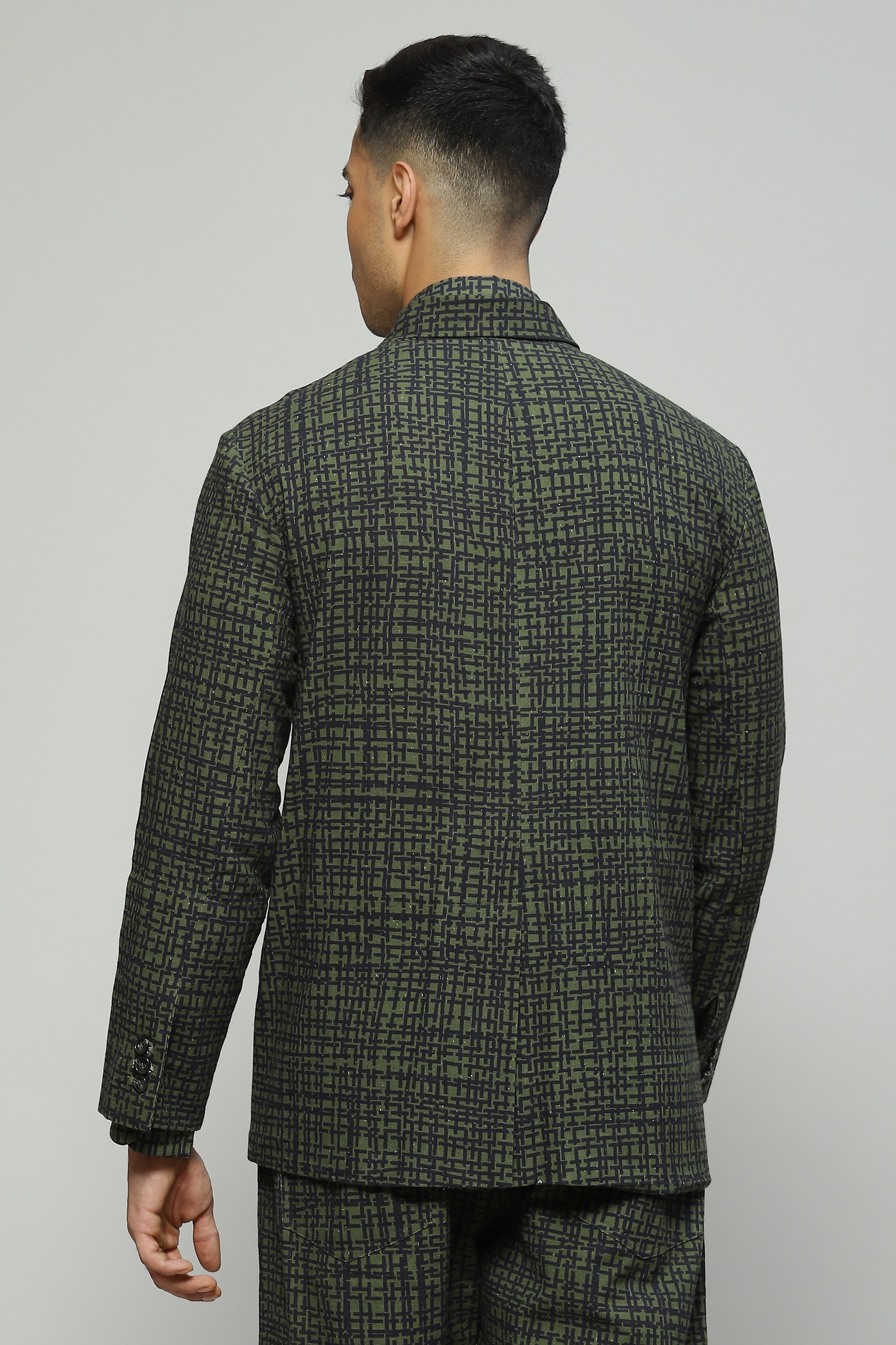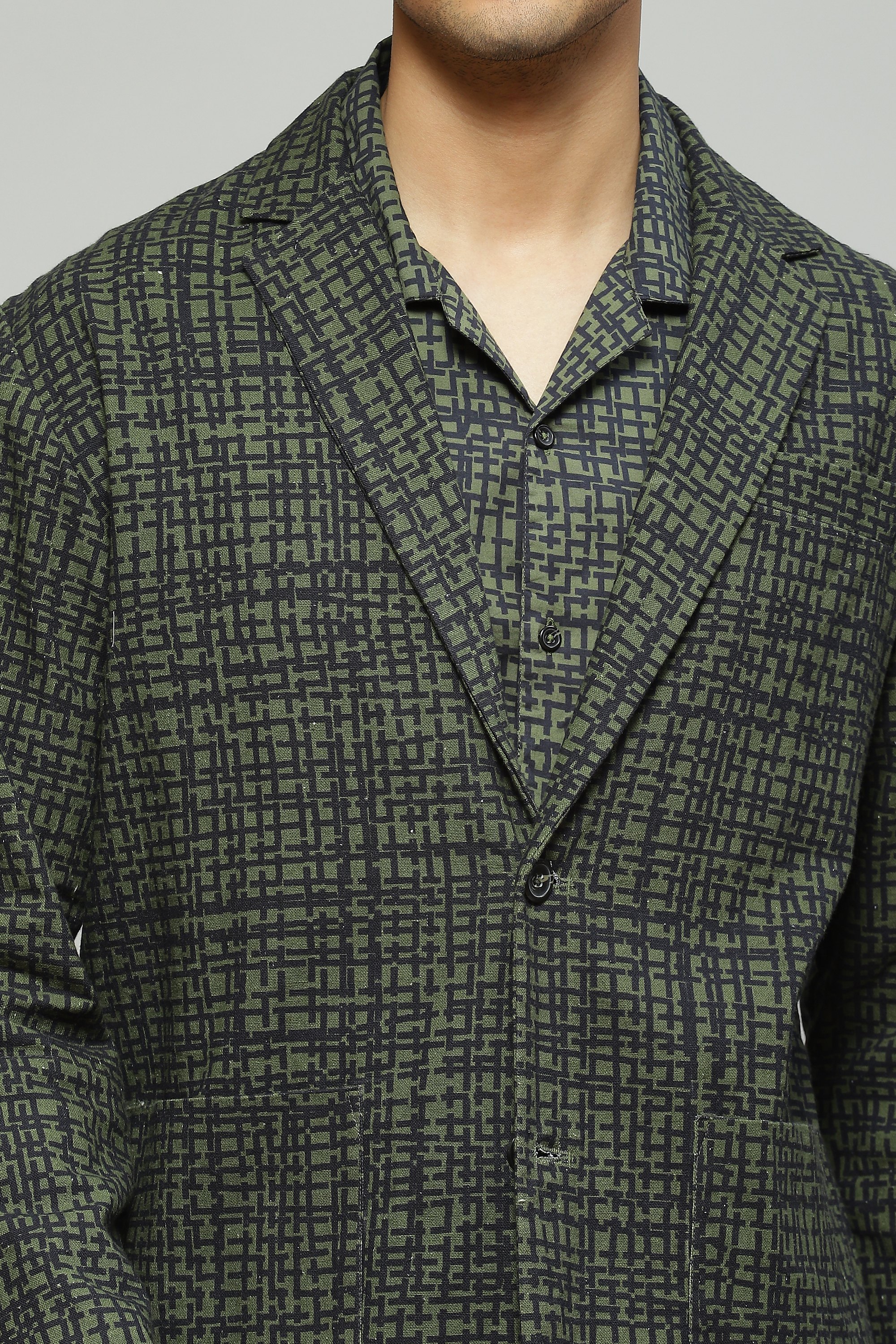 A tailored seagrass-green Tabby jacket featuring digital print Cut in organic cotton, make this your go-to option for outdoor dinners