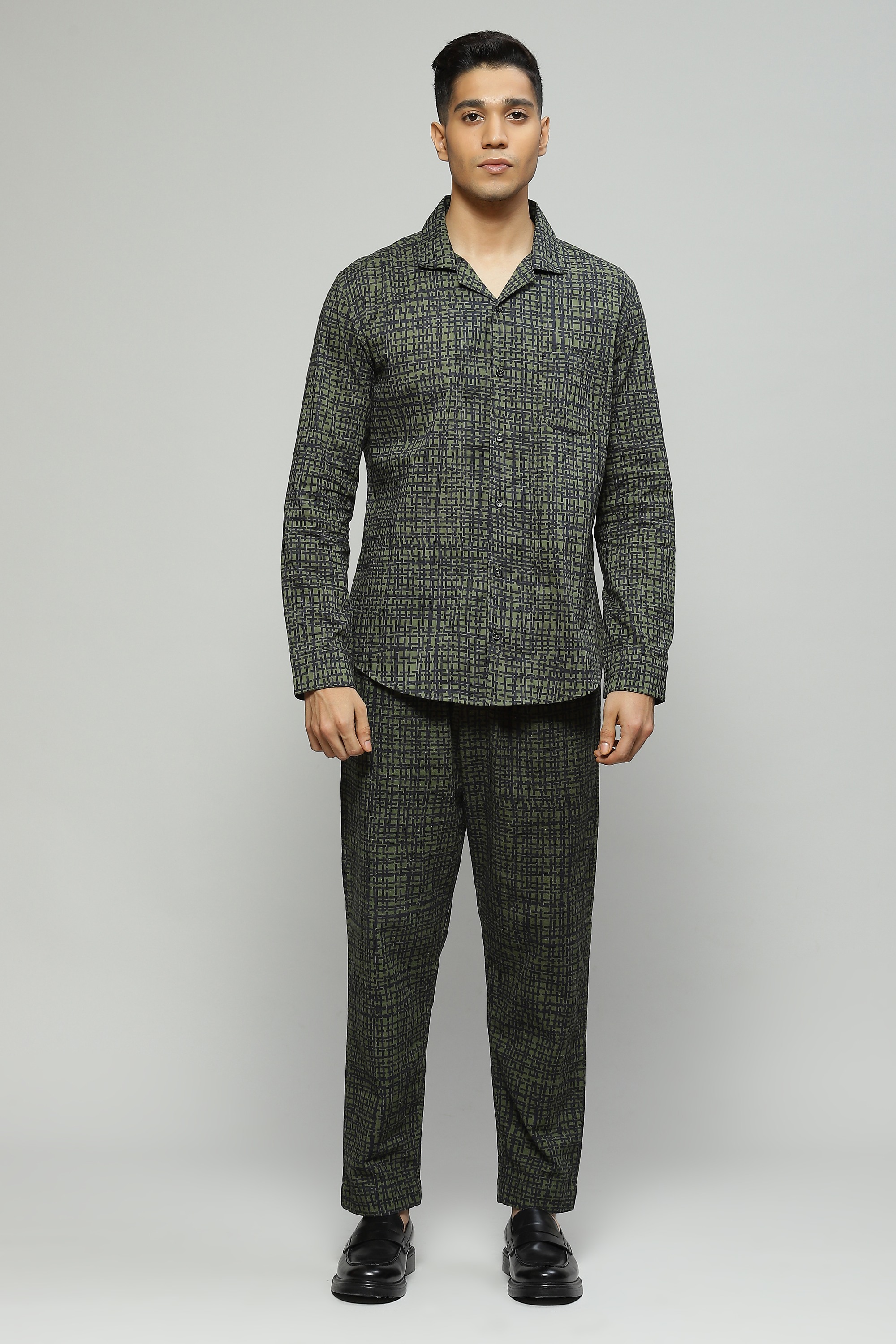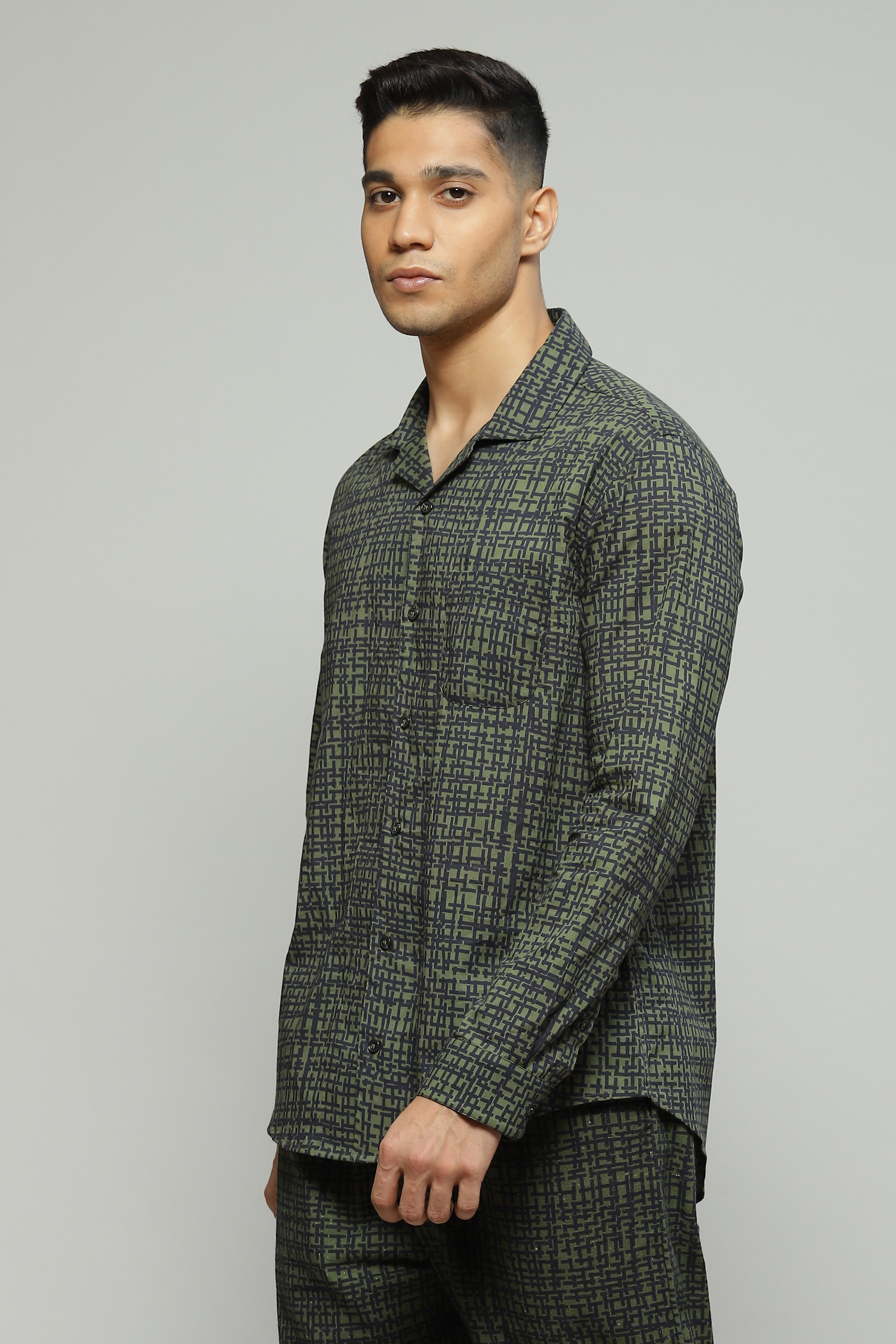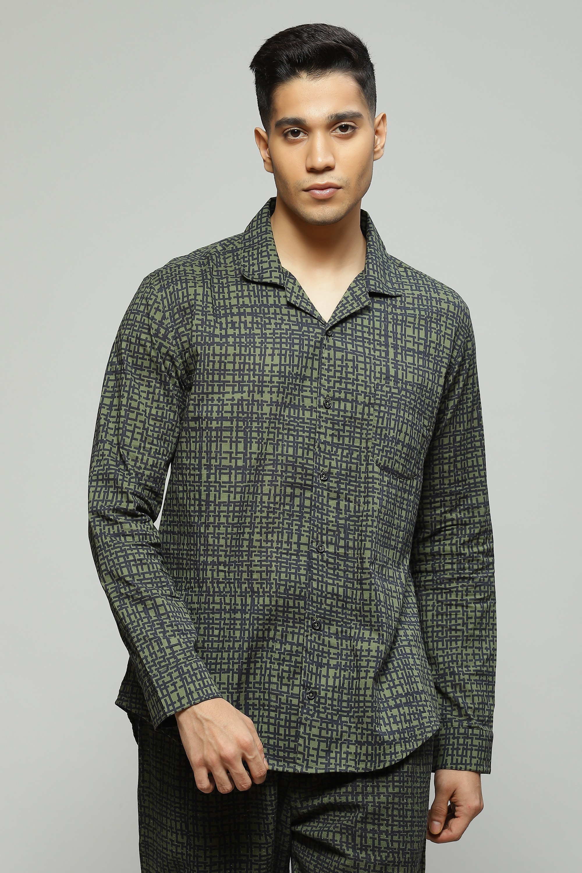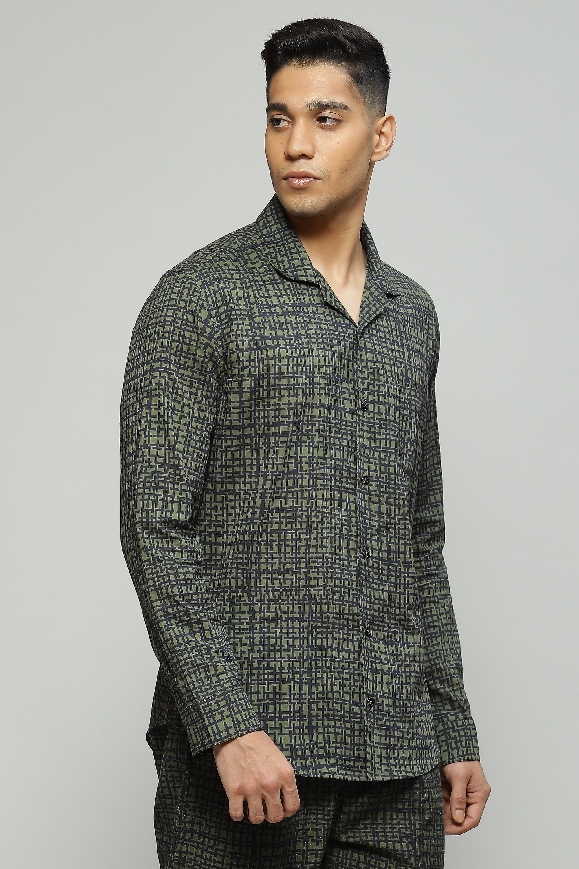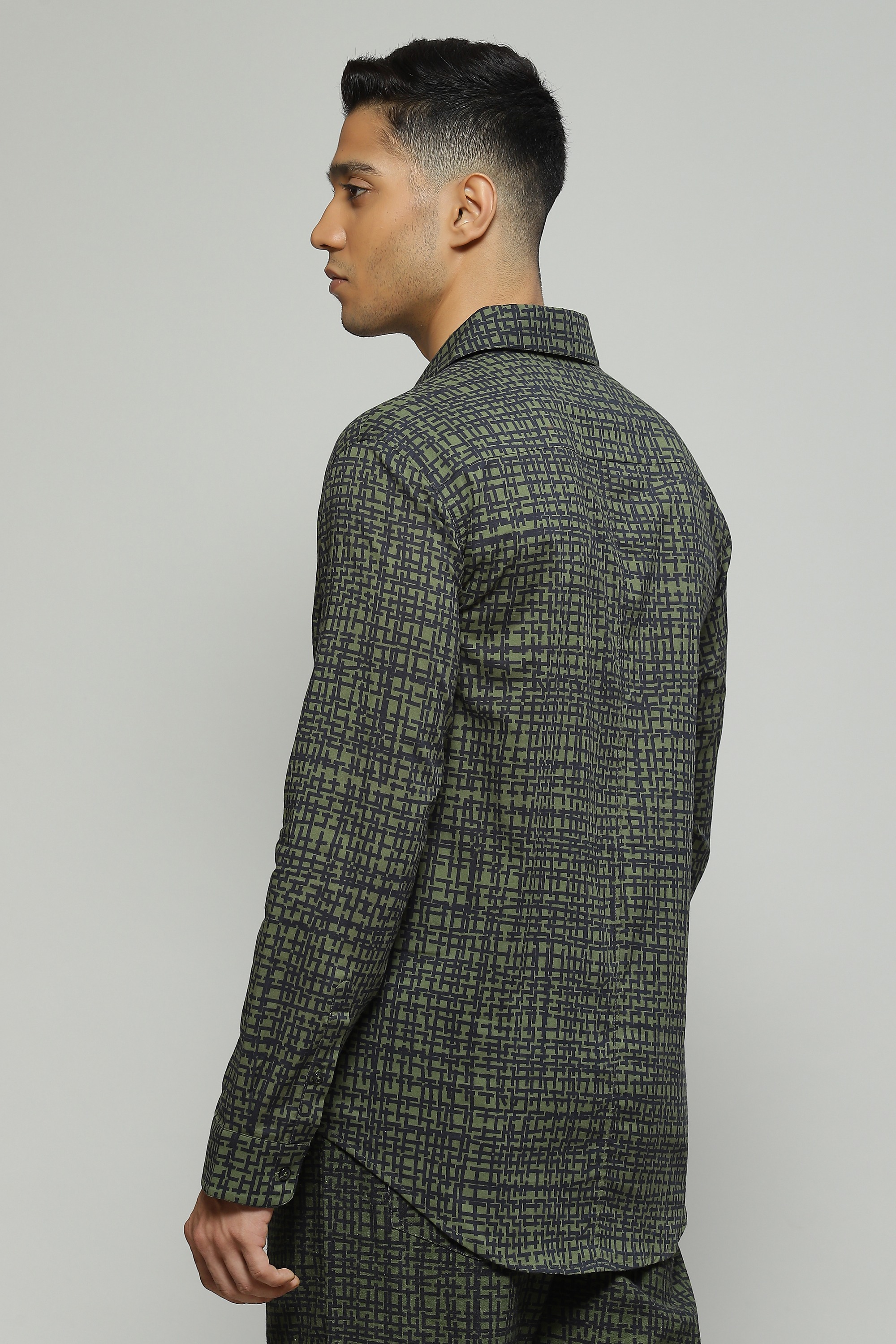 A classic seagrass green shirt featuring a digital tabby print Crafted in a lightweight cambric fabric