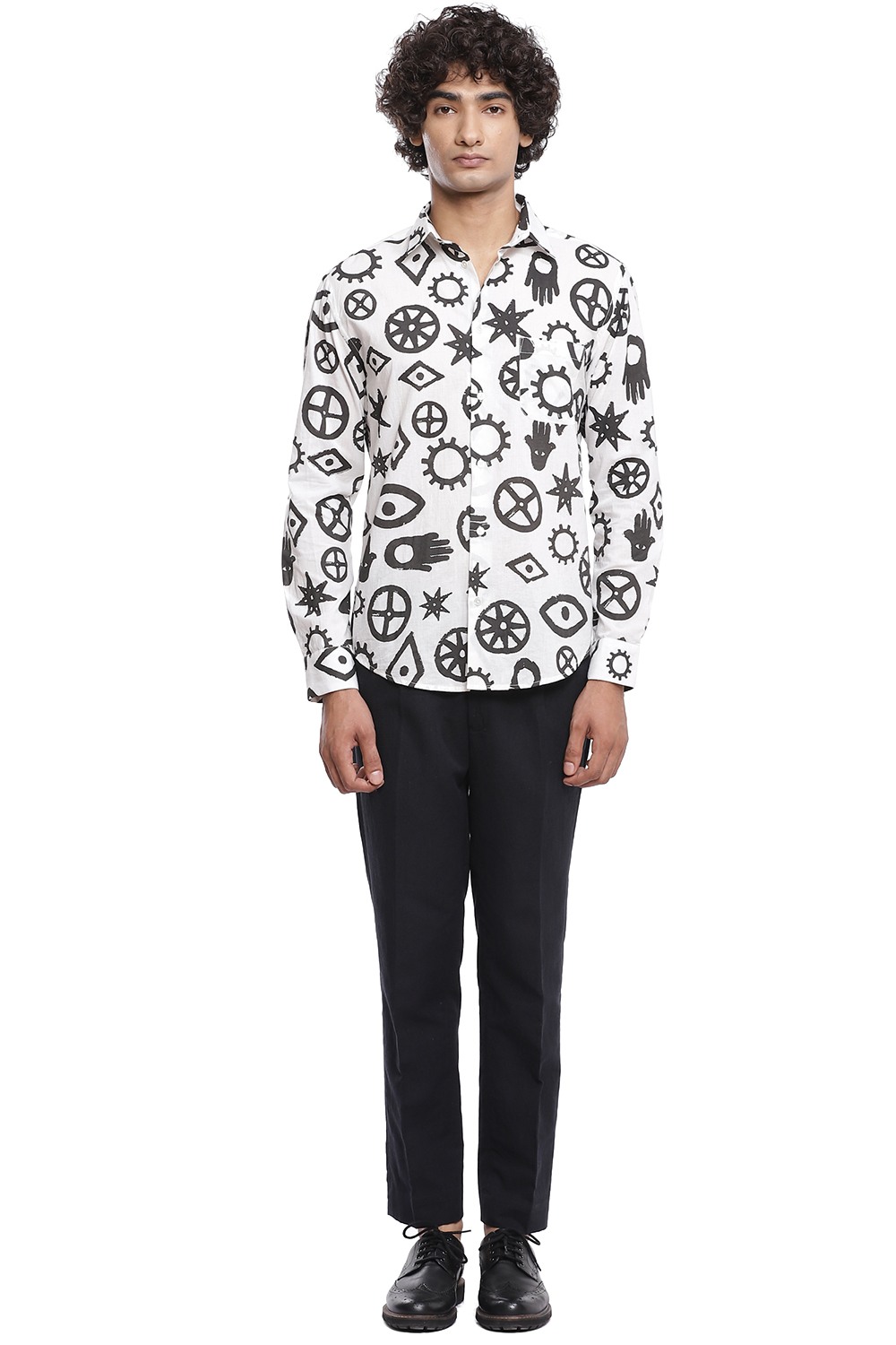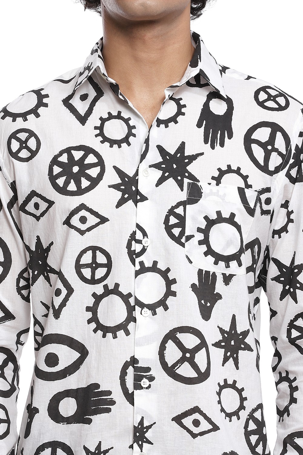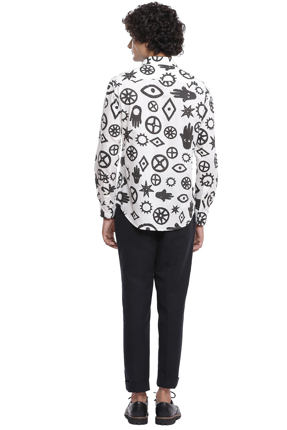 Talisman inspired printed all over motifs. Crafted from cotton cambric in black and white. This shirt is cut for an easy and relaxed fit.
