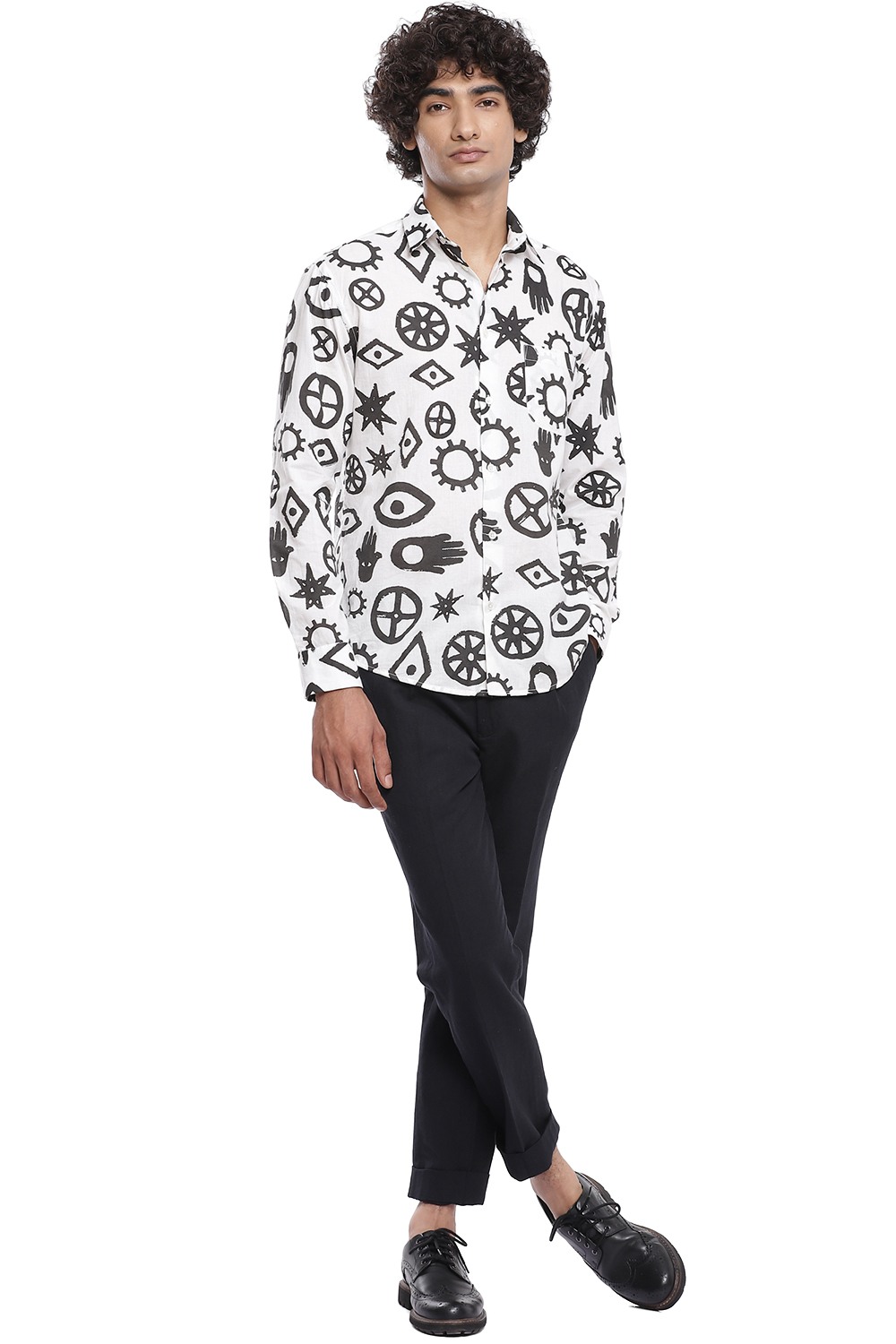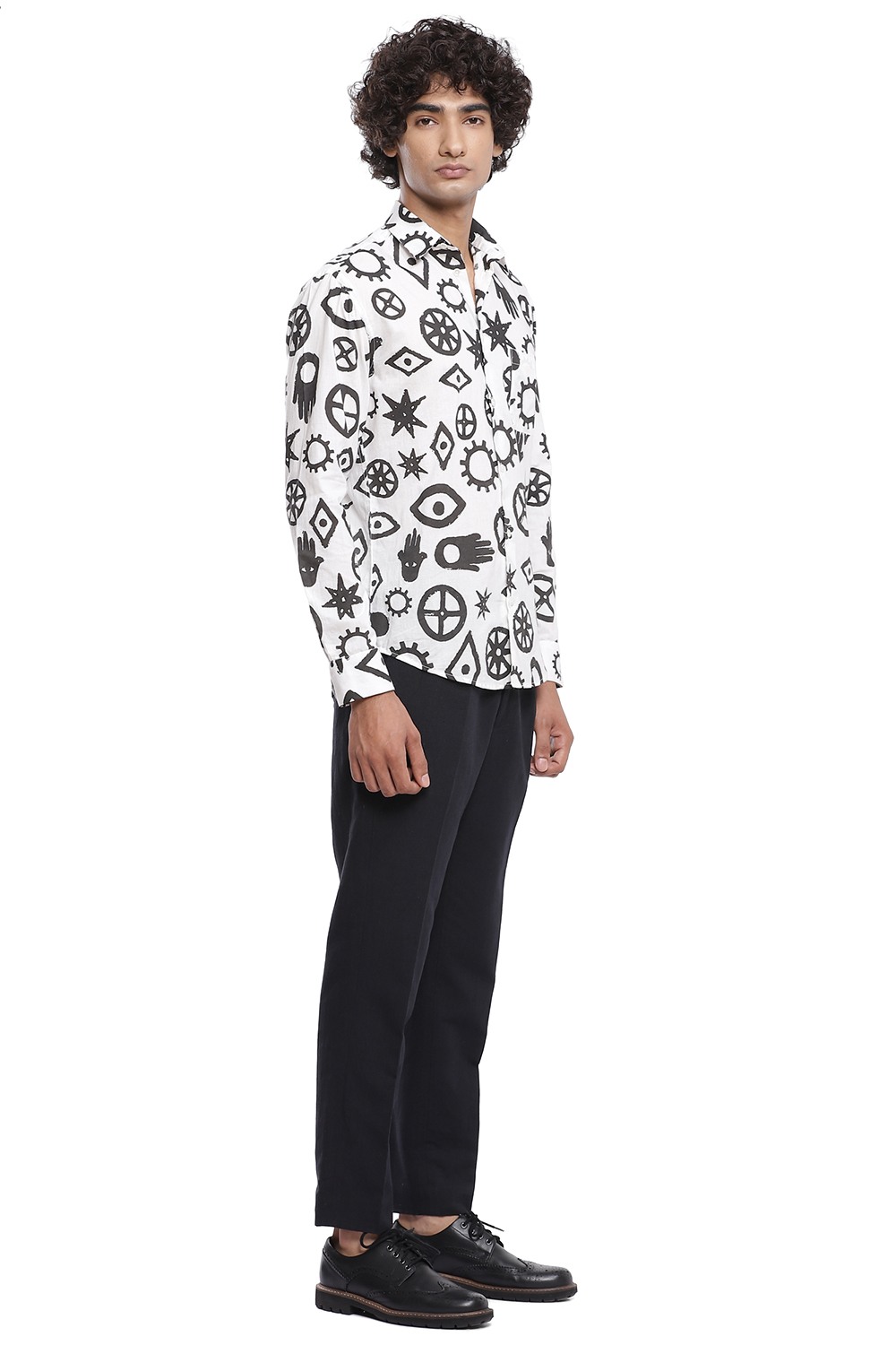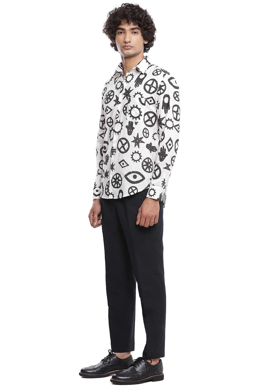 Talisman inspired printed all over motifs. Crafted from cotton cambric in black and white. This shirt is cut for an easy and relaxed fit.