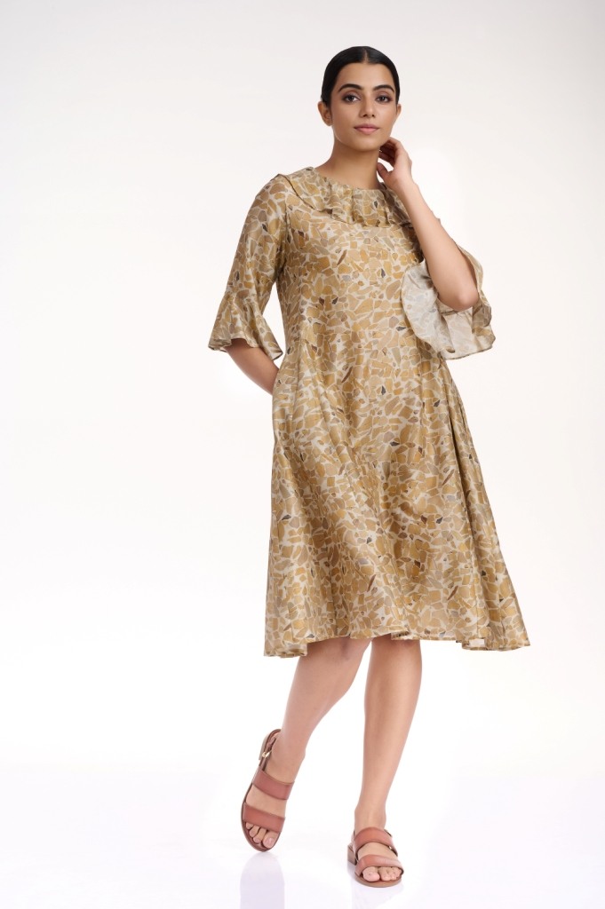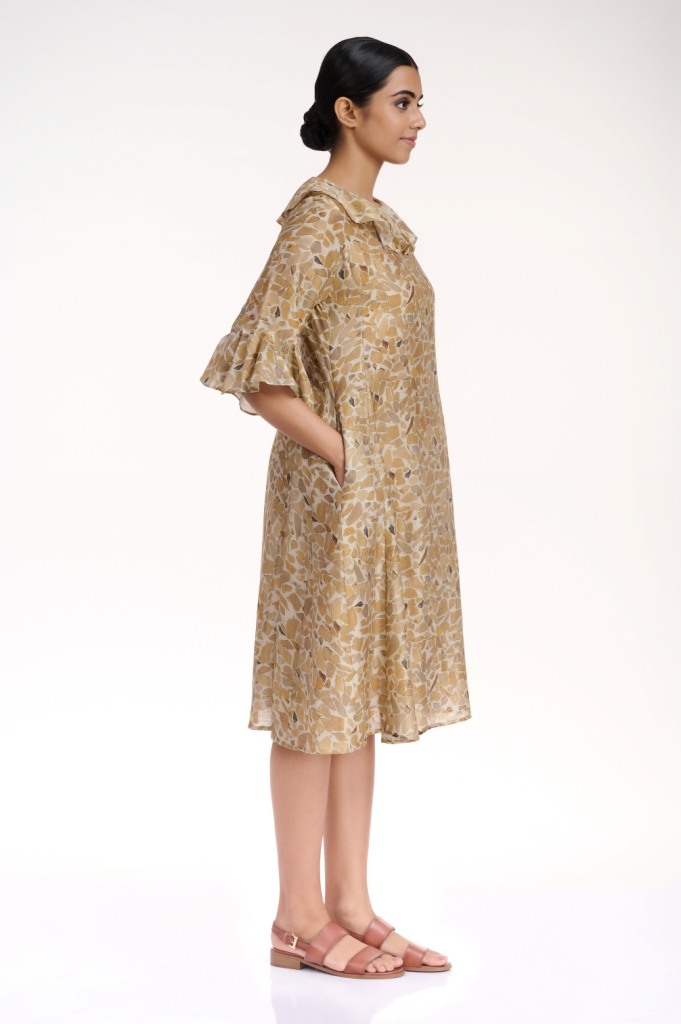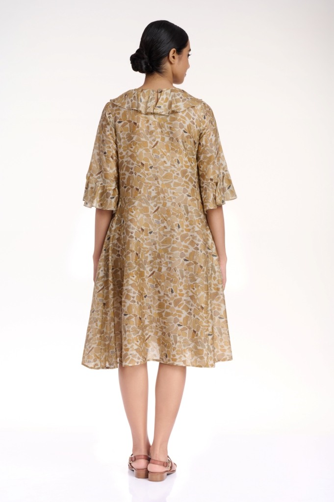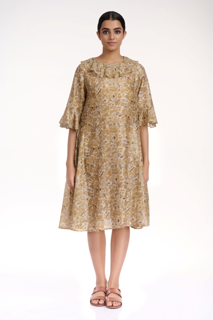 Look comfortable and stylish in the terrazzo printed kali dress, cut from silk cotton fabric, in sophisticated shades of naturals, detailed with frills on the neck line and sleeves. With side seam pockets.