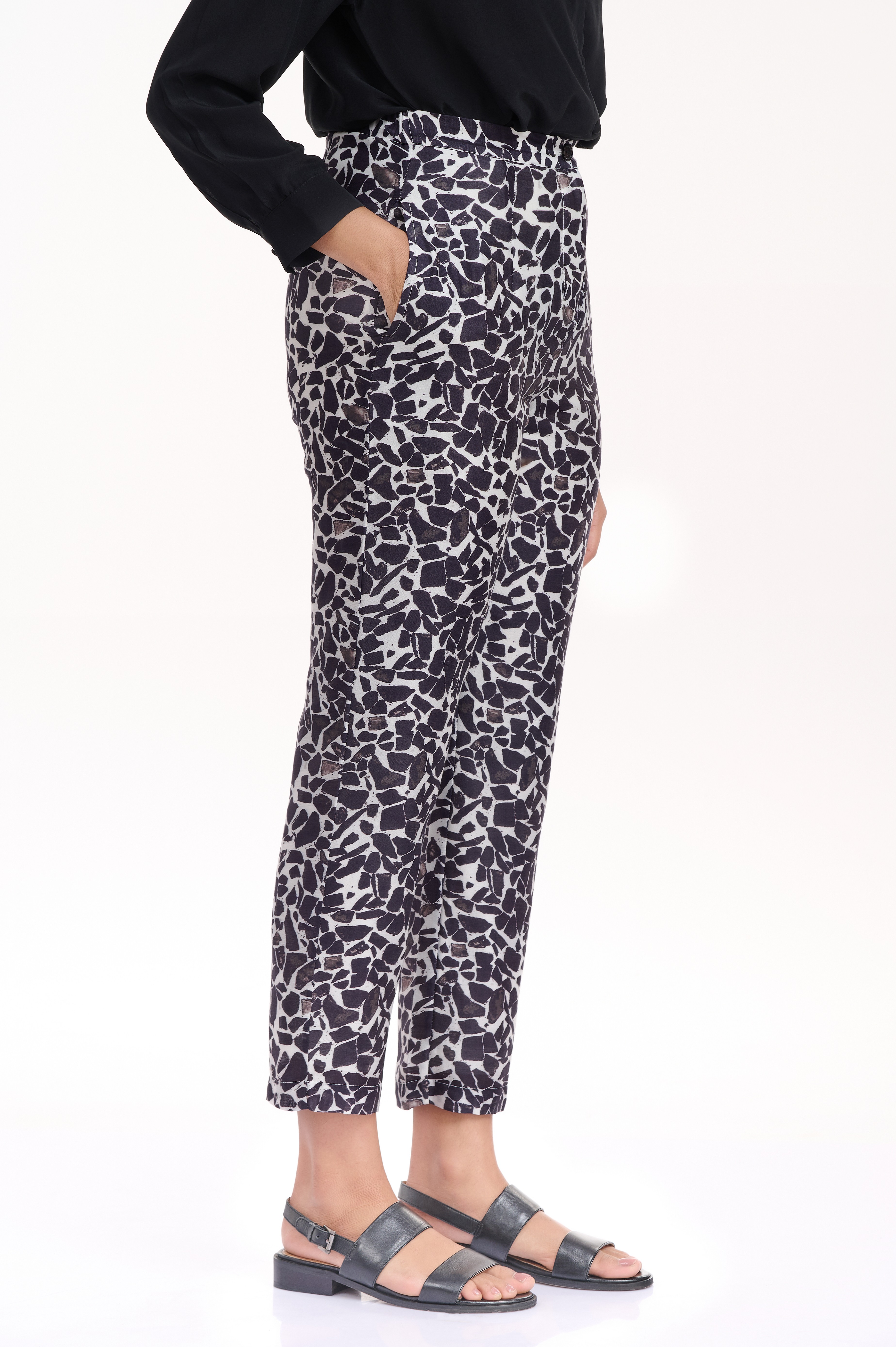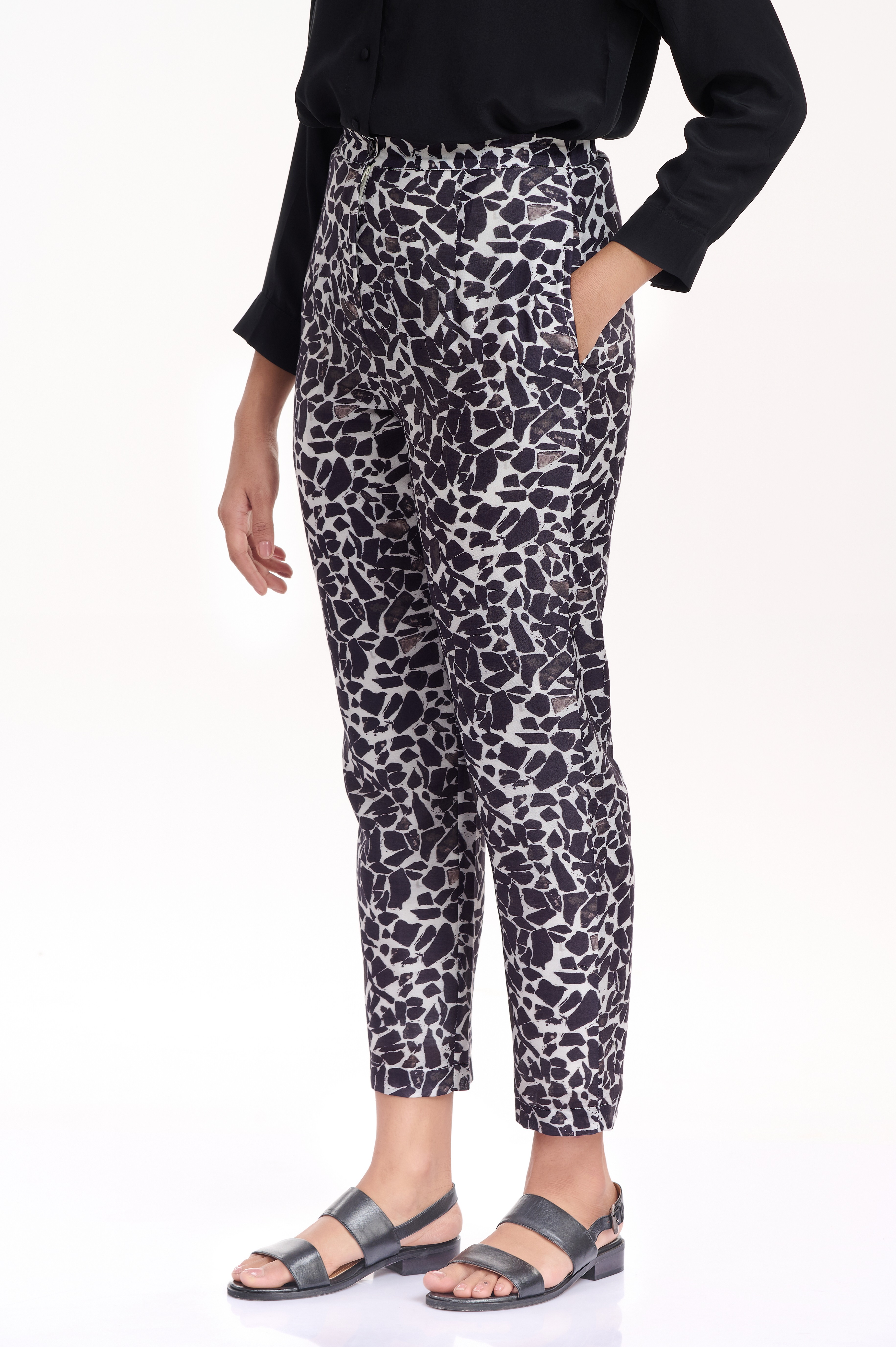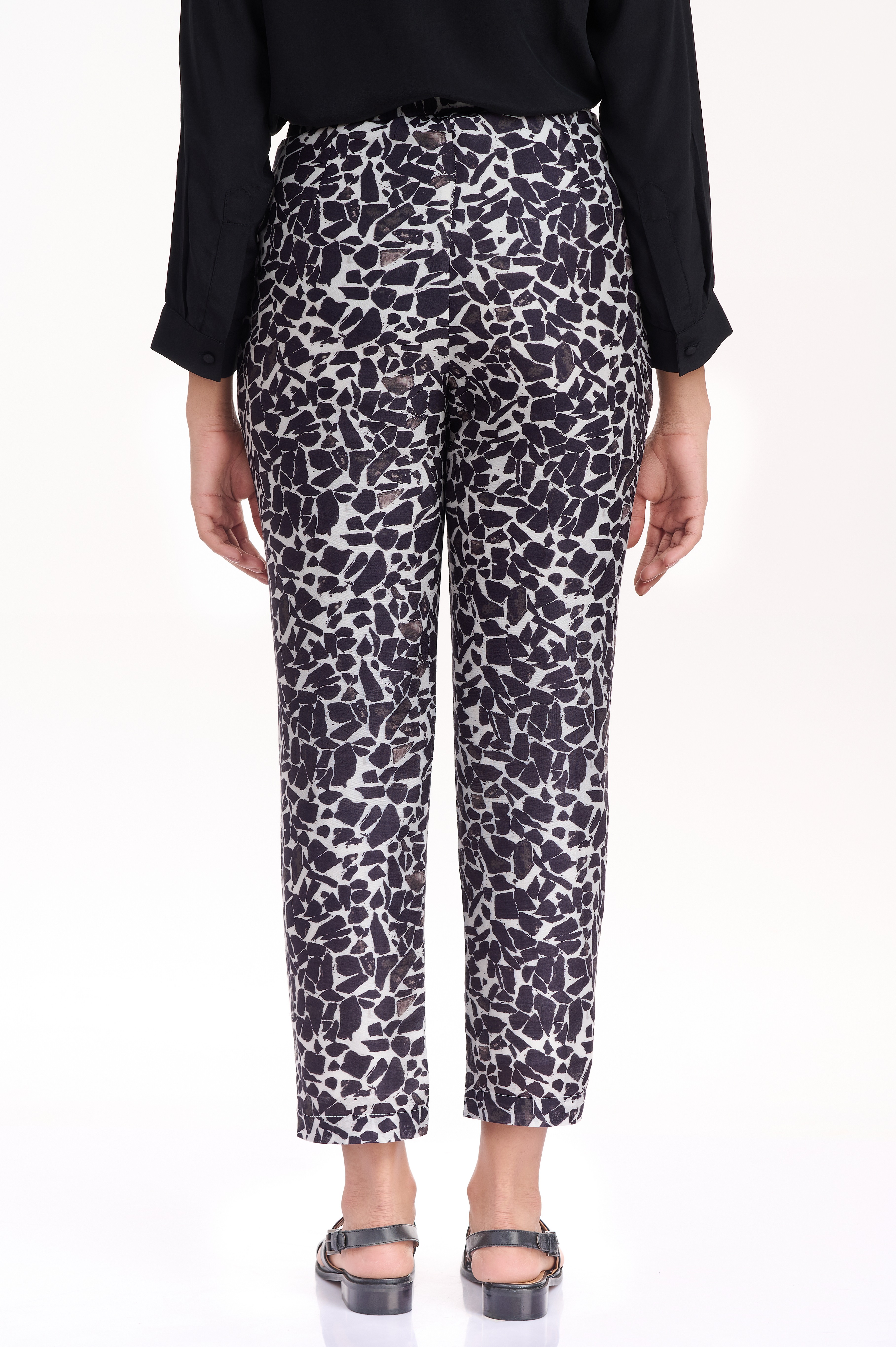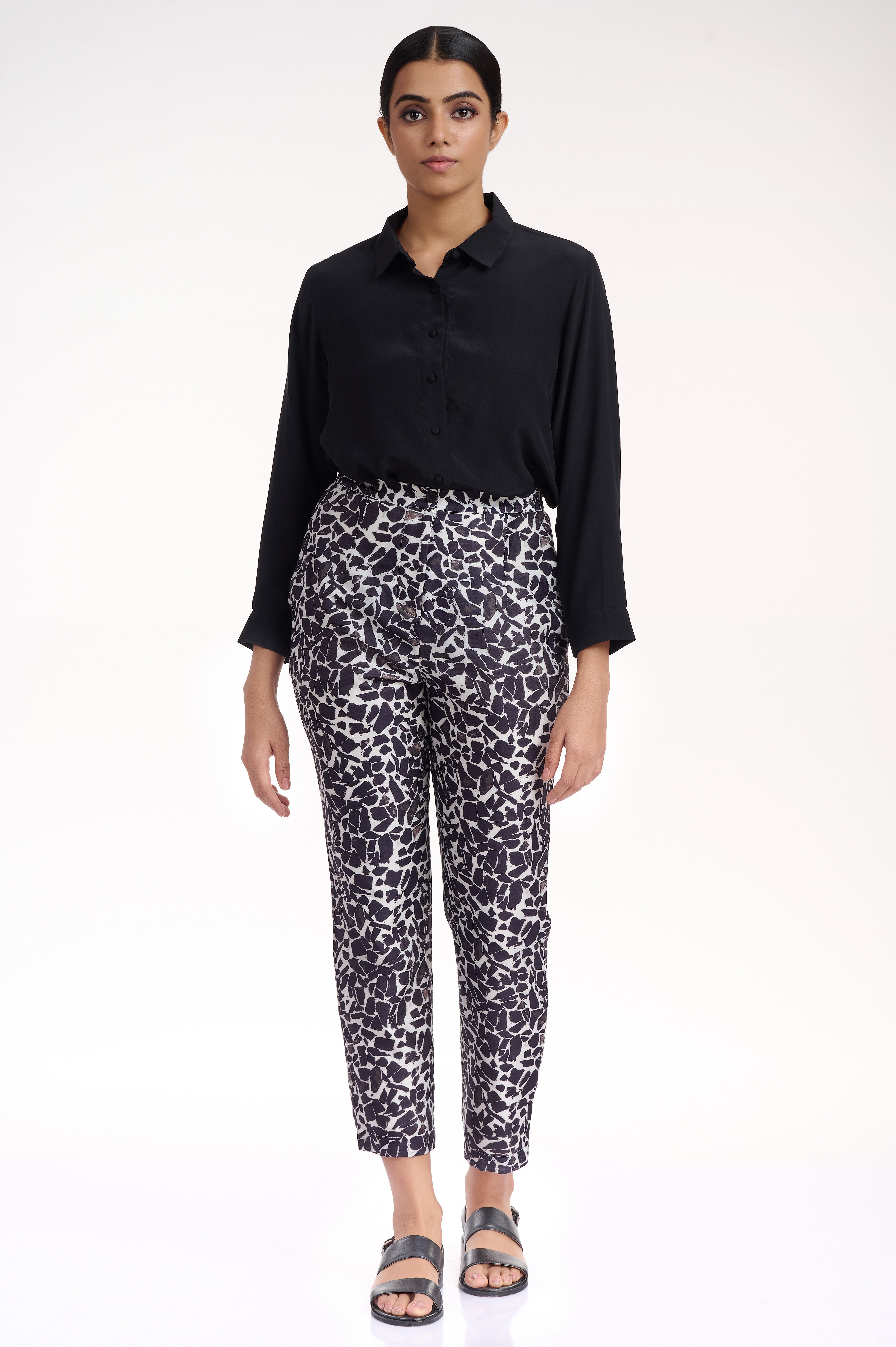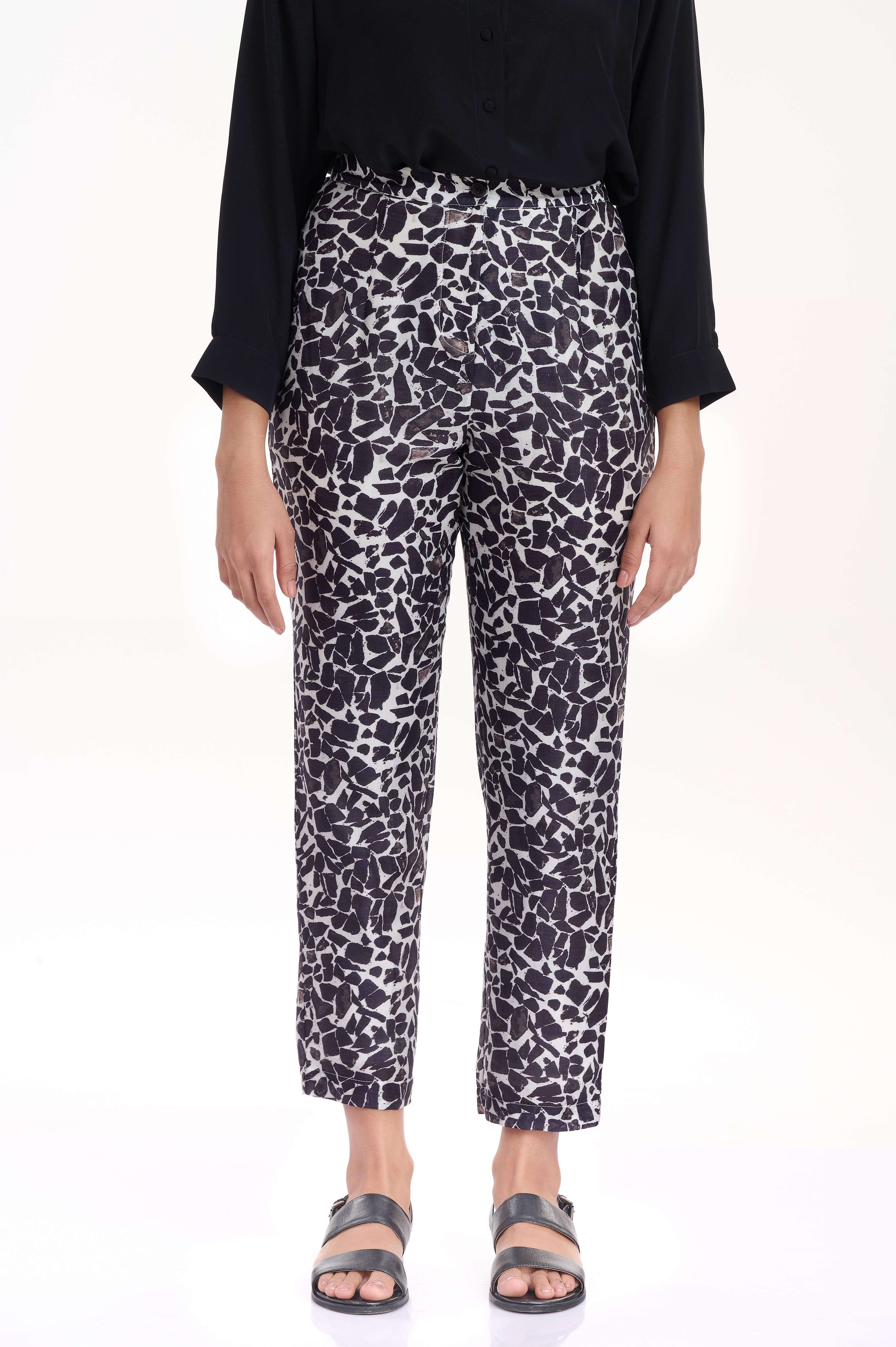 Comfortable and easy fit crafted from silk-cotton with an allover terrazzo print in classic black and white. Team them with an oversized black or white cotton shirt for a chic look.