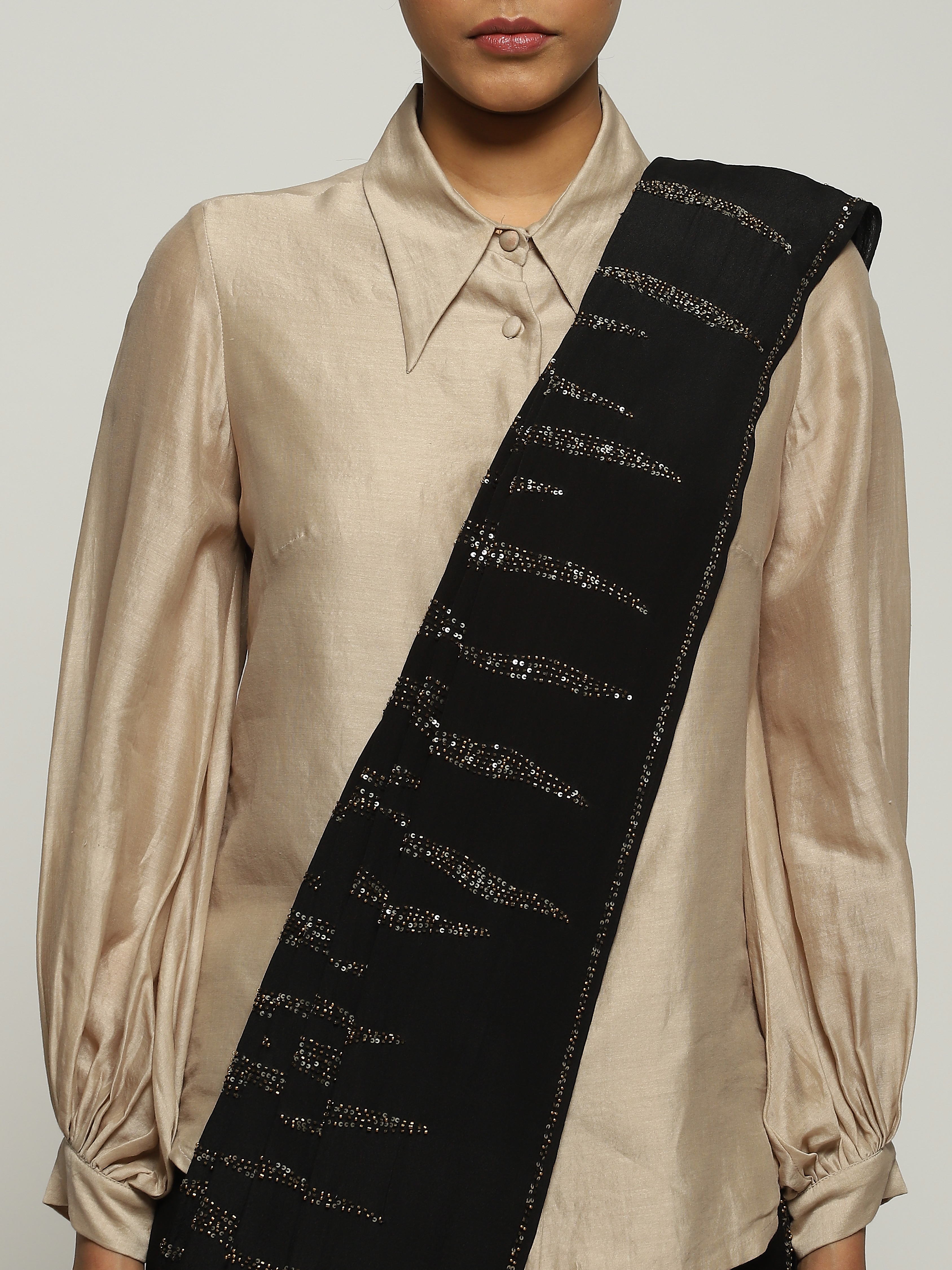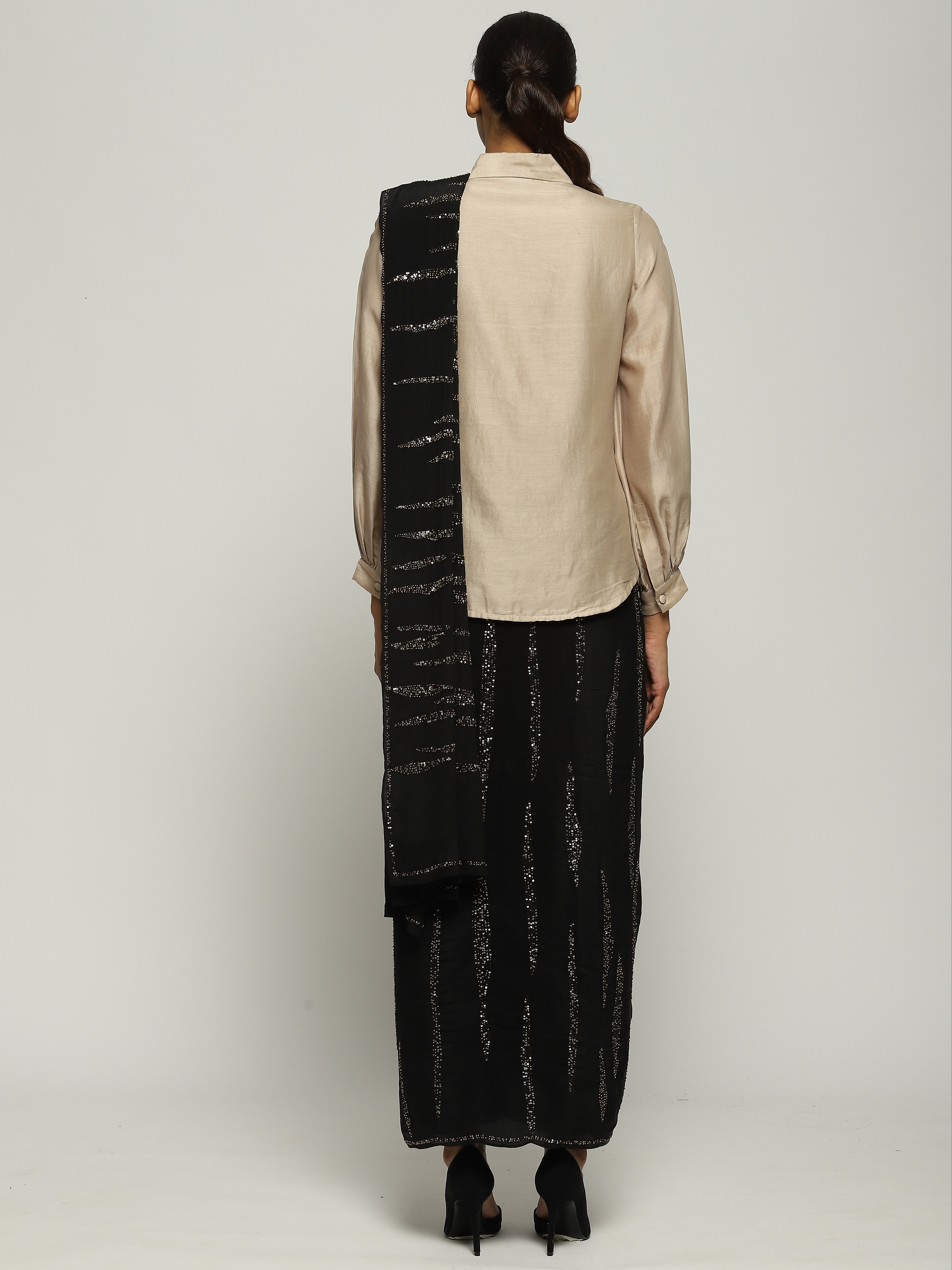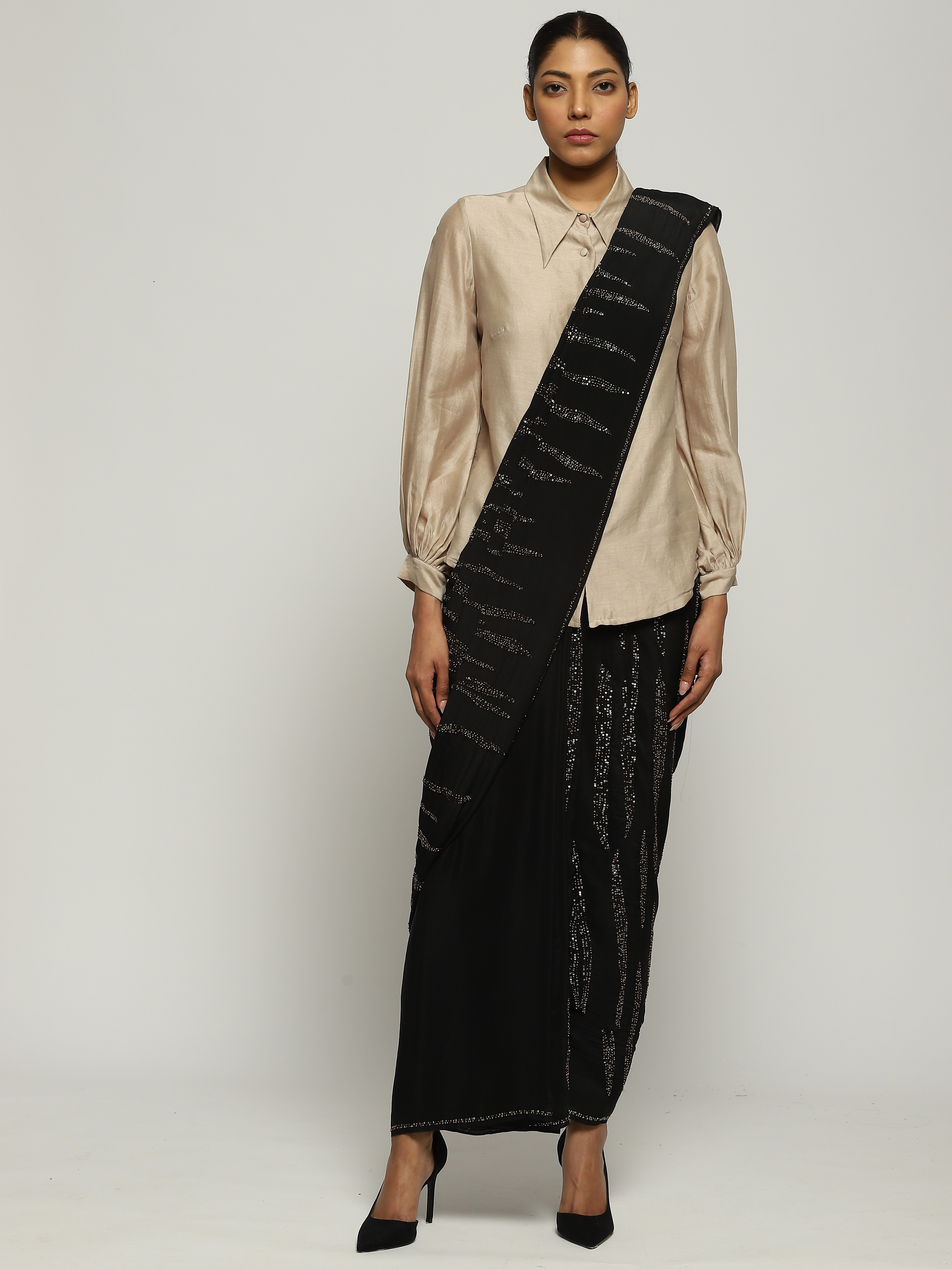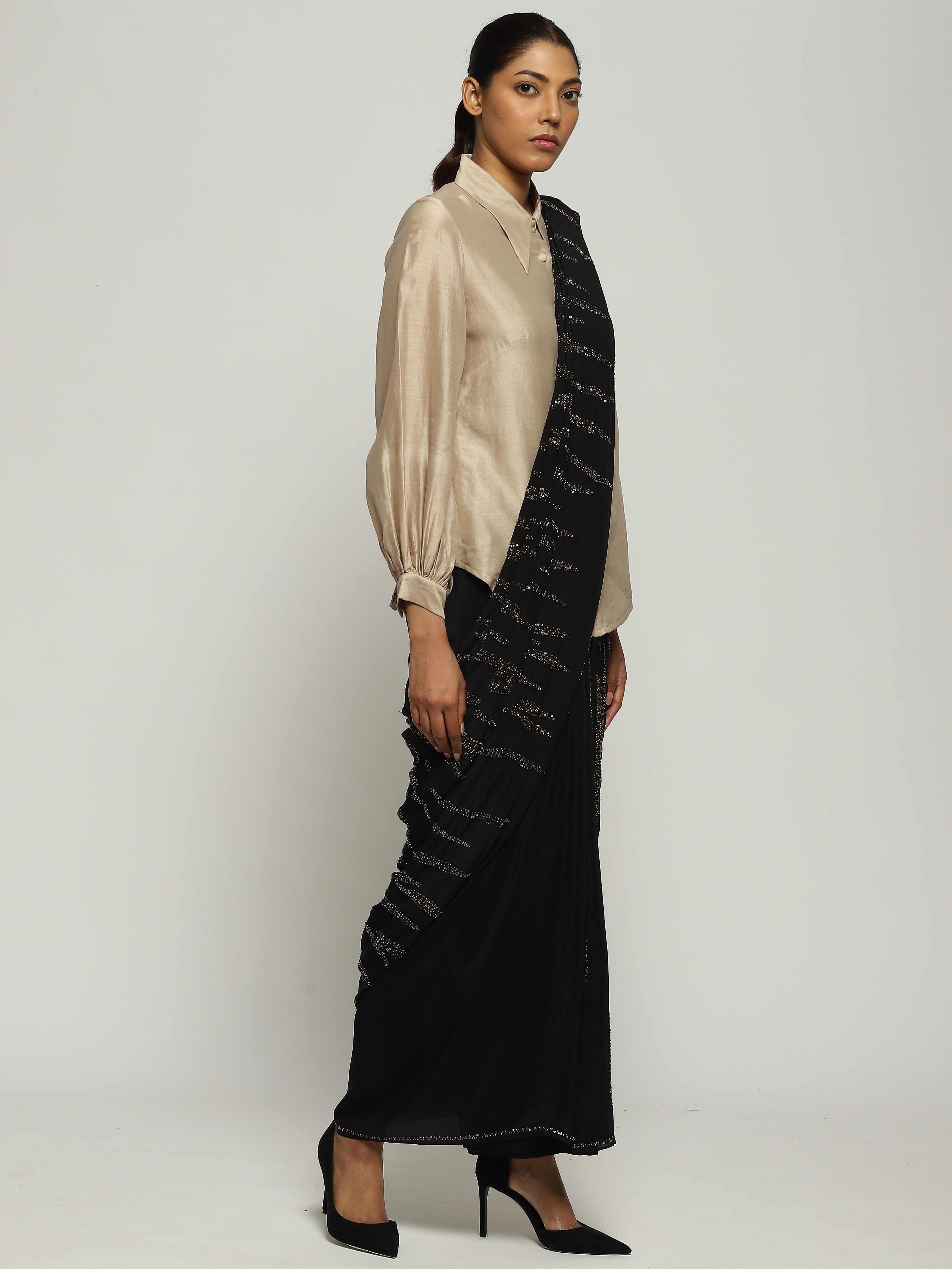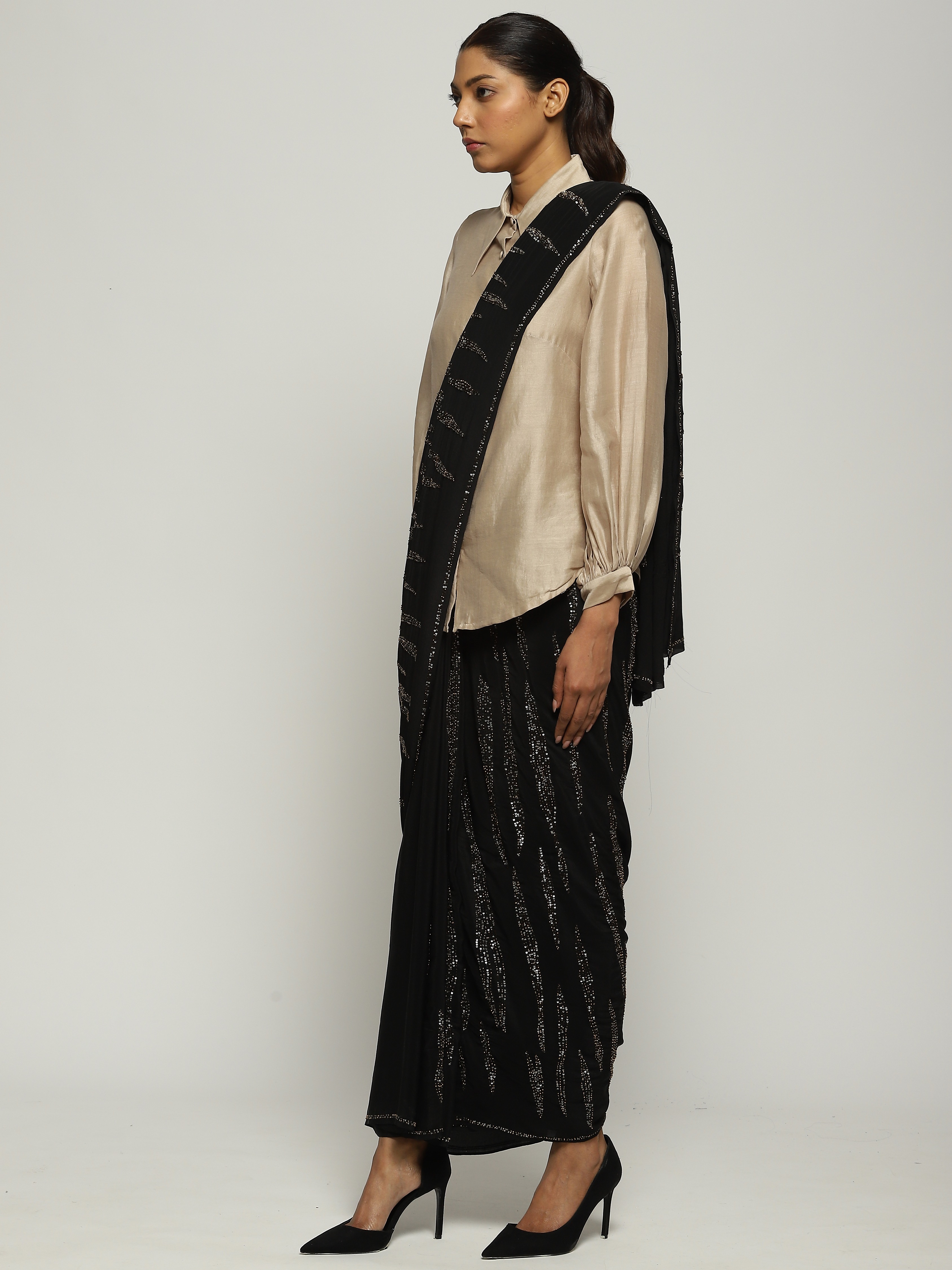 A black saree embellished with gold beads and sequins.