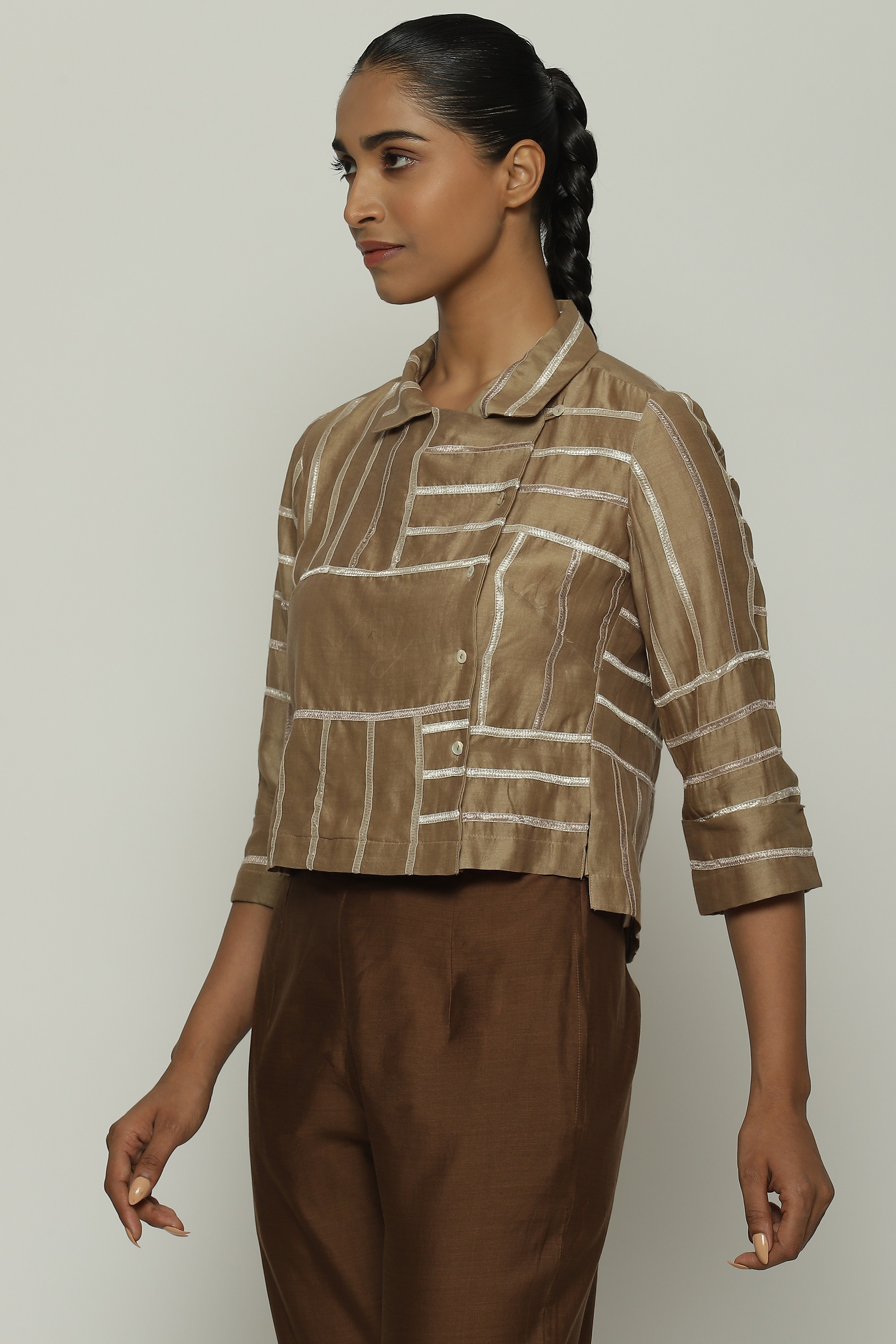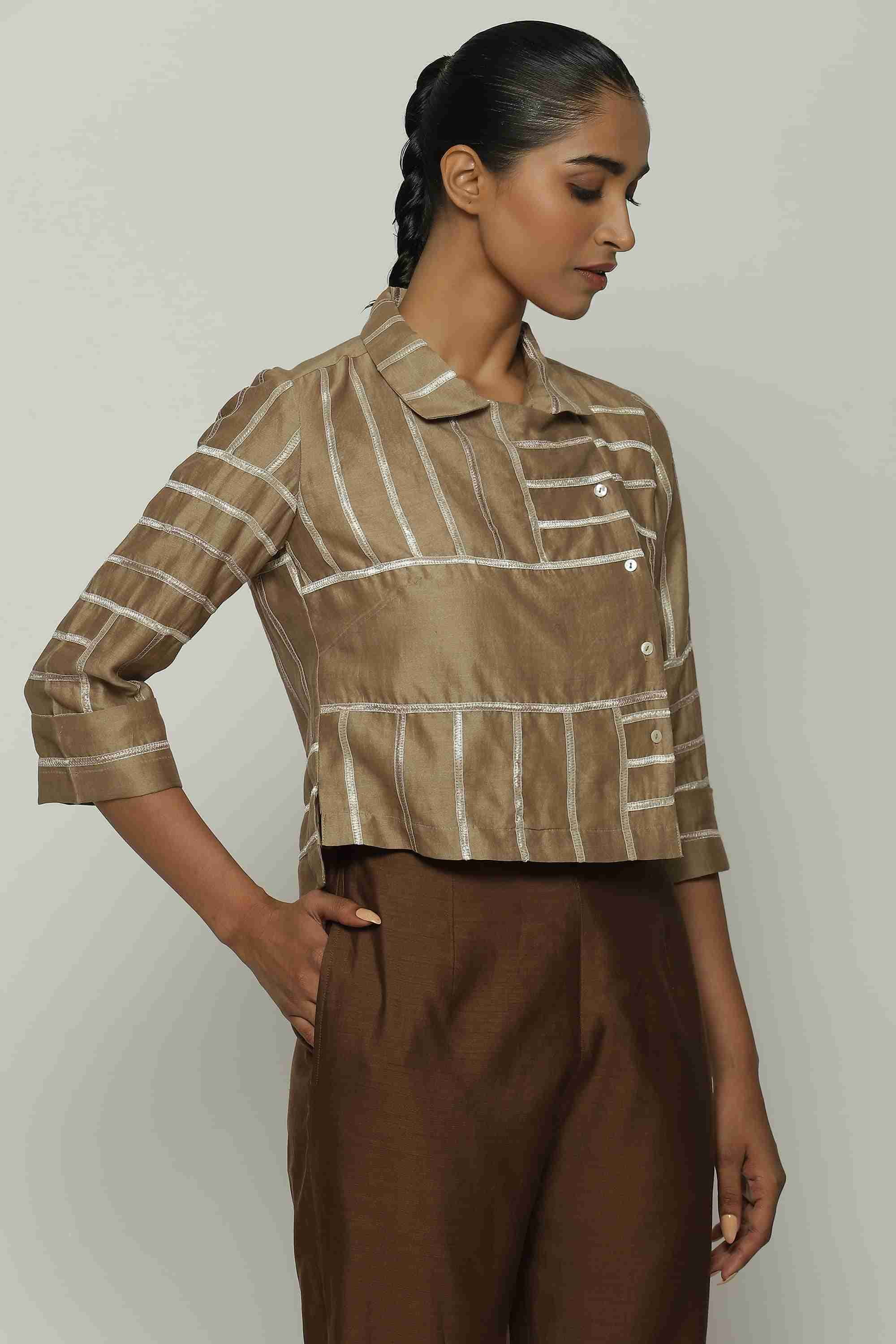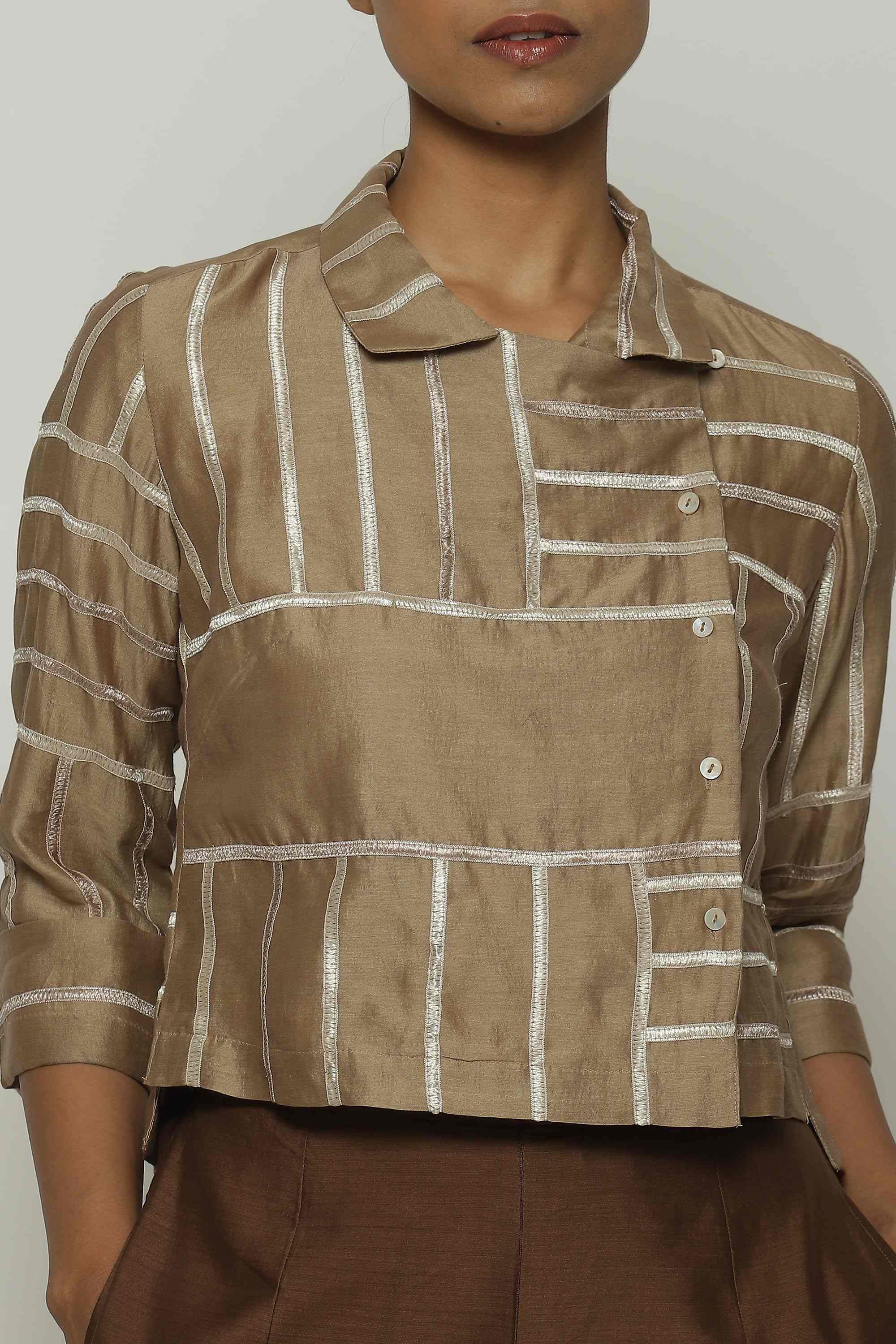 A biscuit-brown shirt in a tonal lace trim.