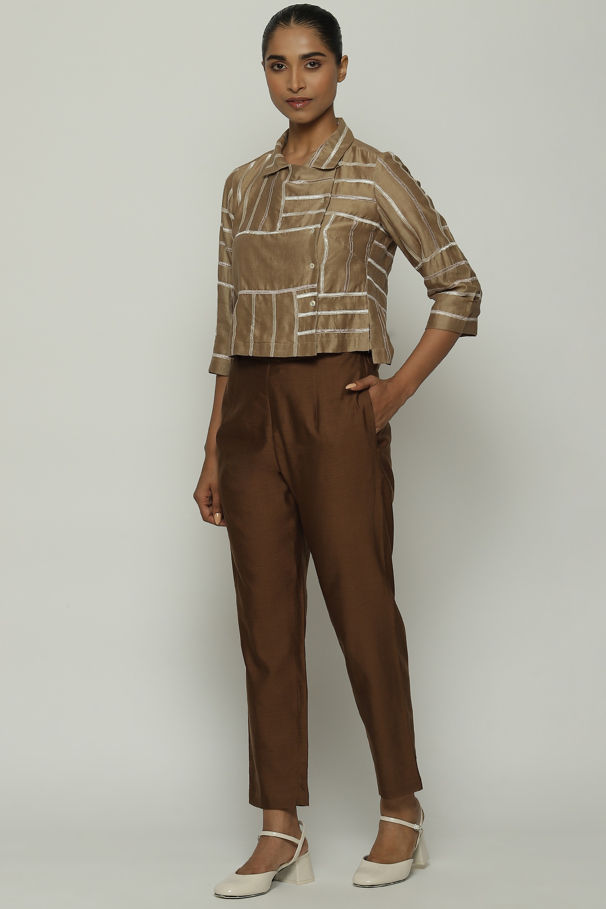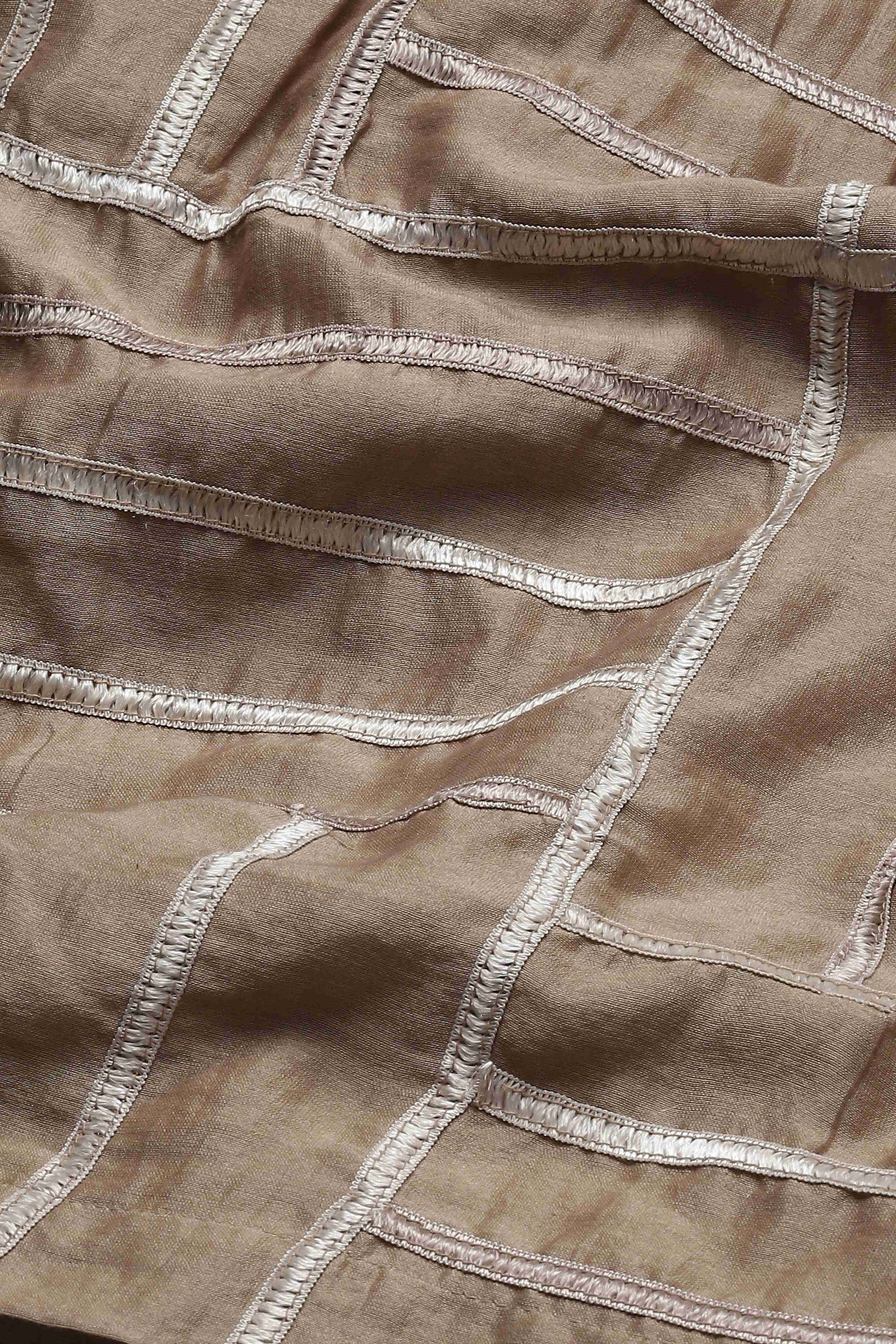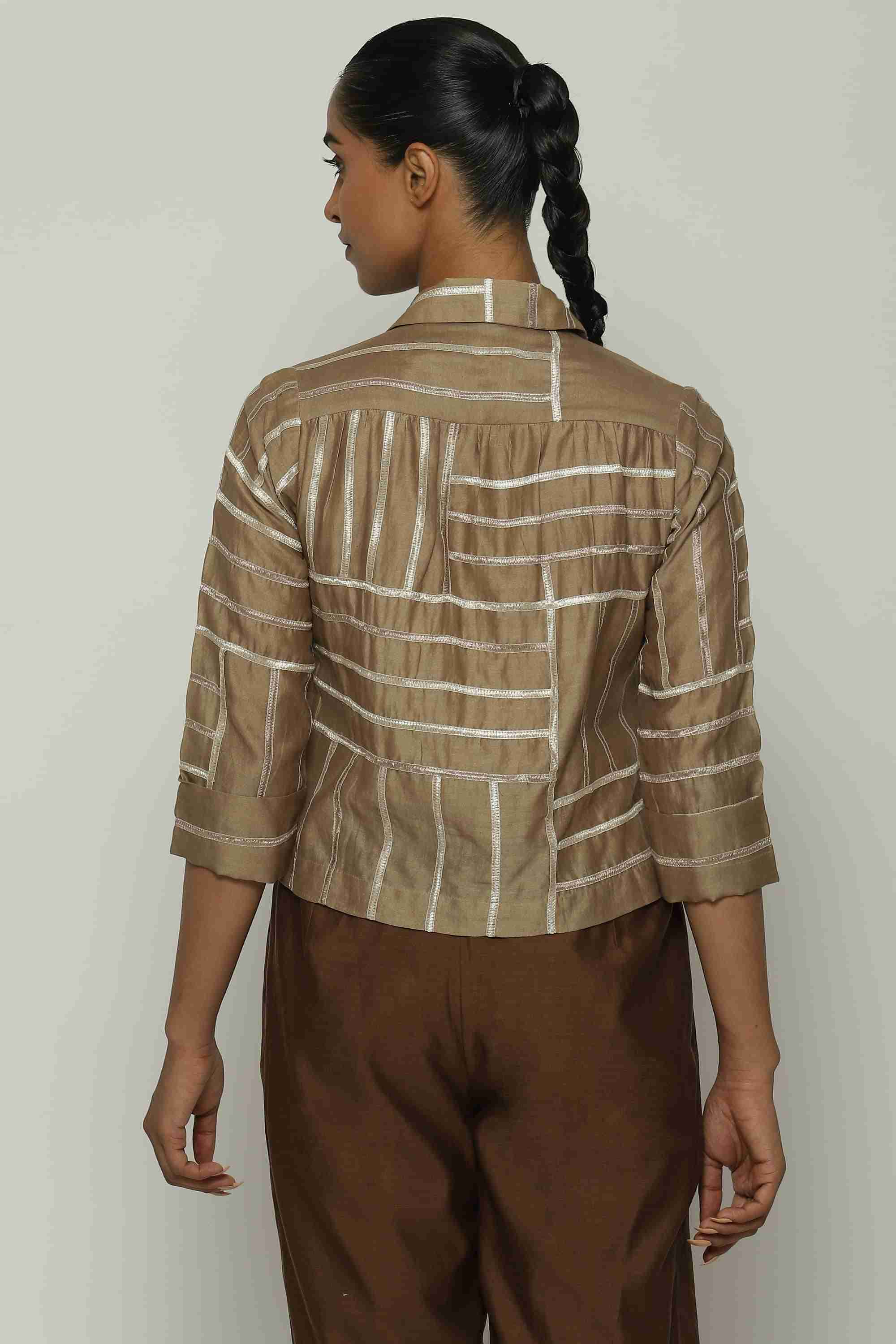 A biscuit-brown shirt in a tonal lace trim.