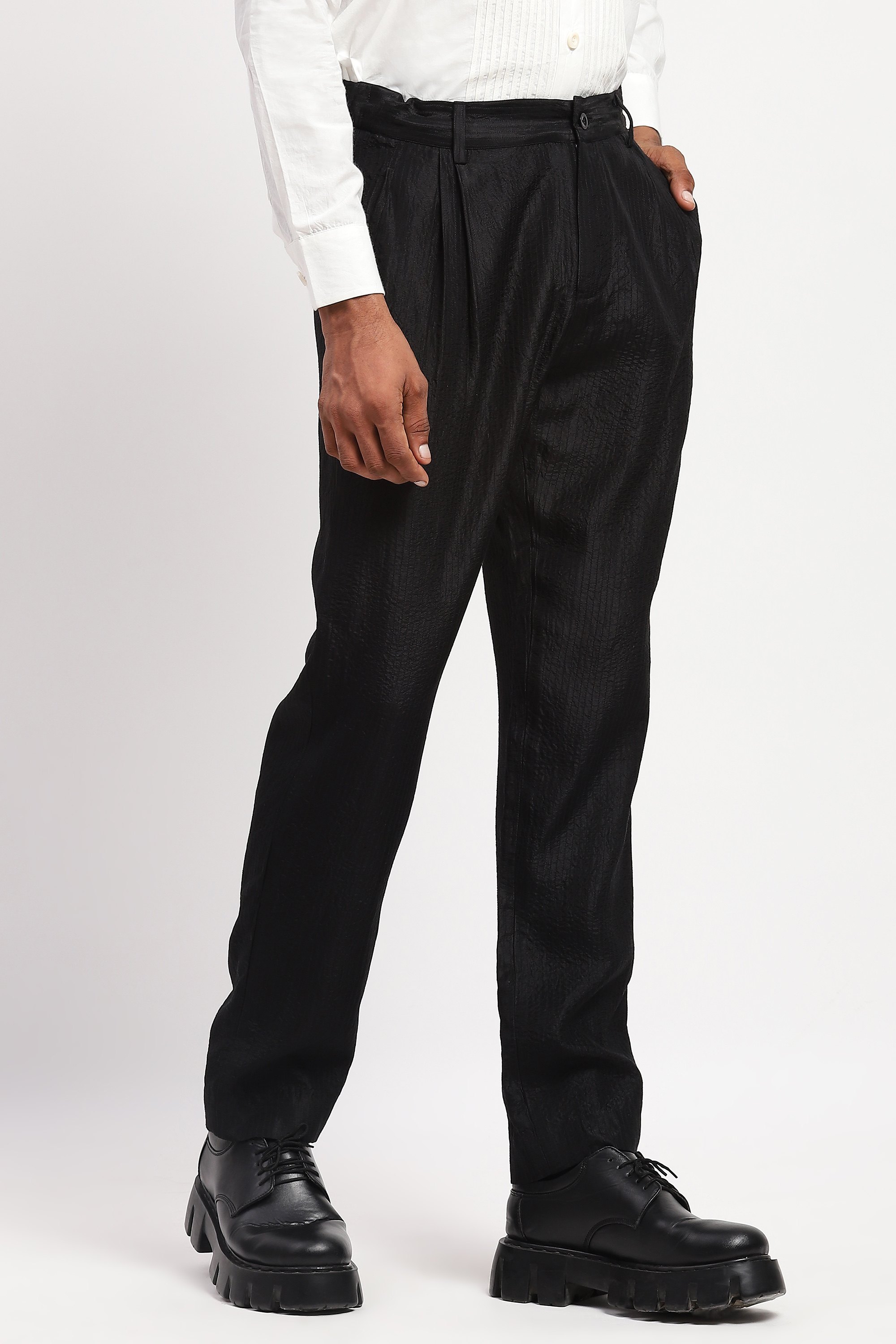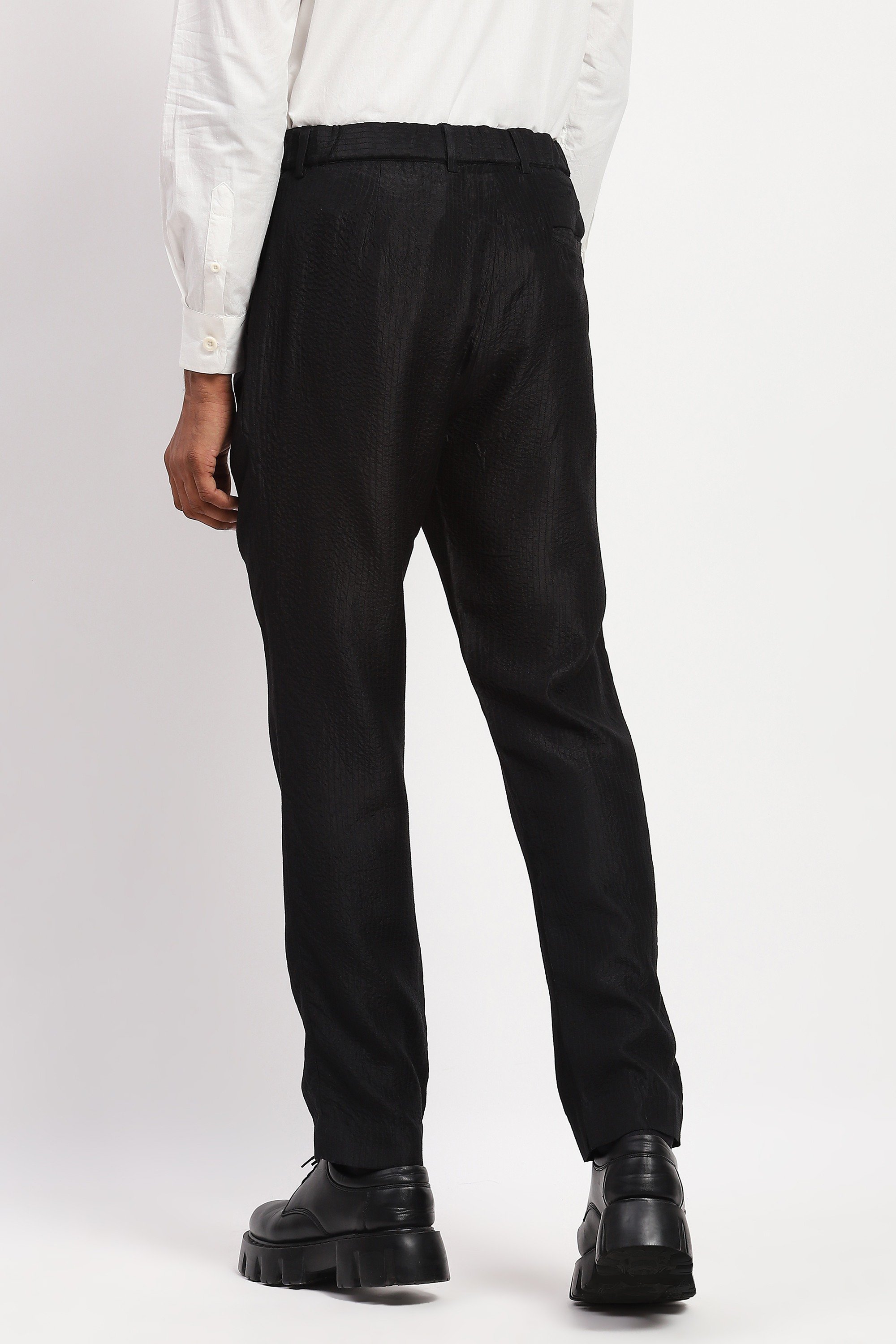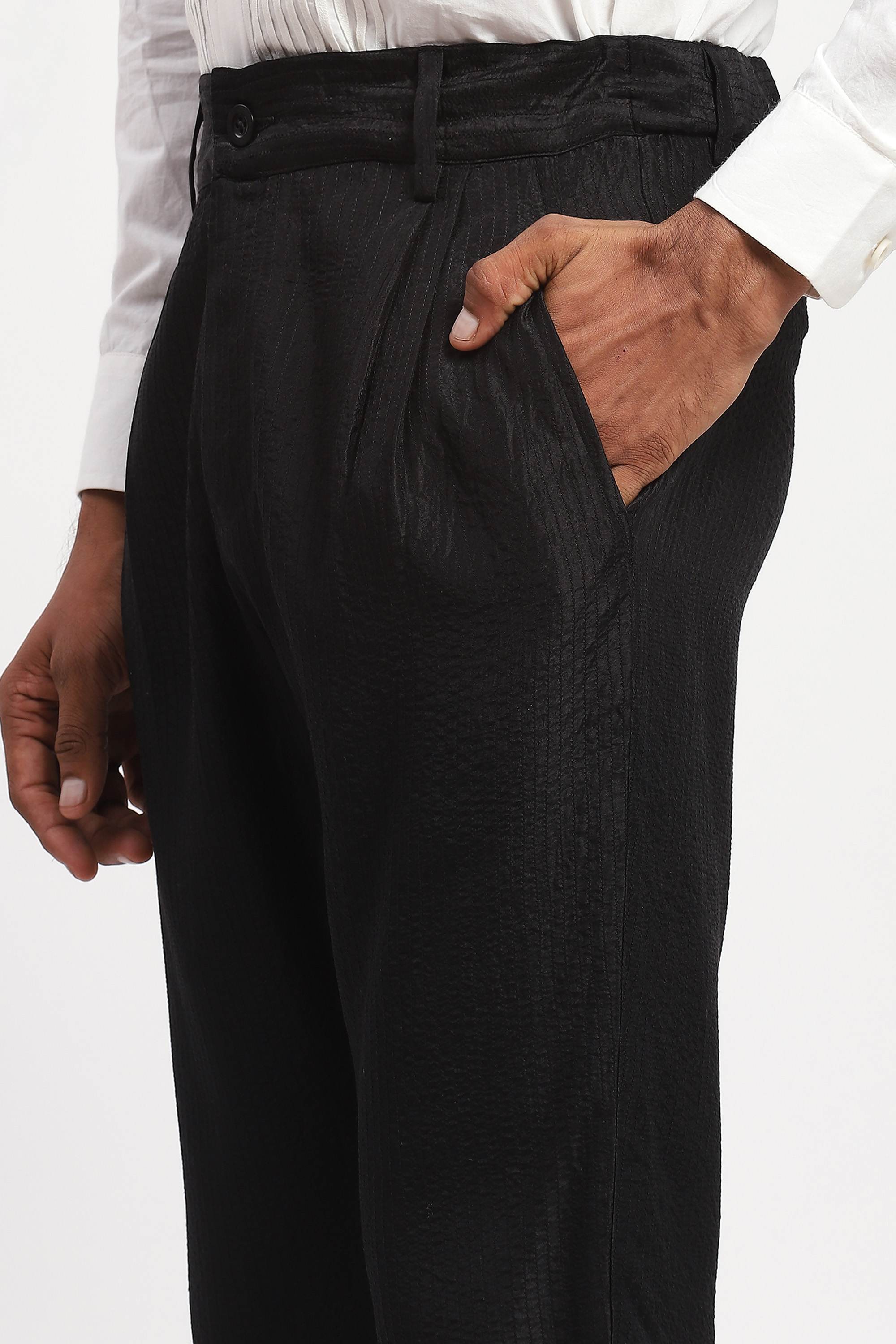 A rapture quilted in silk, this black pair of trousers is embroidered with geometric patterns with tonal threads of zari.