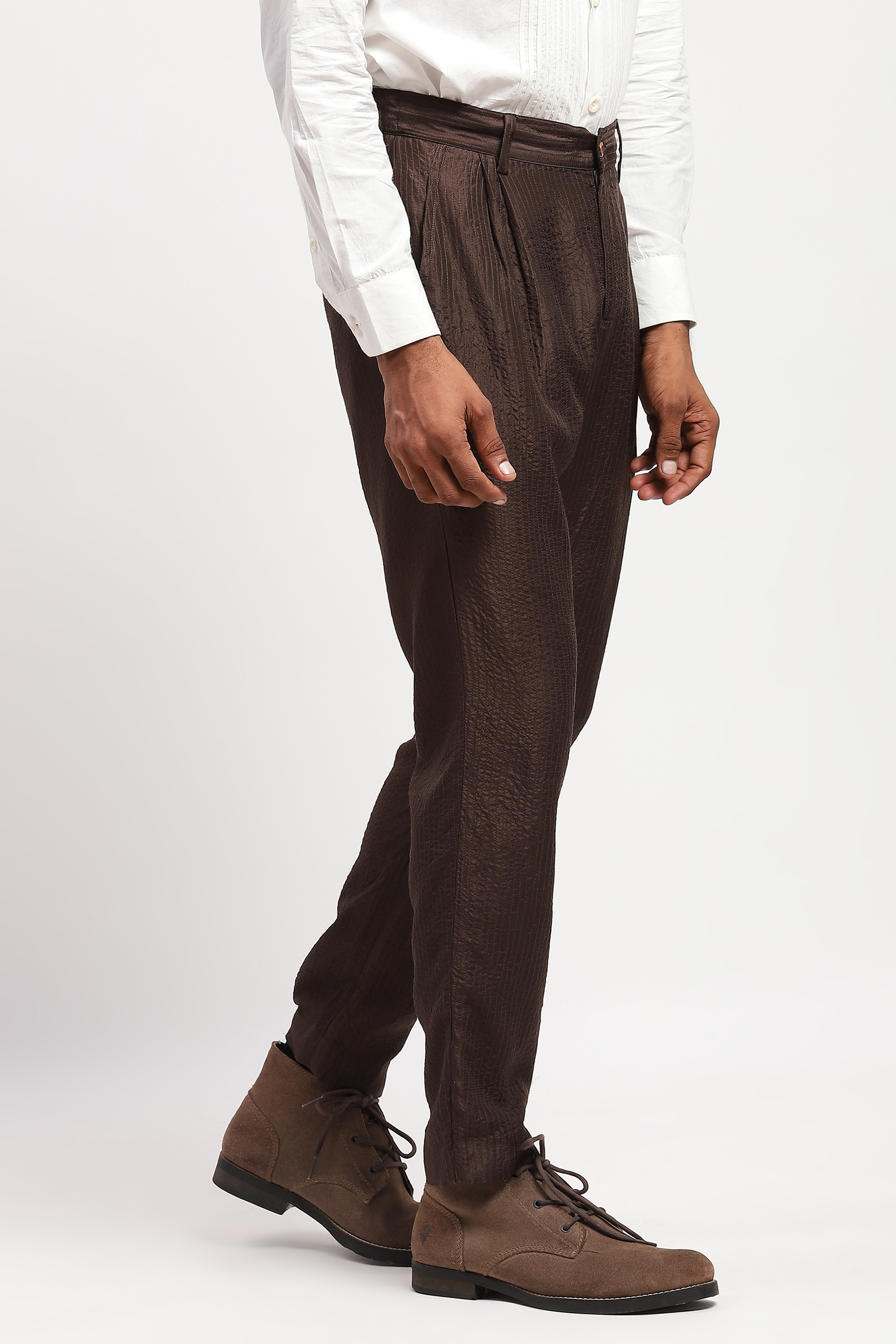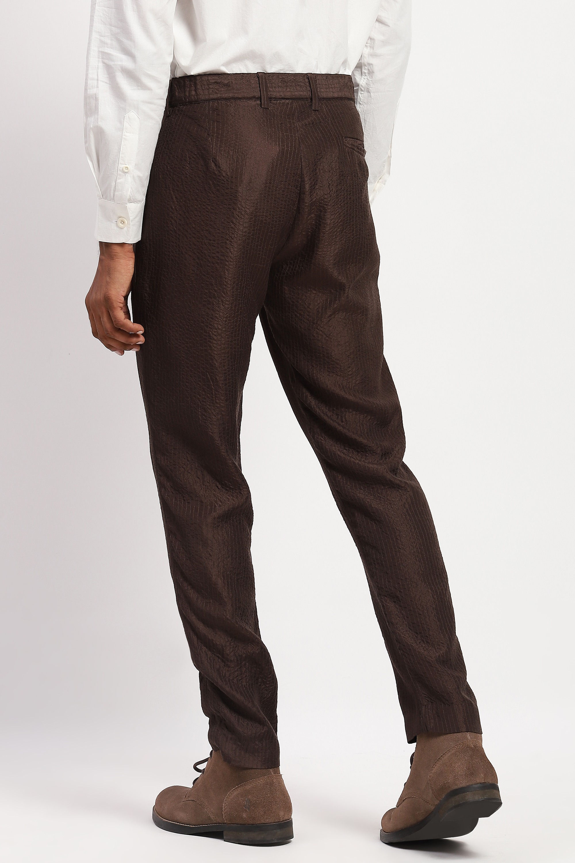 A rapture quilted in silk, this chocolate-hued pair of trousers is embroidered with geometric patterns with tonal threads of zari.