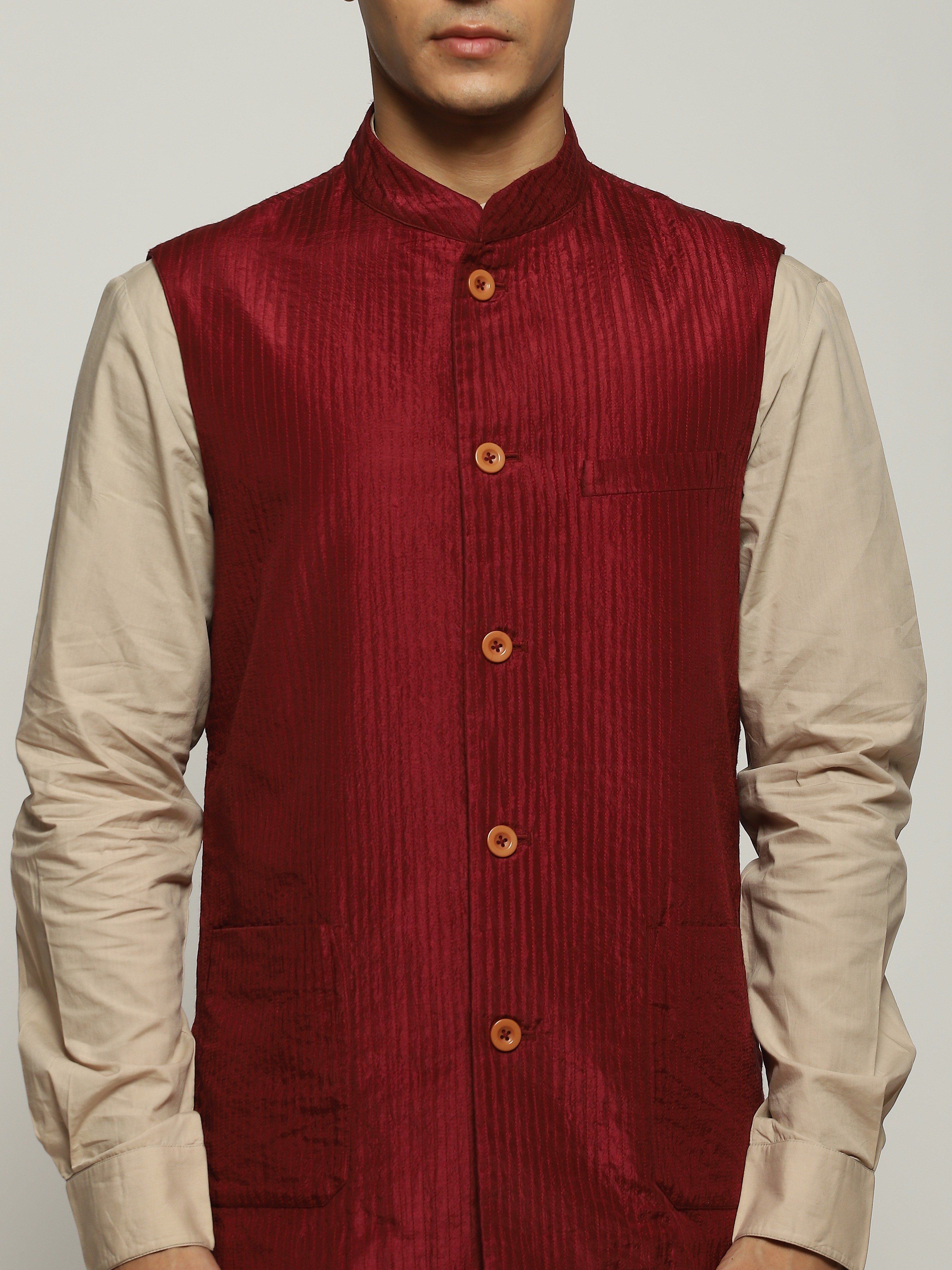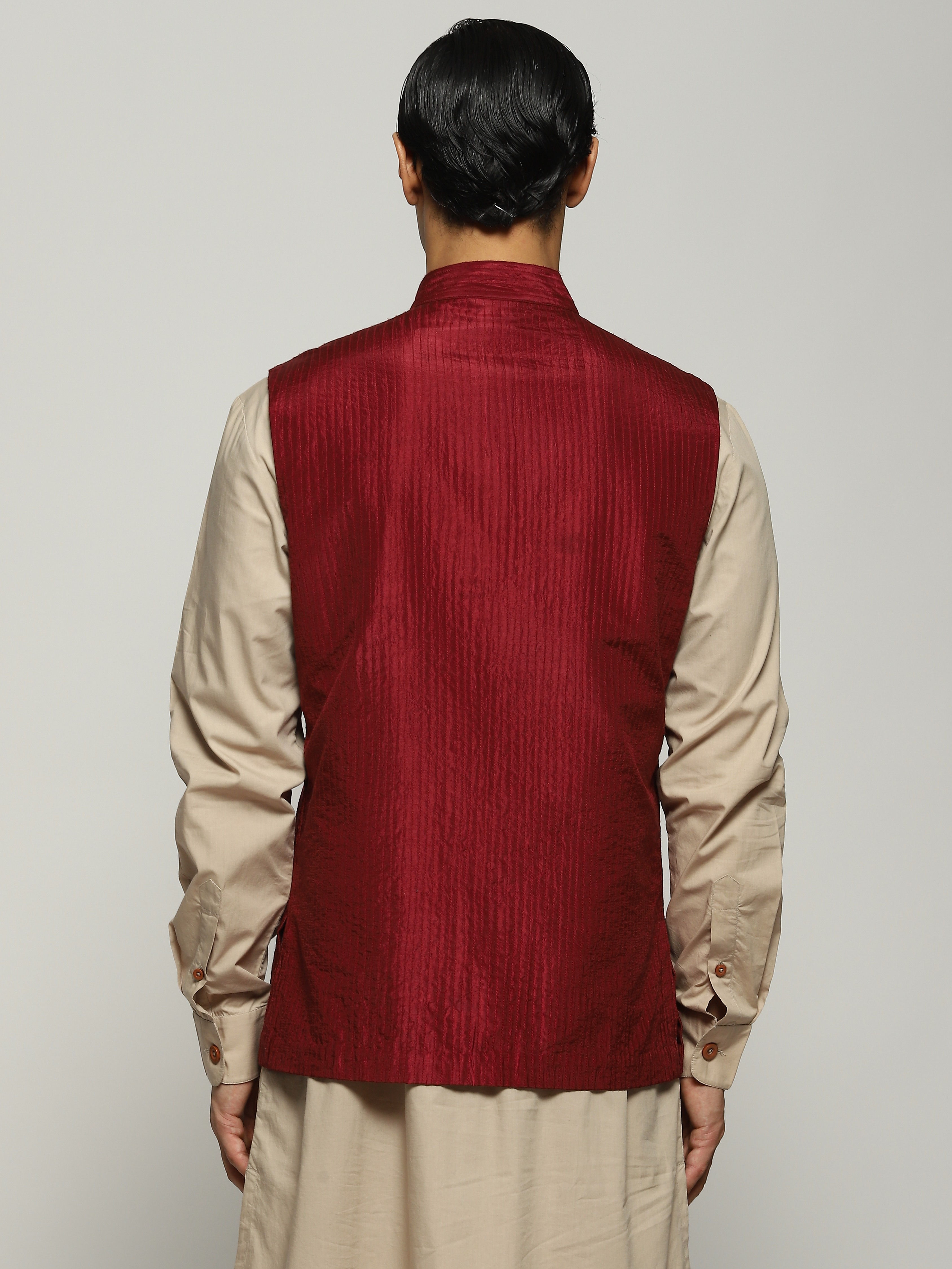 Crafted in a diaphanous tabby silk, this piece is extremely soft and drapes like water. Embroidered in the Trapunto technique, this bundi features running stitches of silk yarn through its entire length.