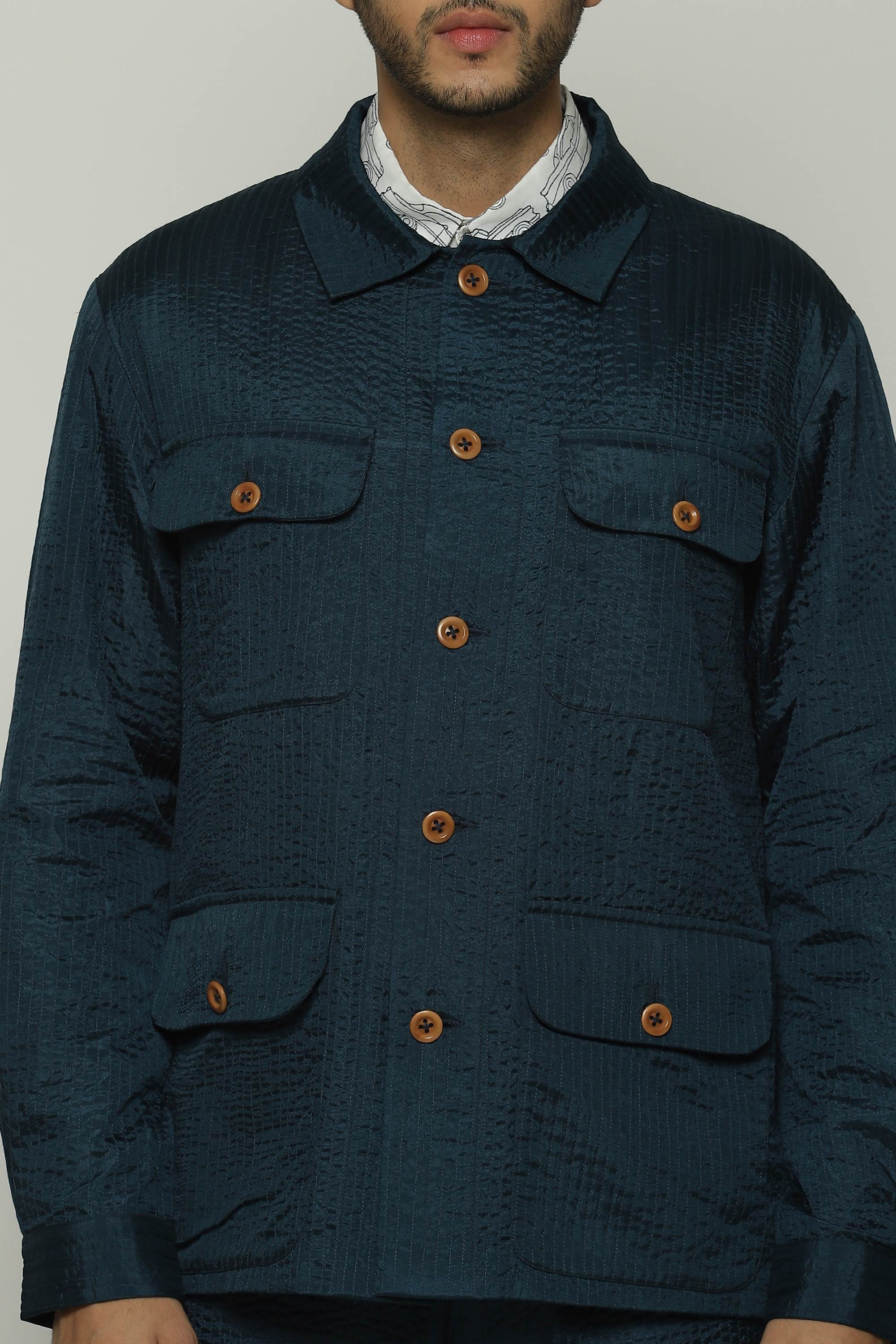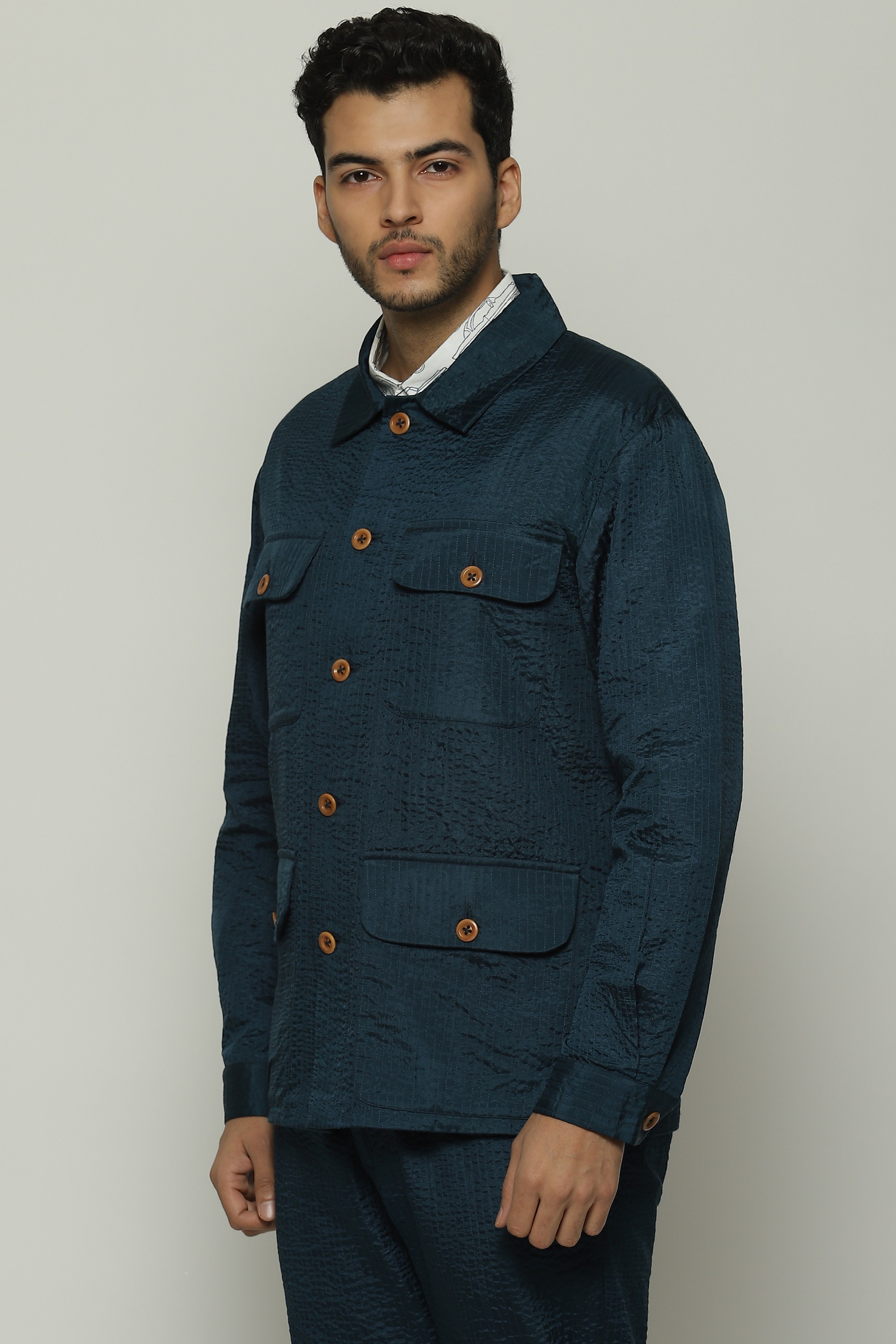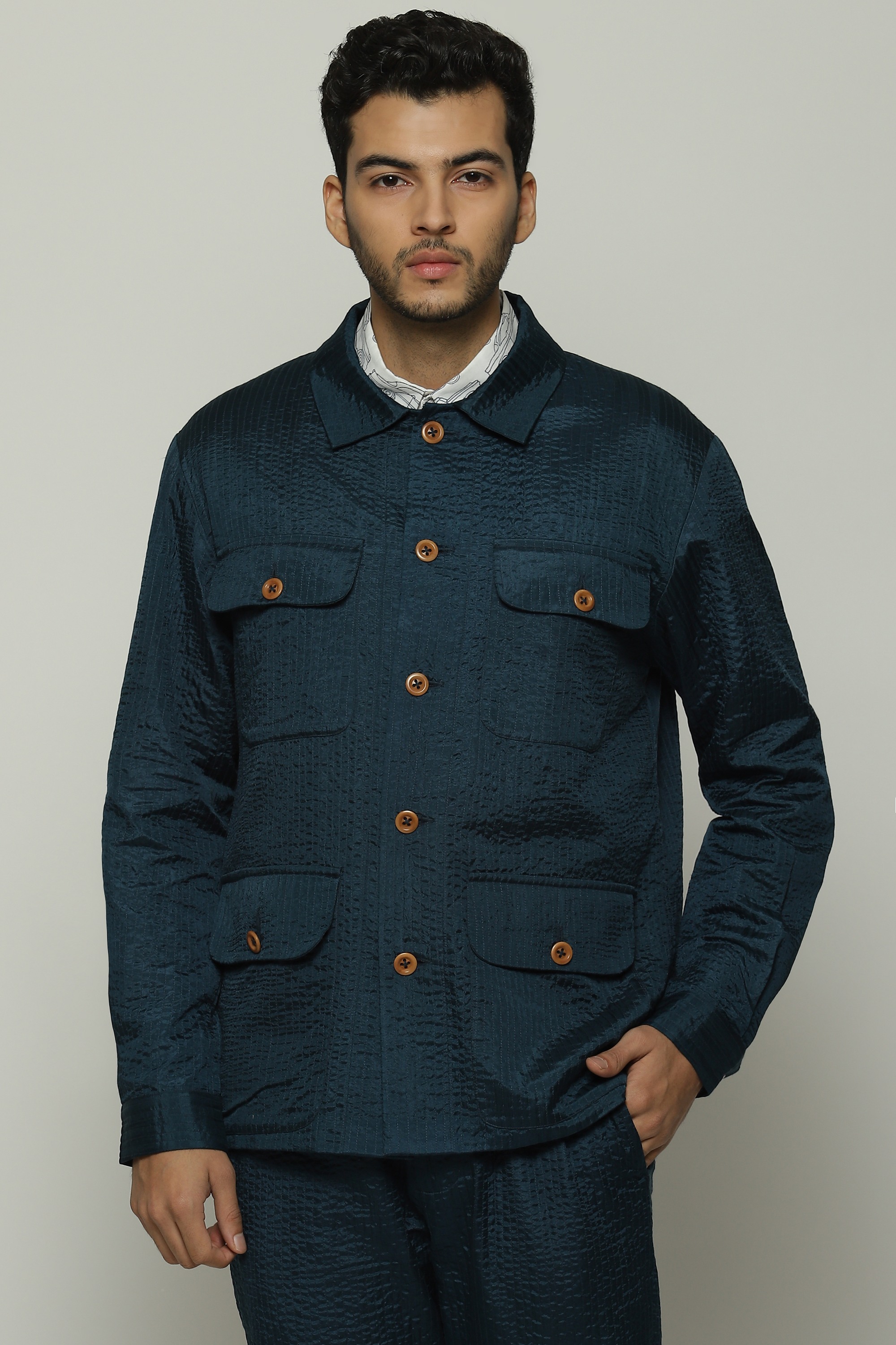 Crafted in a diaphanous tabby silk, this piece is extremely soft and drapes like water. Embroidered in the Trapunto technique, this jacket features running stitches of silk yarn through its entire length.