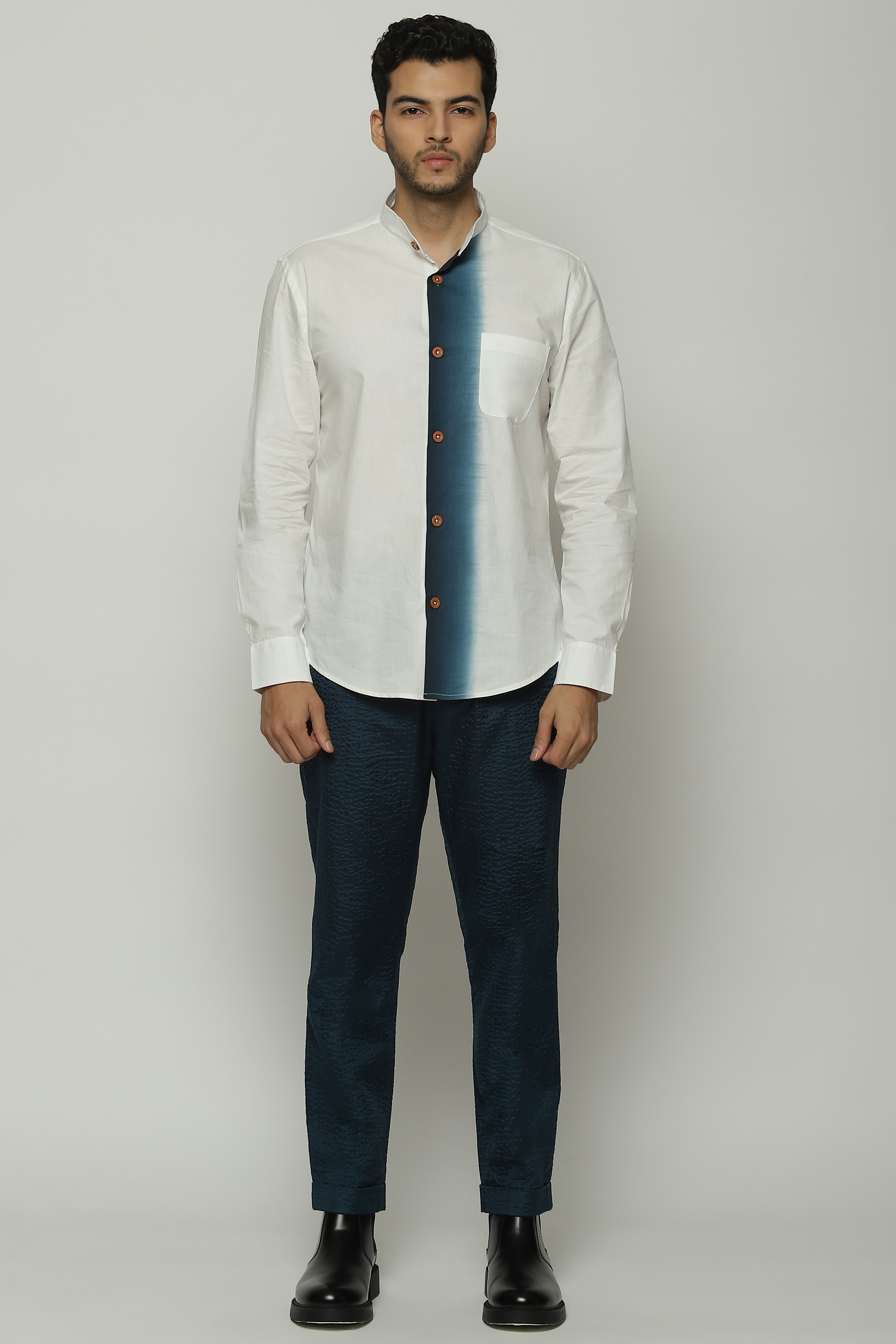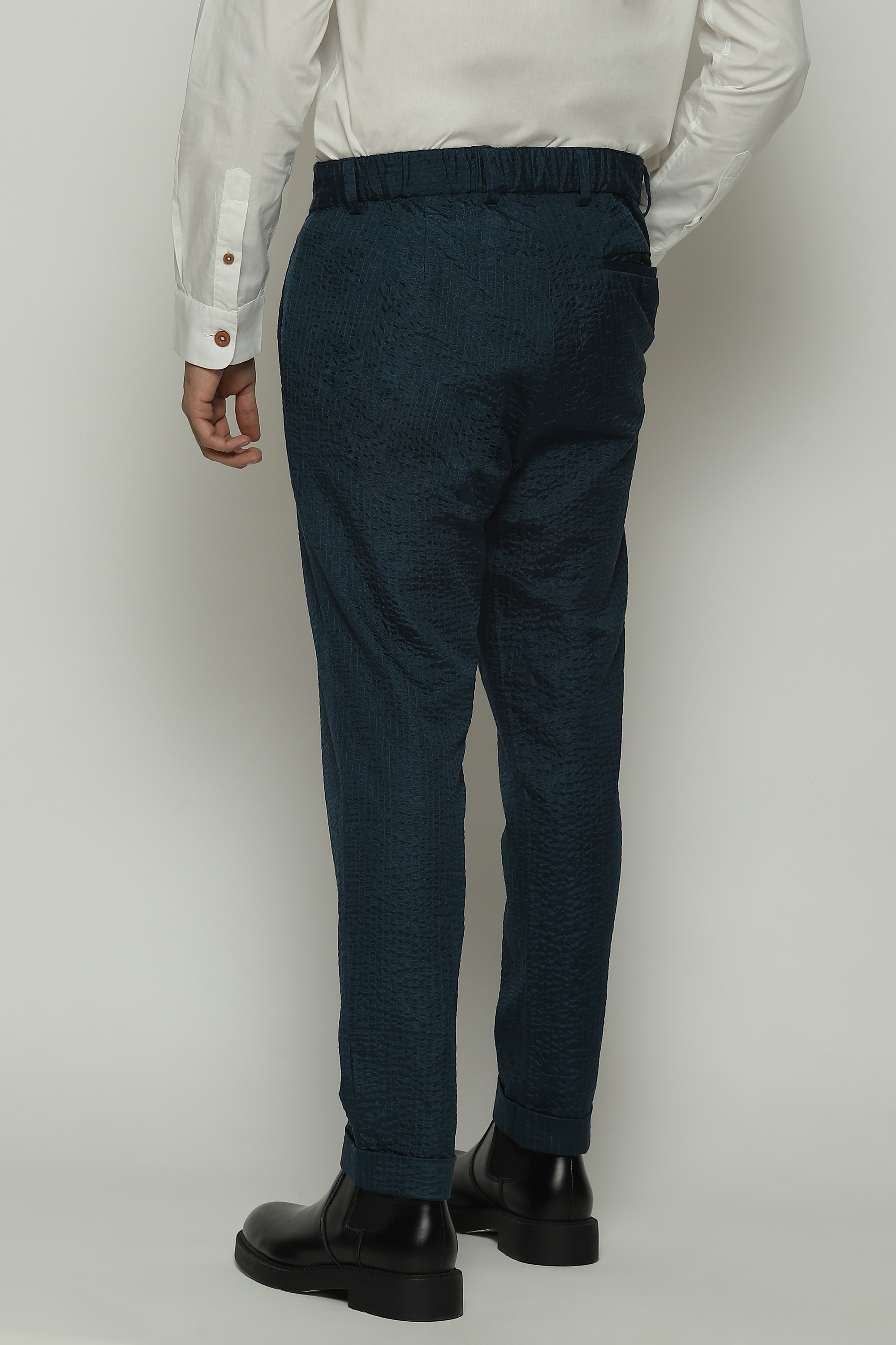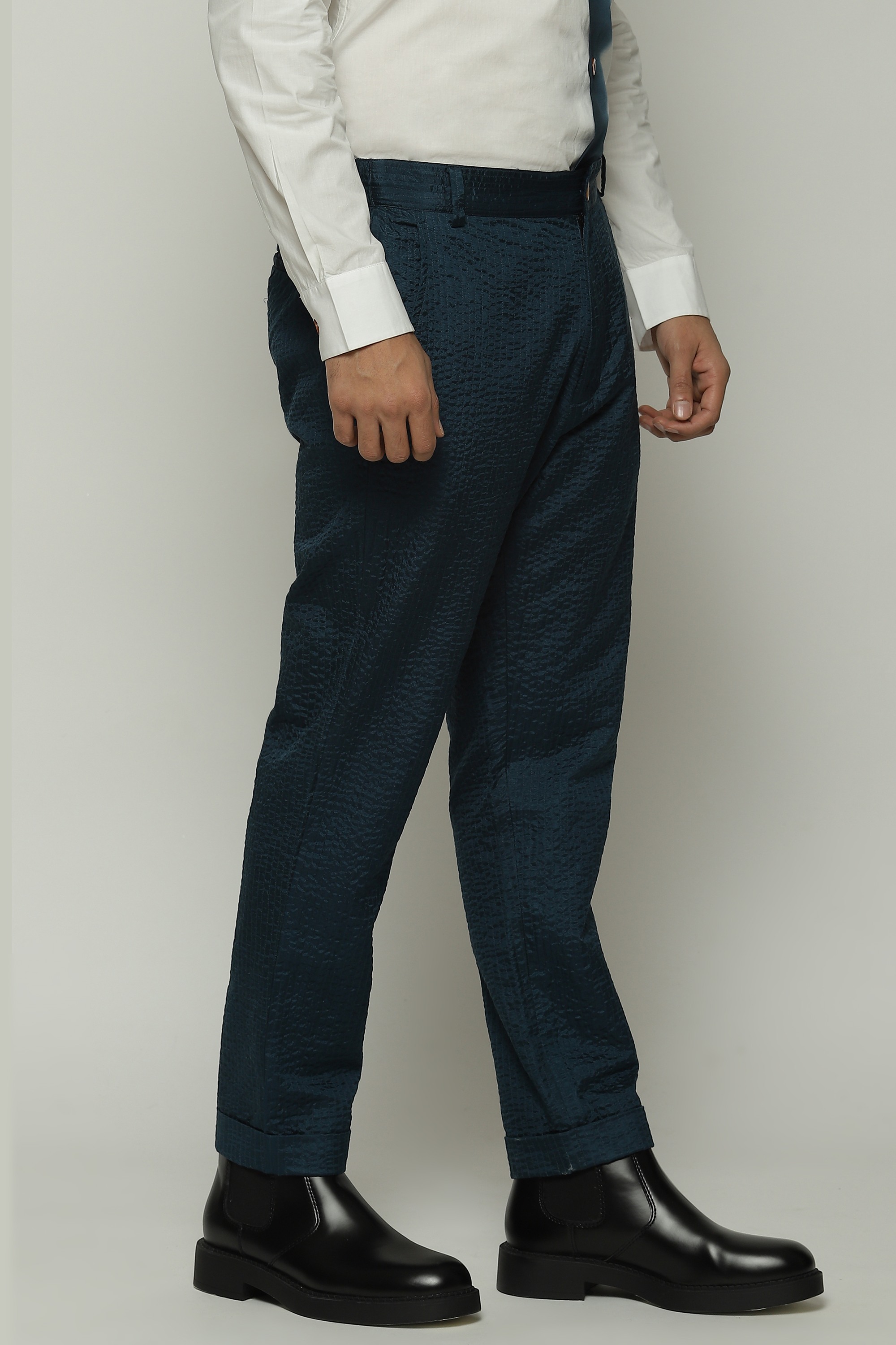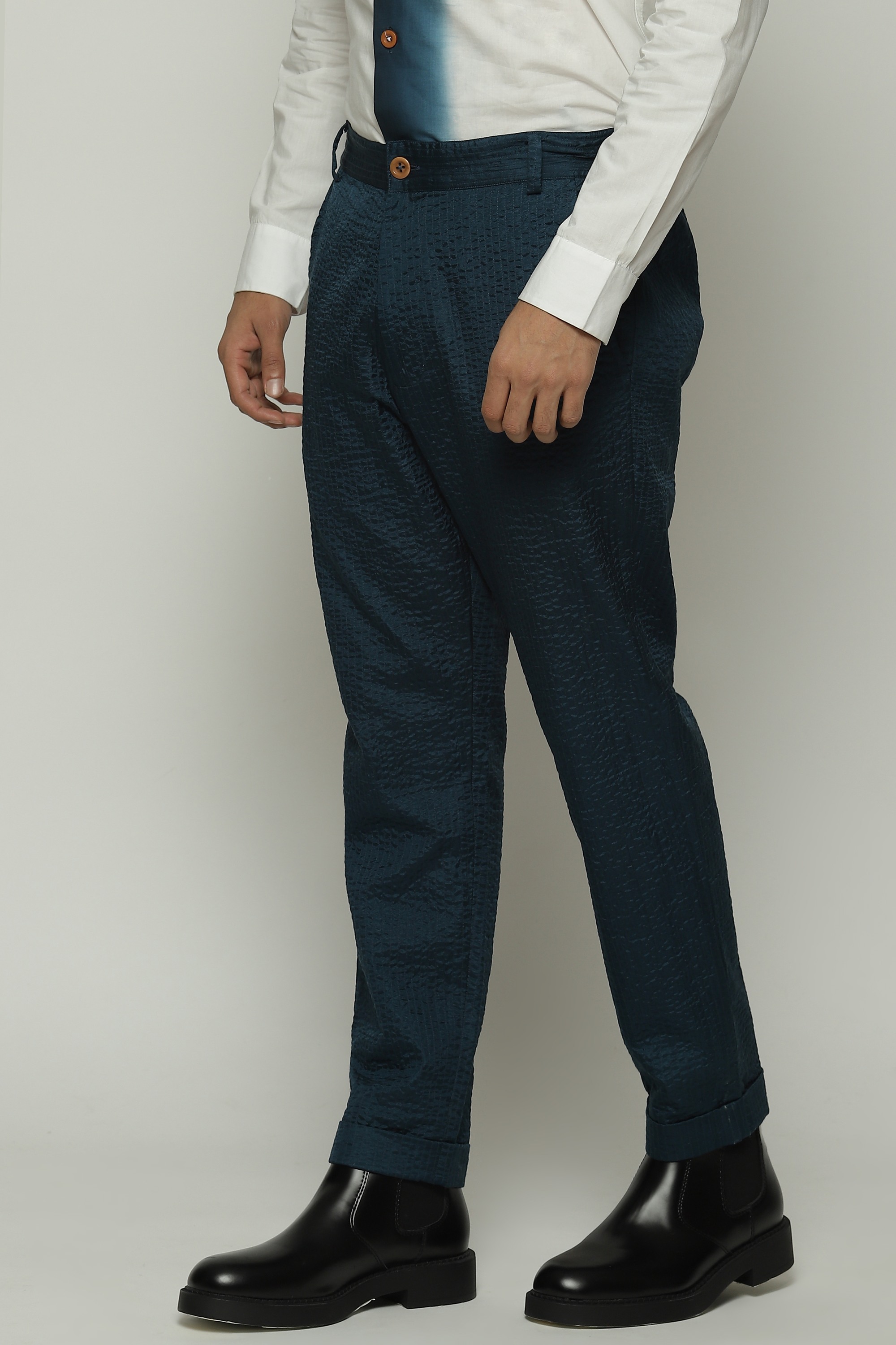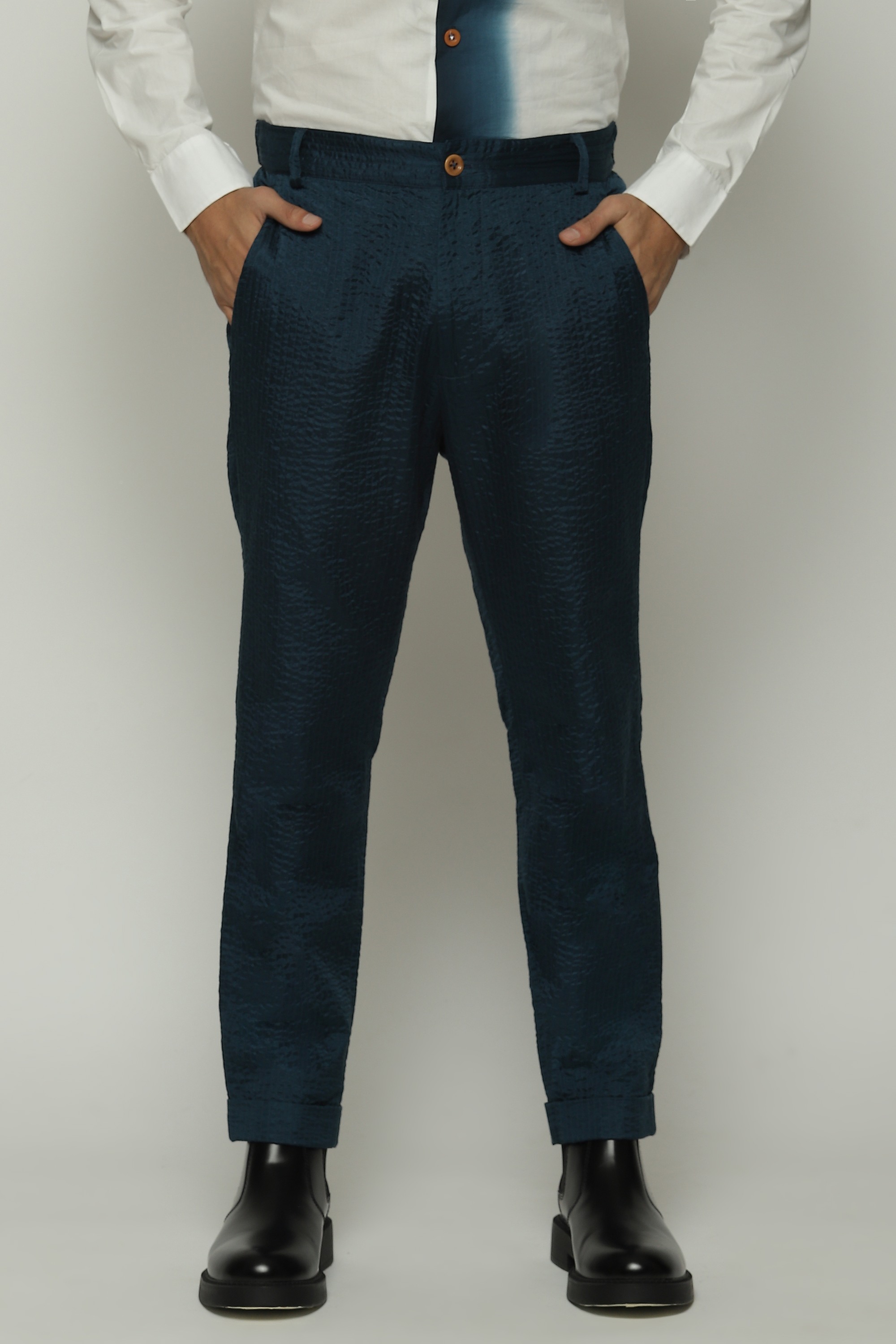 A pair of trousers in the hues of denim.