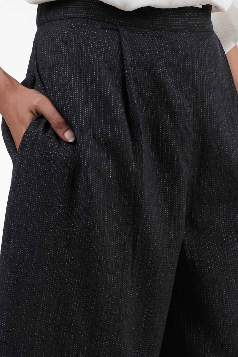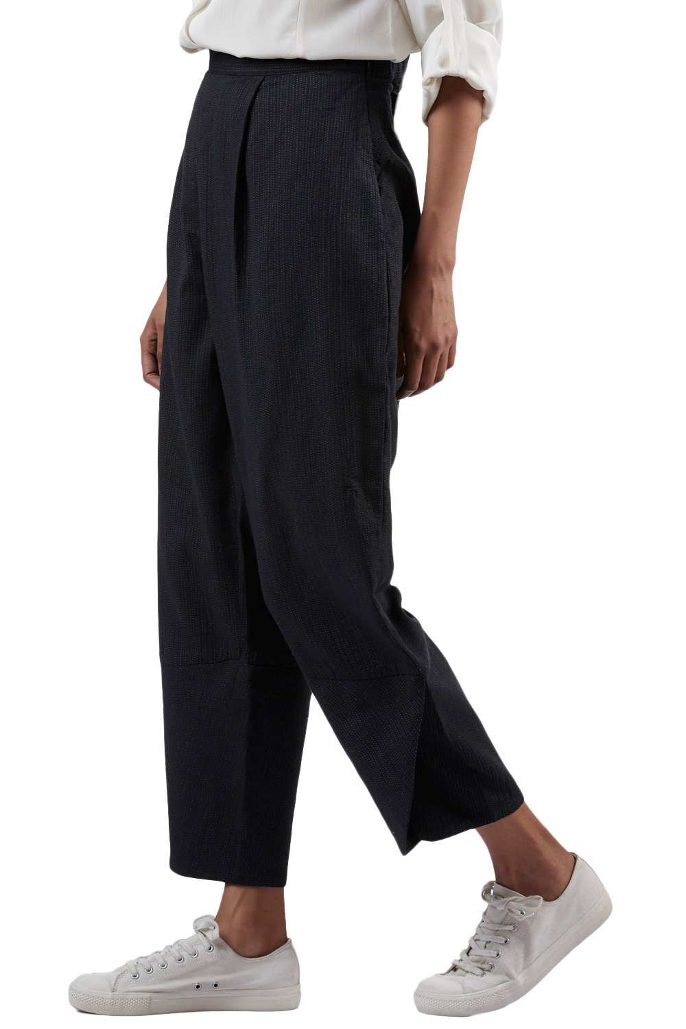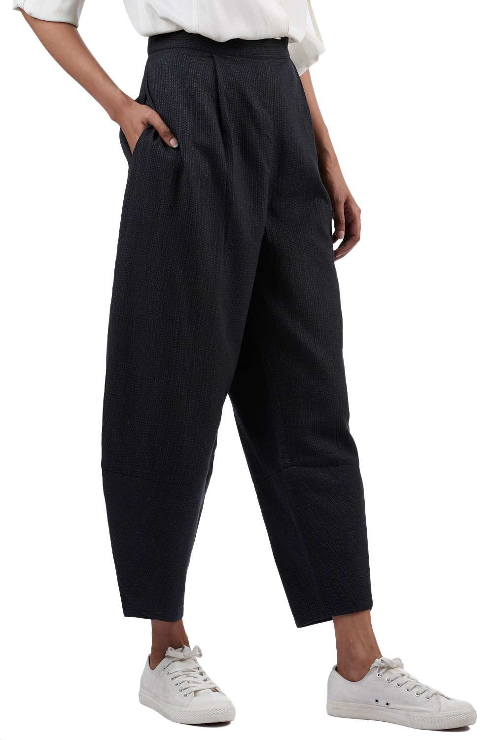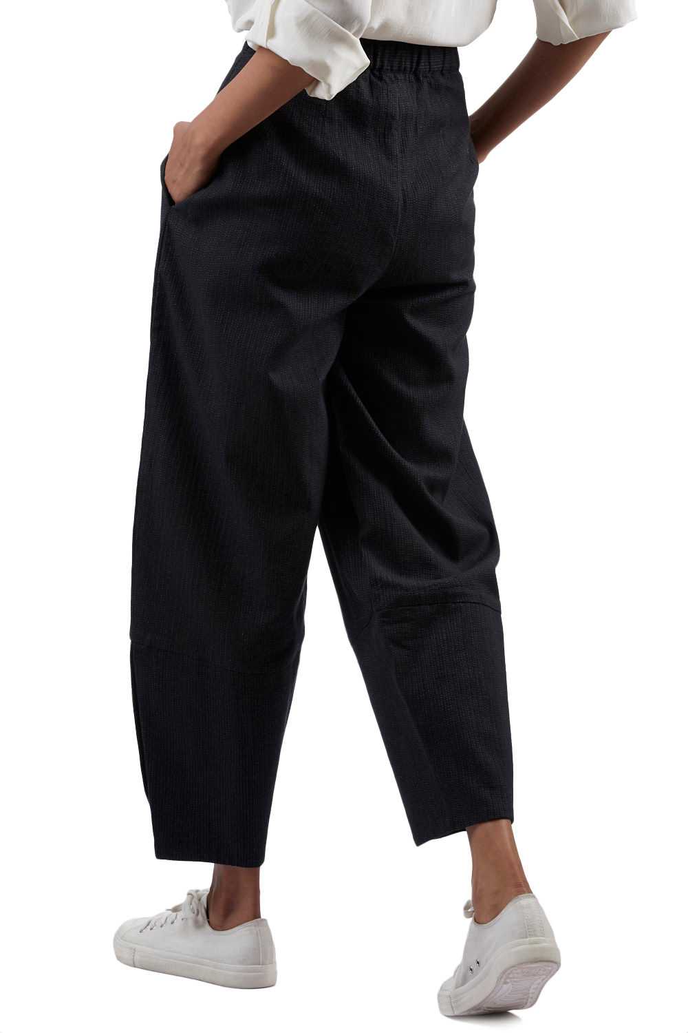Easy Fit Pants. Features Tulip Folds At Hem And An All Over Trapunto Quilting. Adjustable Waistband, Lightly Elasticated At The Back, With Additional Concealed Drawstrings In The Front For A Perfect Fit. Cut From Hand Spun Handwoven Fabric.