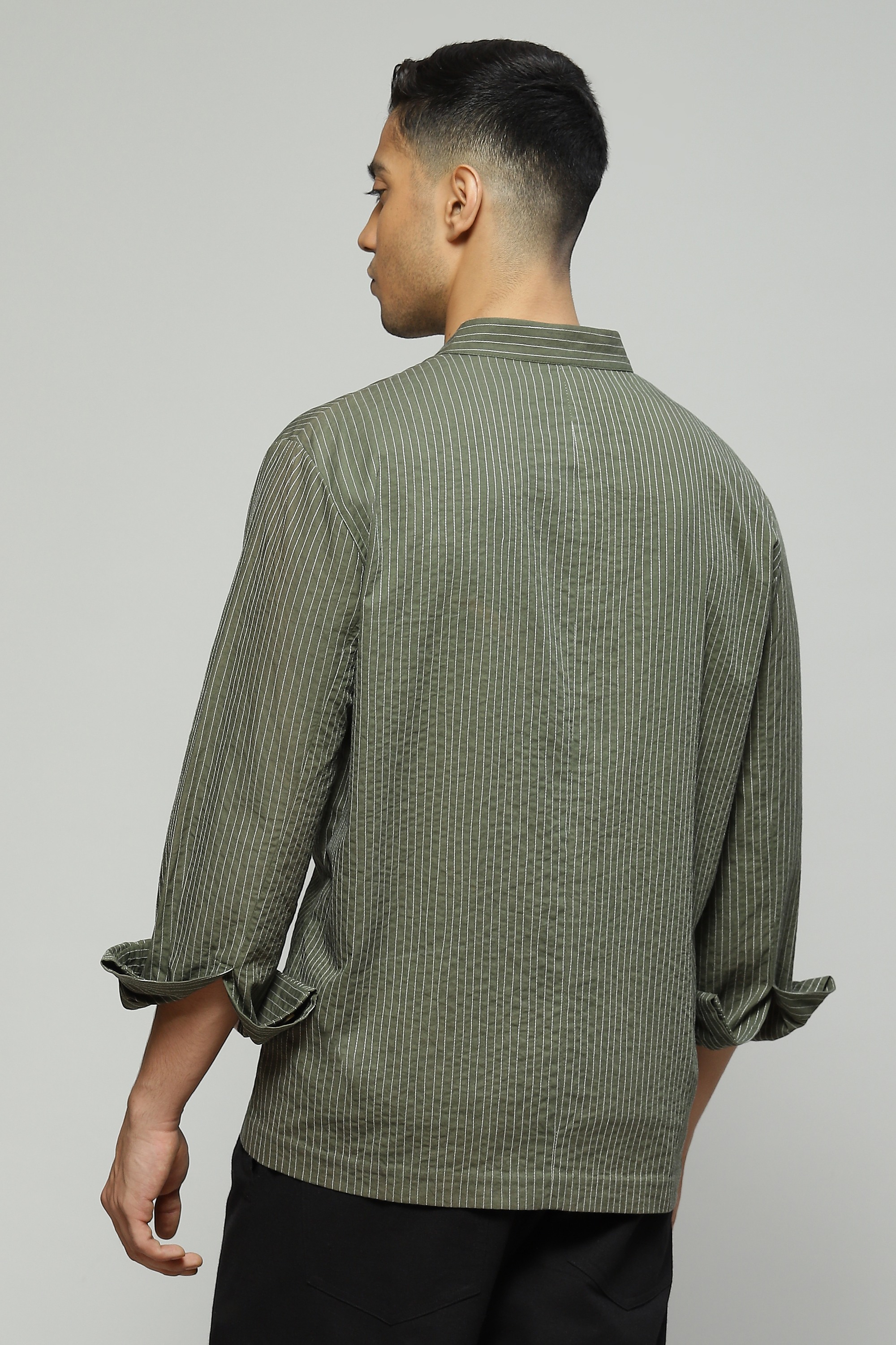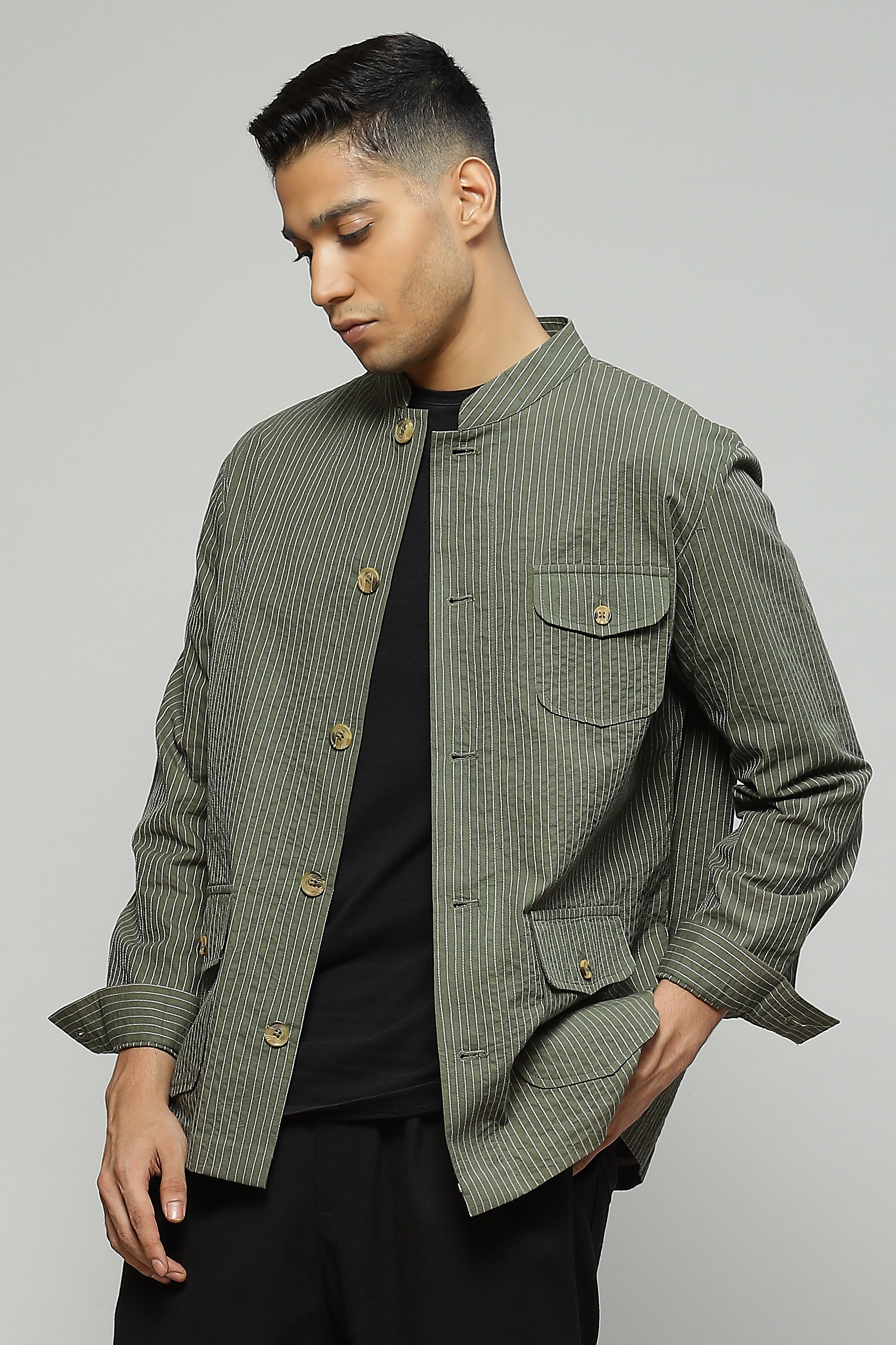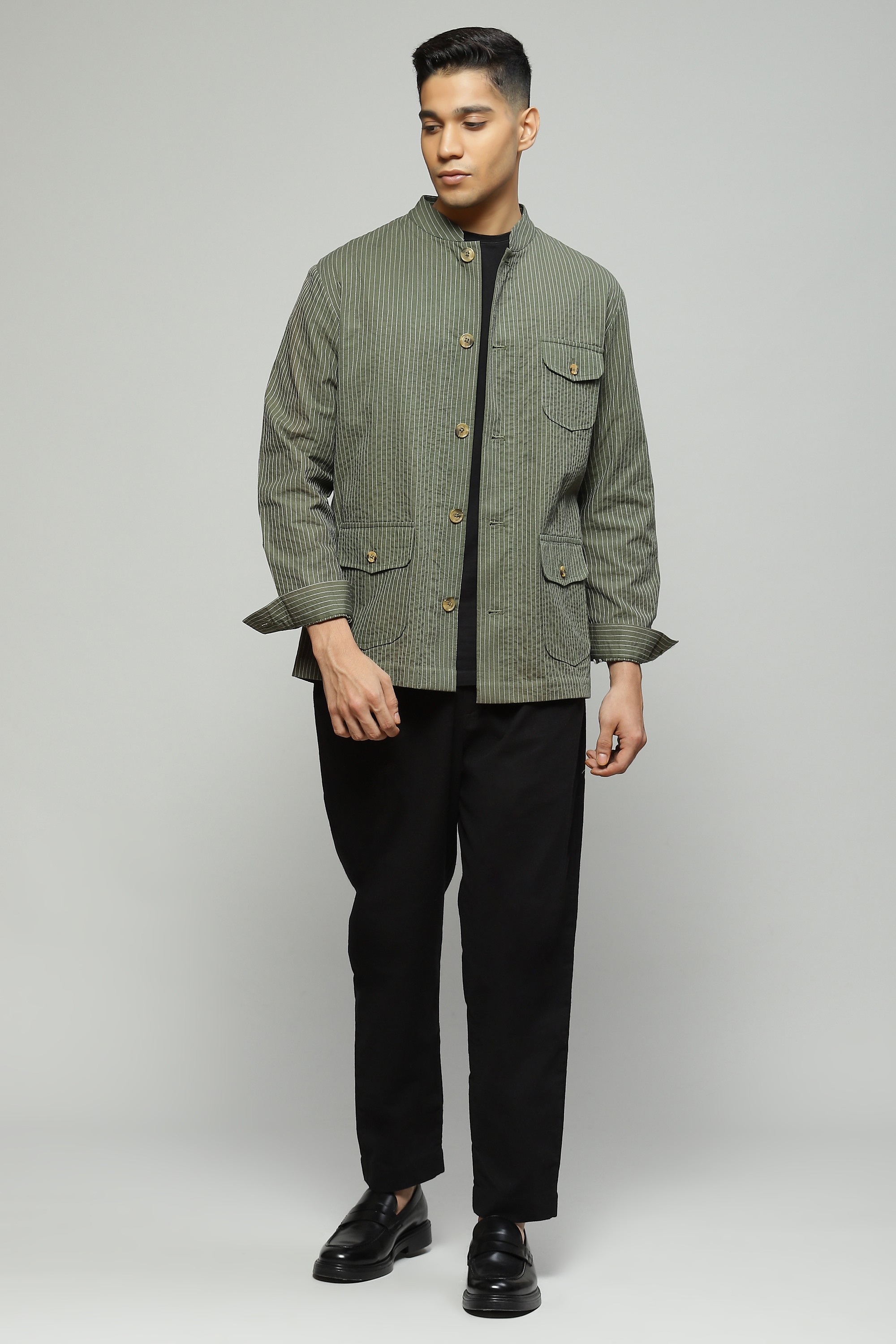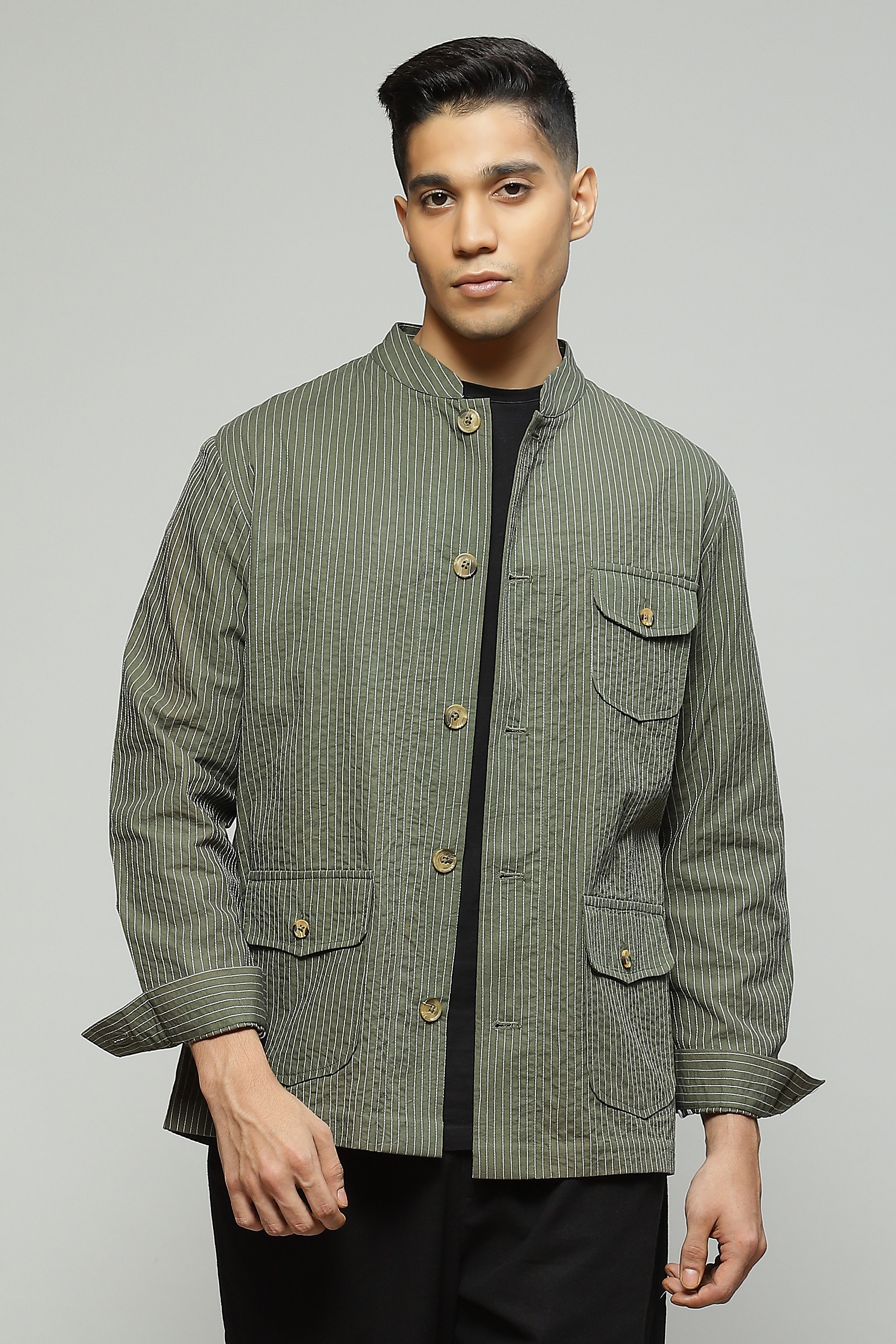 A structured seagrass green jacket featuring a trapunto-stitch technique