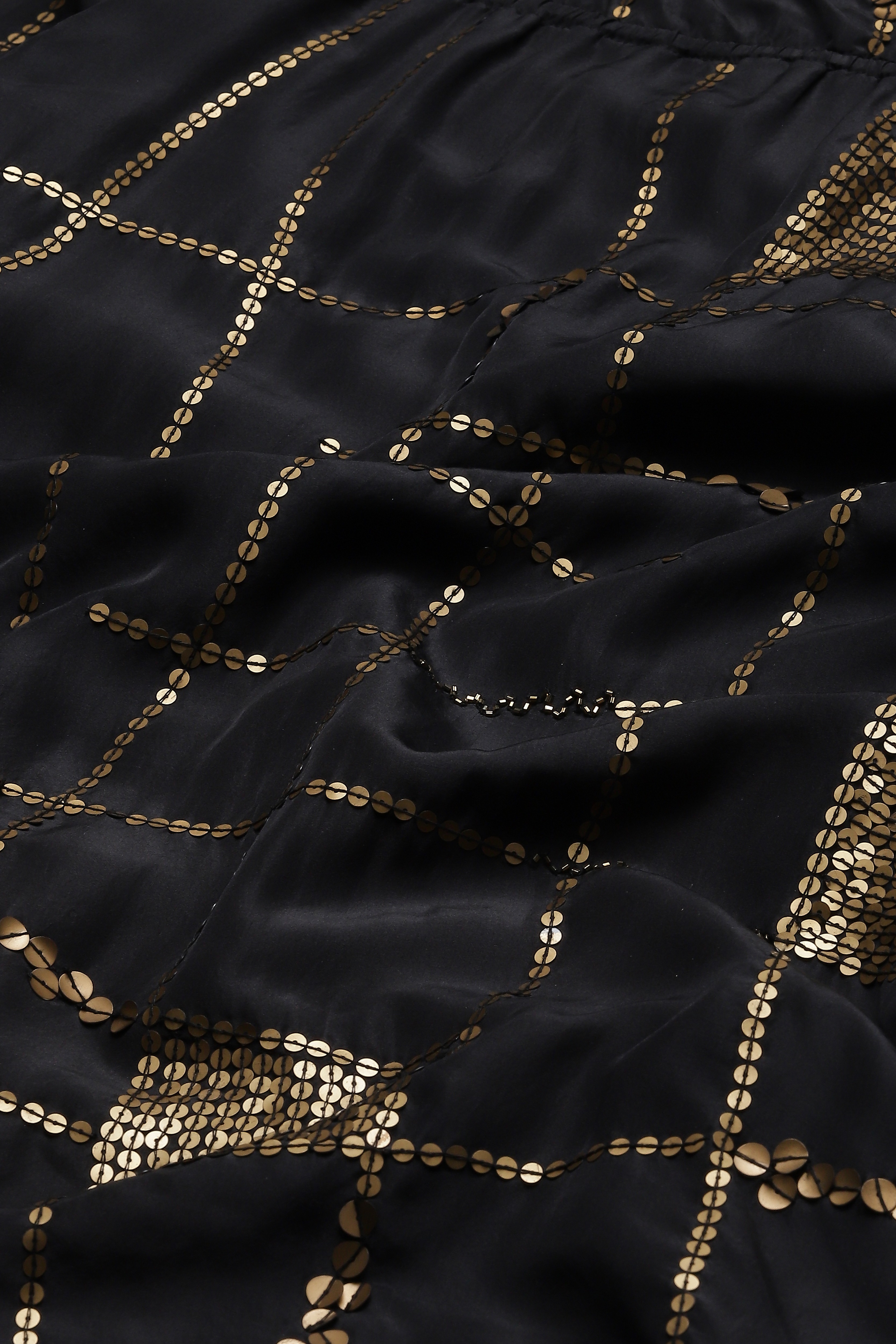 Tribal checks play across a soft, lustrous Habutai silk. Carefully executed hand embroidery, created using a fine aari needle, lay the grounds for a memorable glint.