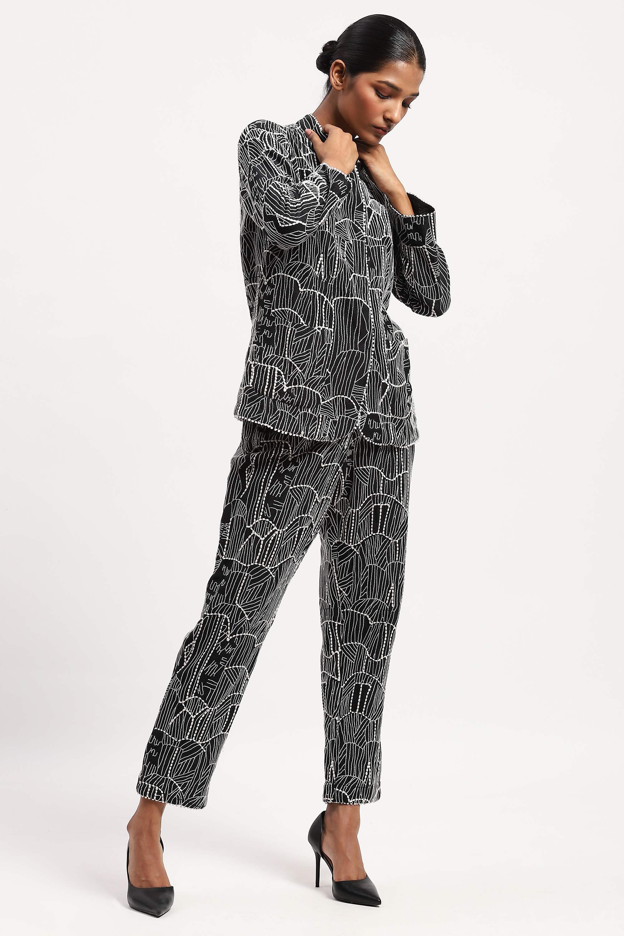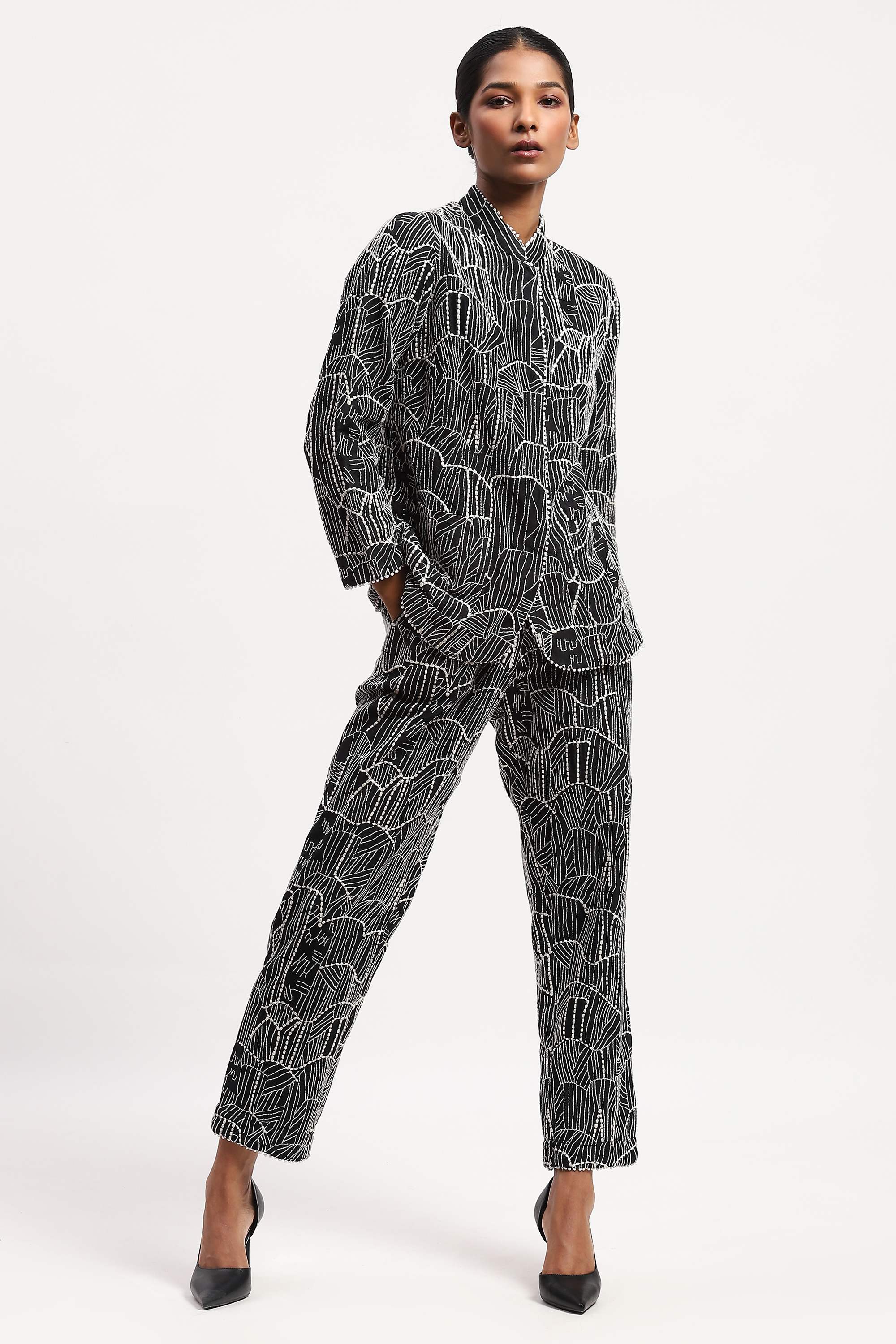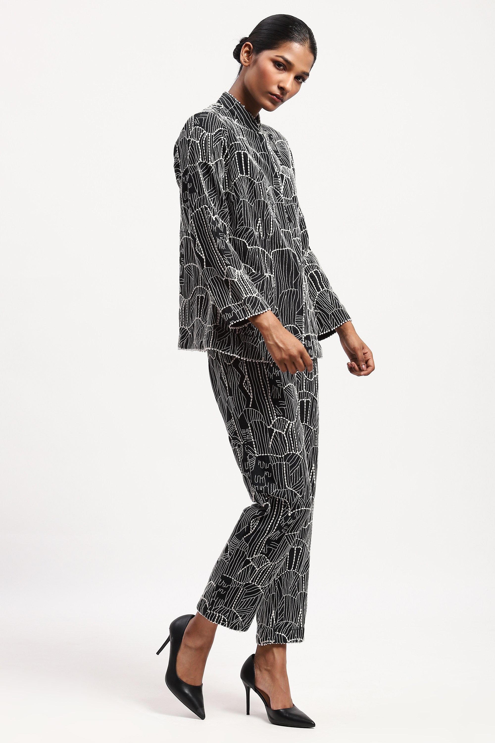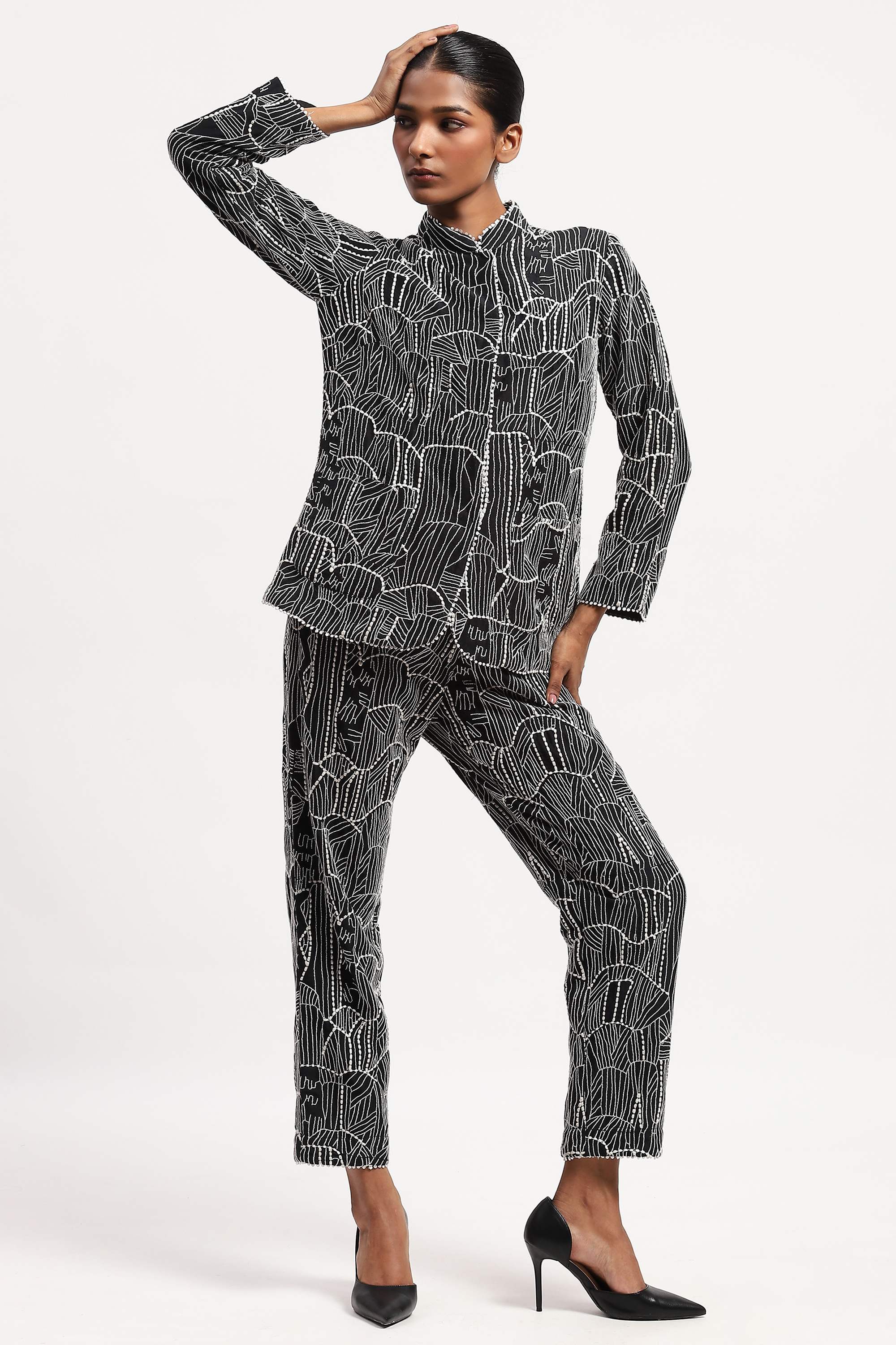 has been made using a fine silk x cotton fabric with an all over graphic tribal embroidered pattern and edged with a delicate lace detail.